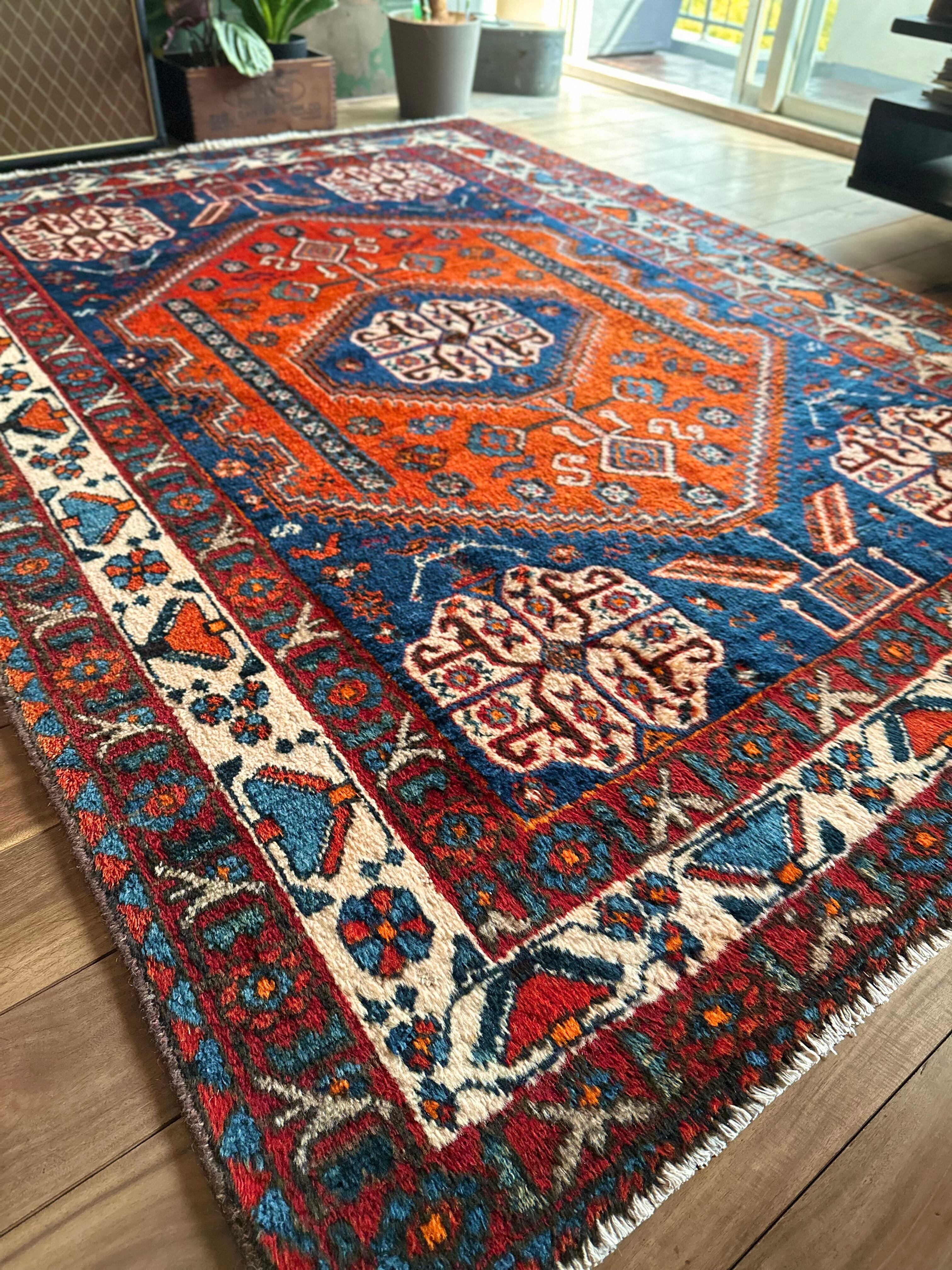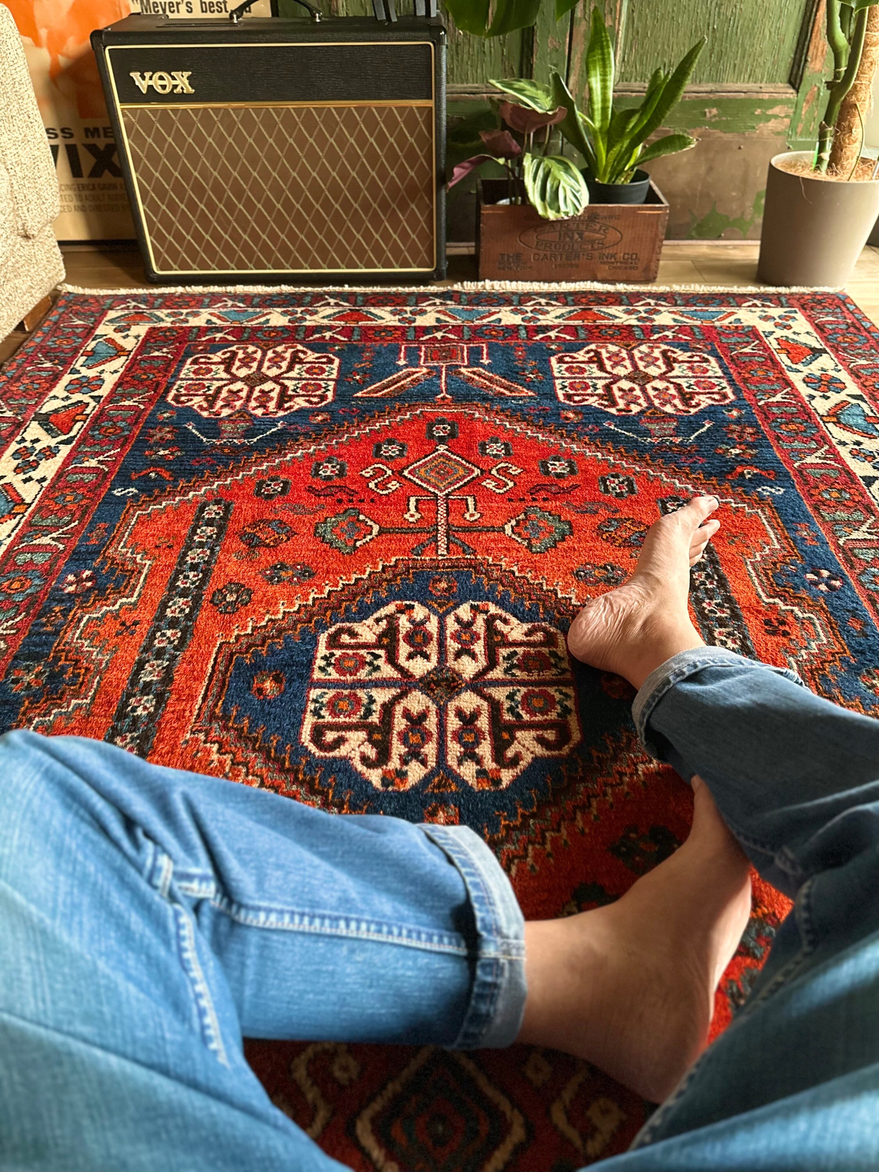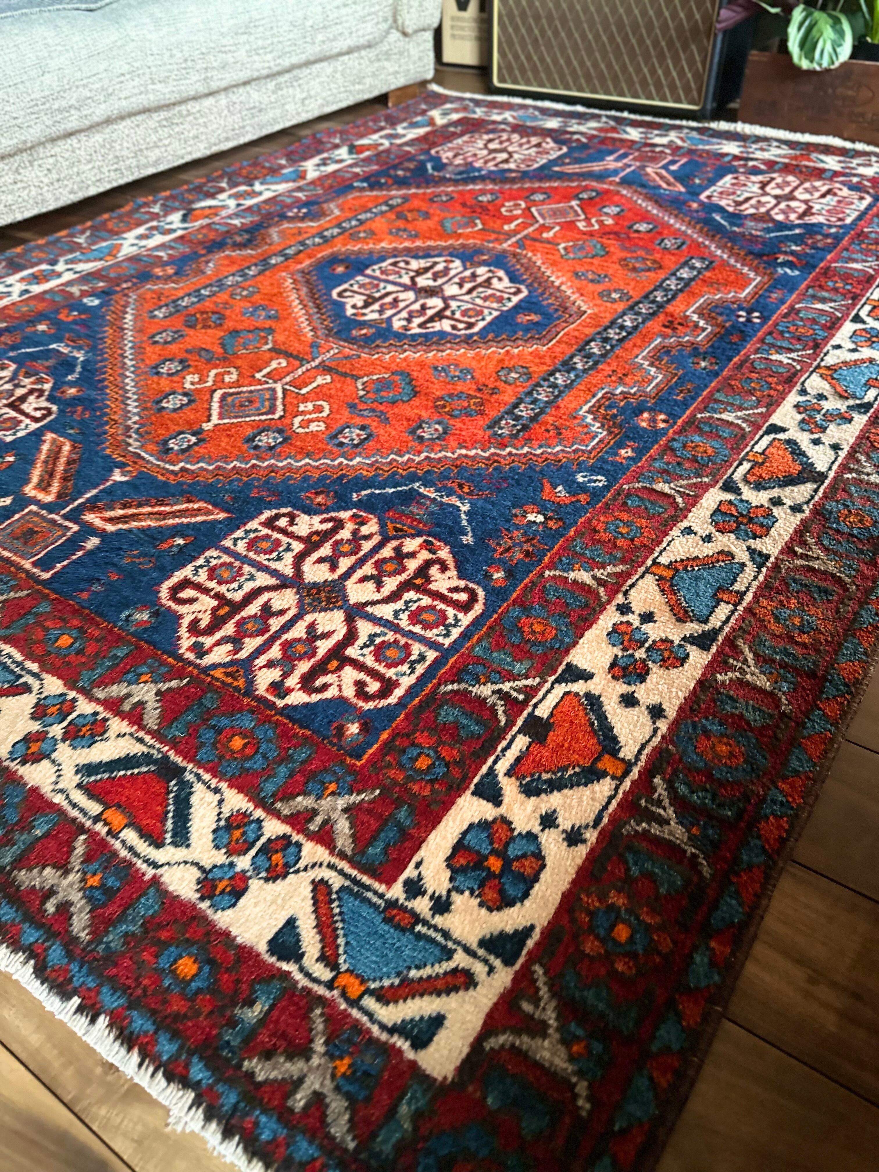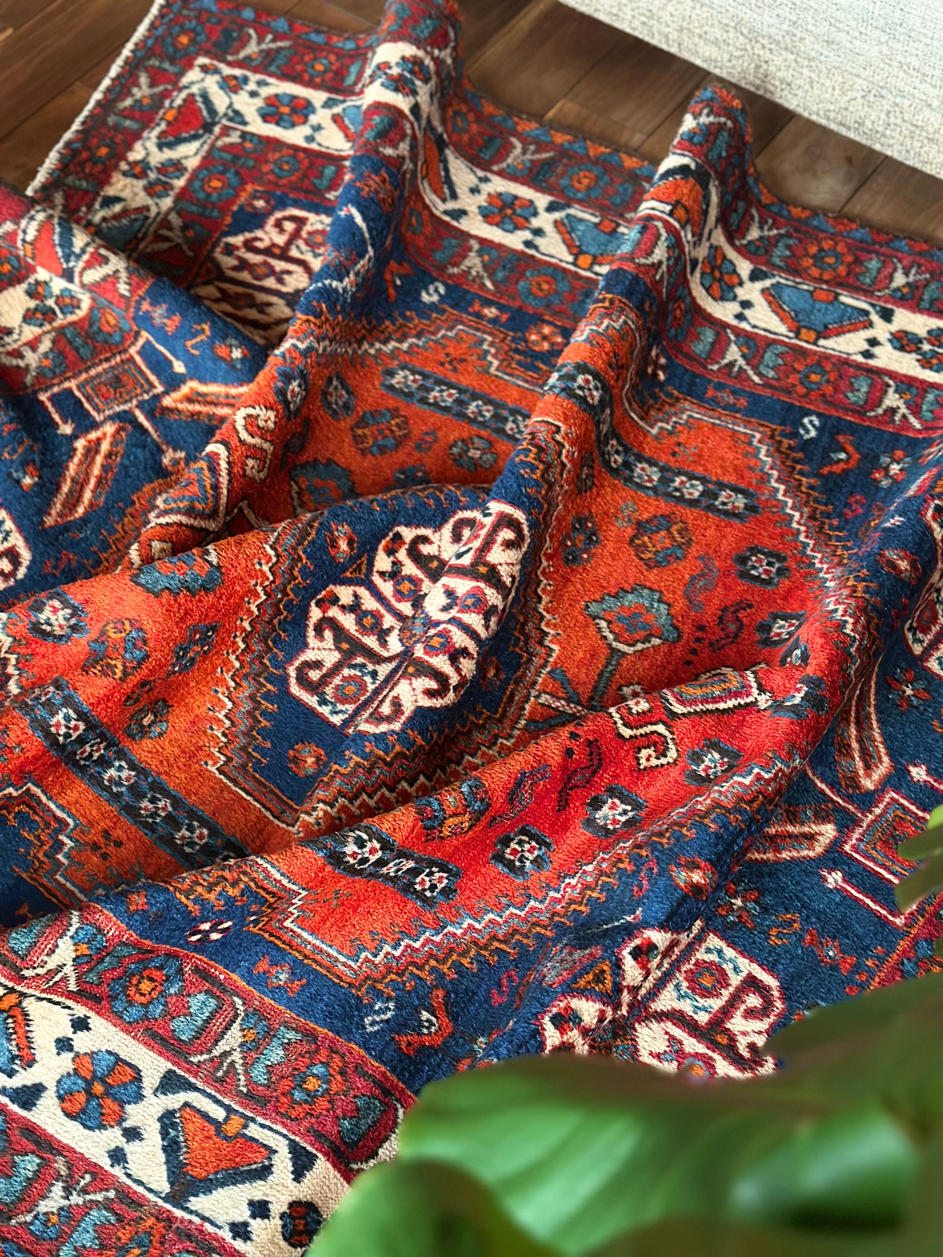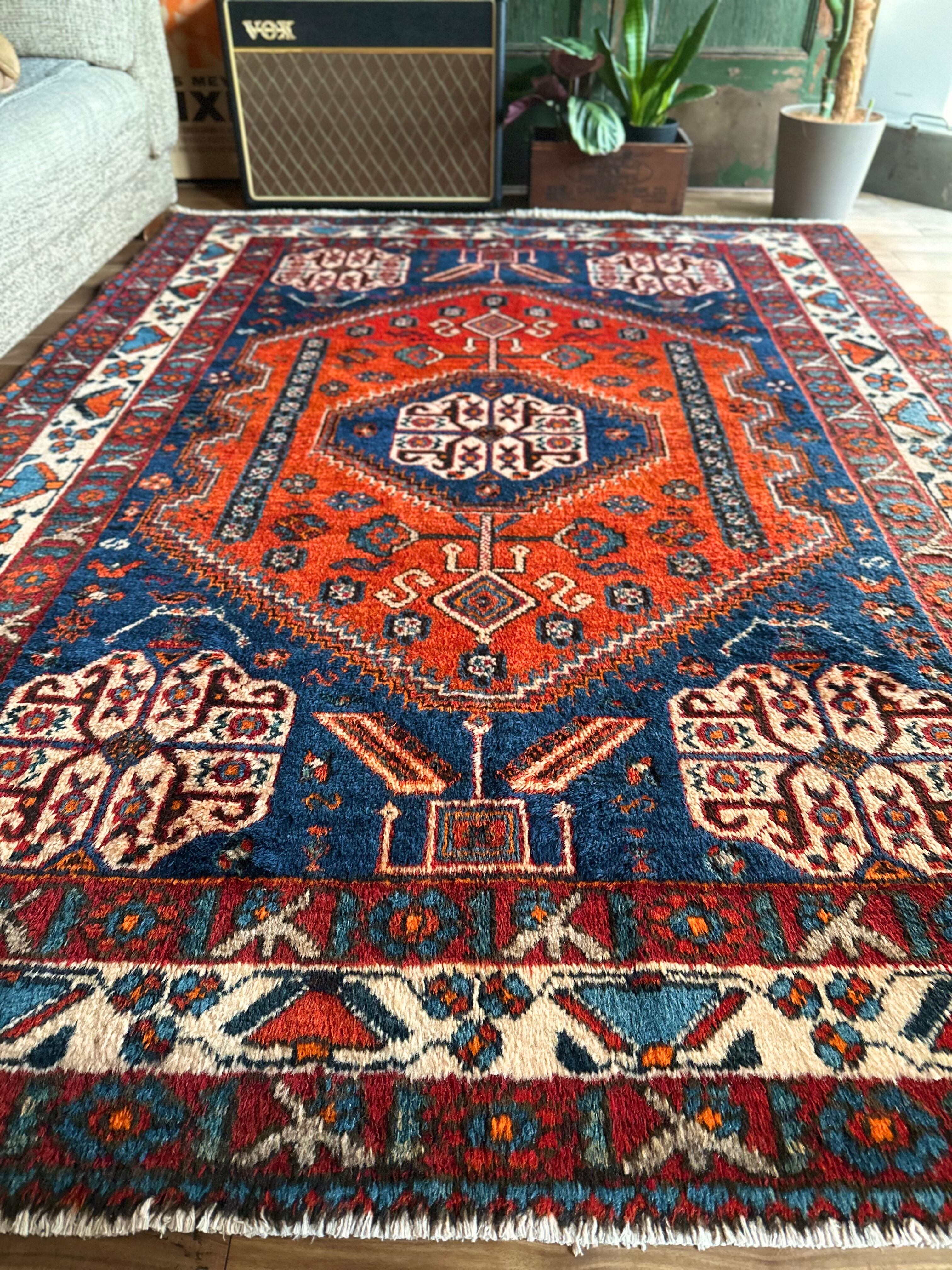 目にも眩しいネイビーブルーのベースに鮮やかなオレンジが映える、イラン南西部のシラーズ周辺にて手織りされたカシュガイ族のトライバルラグで、そのフカフカとした毛足の長さが特徴的な厚みのある1枚になります。