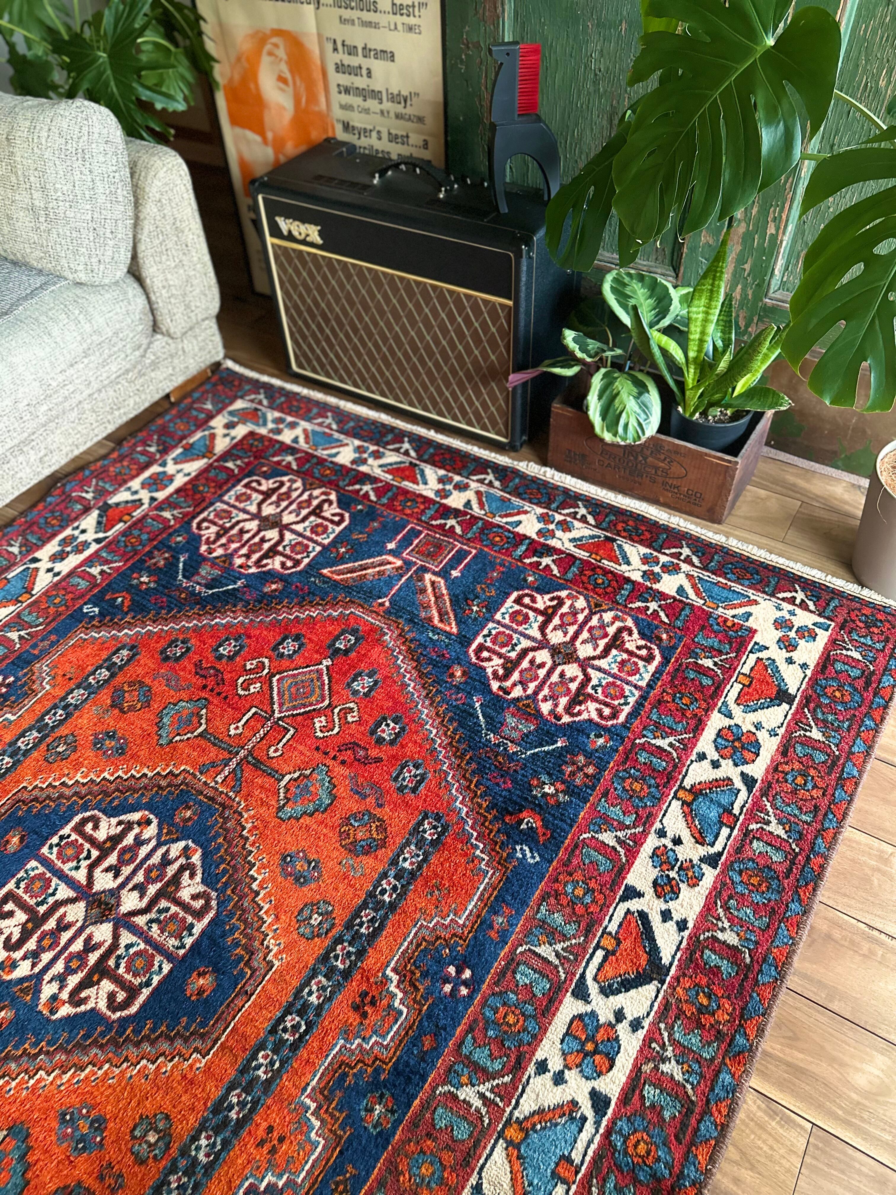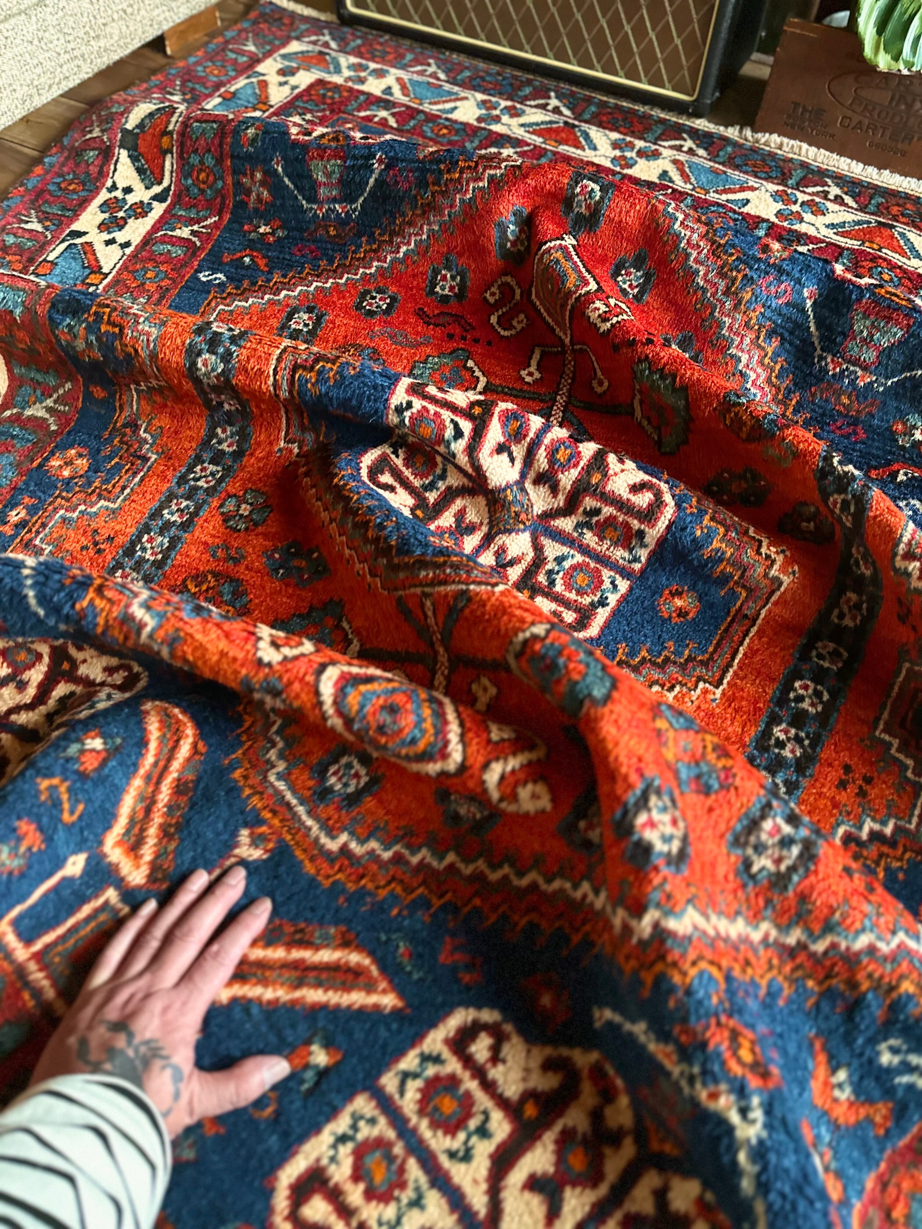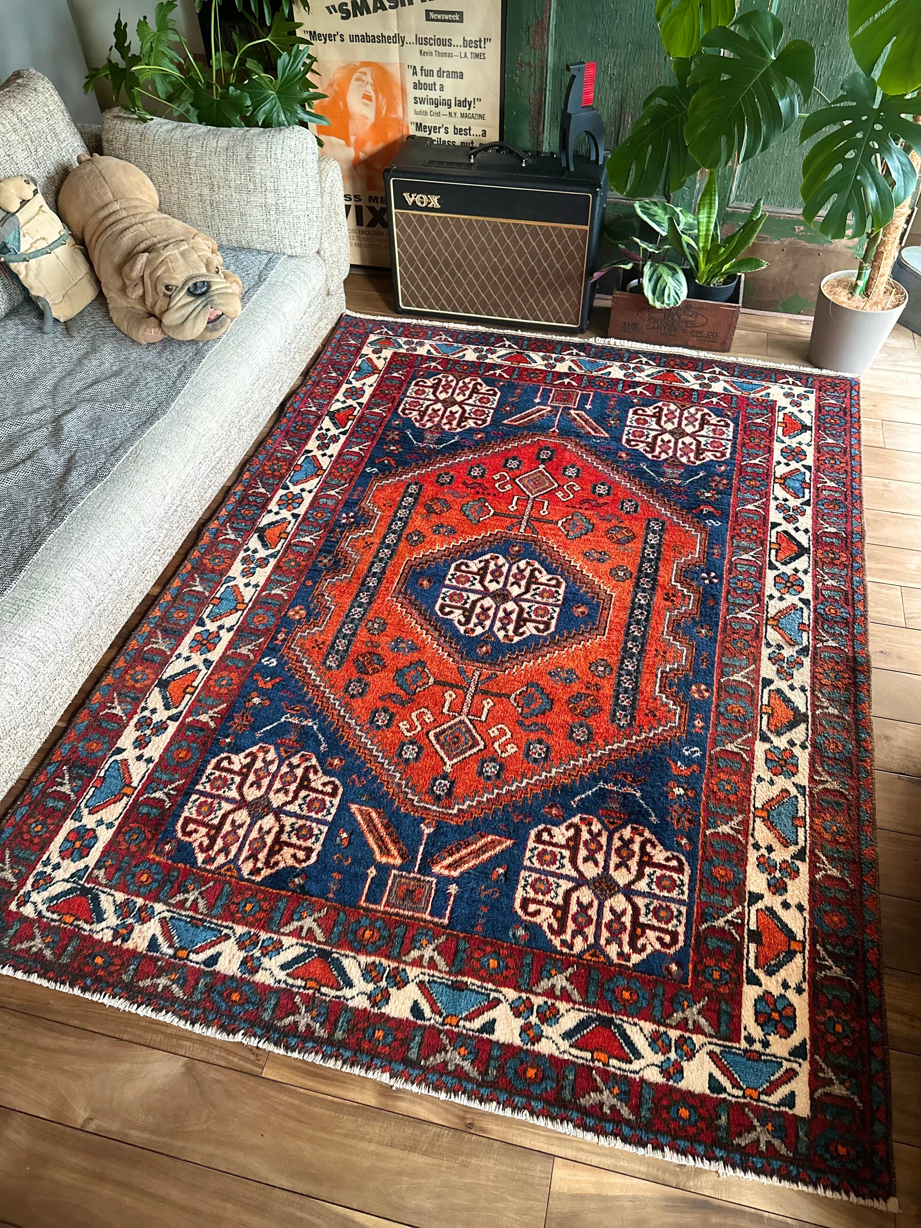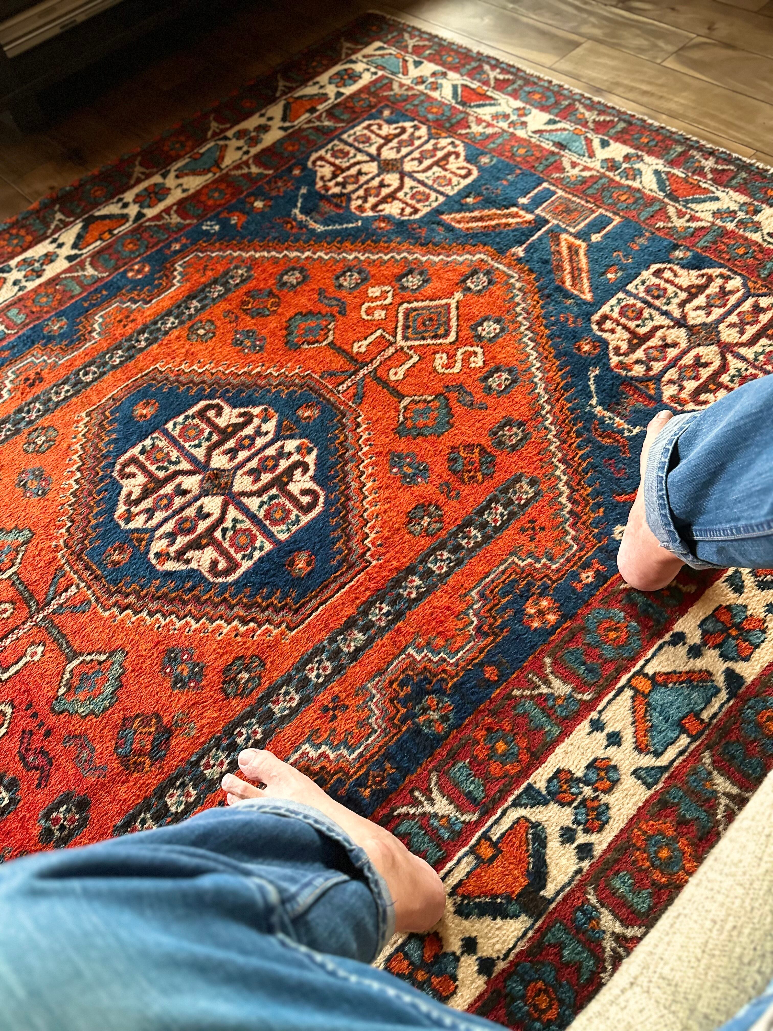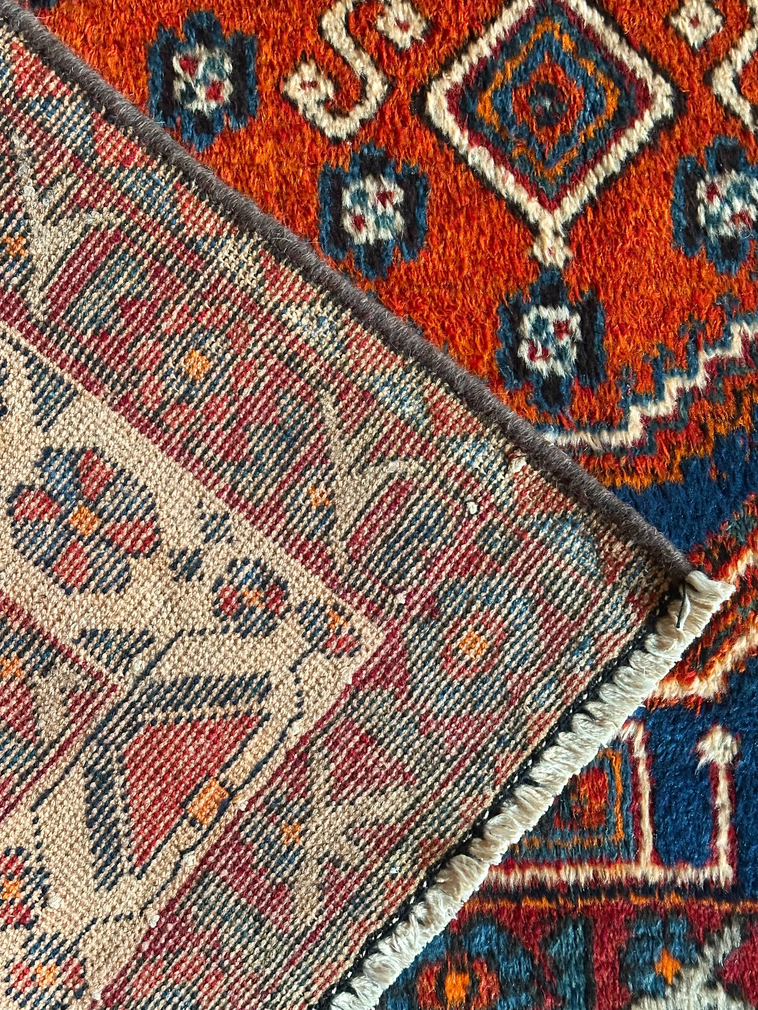 目にも眩しいネイビーブルーのベースに鮮やかなオレンジが映える、イラン南西部のシラーズ周辺にて手織りされたカシュガイ族のトライバルラグで、そのフカフカとした毛足の長さが特徴的な厚みのある1枚になります。