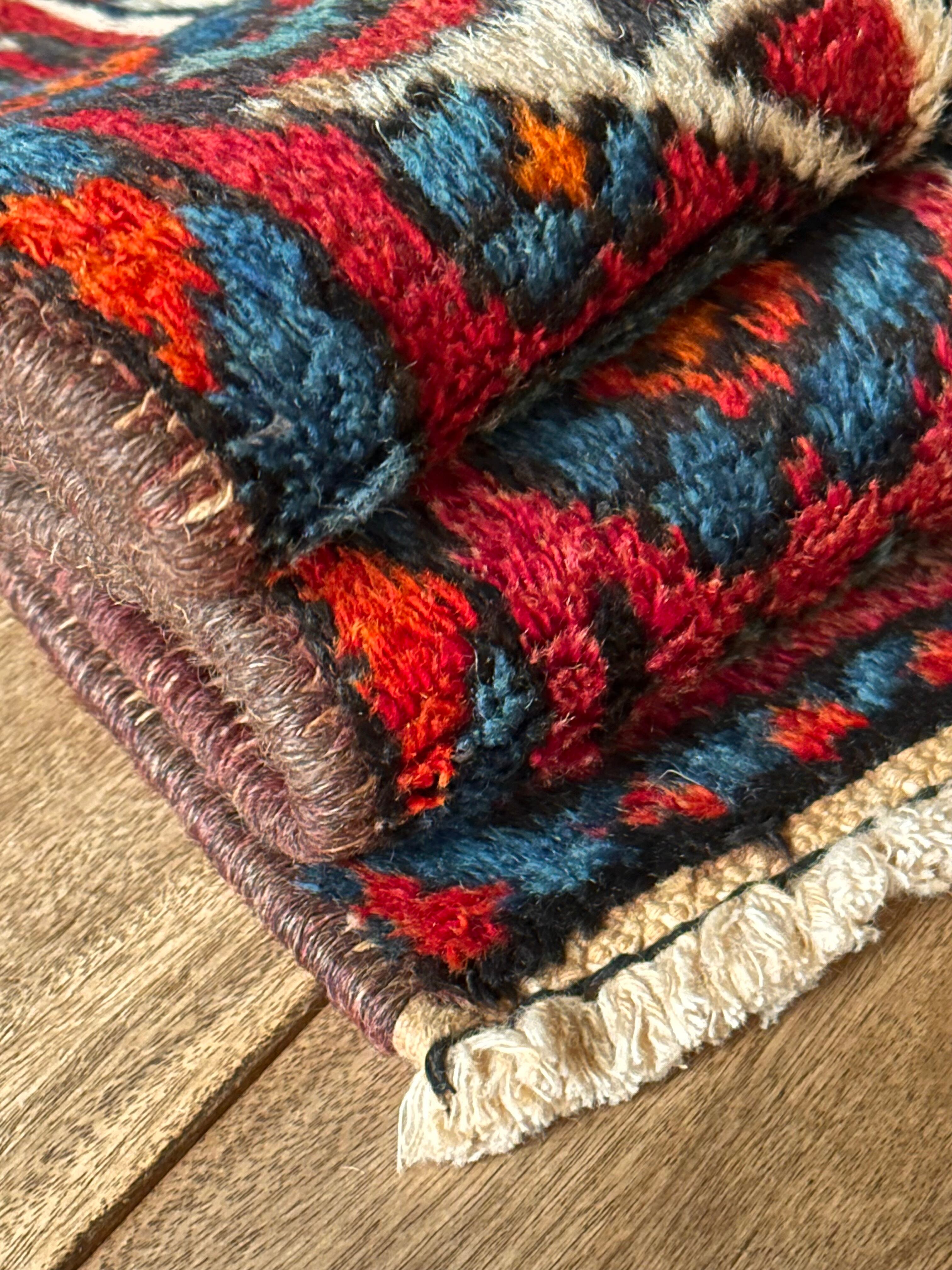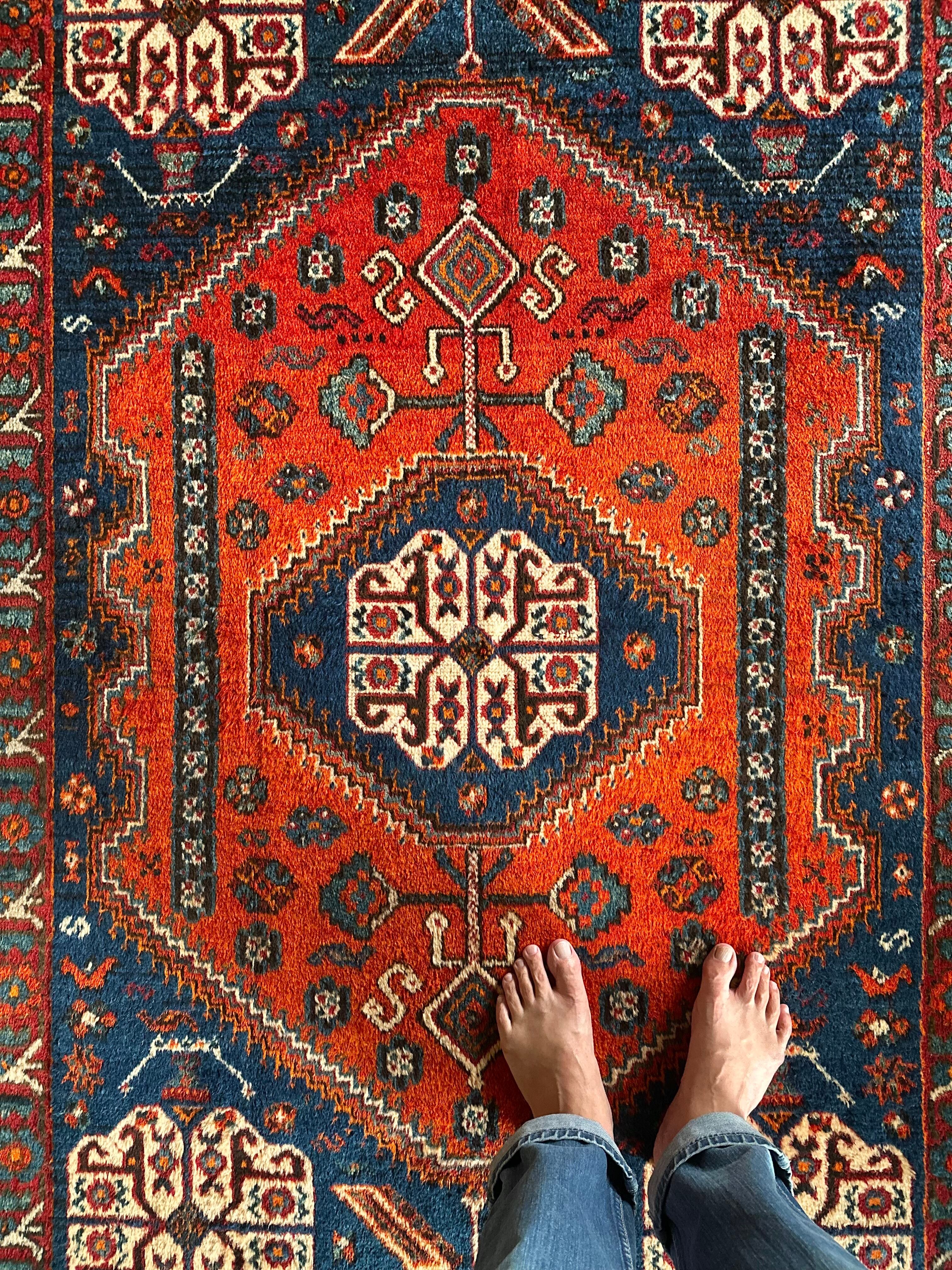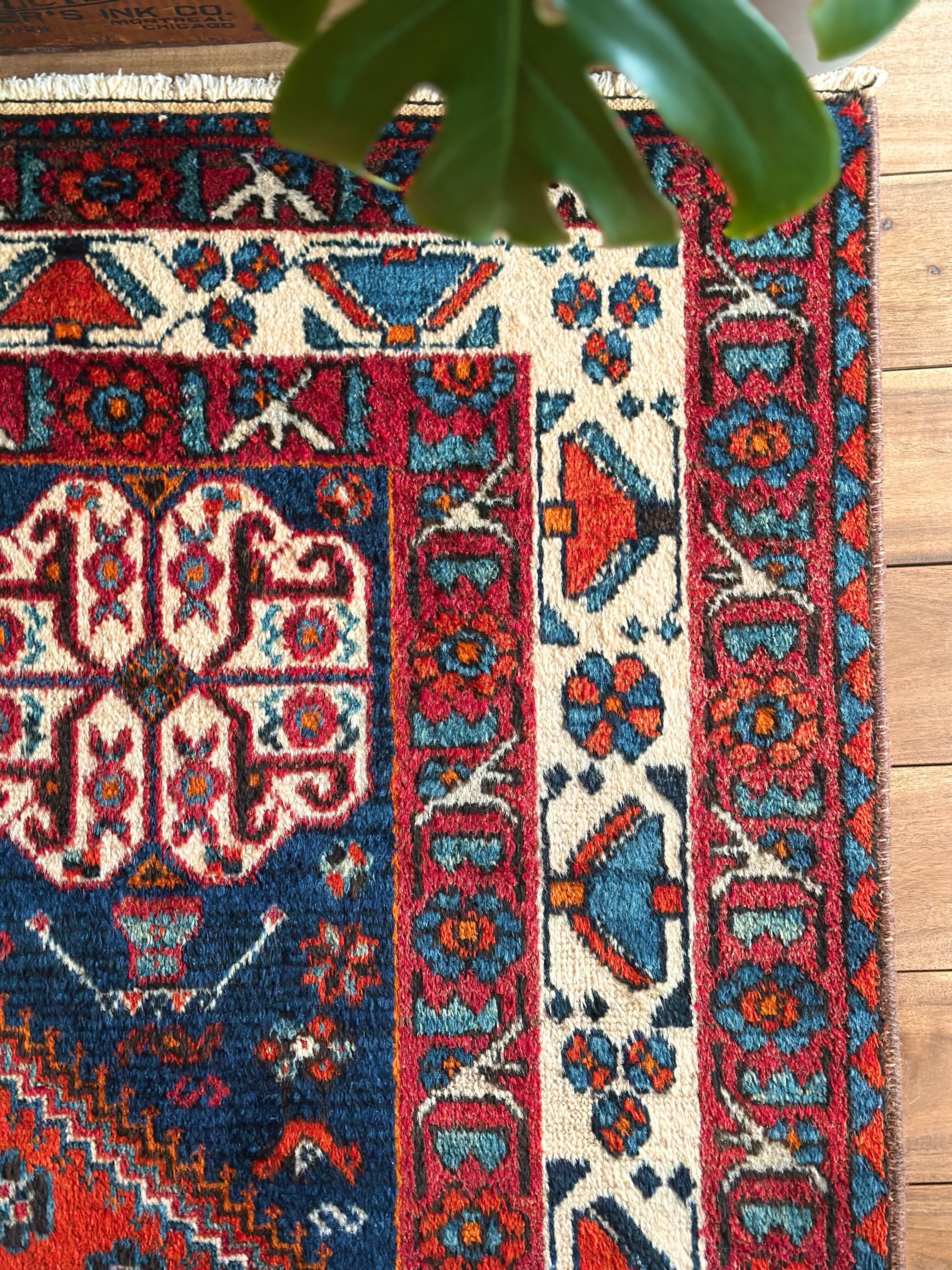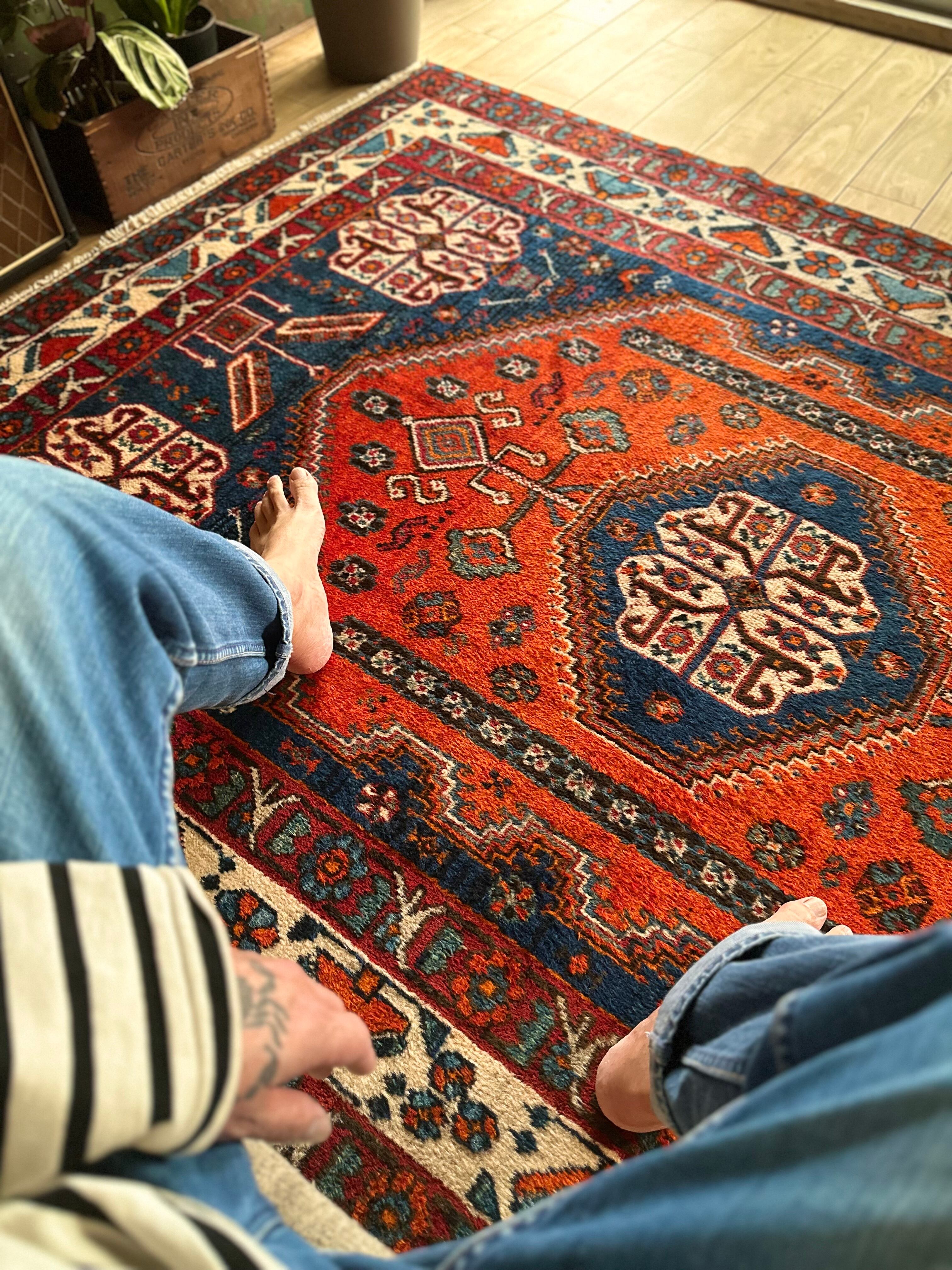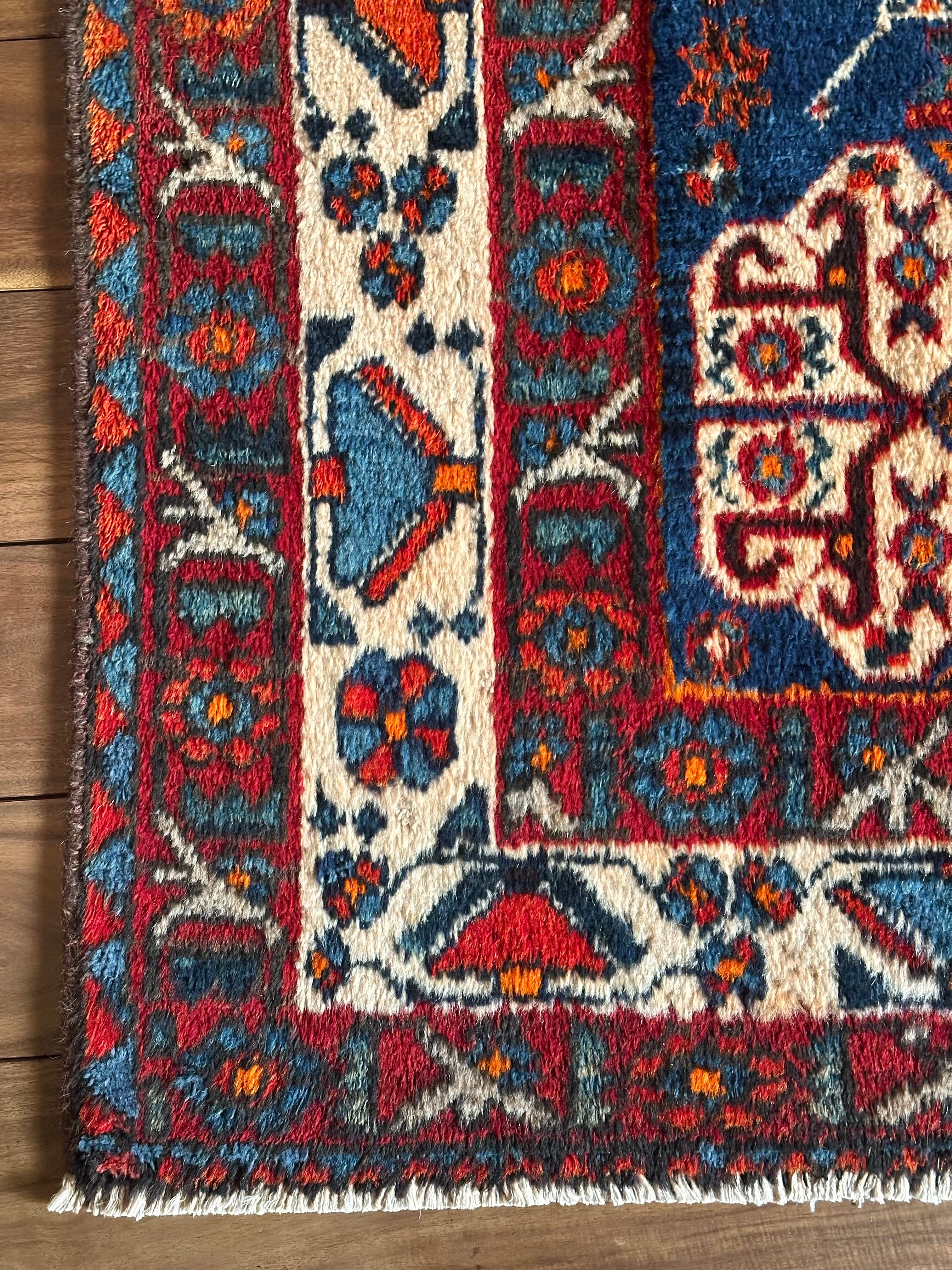 目にも眩しいネイビーブルーのベースに鮮やかなオレンジが映える、イラン南西部のシラーズ周辺にて手織りされたカシュガイ族のトライバルラグで、そのフカフカとした毛足の長さが特徴的な厚みのある1枚になります。