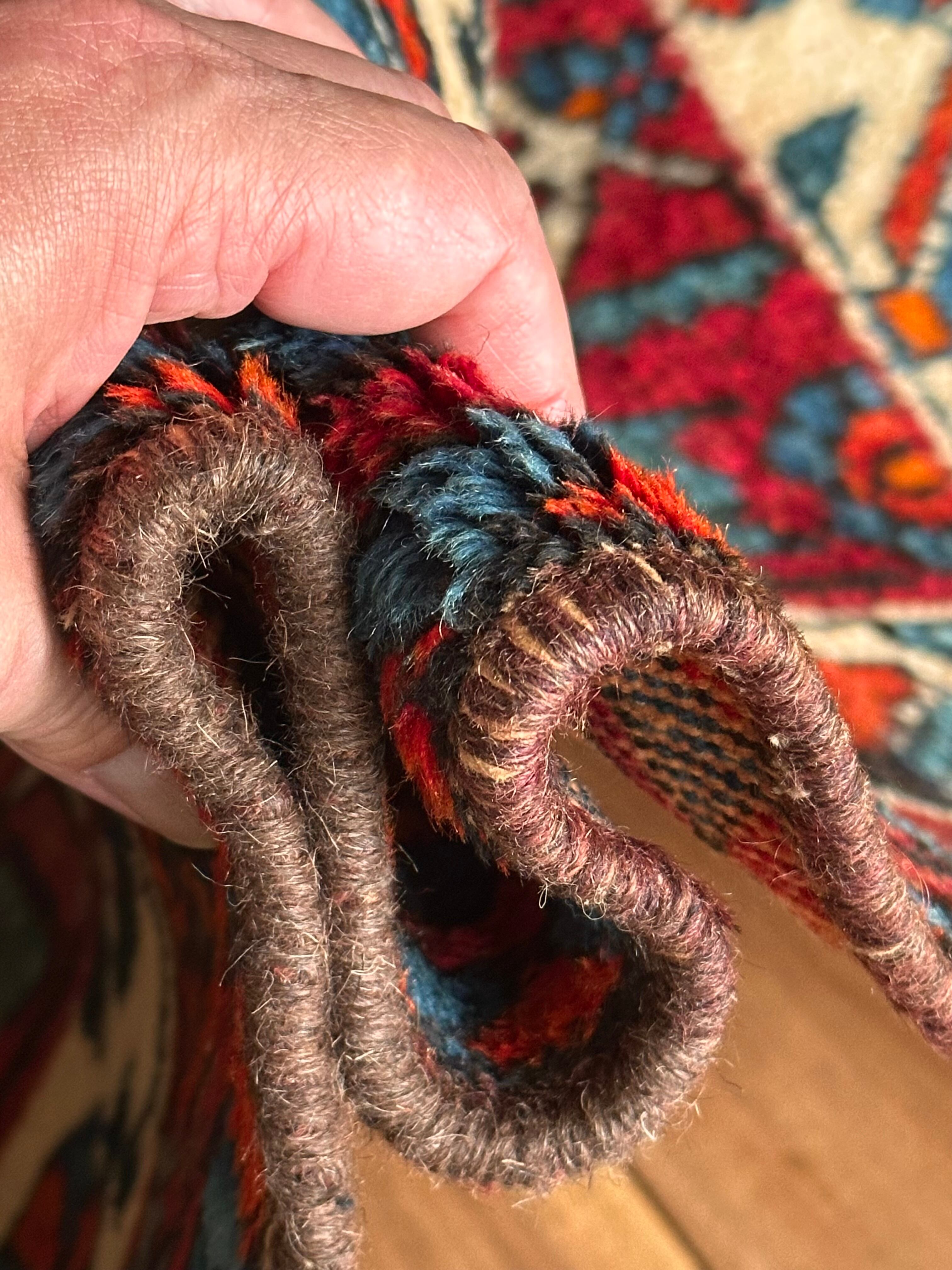 経年としては55年のヴィンテージラグになりますが、それほどの使用感はなく目立つダメージにリペア箇所は見当たらないミントなコンディションで、通常のカシュガイは経糸に羊毛を使用した柔らかな質感ですが、こちらはアバデ産のように綿糸を使用した丈夫な作りになります。