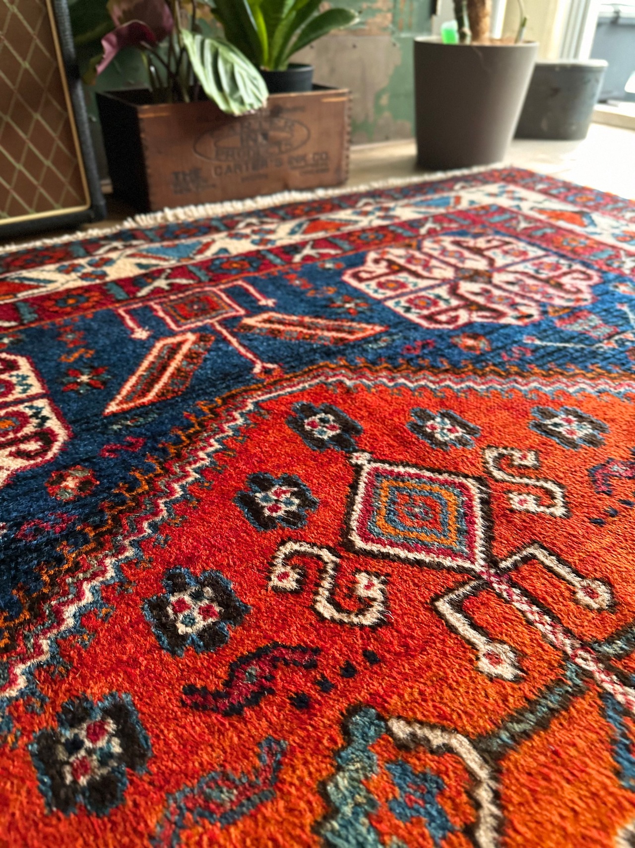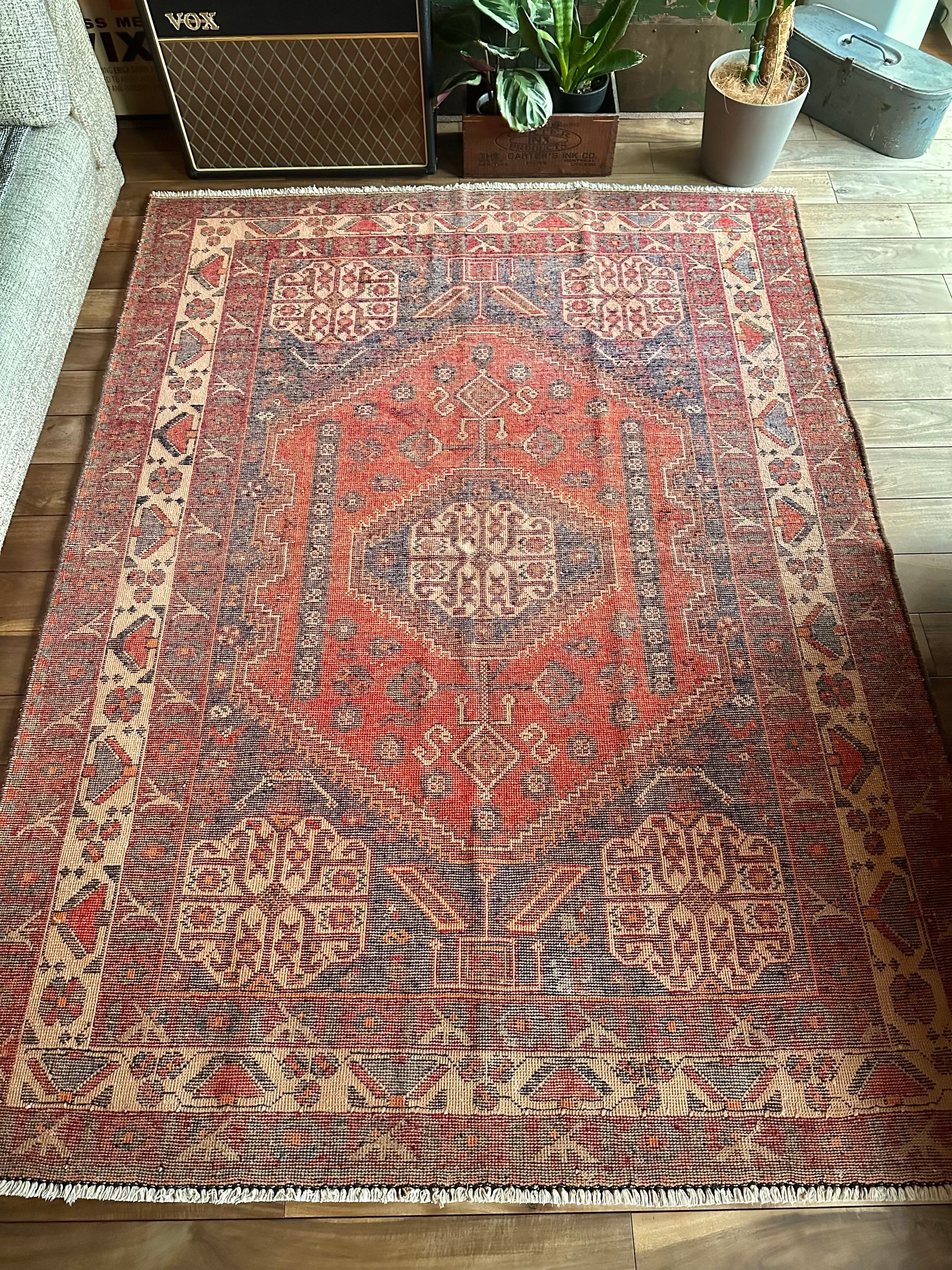 最後にラグそのものに関しては羊毛特有の匂いがあり、採寸は中央付近で計測していますが、手織りならではの歪みによる誤差や水洗いクリーニングによる縮み、また草木染めによる経年劣化の色ムラなどがありますが、それもまたヴィンテージラグの魅力かとご理解ください。
