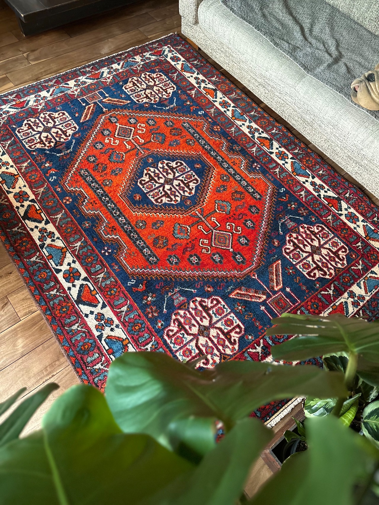 カシュガイ特有のメダリオンを中心とした四隅に描かれる幾何学模様は魔除けの意味合いでしょうか、全体的にバランスの取れたデザインに鳥や花などの細かな模様が散りばめられた楽しげな1枚で、大きさ的にもリビングスペースにちょうどな幅のあるこのサイズ感が希少とも言えます。