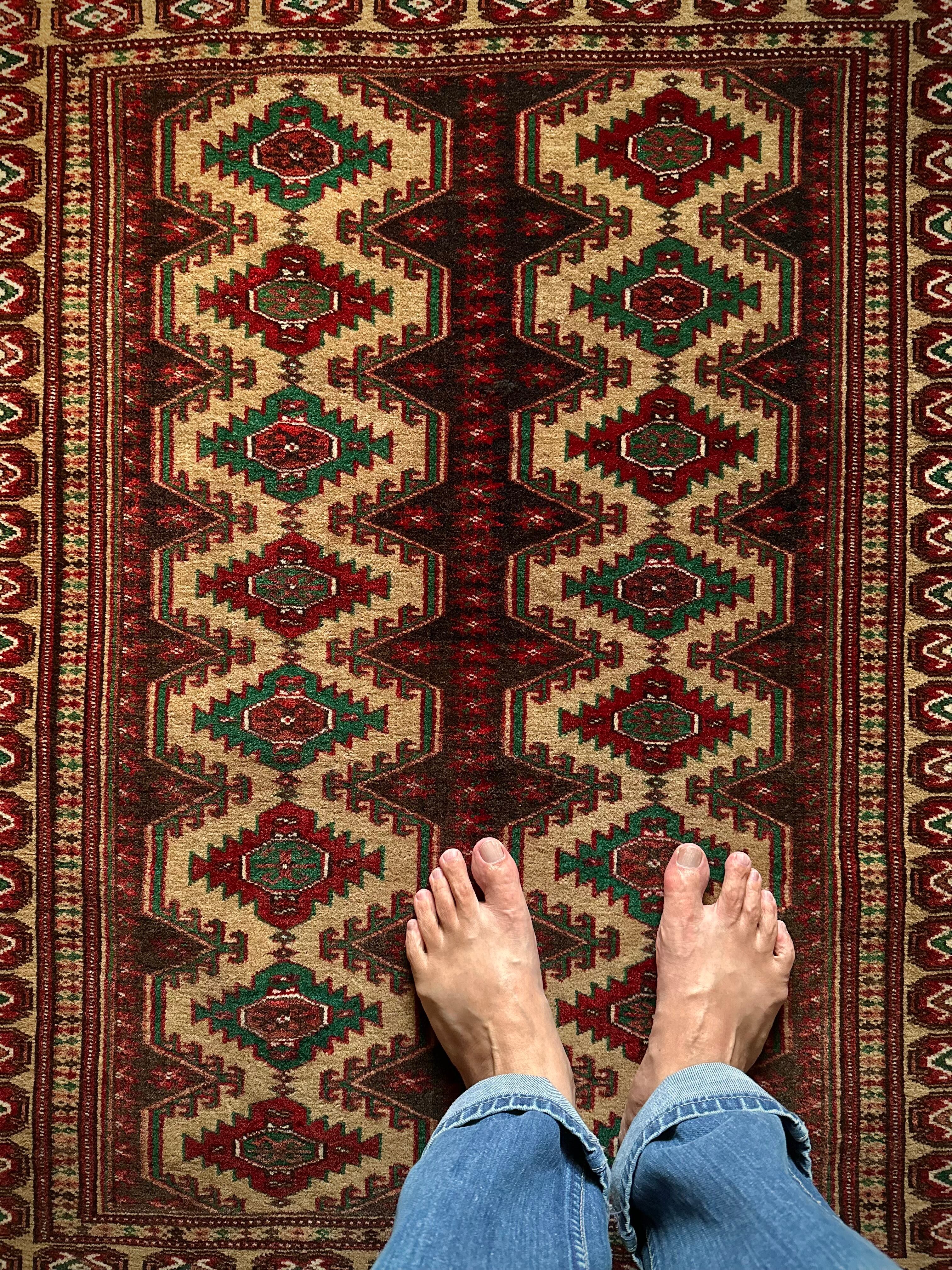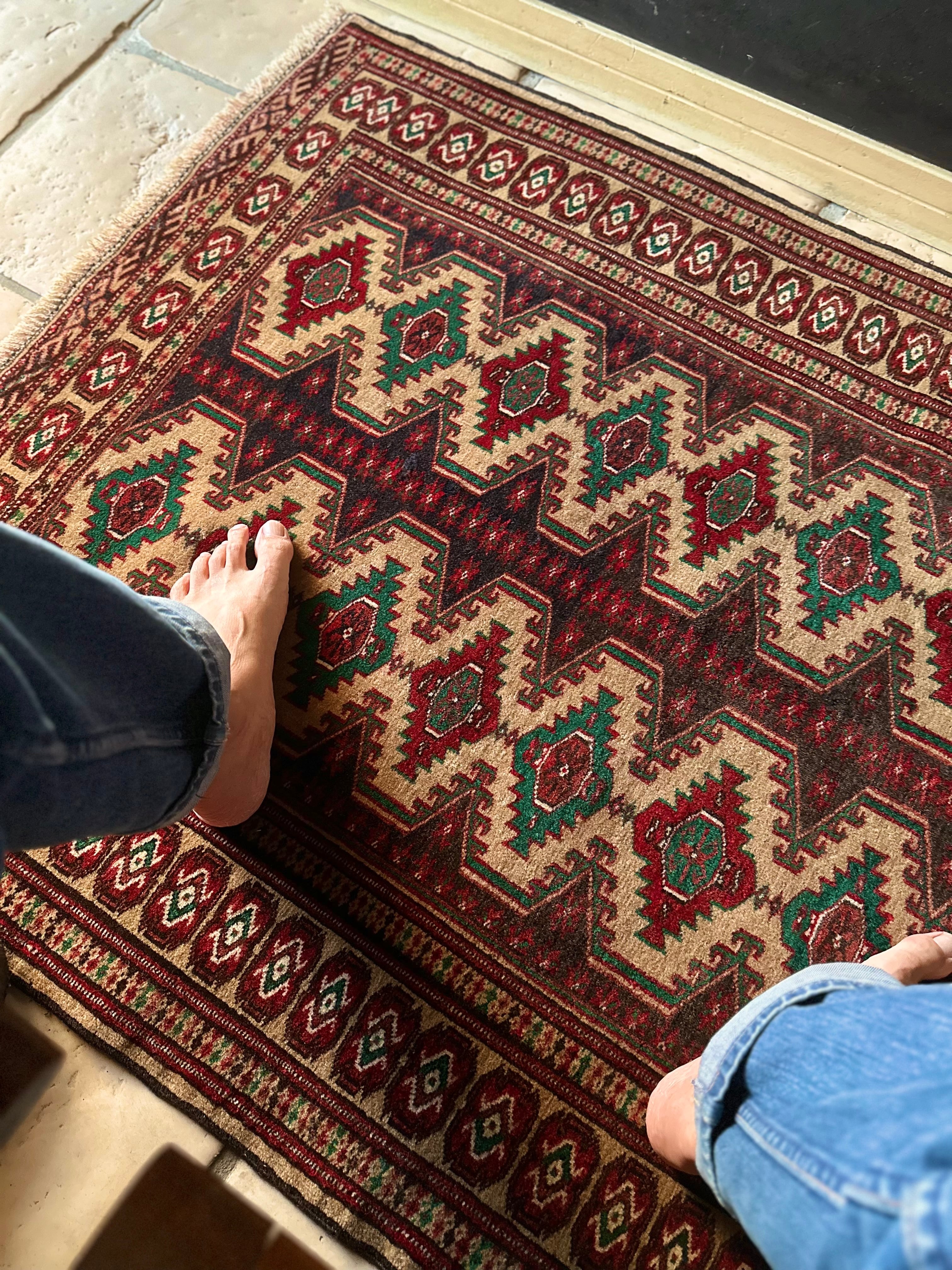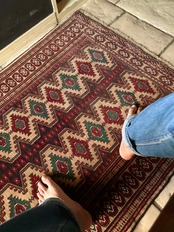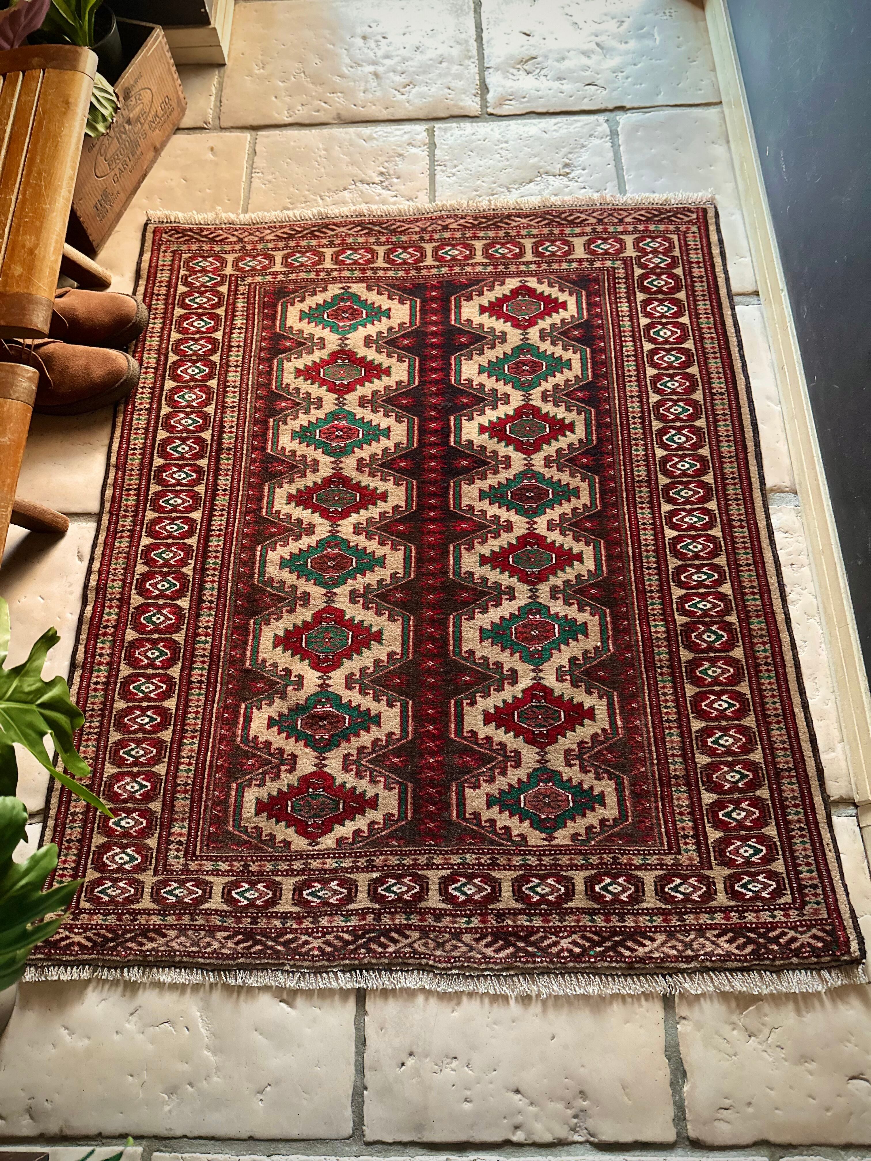 やや幅のある玄関マットのサイズ感が珍しく、チェストや姿見前にもピッタリな大きさでしょうか。トルクメンらしいギュッと詰まった密度のある織りで、パイル自体は短めのサラッとした手触りが特徴的な1枚になります。