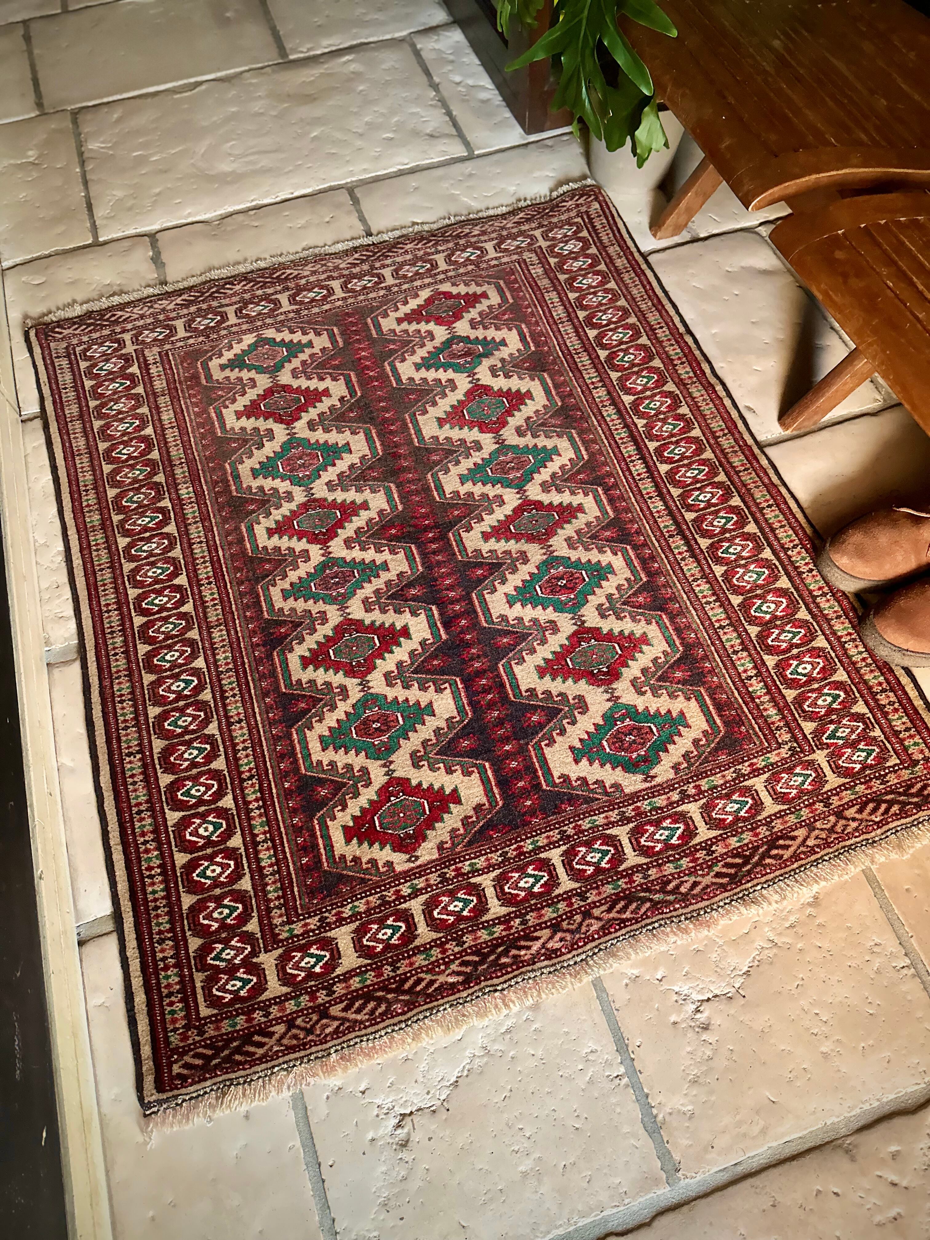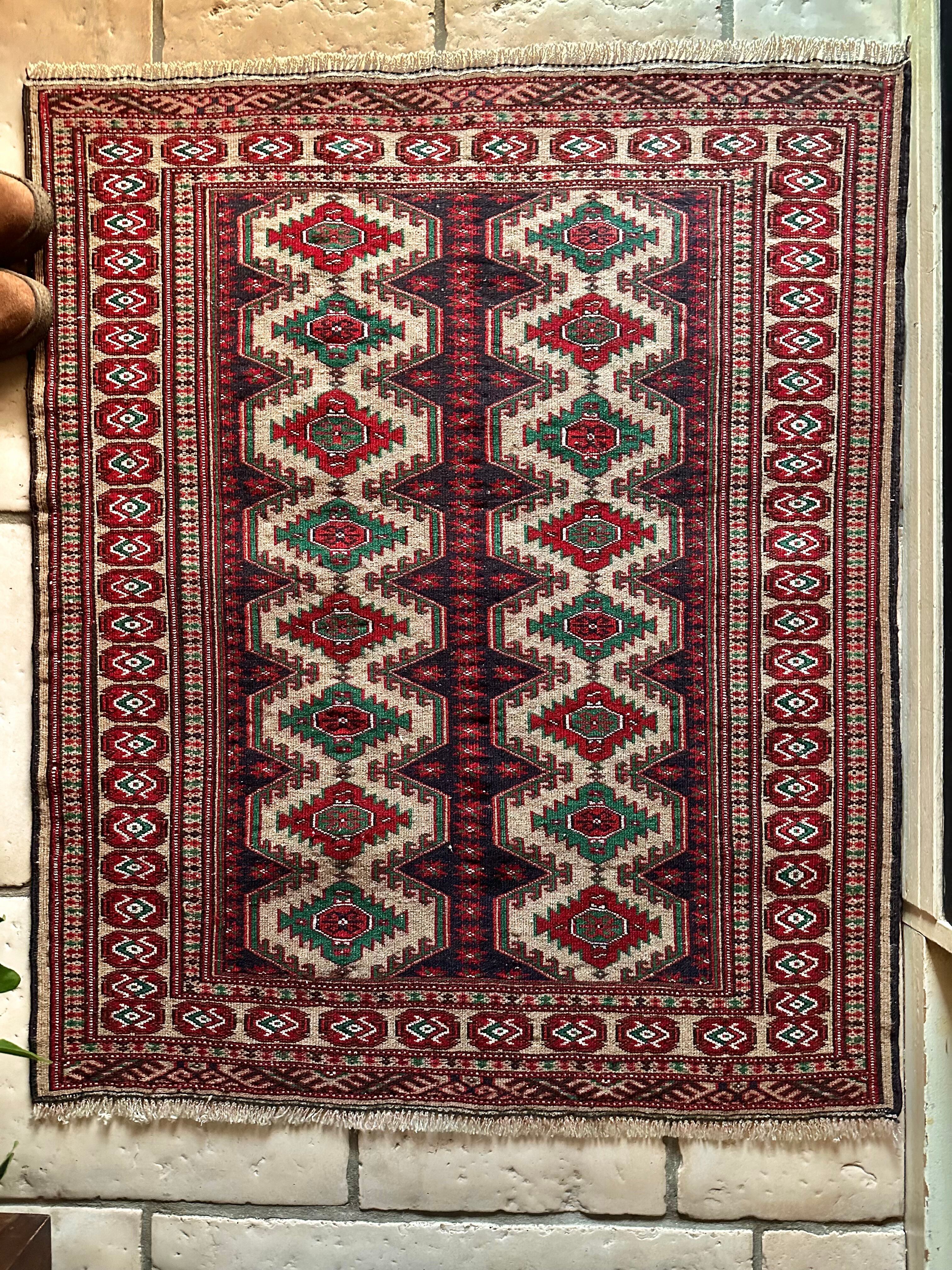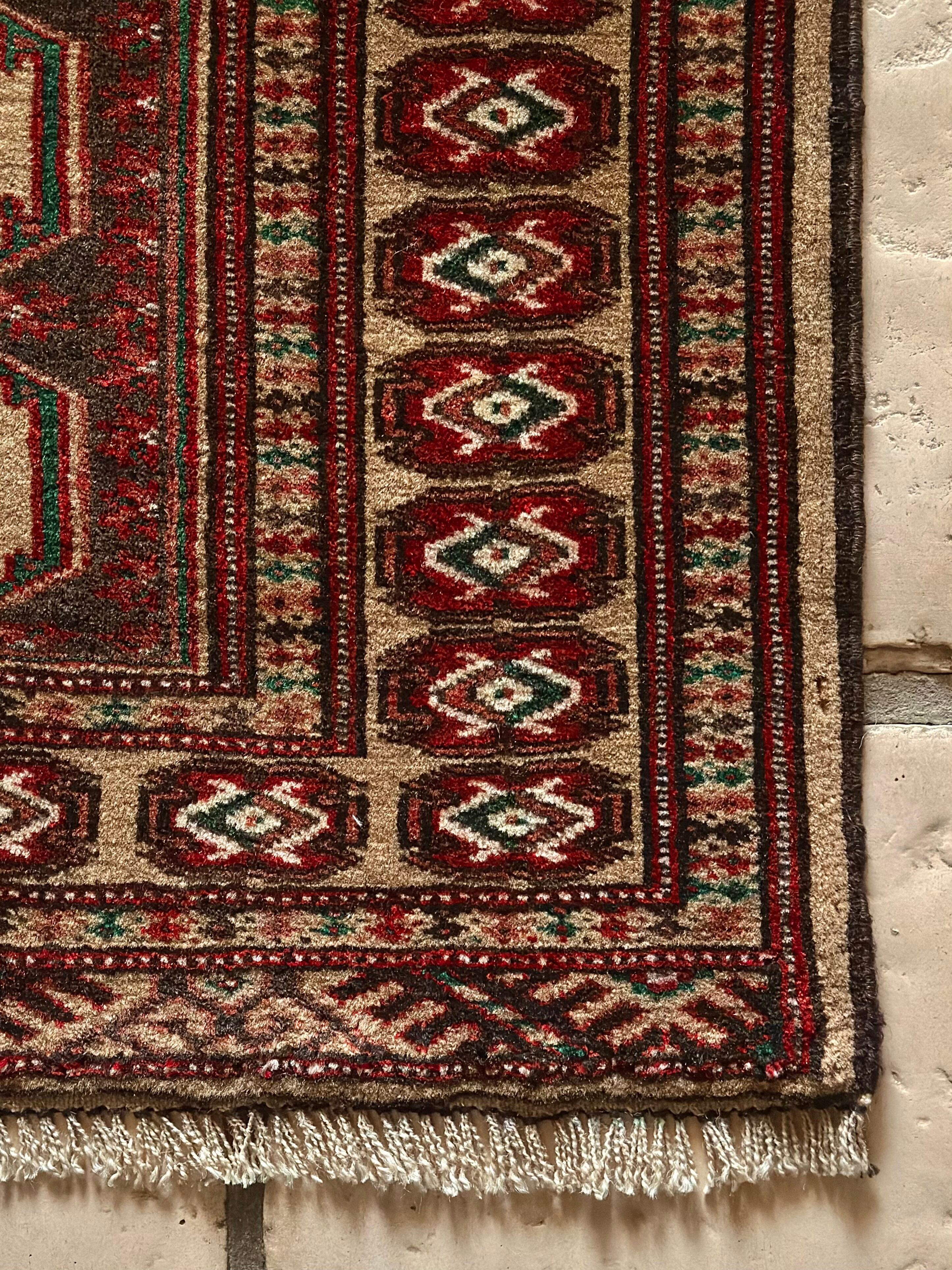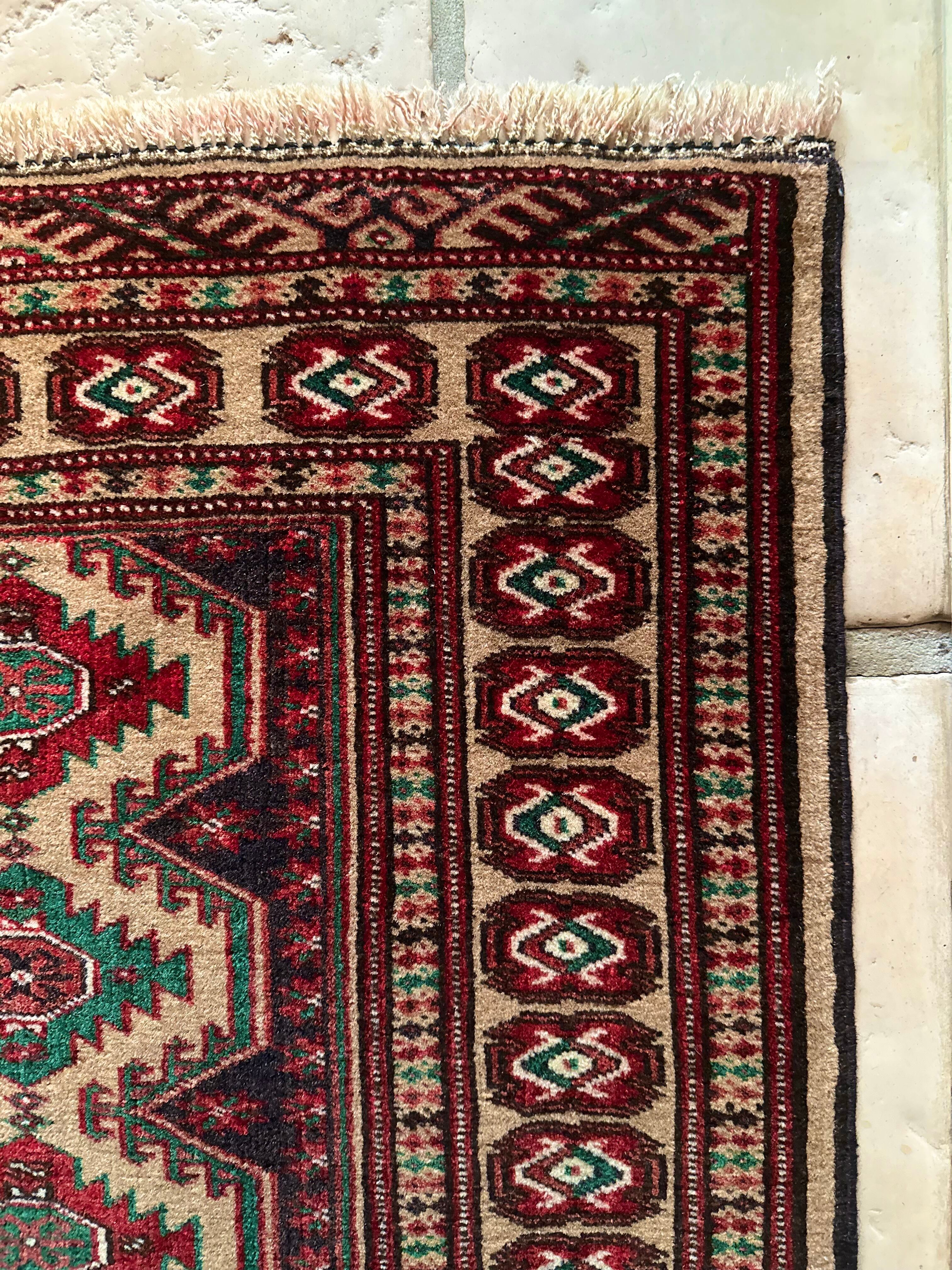 こちらベージュをベースとしたシンプルな1枚で、赤と緑で描かれた2連に並列したギュル紋様がかっこいい、アフガニスタン北部に居住するトルクメン族のトライバルラグになります。
