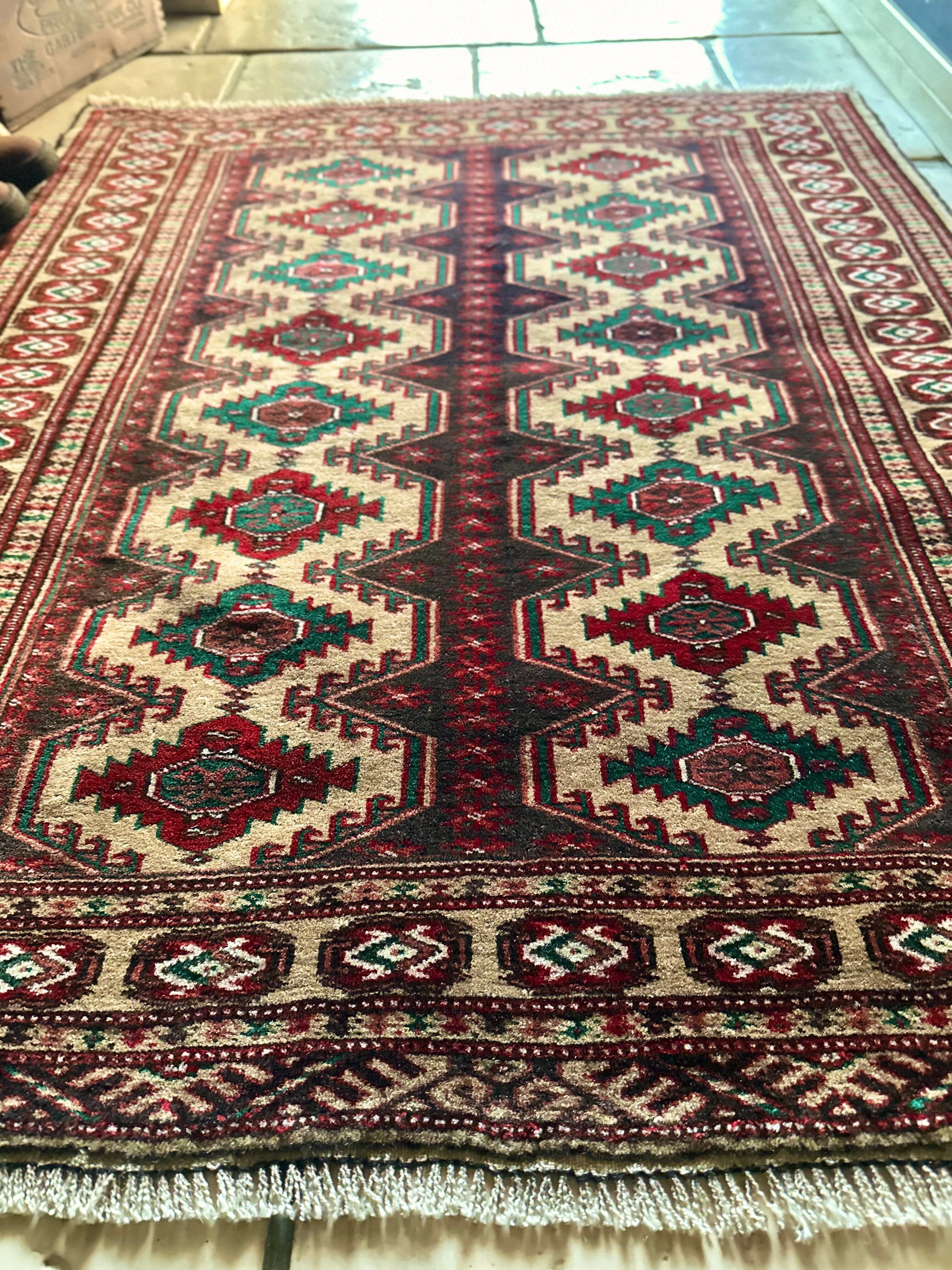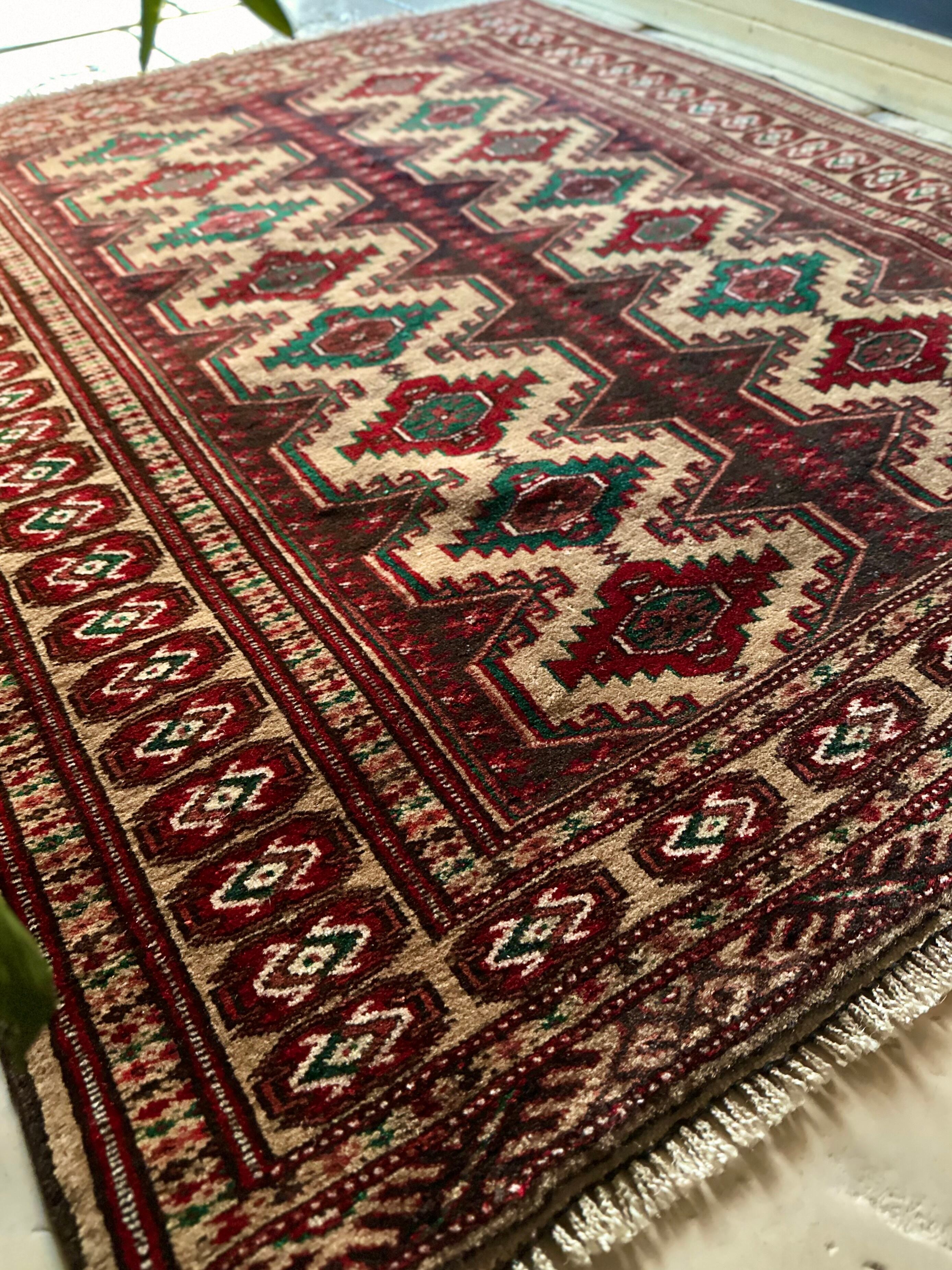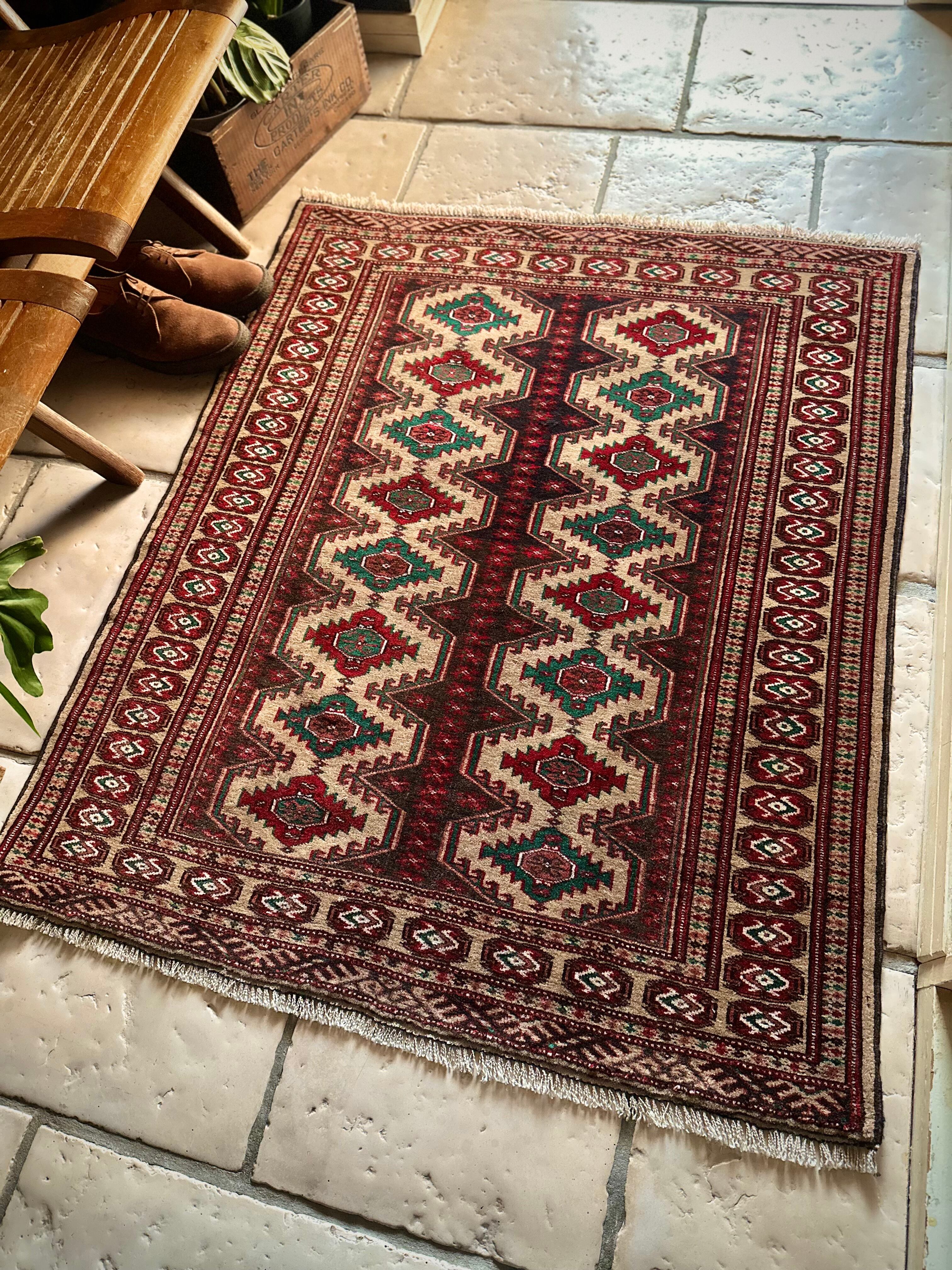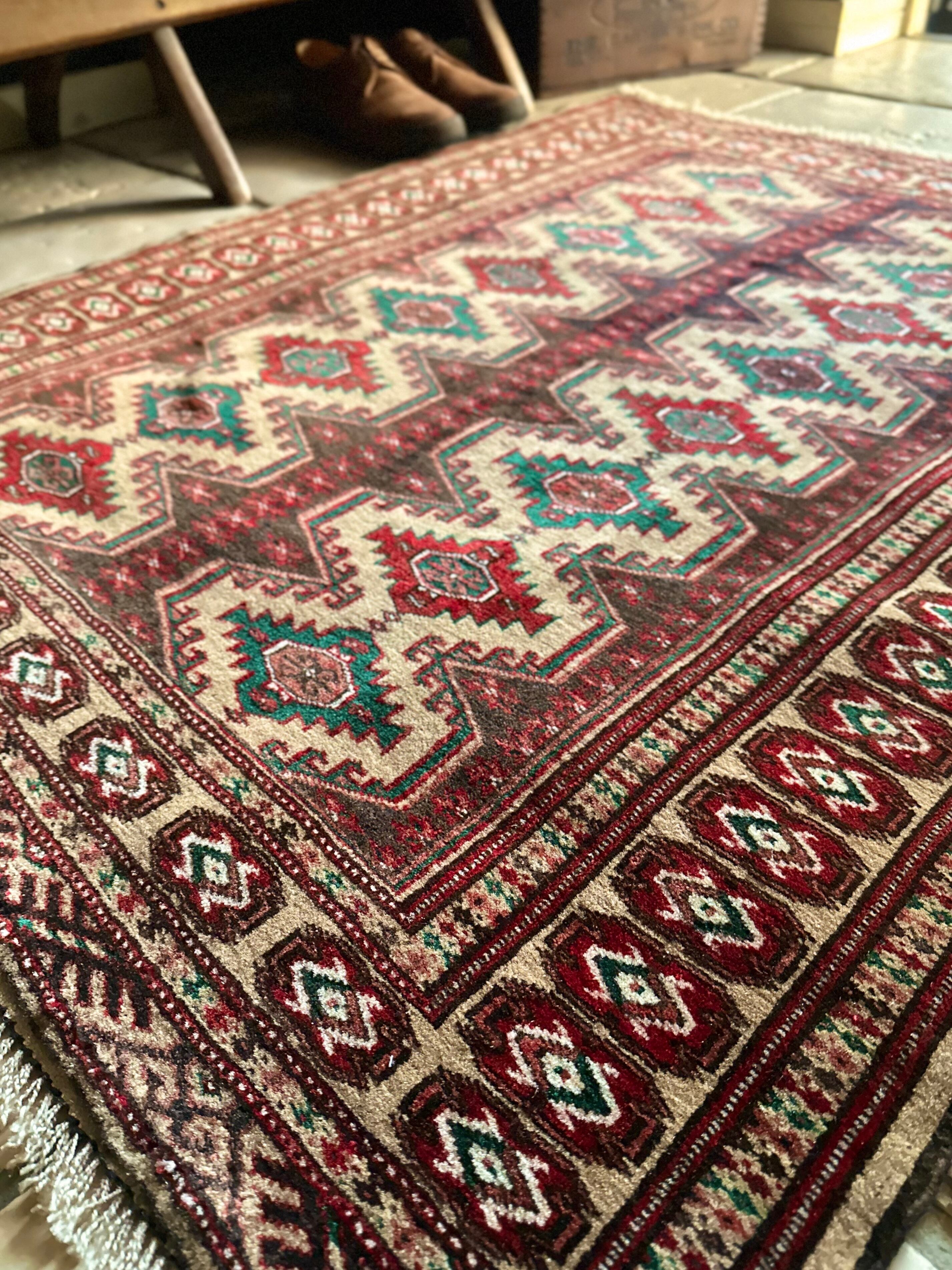 こちらベージュをベースとしたシンプルな1枚で、赤と緑で描かれた2連に並列したギュル紋様がかっこいい、アフガニスタン北部に居住するトルクメン族のトライバルラグになります。