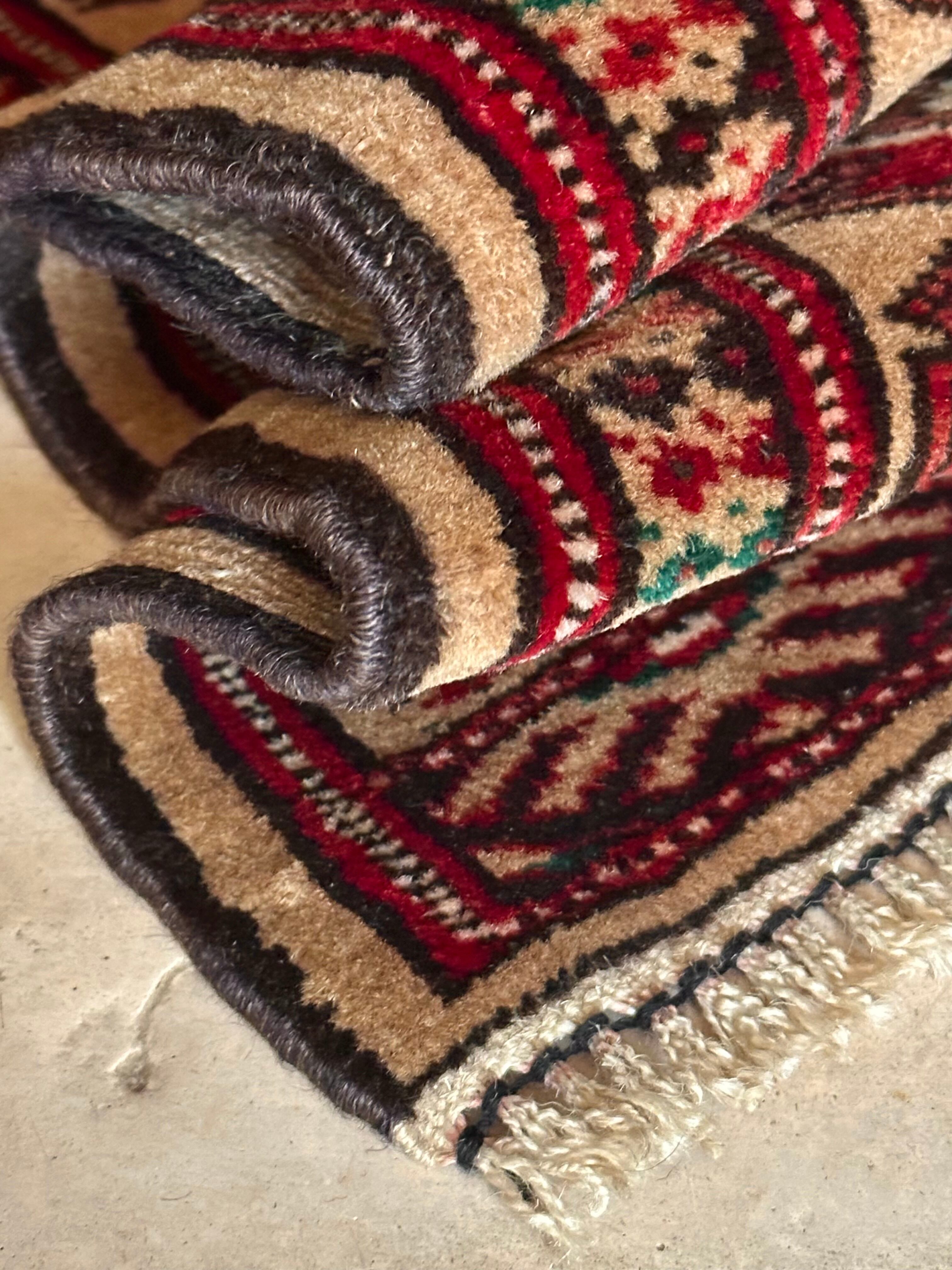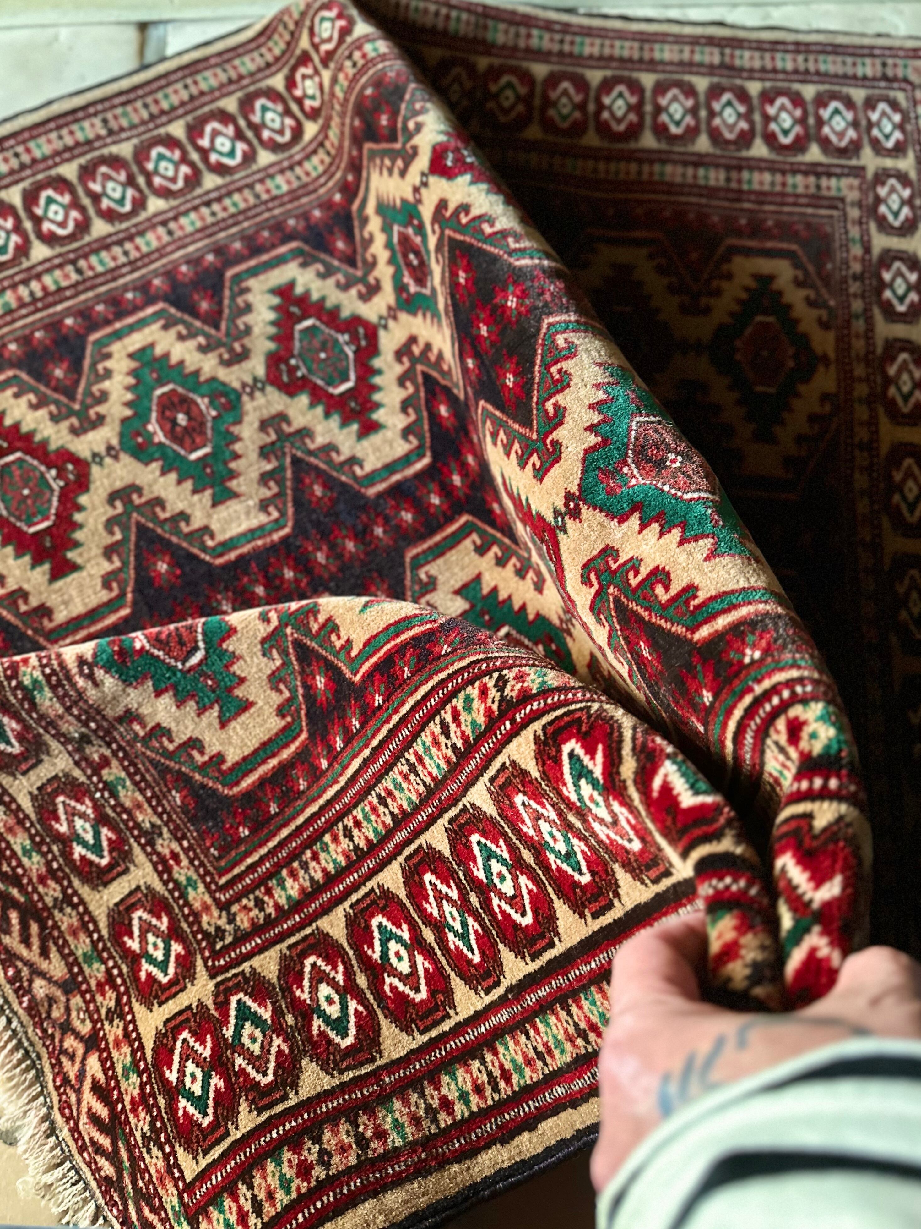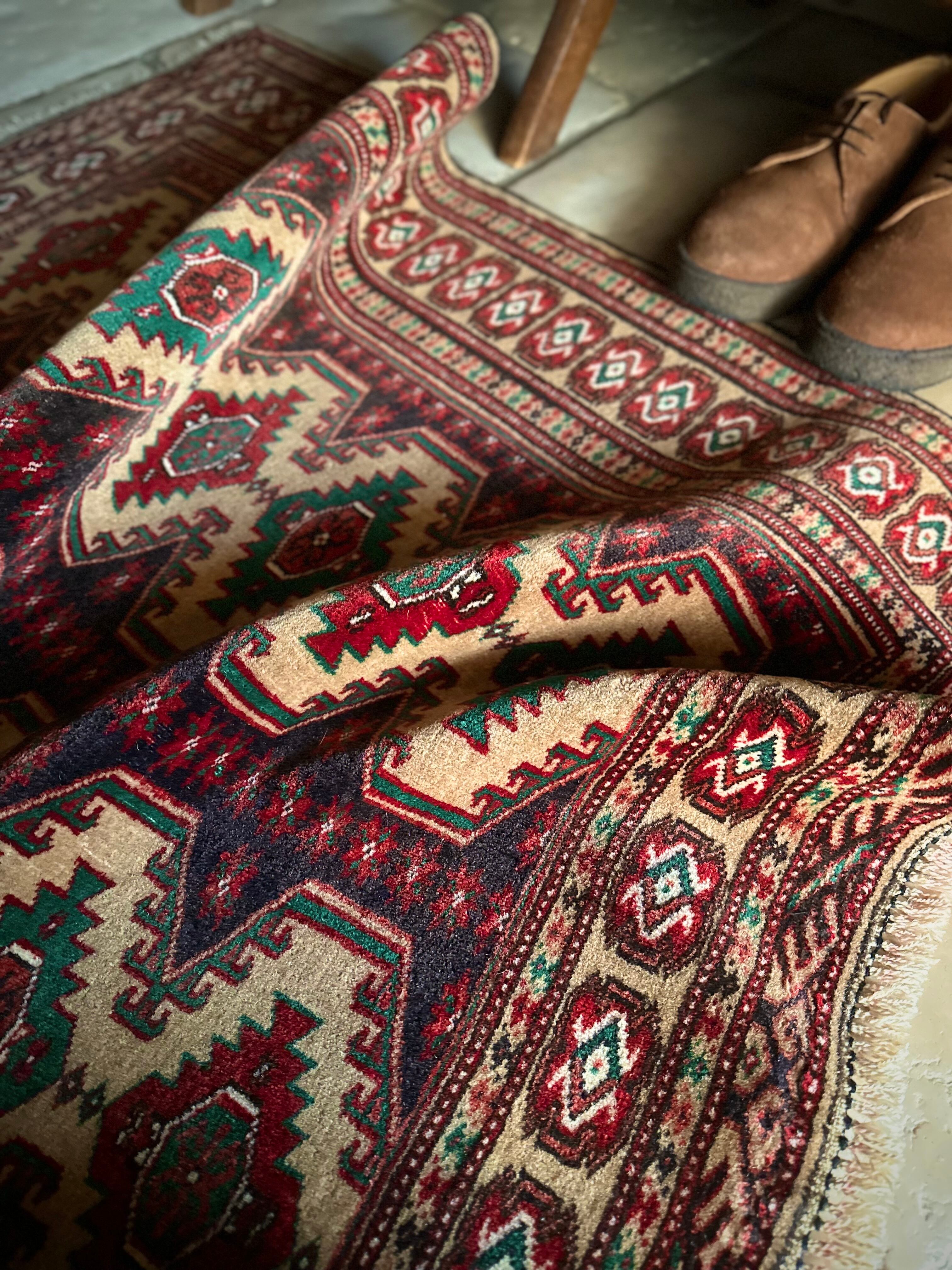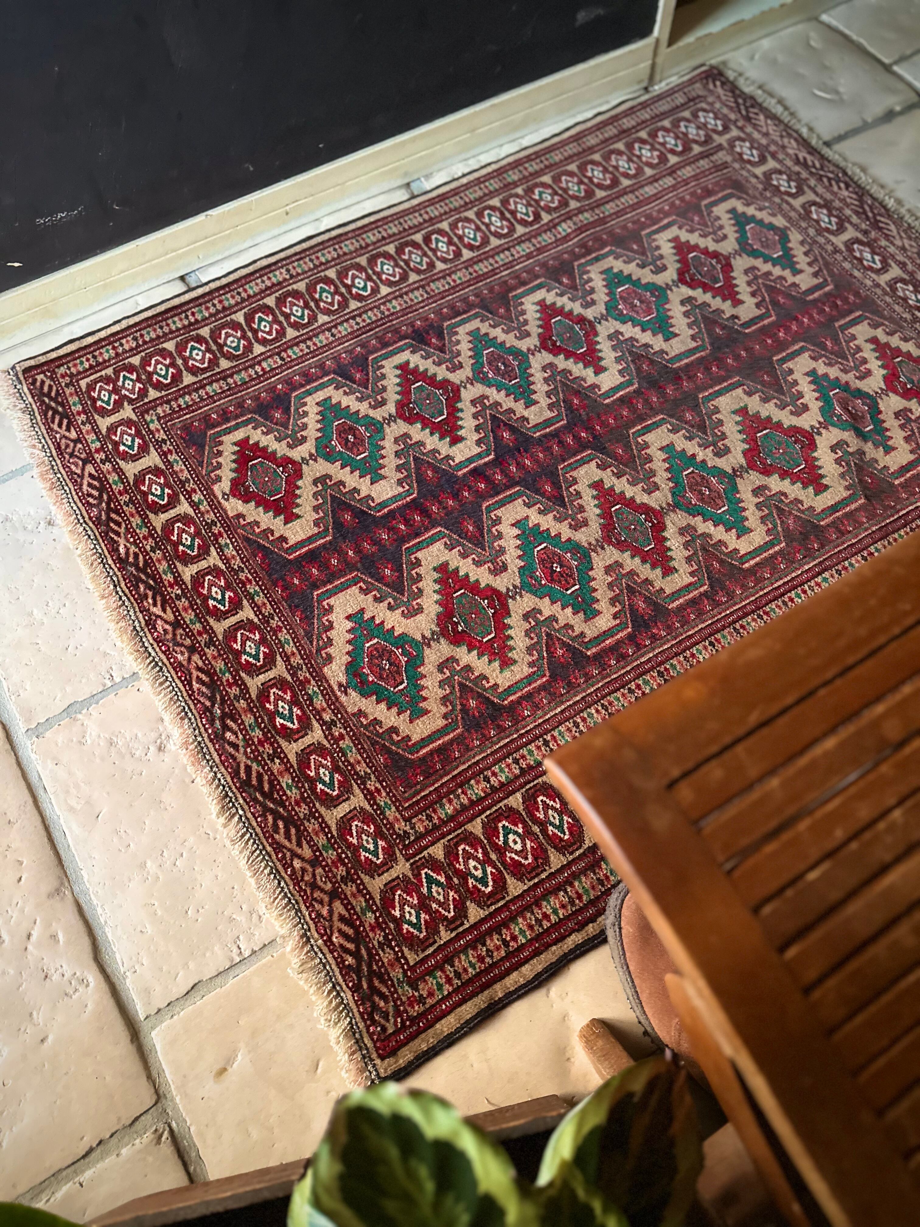 こちらベージュをベースとしたシンプルな1枚で、赤と緑で描かれた2連に並列したギュル紋様がかっこいい、アフガニスタン北部に居住するトルクメン族のトライバルラグになります。