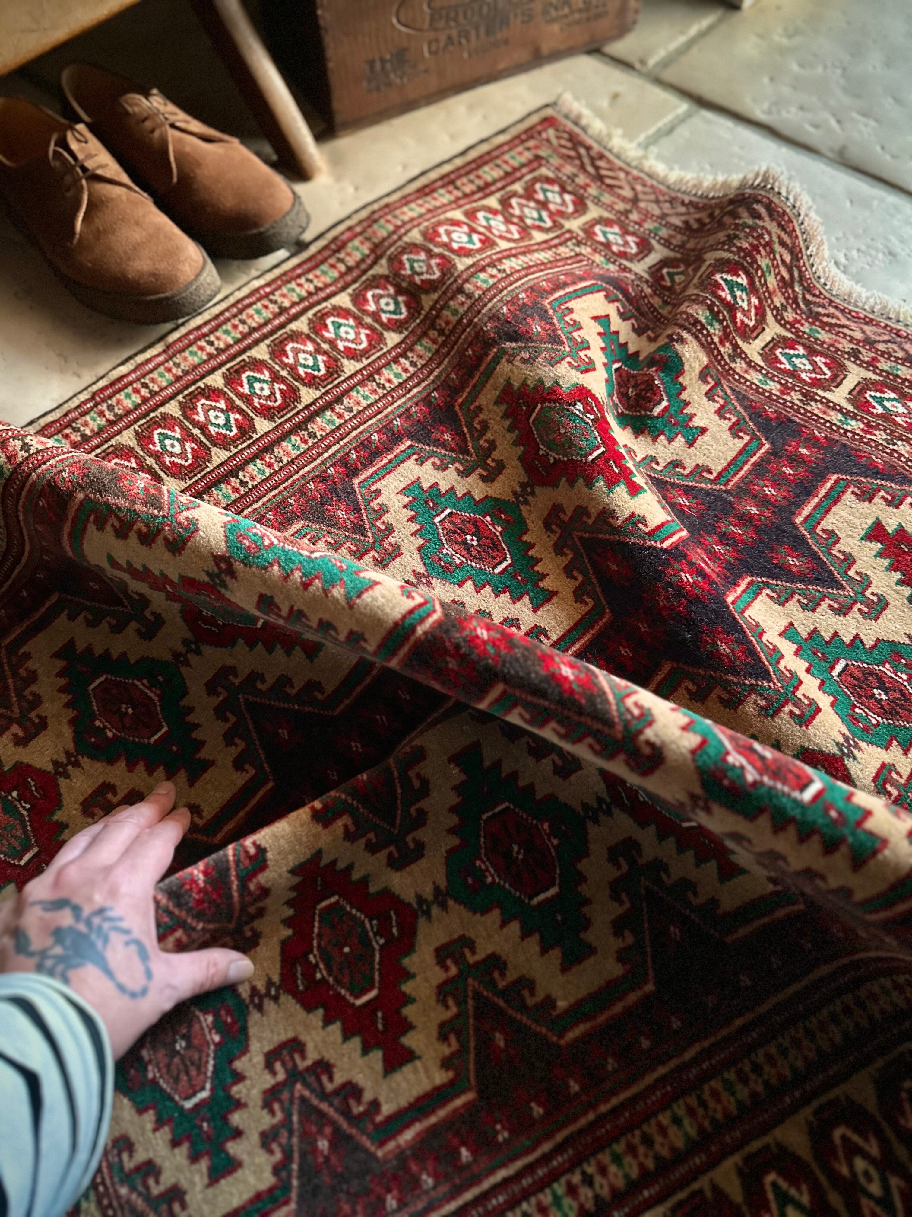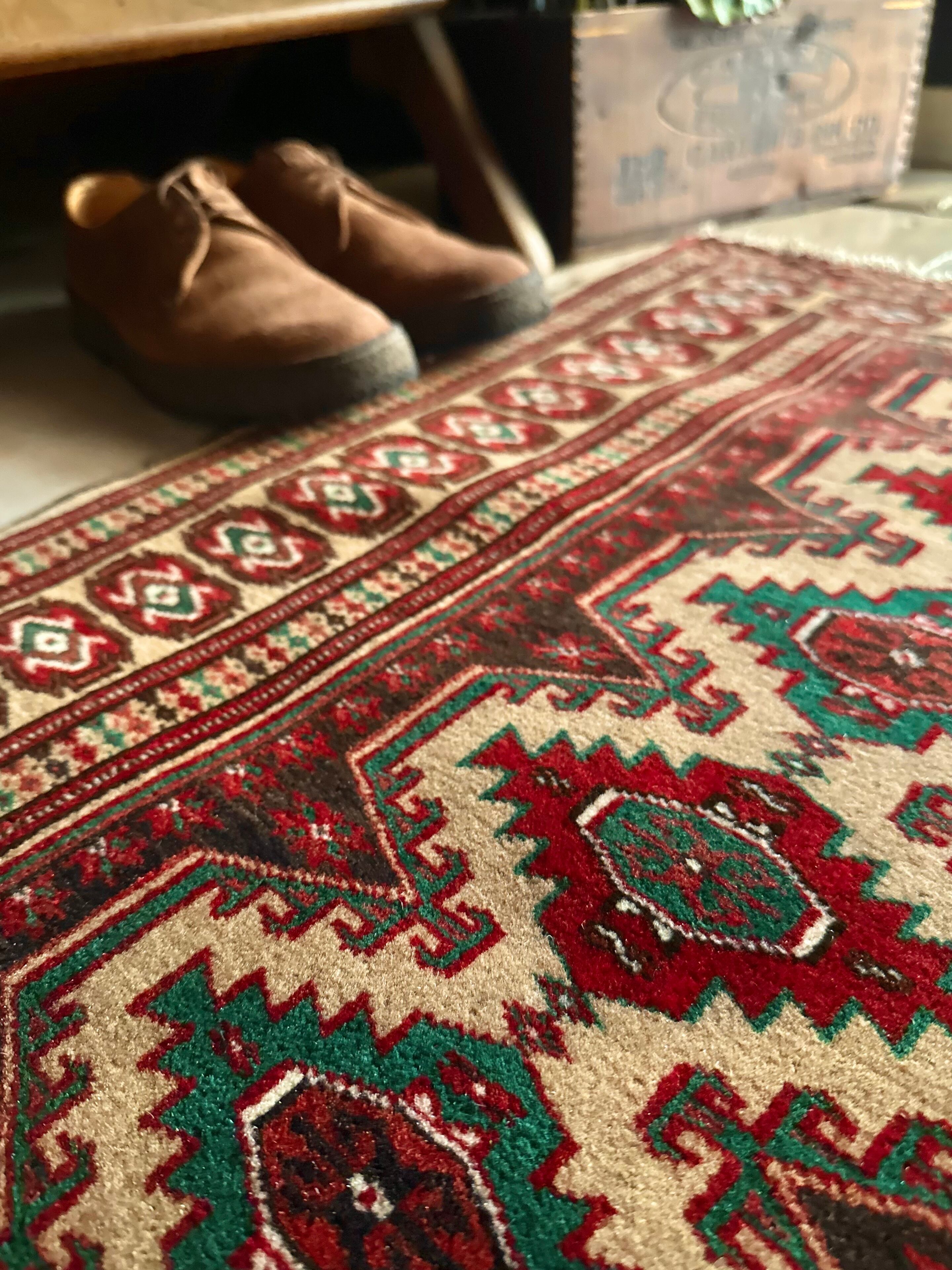 最後にラグそのものに関しては羊毛特有の匂いがあり、採寸は中央付近で計測していますが、手織りならではの歪みによる誤差や水洗いクリーニングによる縮み、また草木染めによる経年劣化の色ムラなどがありますが、それもまたヴィンテージラグの魅力かとご理解ください。
