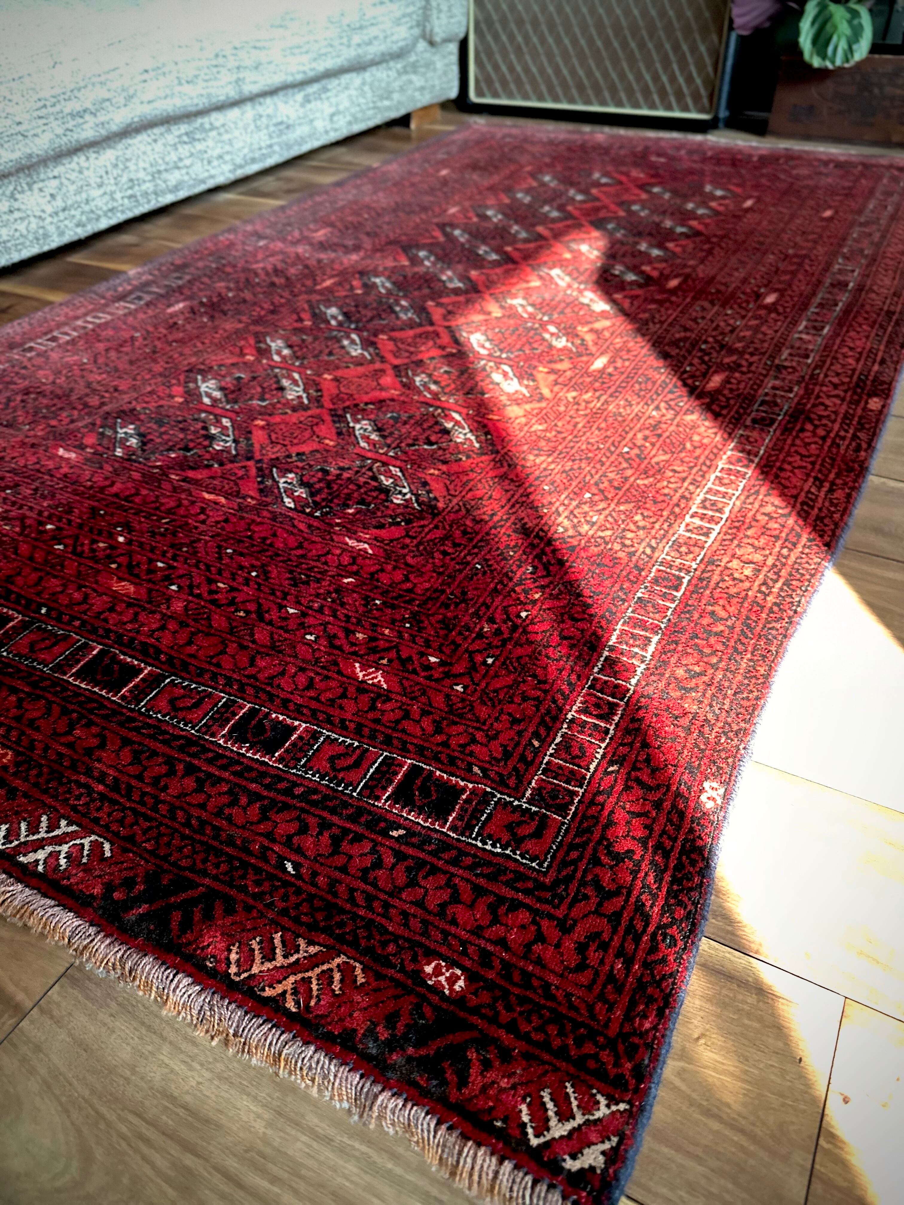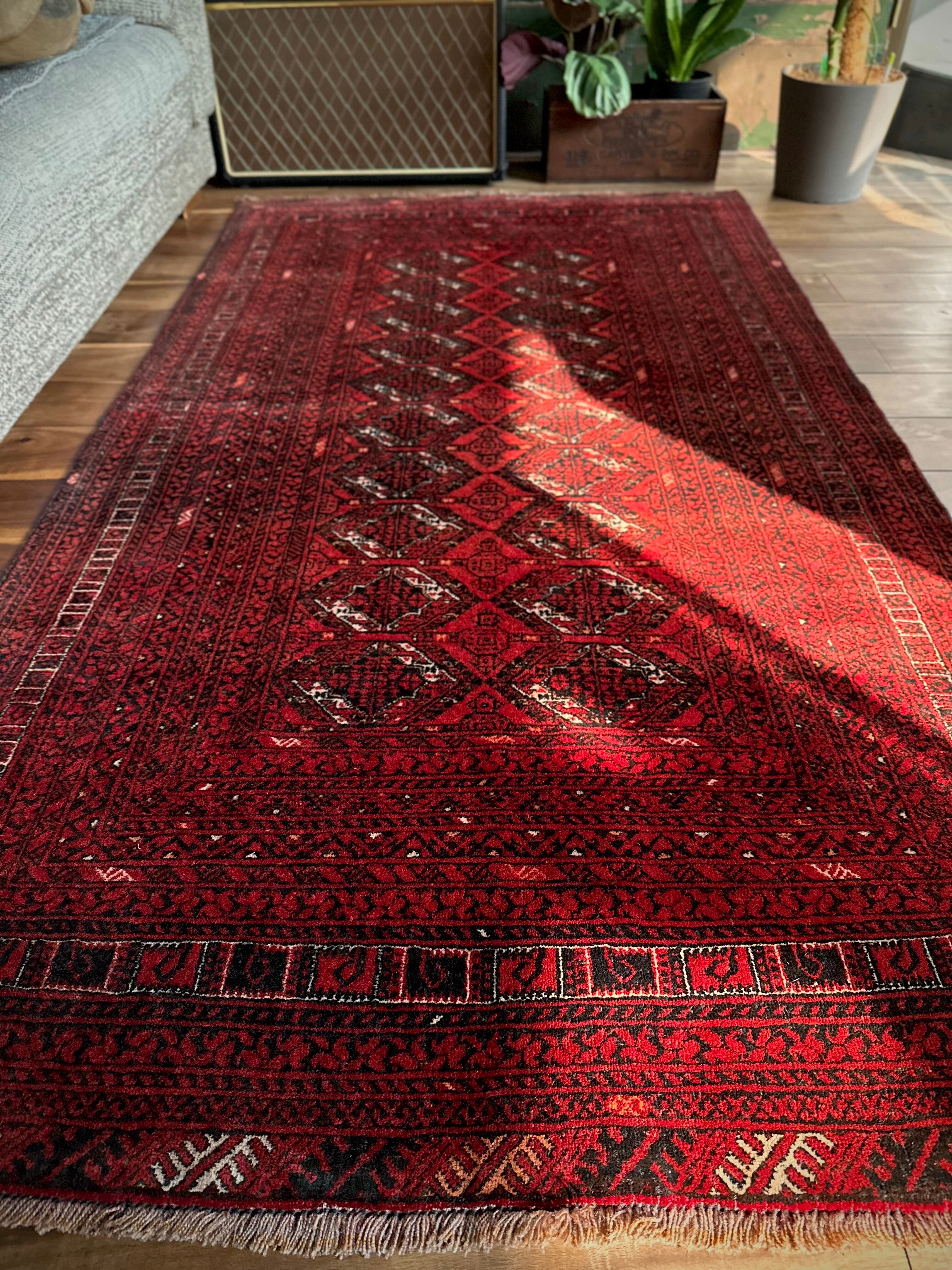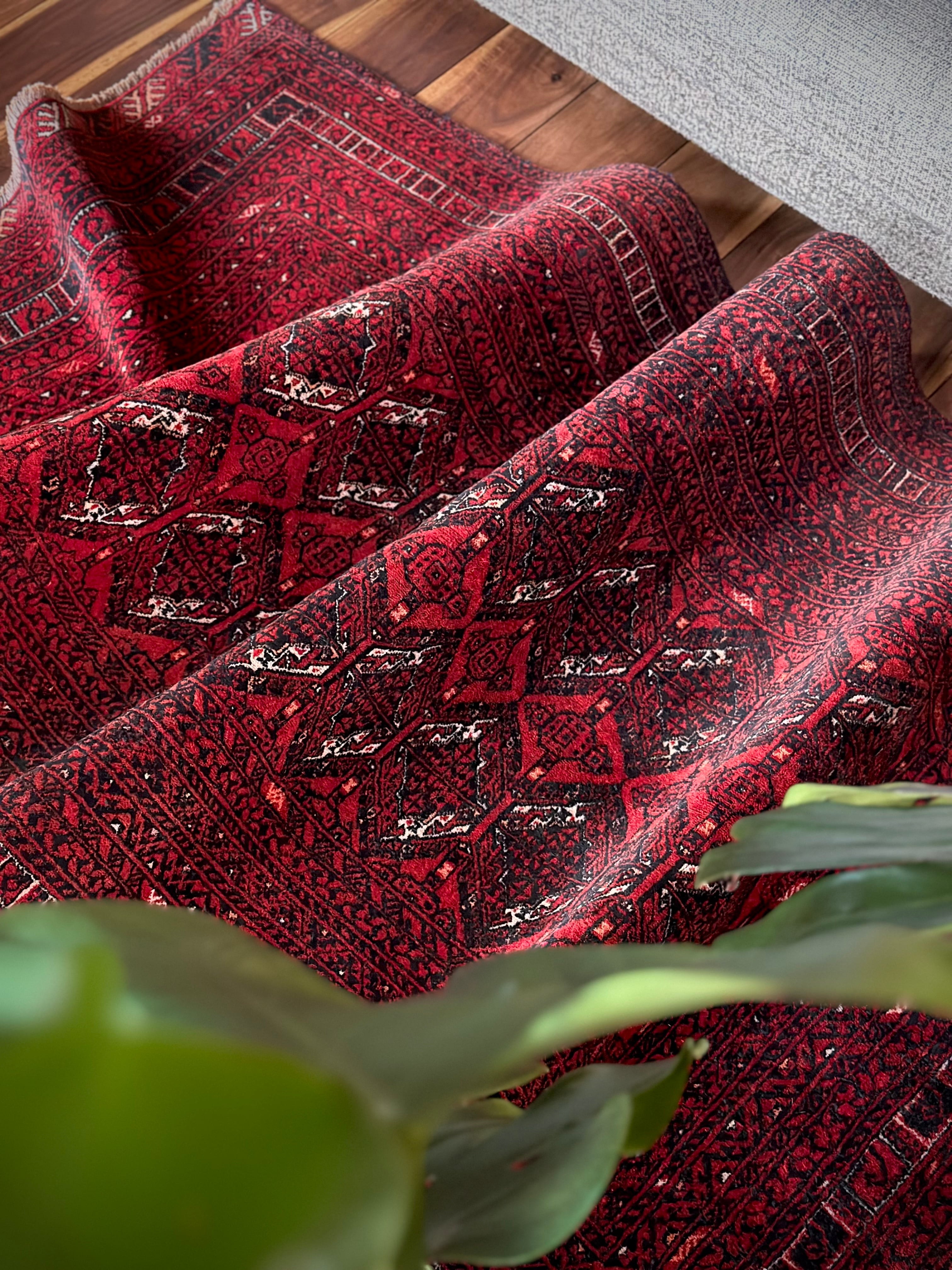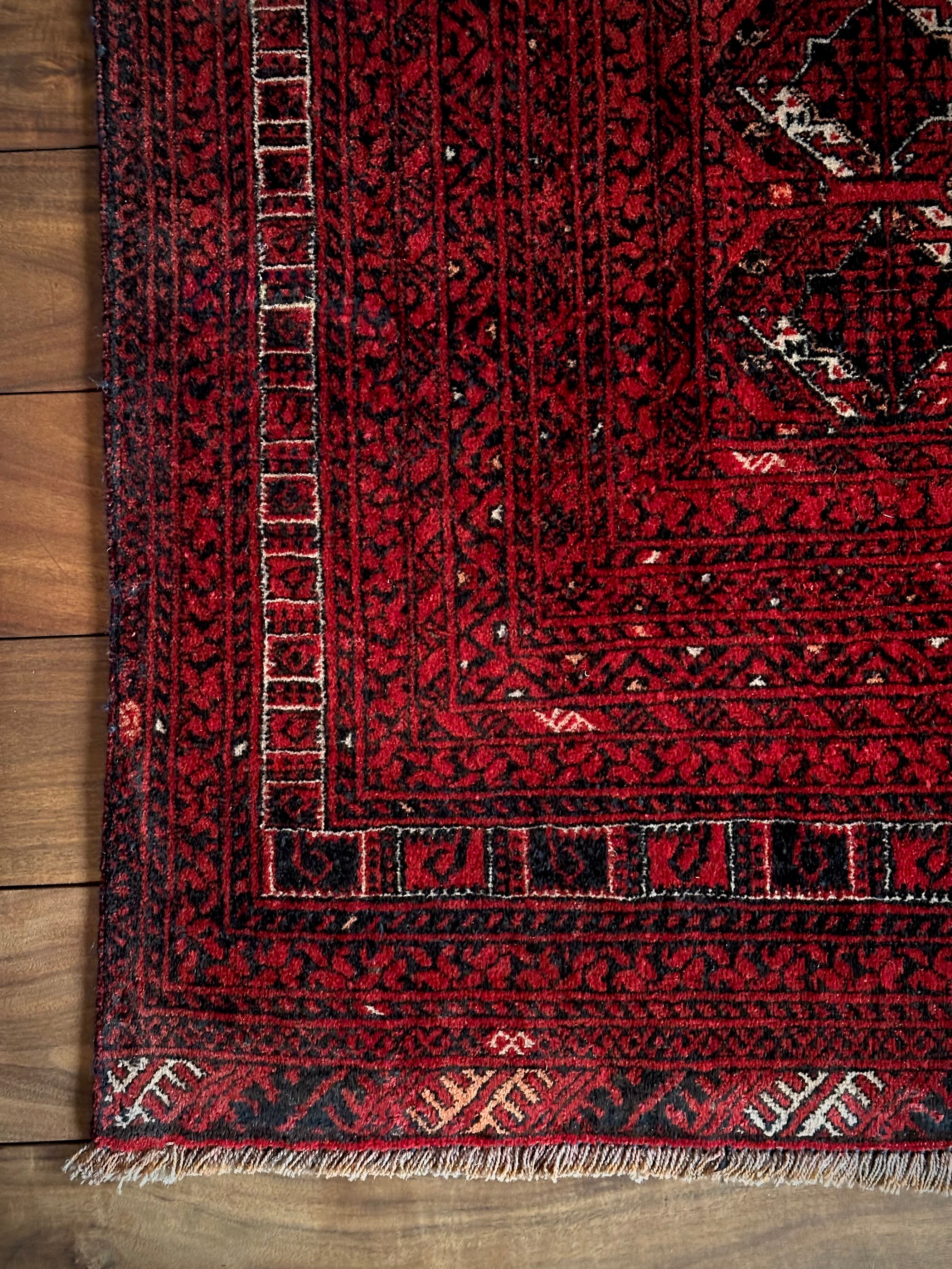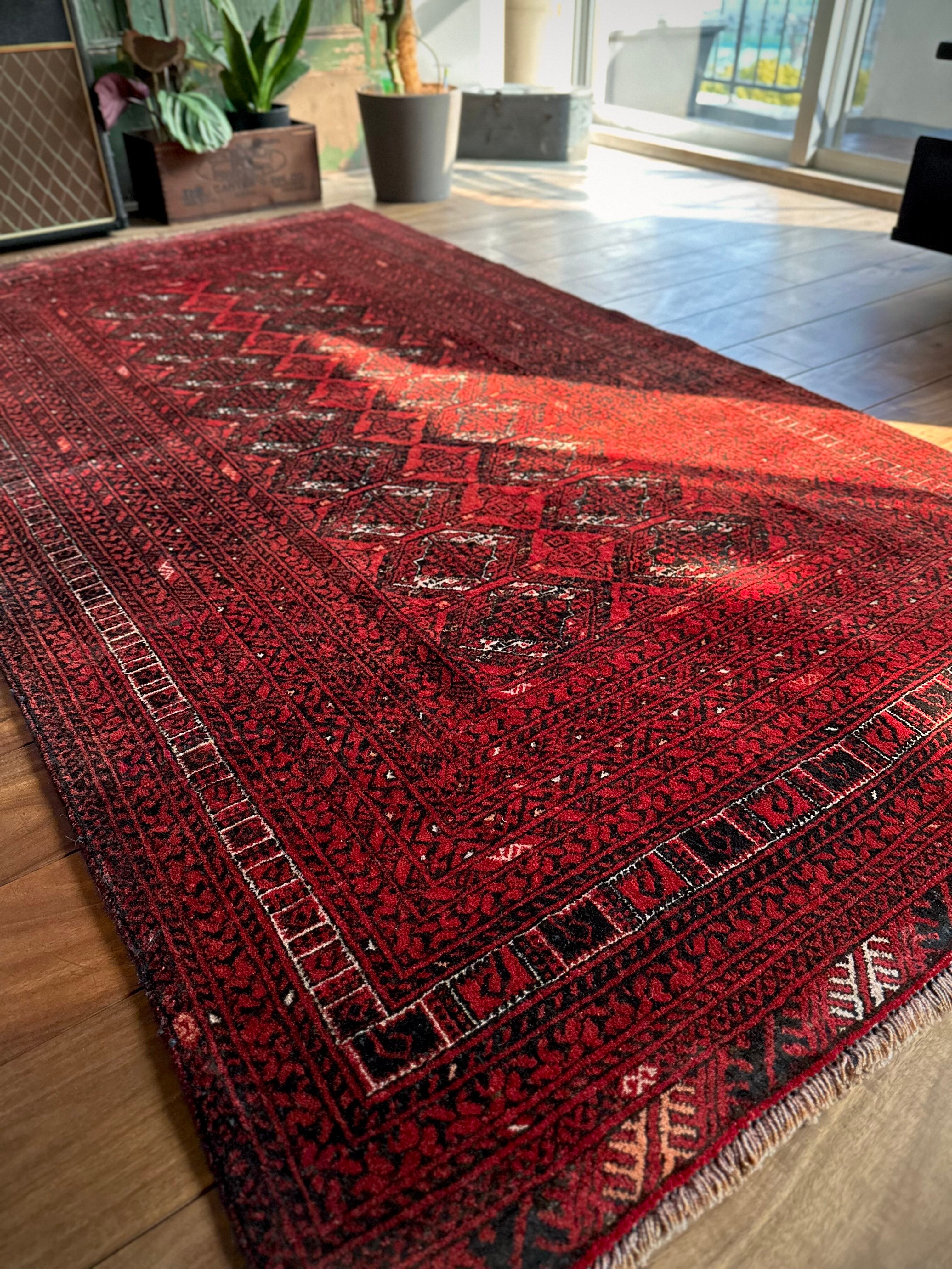 見るからにガシッと丈夫そうに織られた真っ赤な絨毯のこちらは、アフガニスタン北西部のマイマナに居住するトルクメン族のトライバルラグで、詳細は不明ですが”Baba Sediq”と呼ばれる柄の1枚になります。