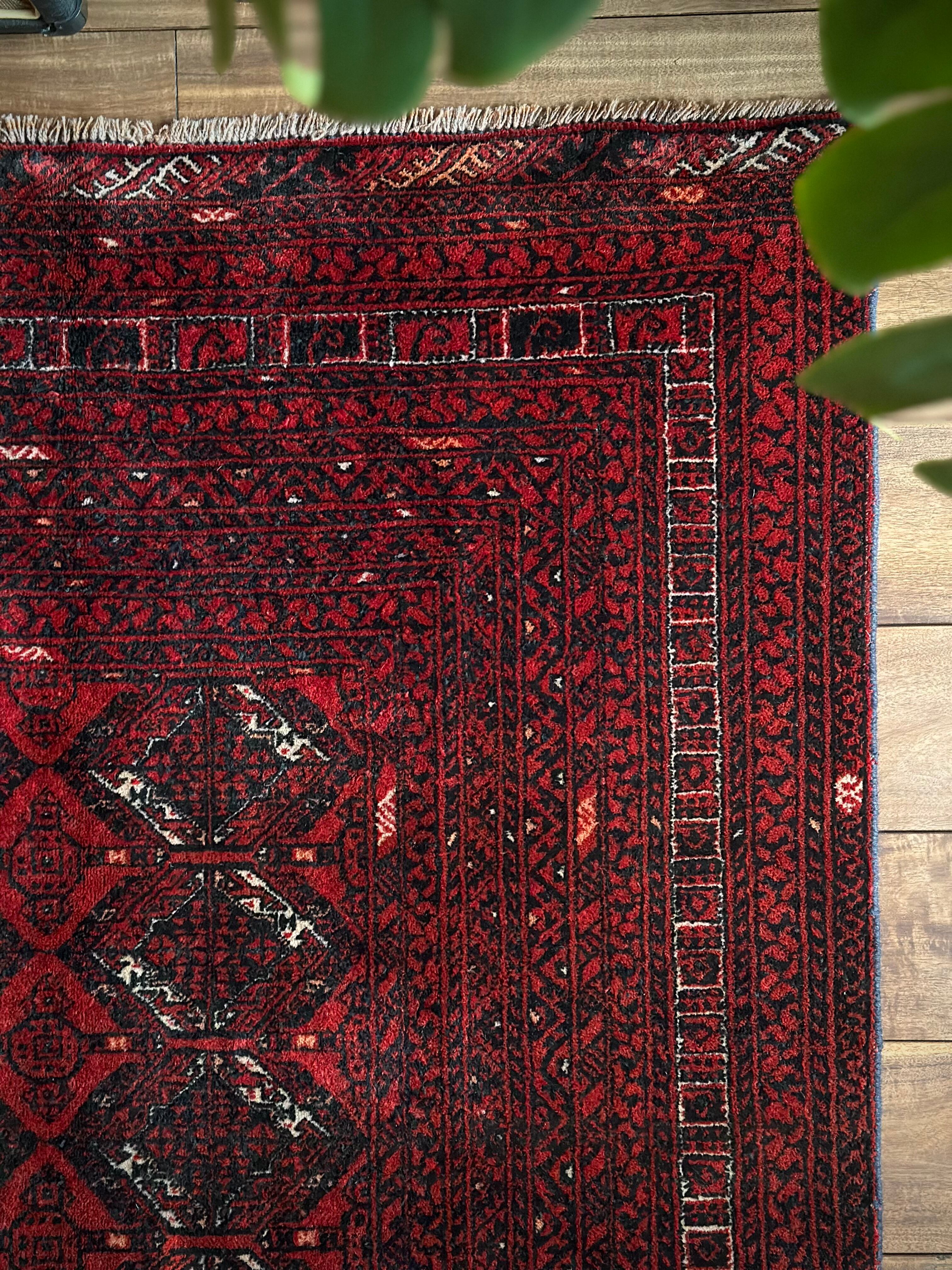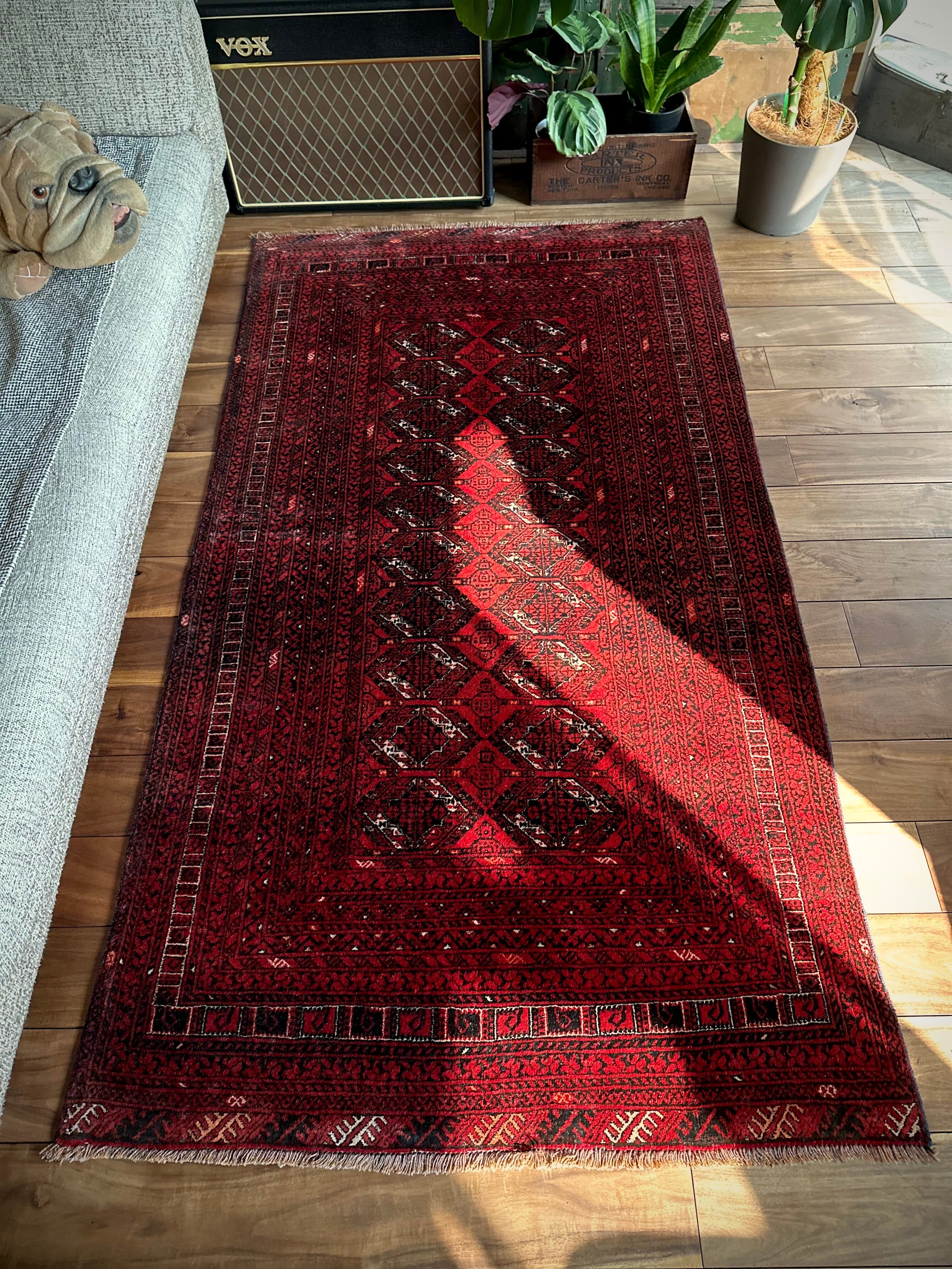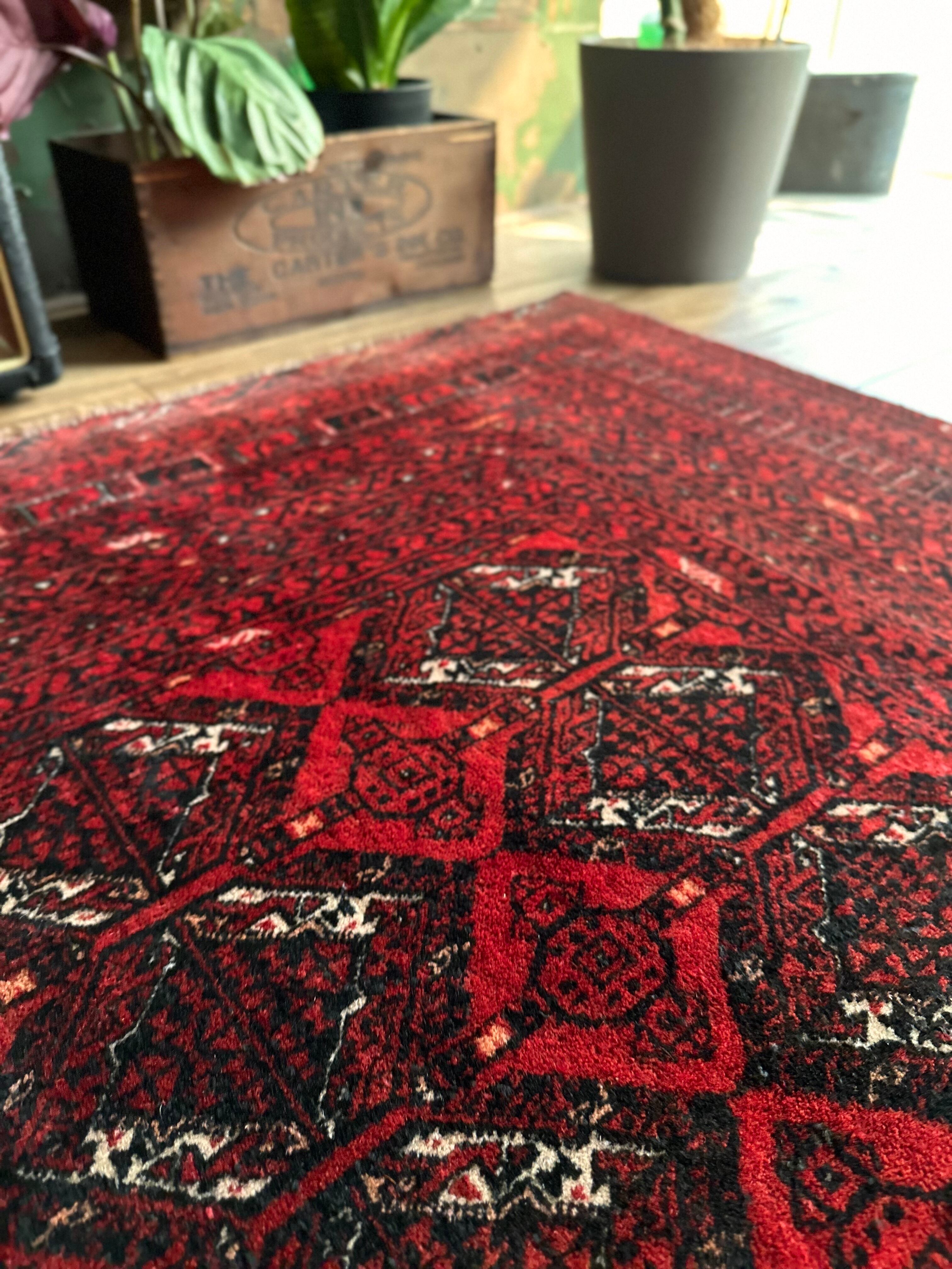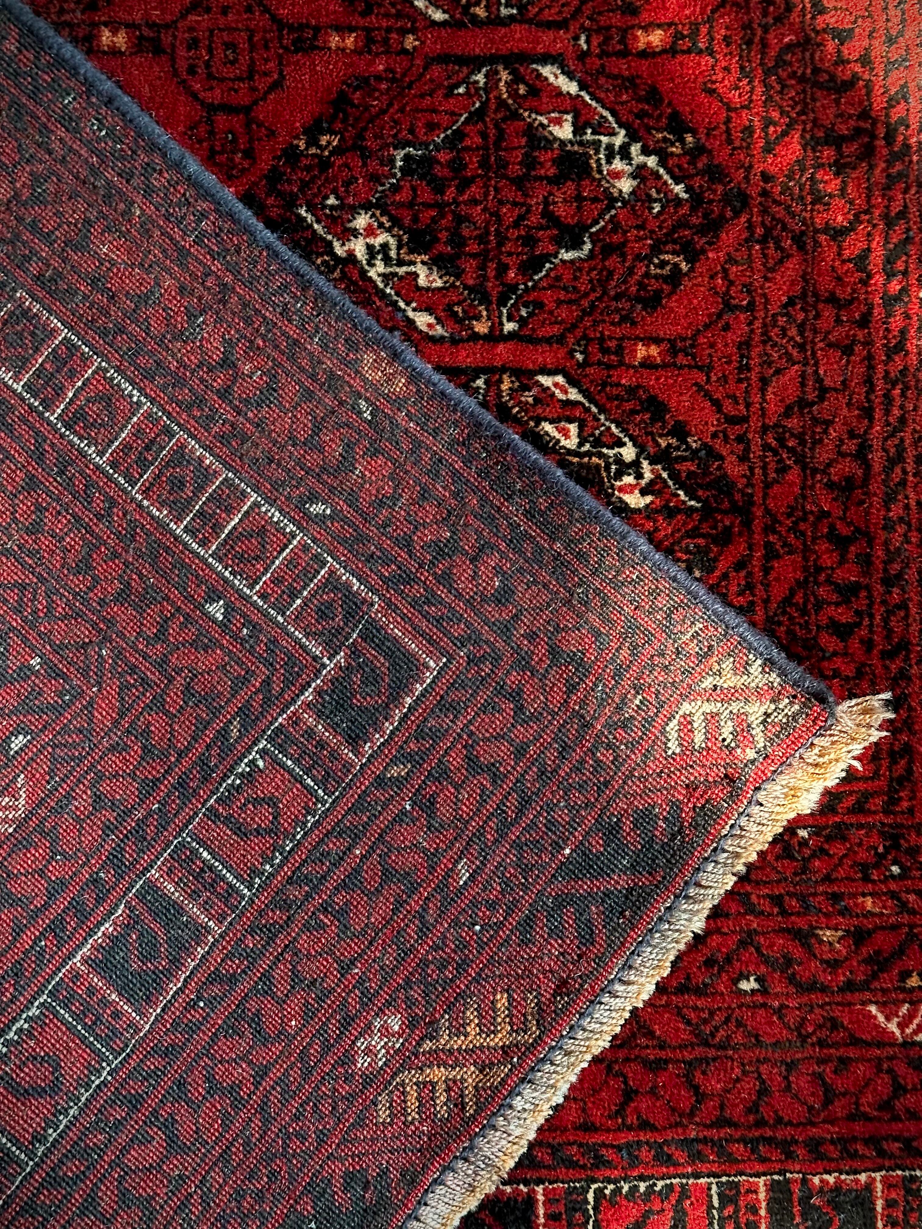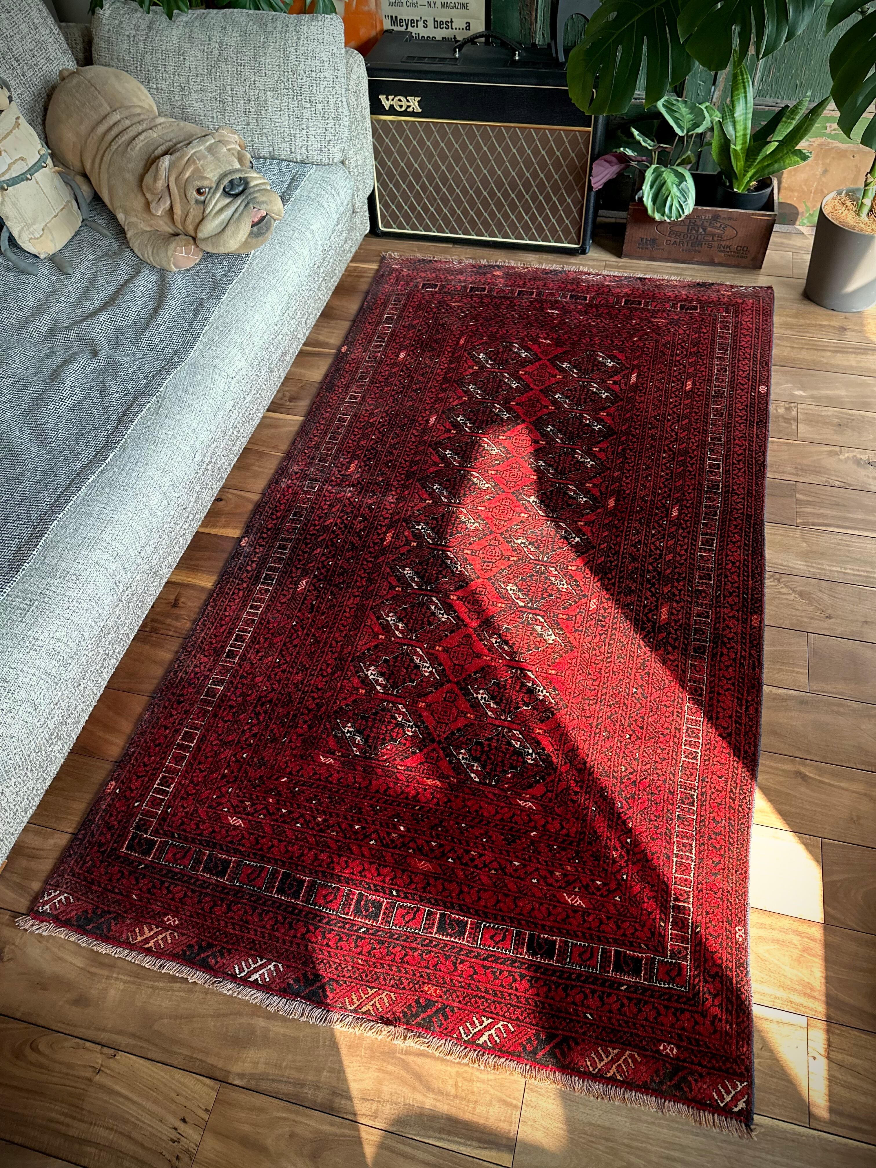 見るからにガシッと丈夫そうに織られた真っ赤な絨毯のこちらは、アフガニスタン北西部のマイマナに居住するトルクメン族のトライバルラグで、詳細は不明ですが”Baba Sediq”と呼ばれる柄の1枚になります。