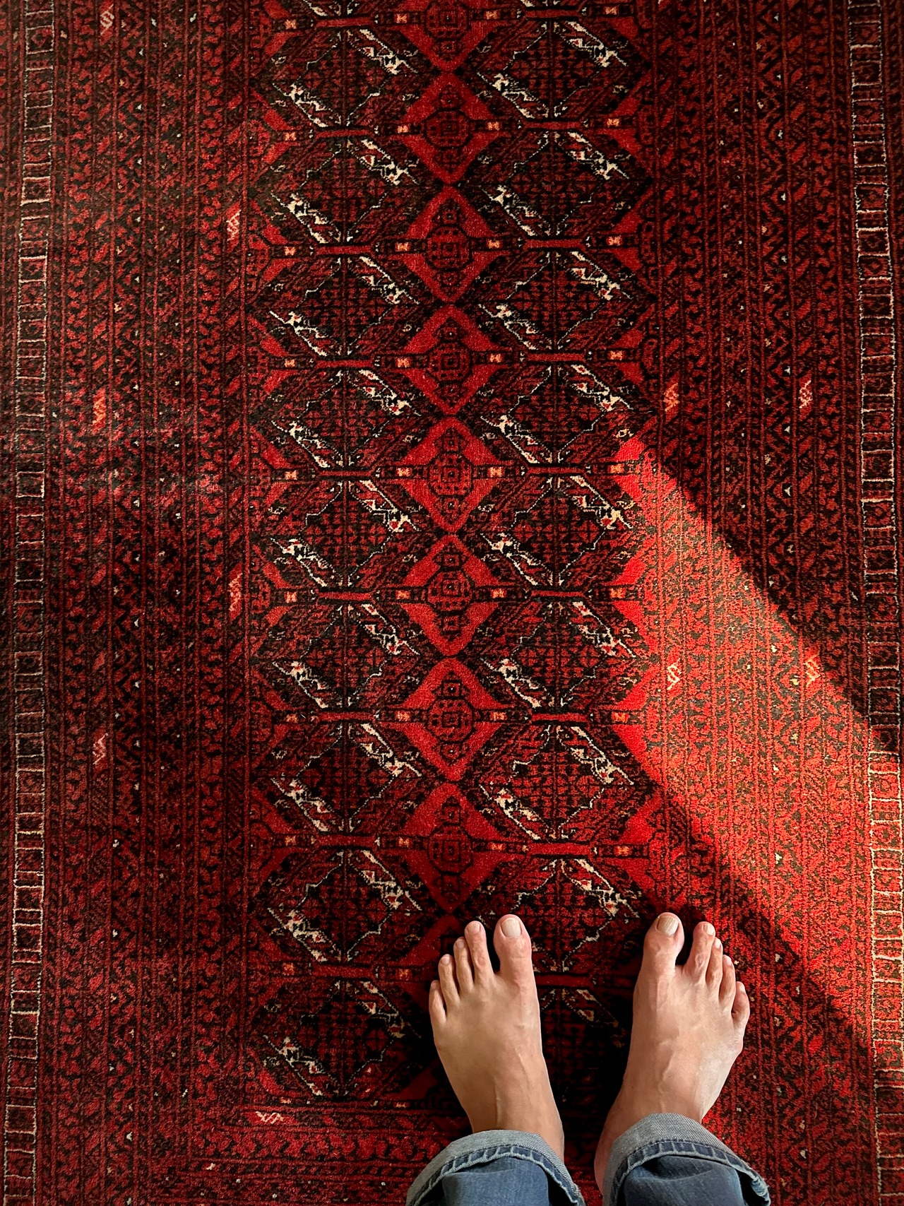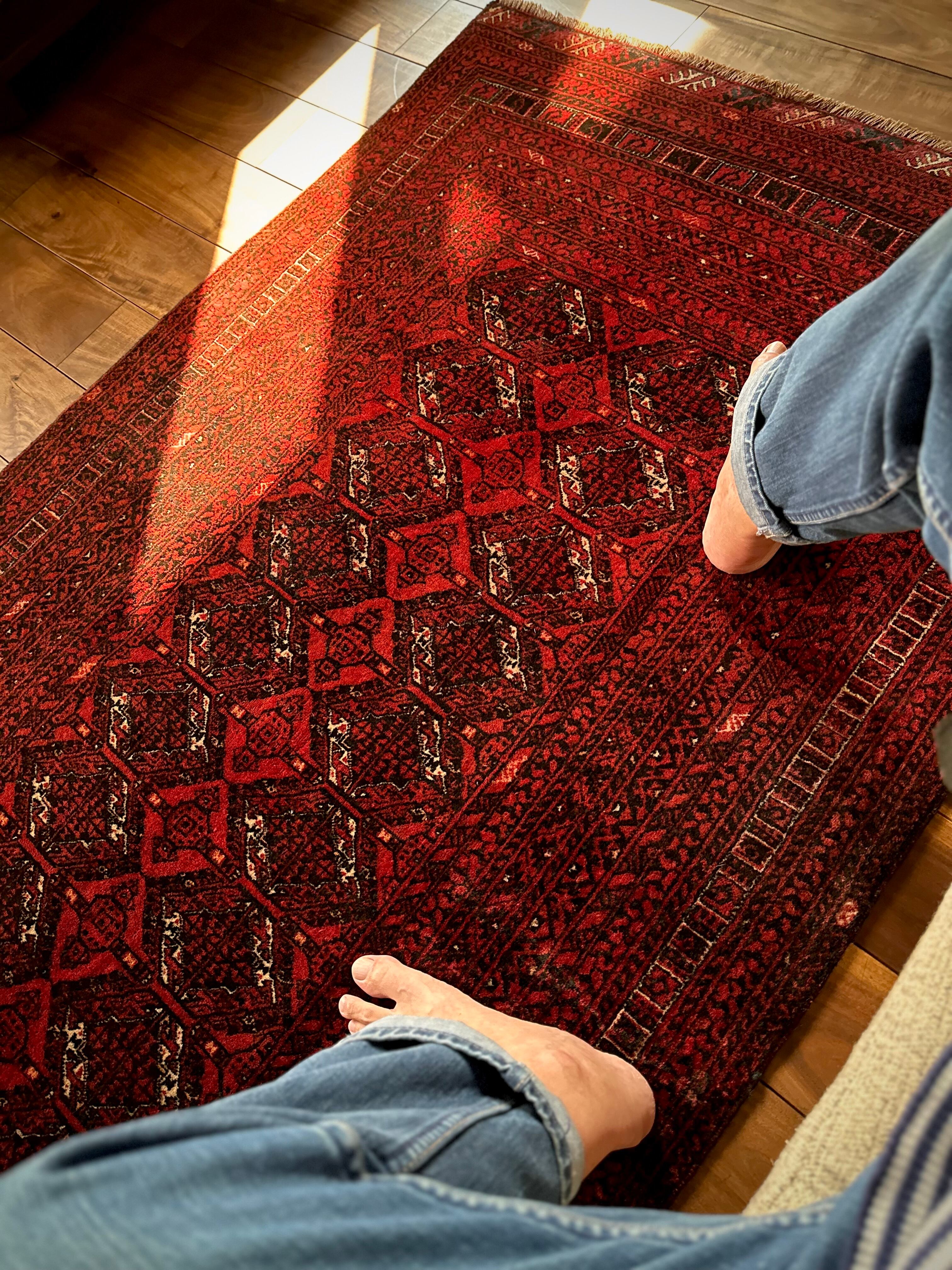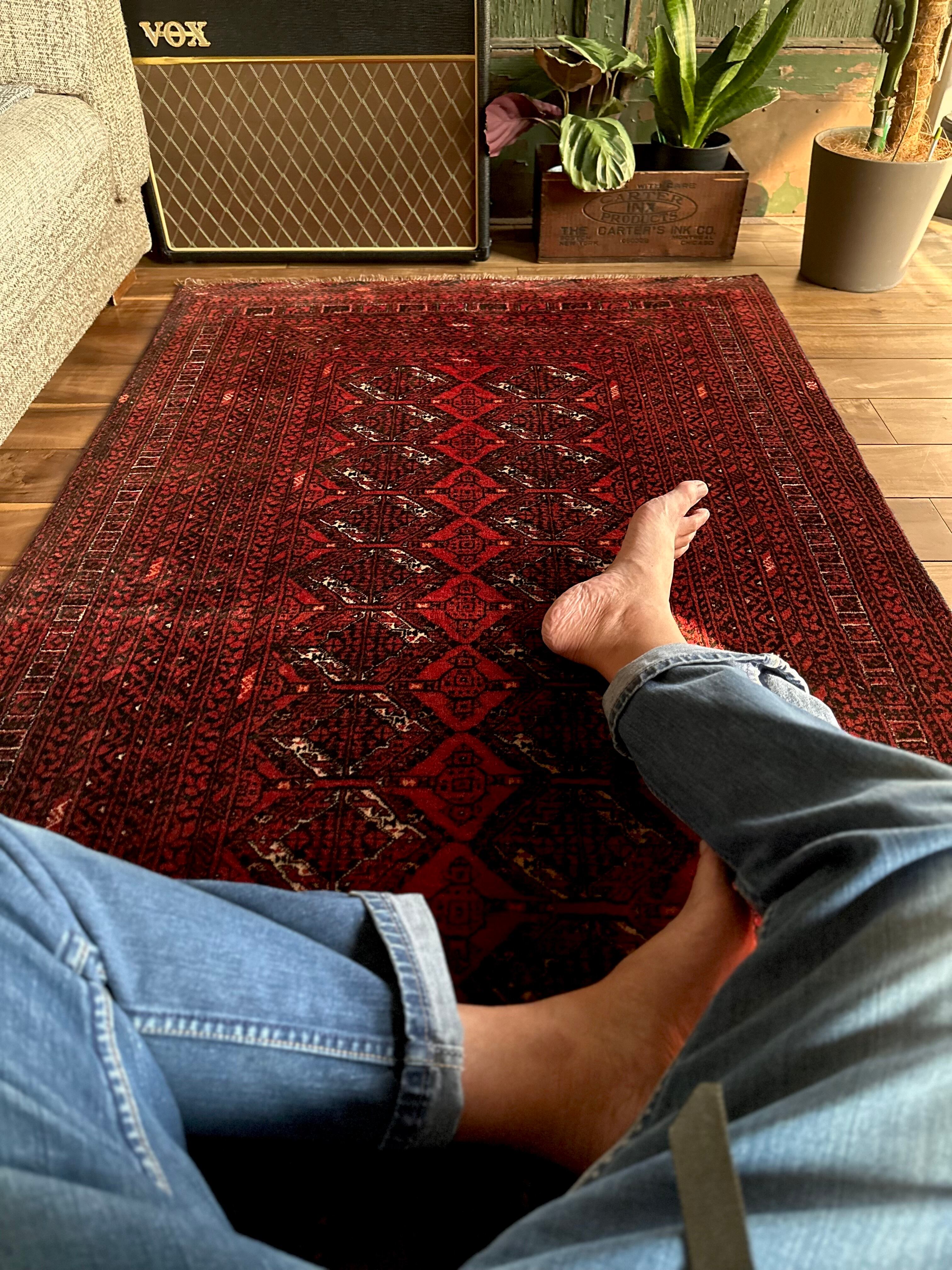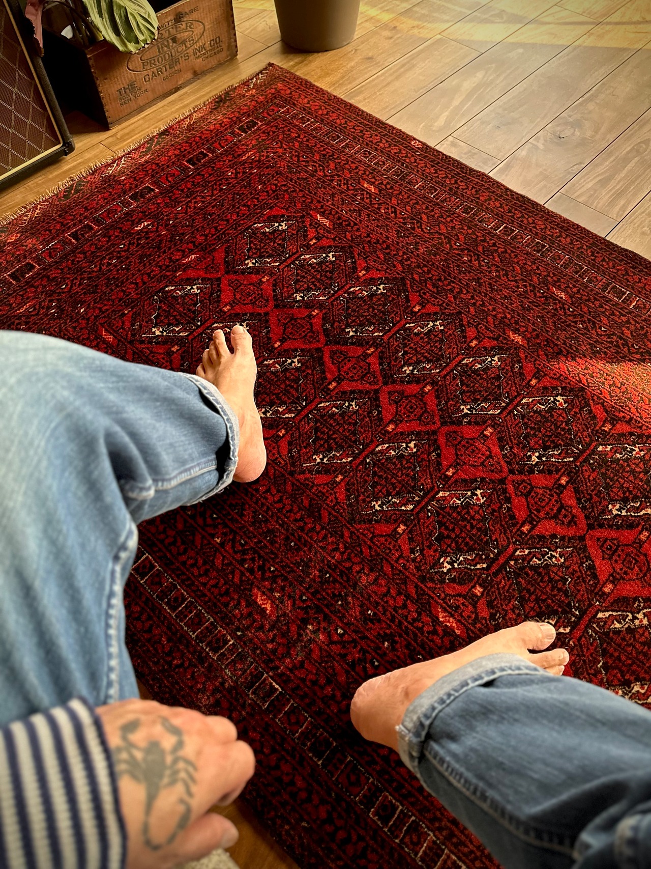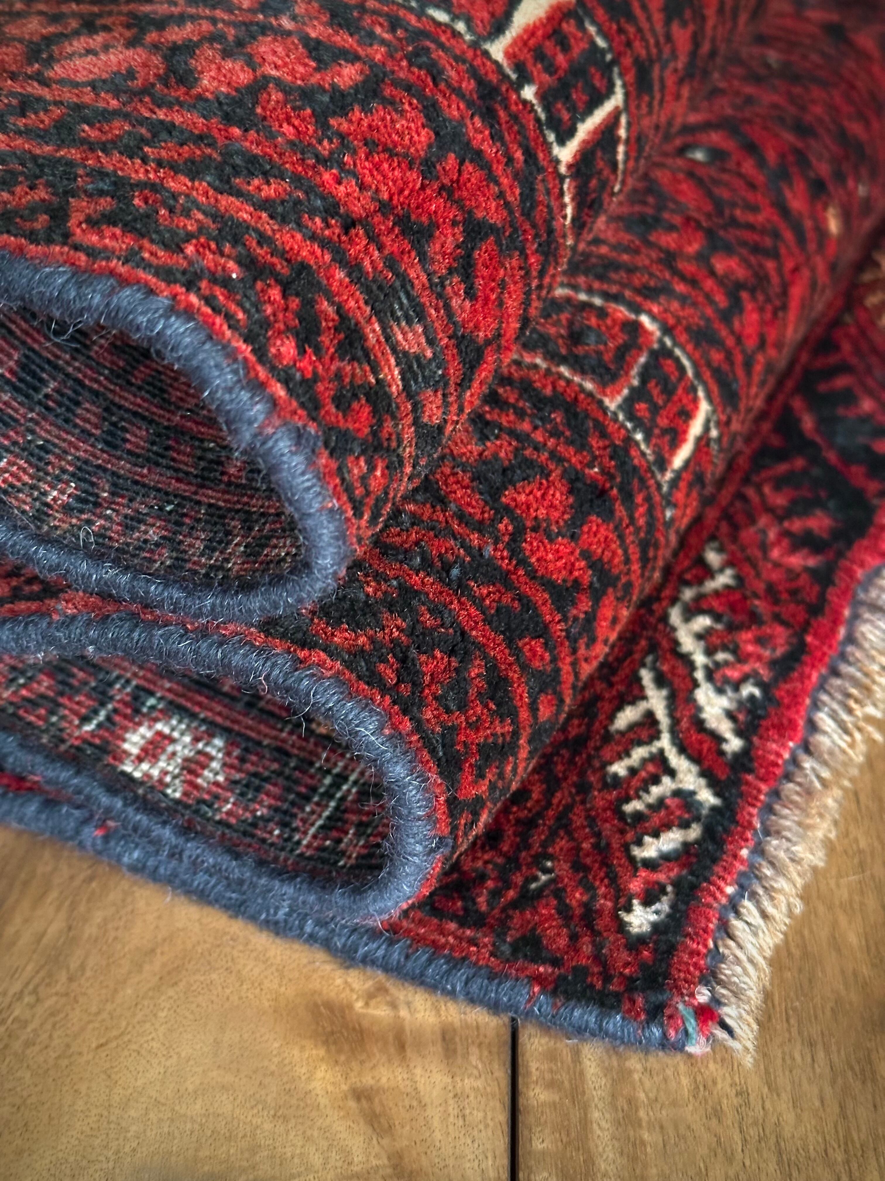 見るからにガシッと丈夫そうに織られた真っ赤な絨毯のこちらは、アフガニスタン北西部のマイマナに居住するトルクメン族のトライバルラグで、詳細は不明ですが”Baba Sediq”と呼ばれる柄の1枚になります。
