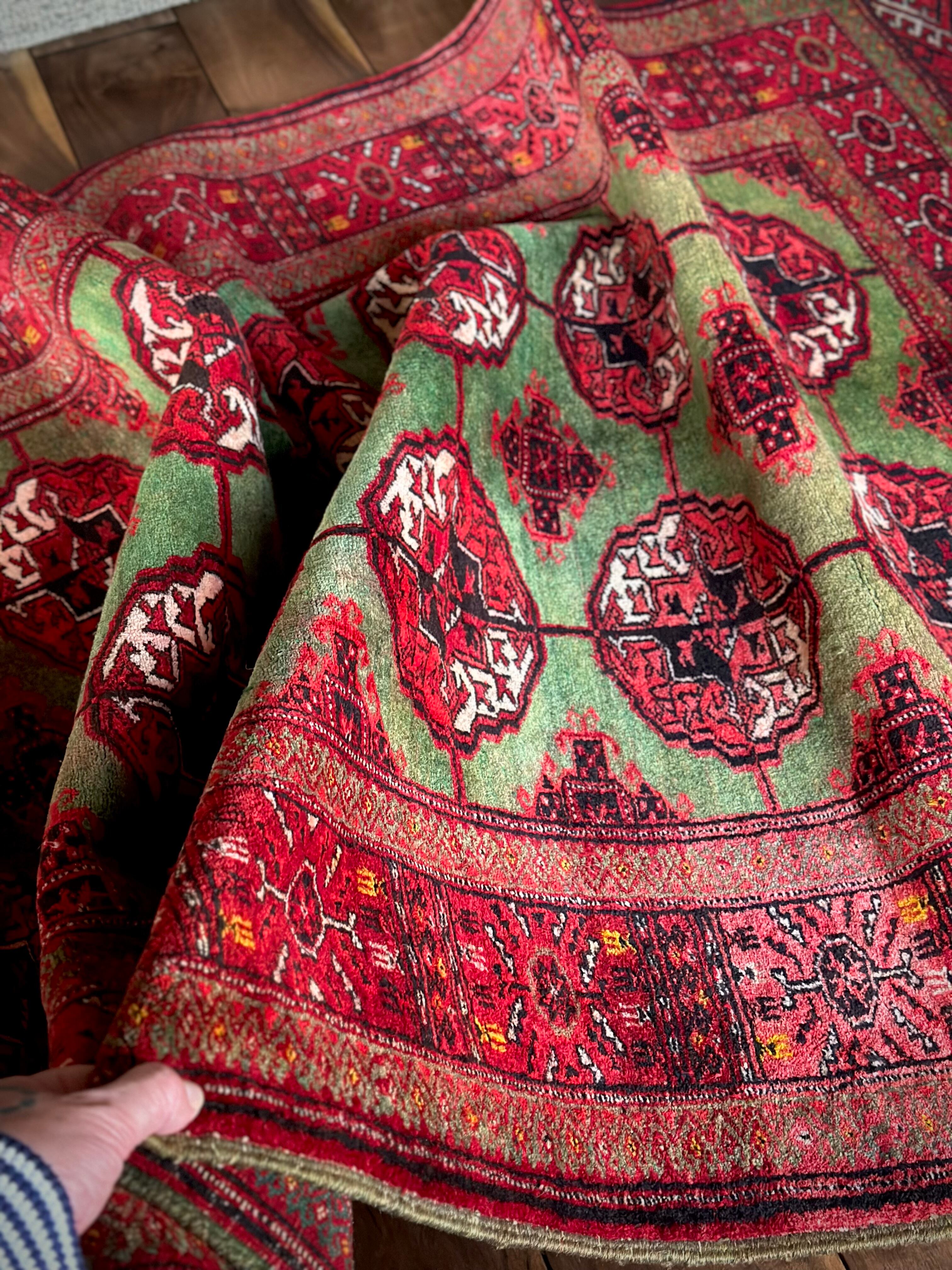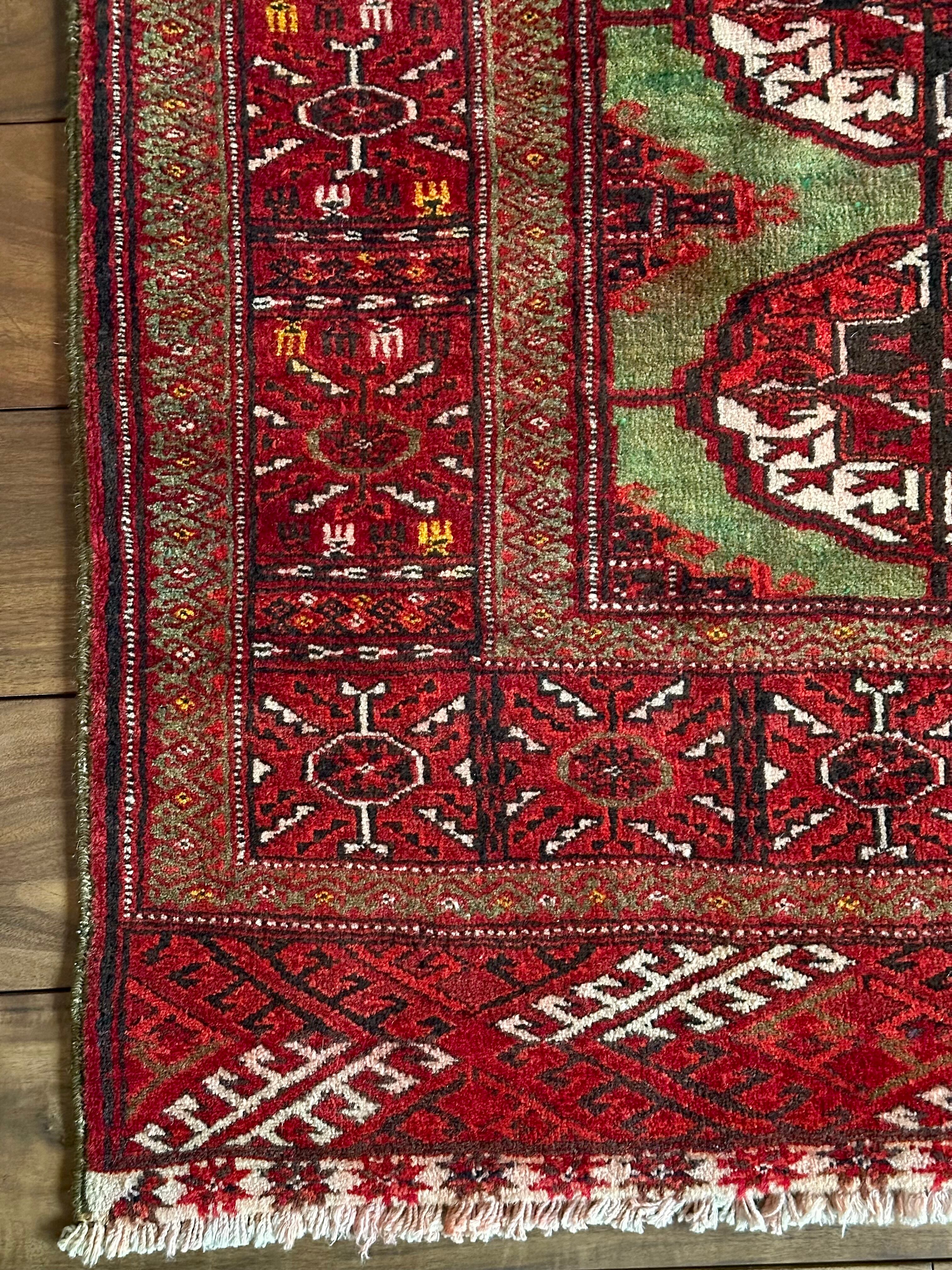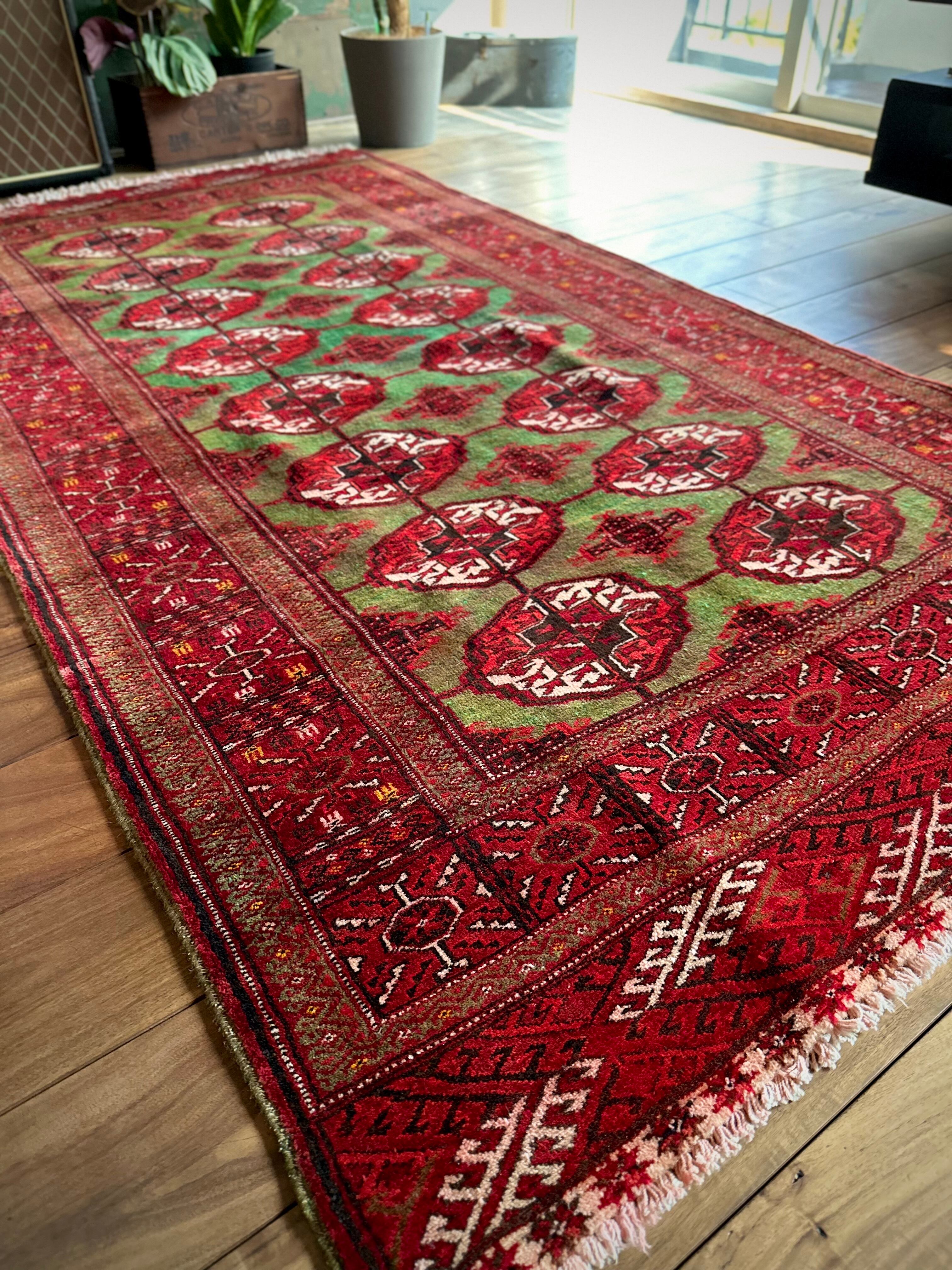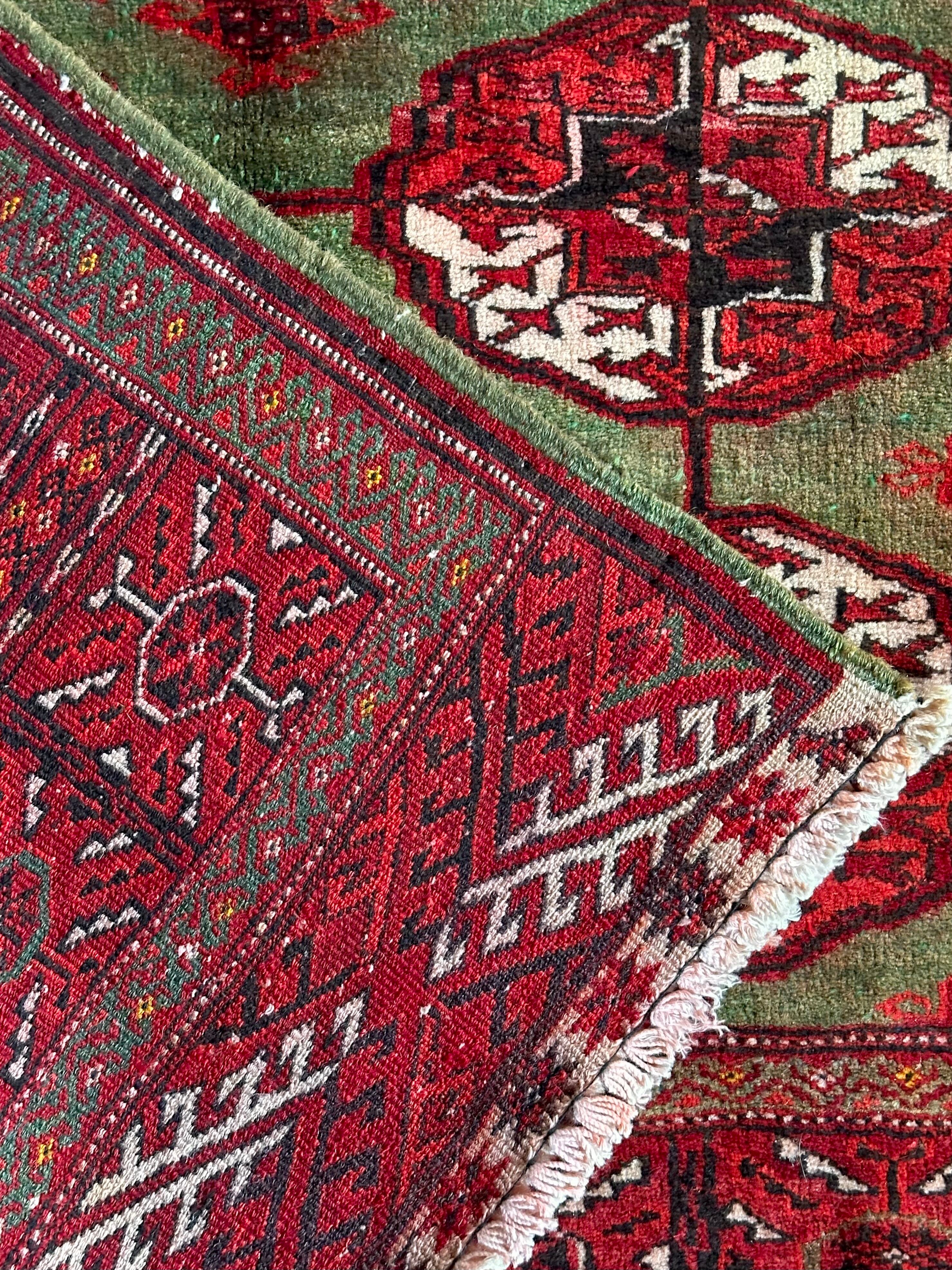 色褪せたセージグリーンに深みのある真紅が対照的でかっこいい、アフガニスタン北部に居住するトルクメン族のトライバルラグで、テッケギュルの連続紋様にボーダー部の細かな模様が威風堂々とした貫禄のある1枚になります。