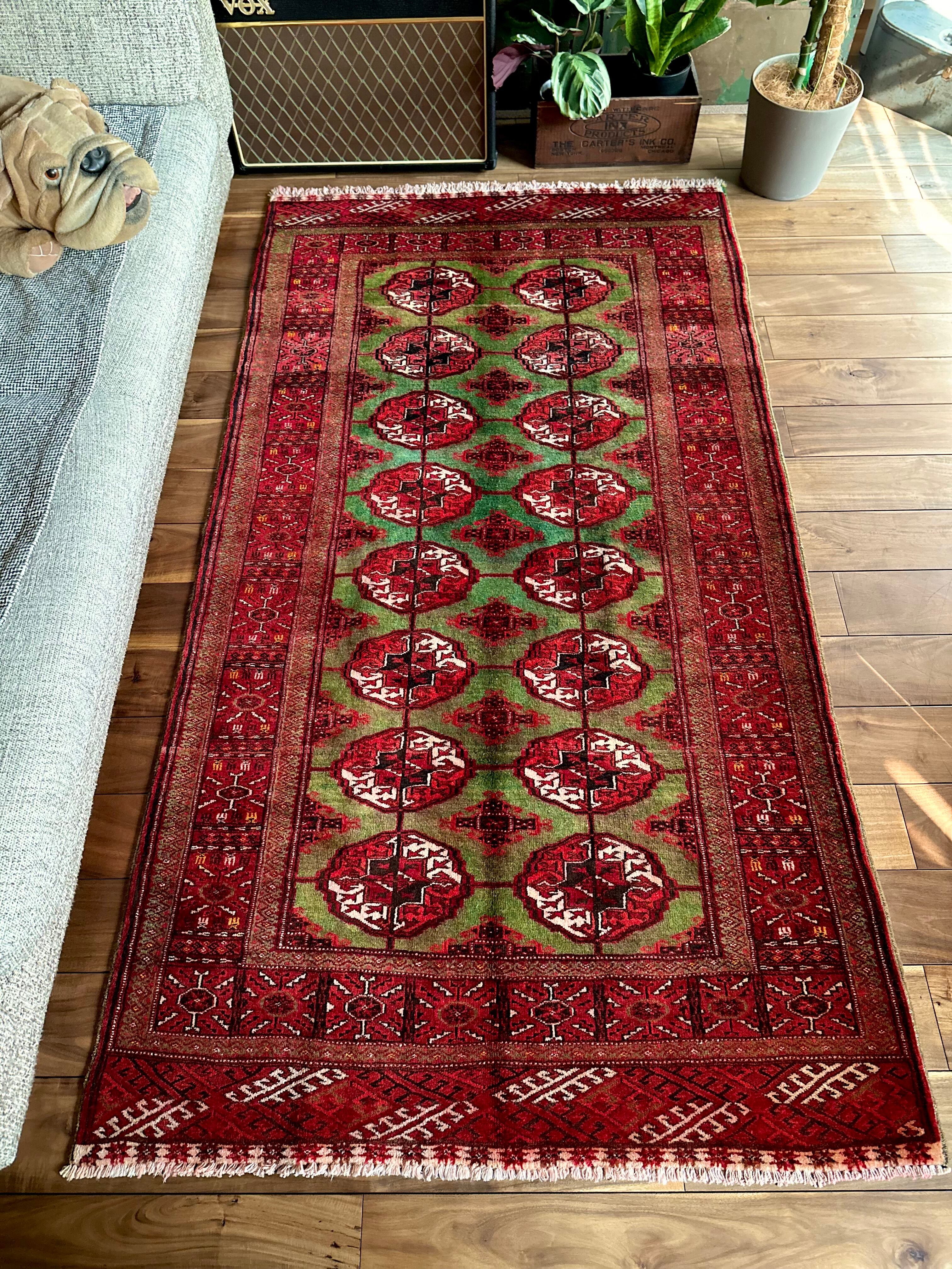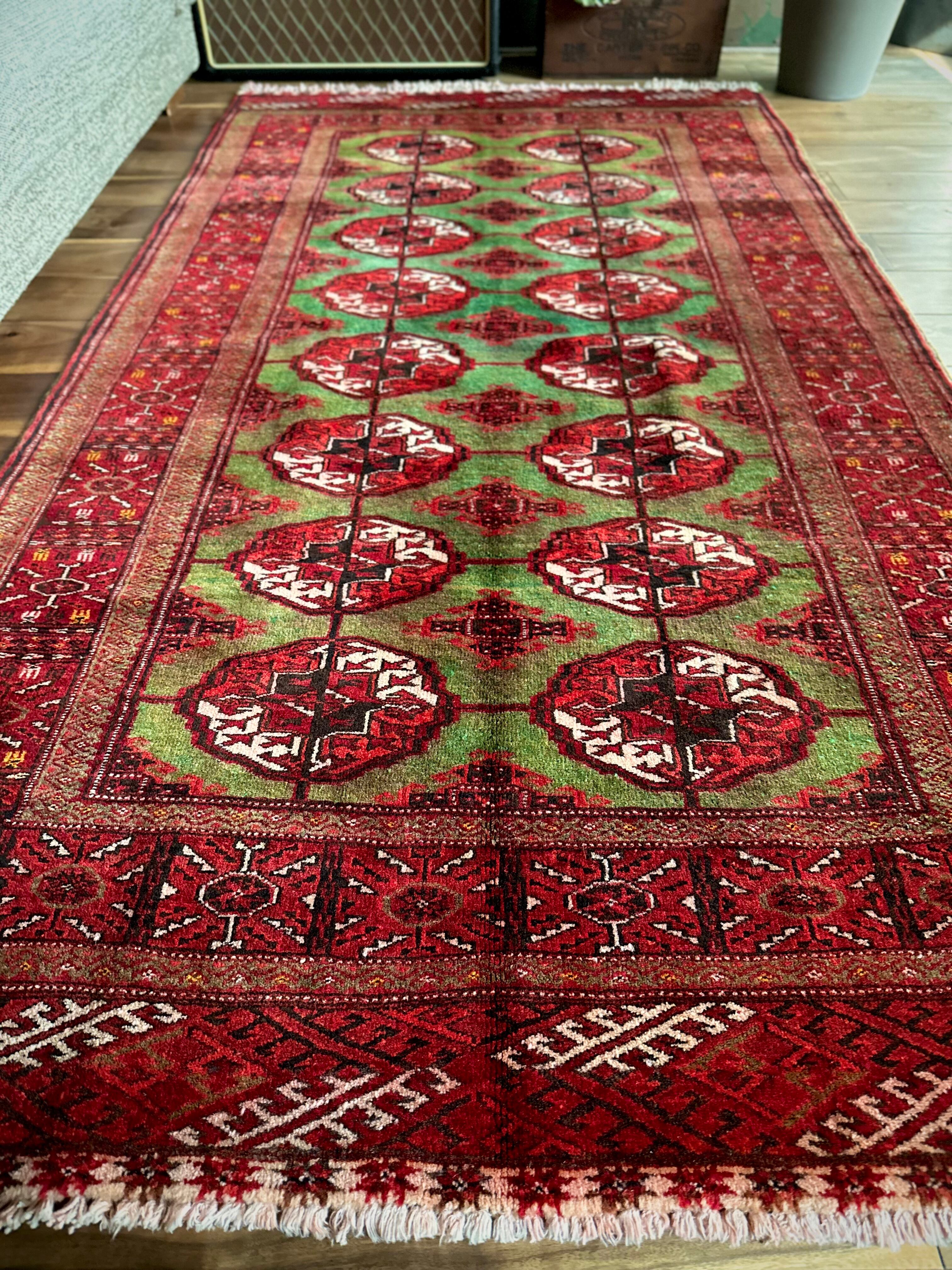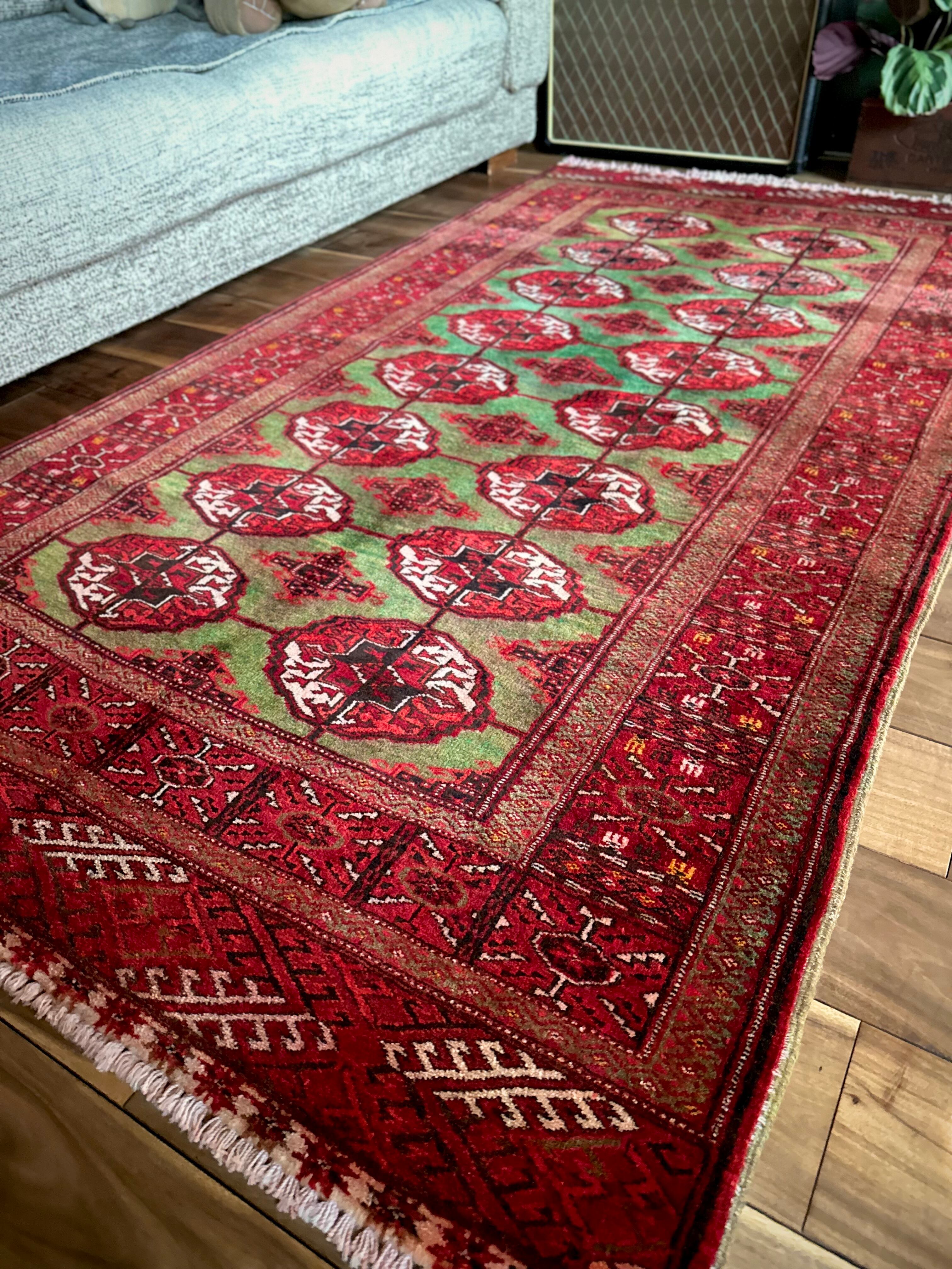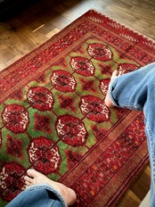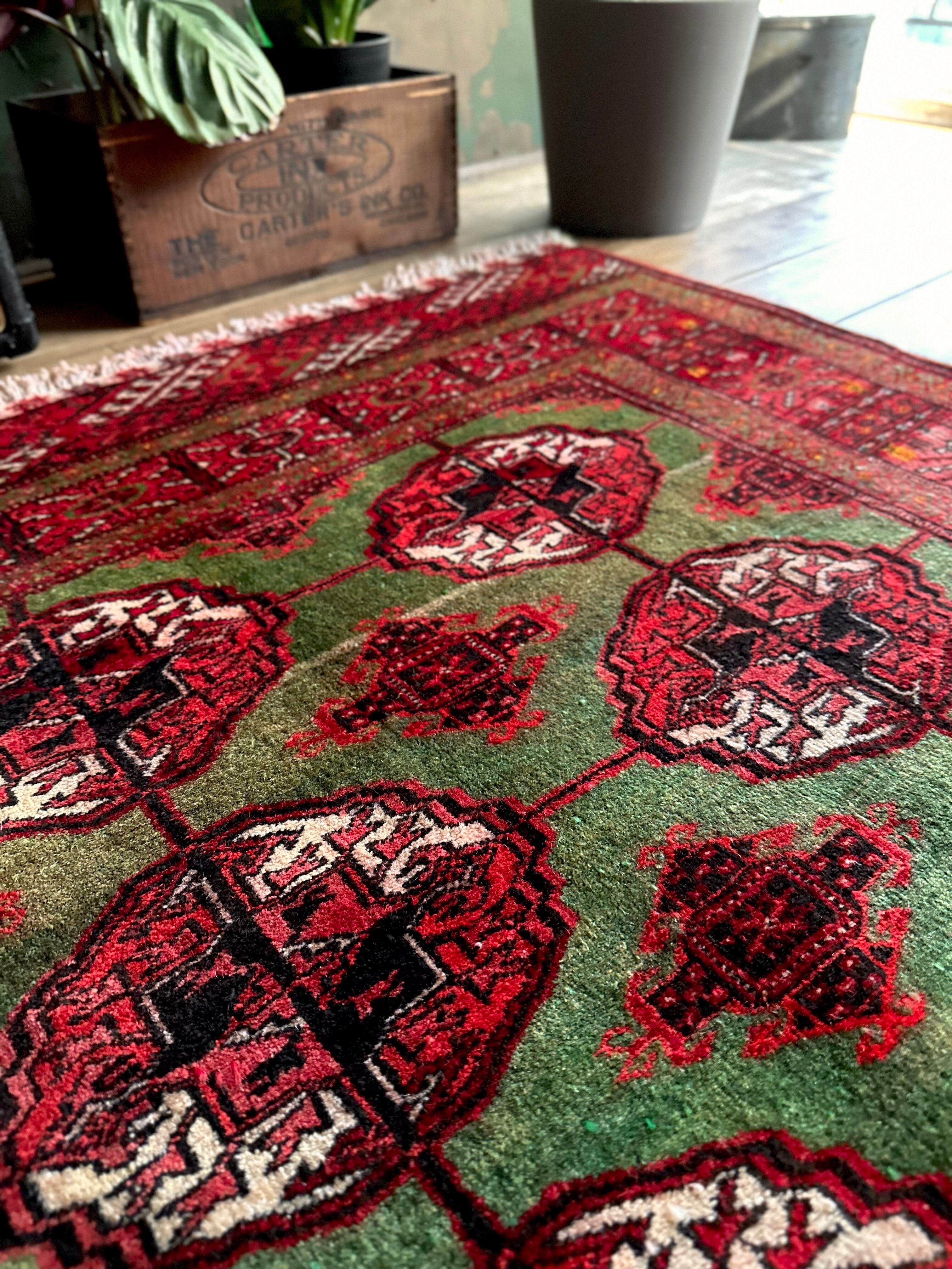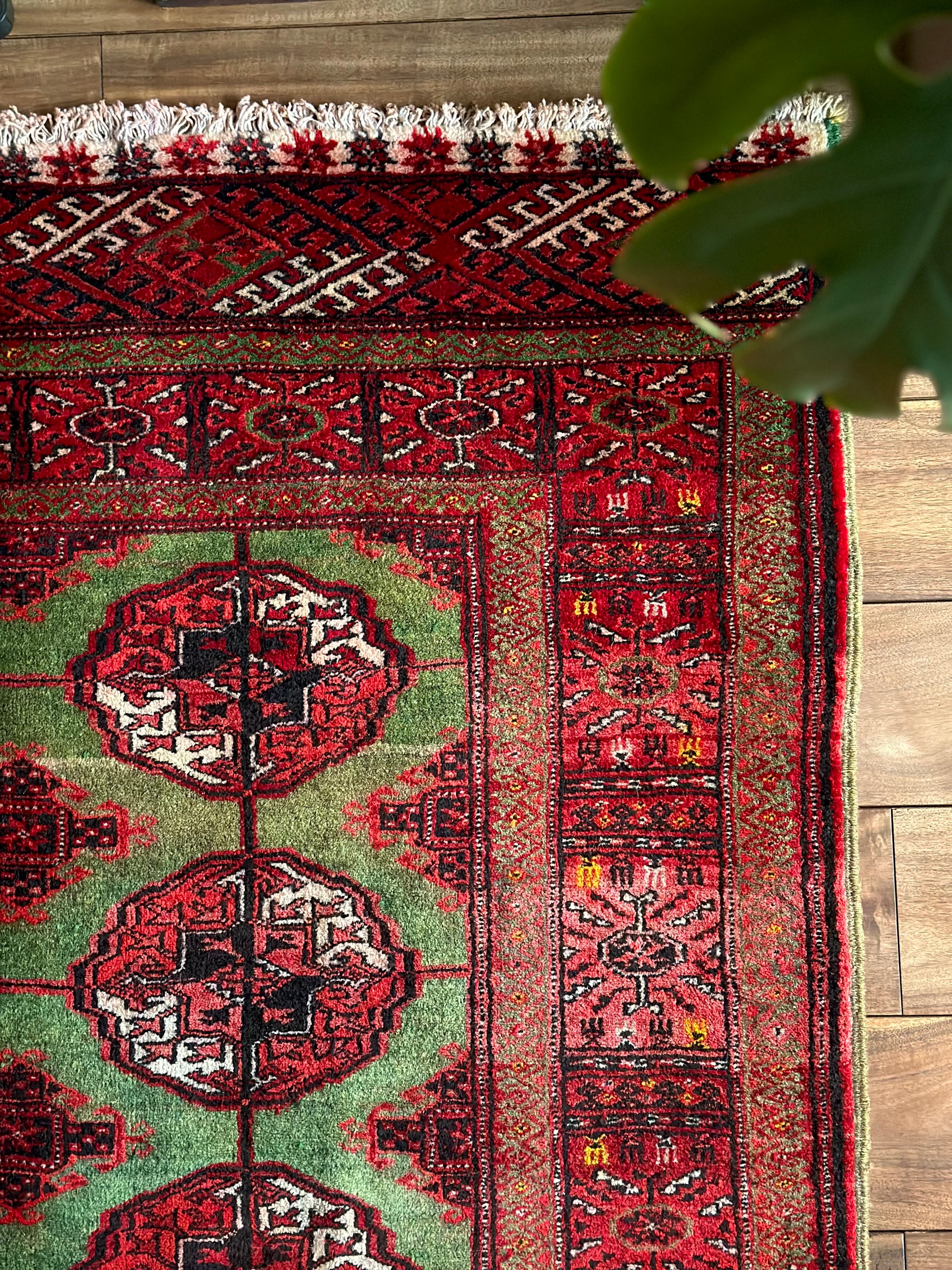 色褪せたセージグリーンに深みのある真紅が対照的でかっこいい、アフガニスタン北部に居住するトルクメン族のトライバルラグで、テッケギュルの連続紋様にボーダー部の細かな模様が威風堂々とした貫禄のある1枚になります。