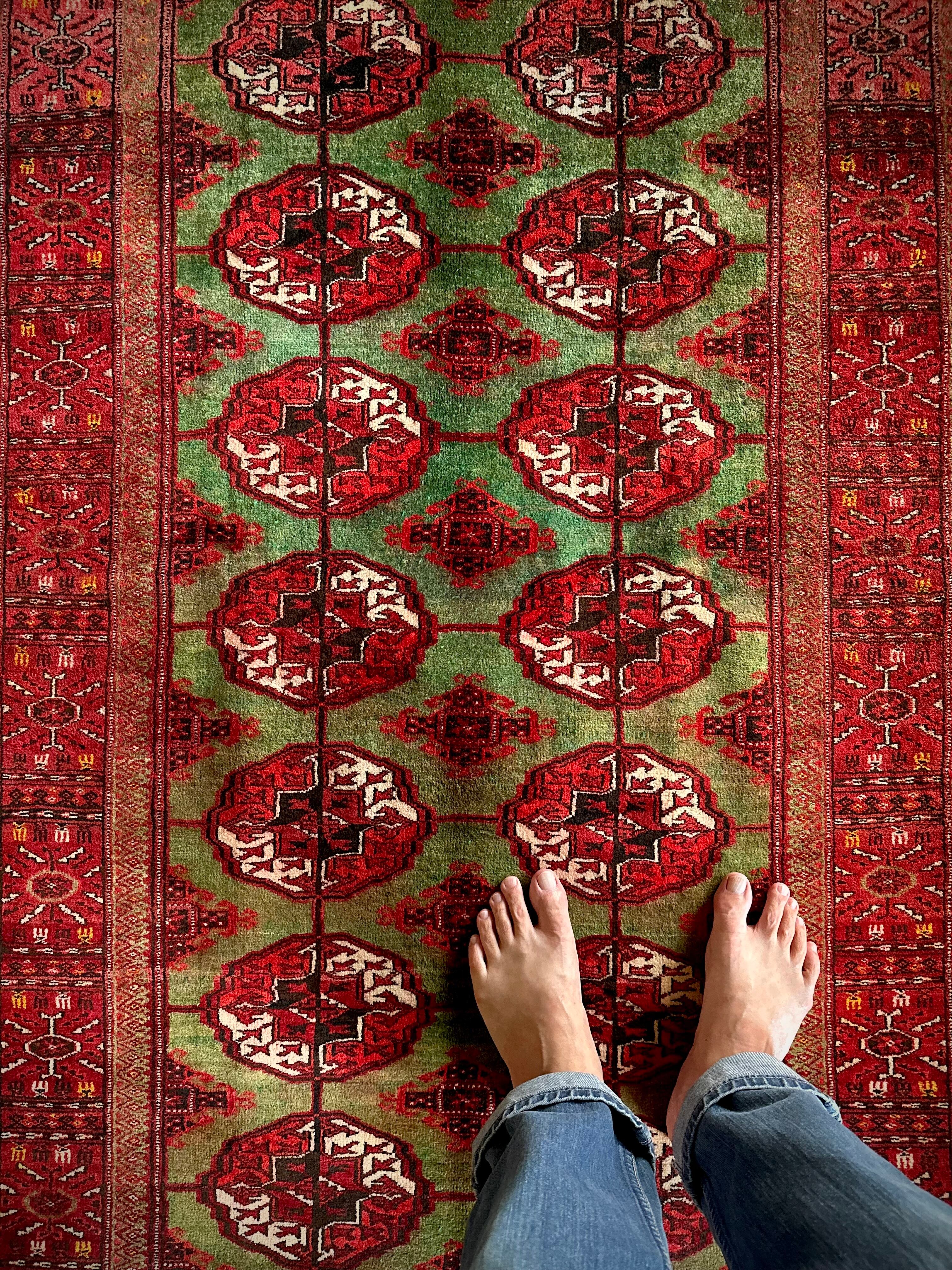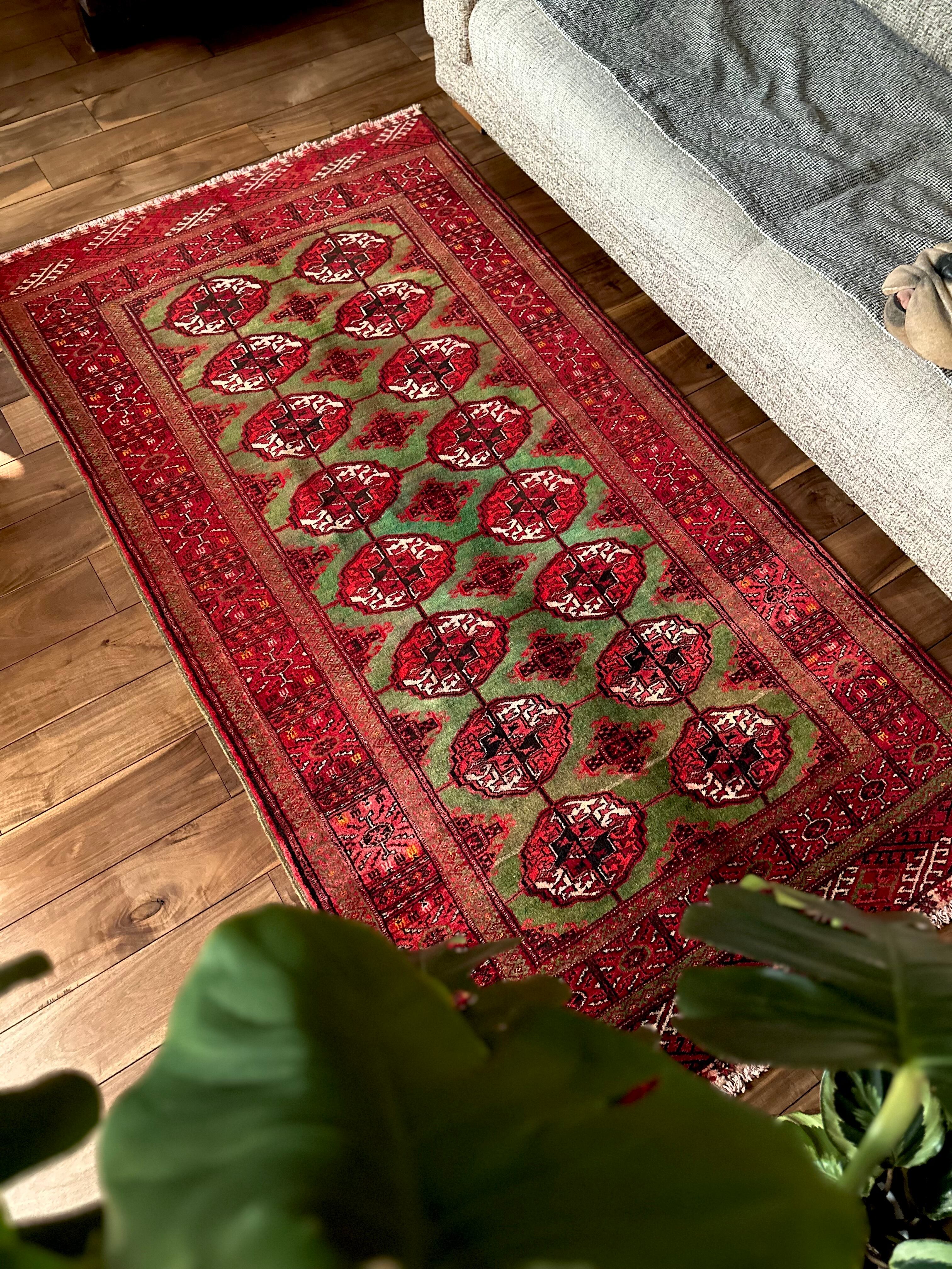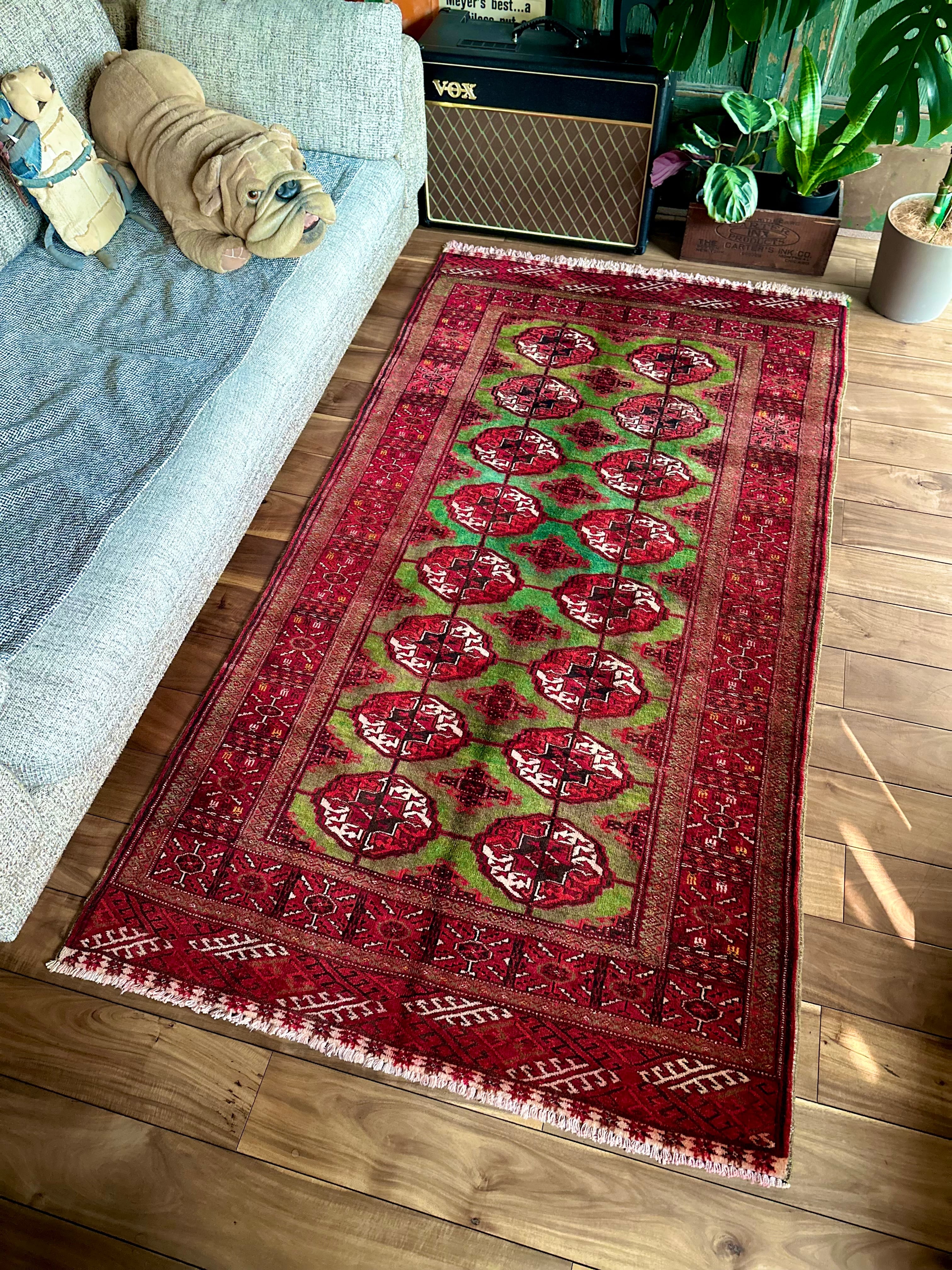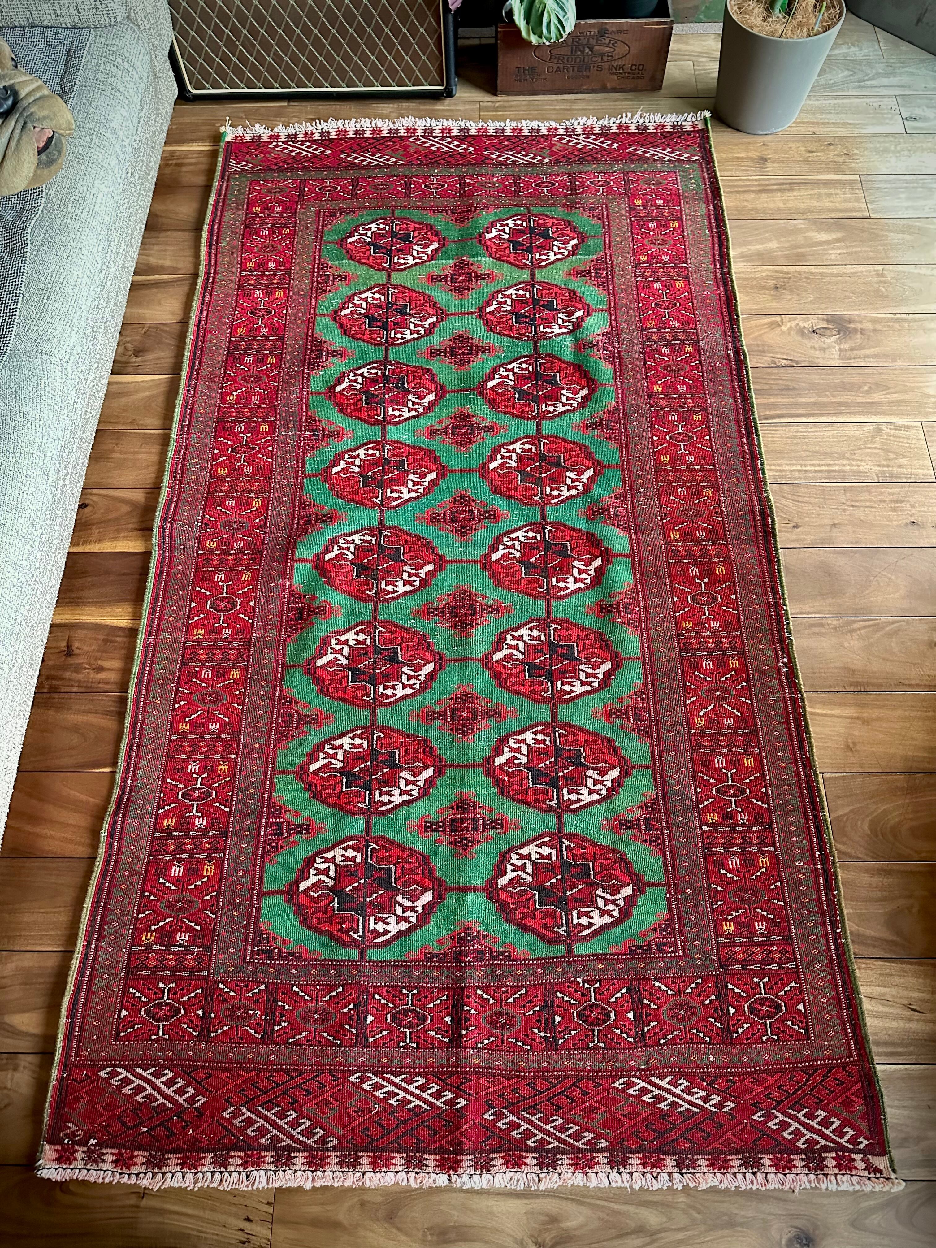 色褪せたセージグリーンに深みのある真紅が対照的でかっこいい、アフガニスタン北部に居住するトルクメン族のトライバルラグで、テッケギュルの連続紋様にボーダー部の細かな模様が威風堂々とした貫禄のある1枚になります。