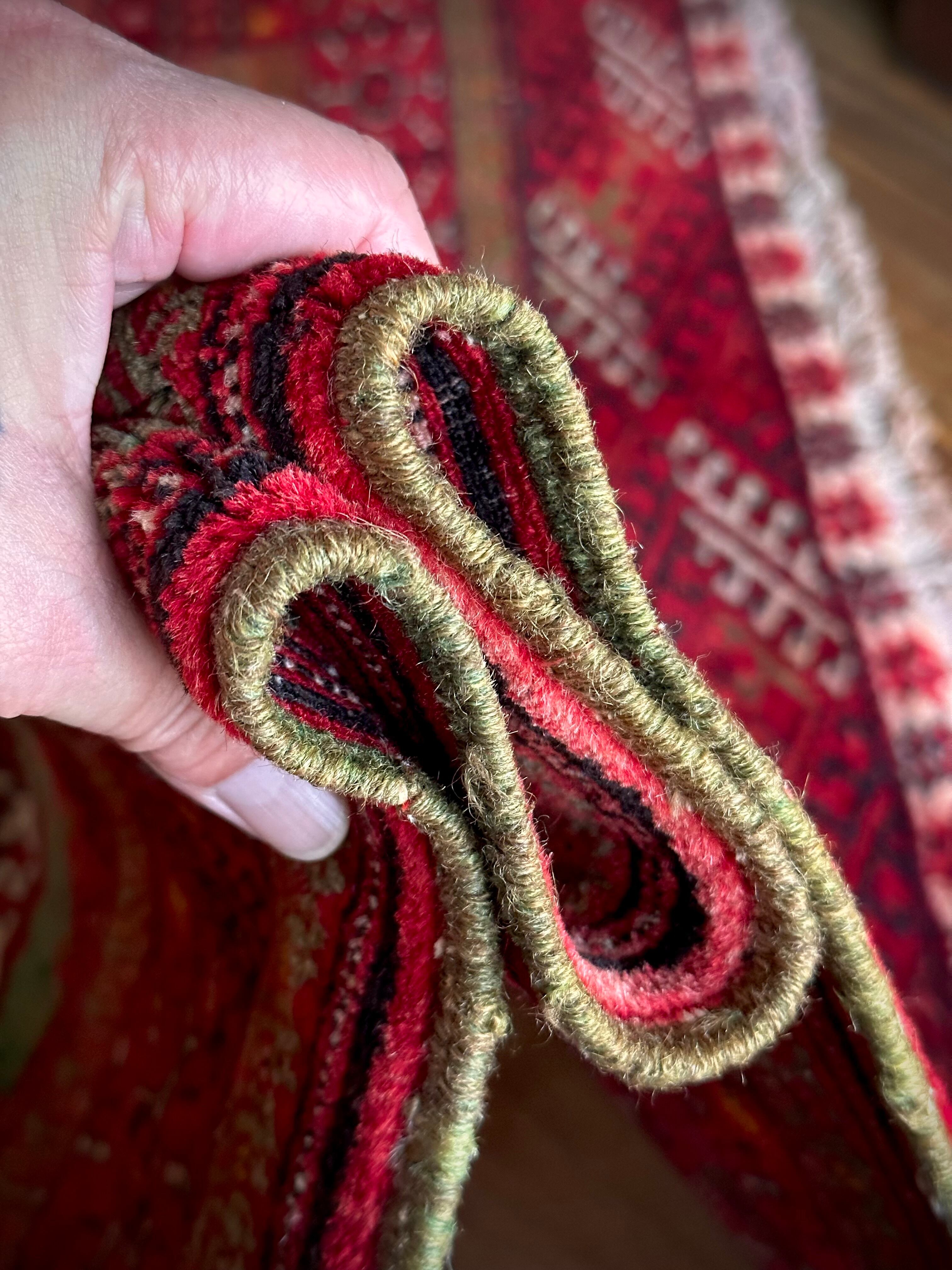 最後にラグそのものに関しては羊毛特有の匂いがあり、採寸は中央付近で計測していますが、手織りならではの歪みによる誤差や水洗いクリーニングによる縮み、また草木染めによる経年劣化の色ムラなどがありますが、それもまたヴィンテージラグの魅力かとご理解ください。
