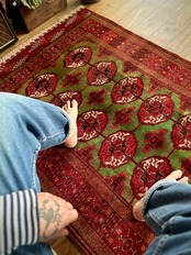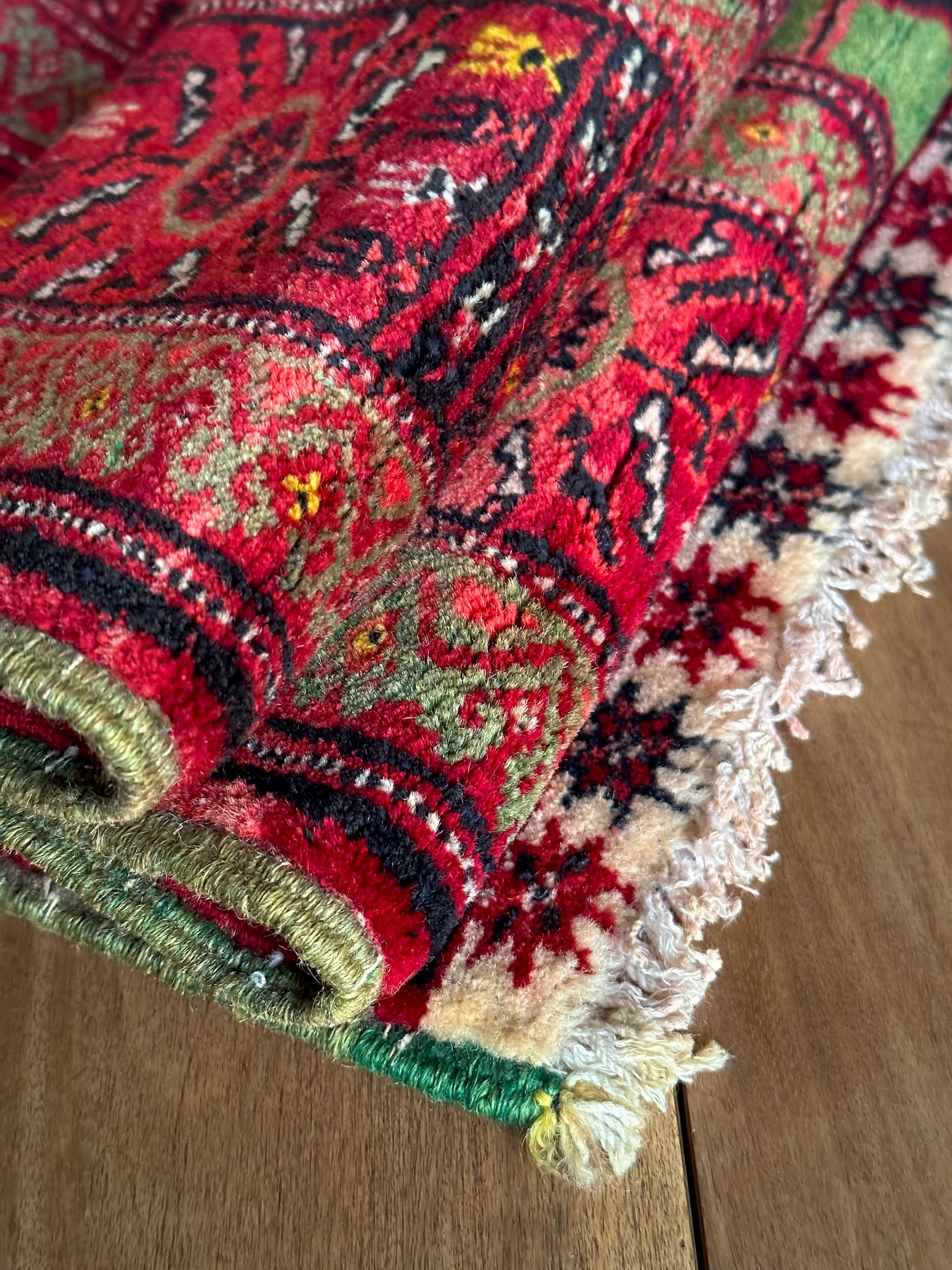 しっかりとした厚みにみっちりと細かく織り込まれたアフガン系トルクメンらしいラグで、パイル自体はそれほど長くはありませんが、しっとりとした優しいパイルの手触りに、両側エンドの八芒星が幸運を引き寄せてくれそうです。
