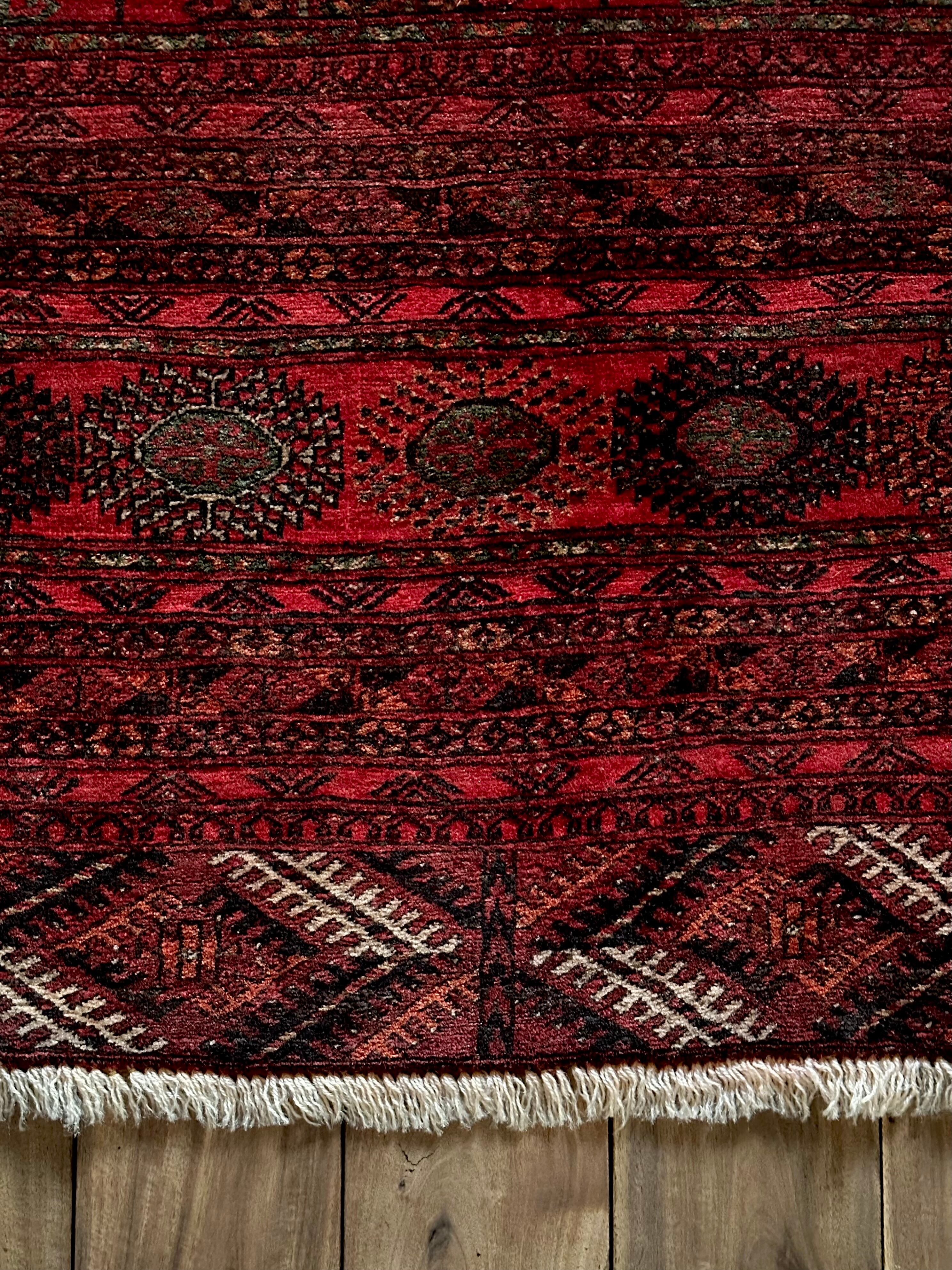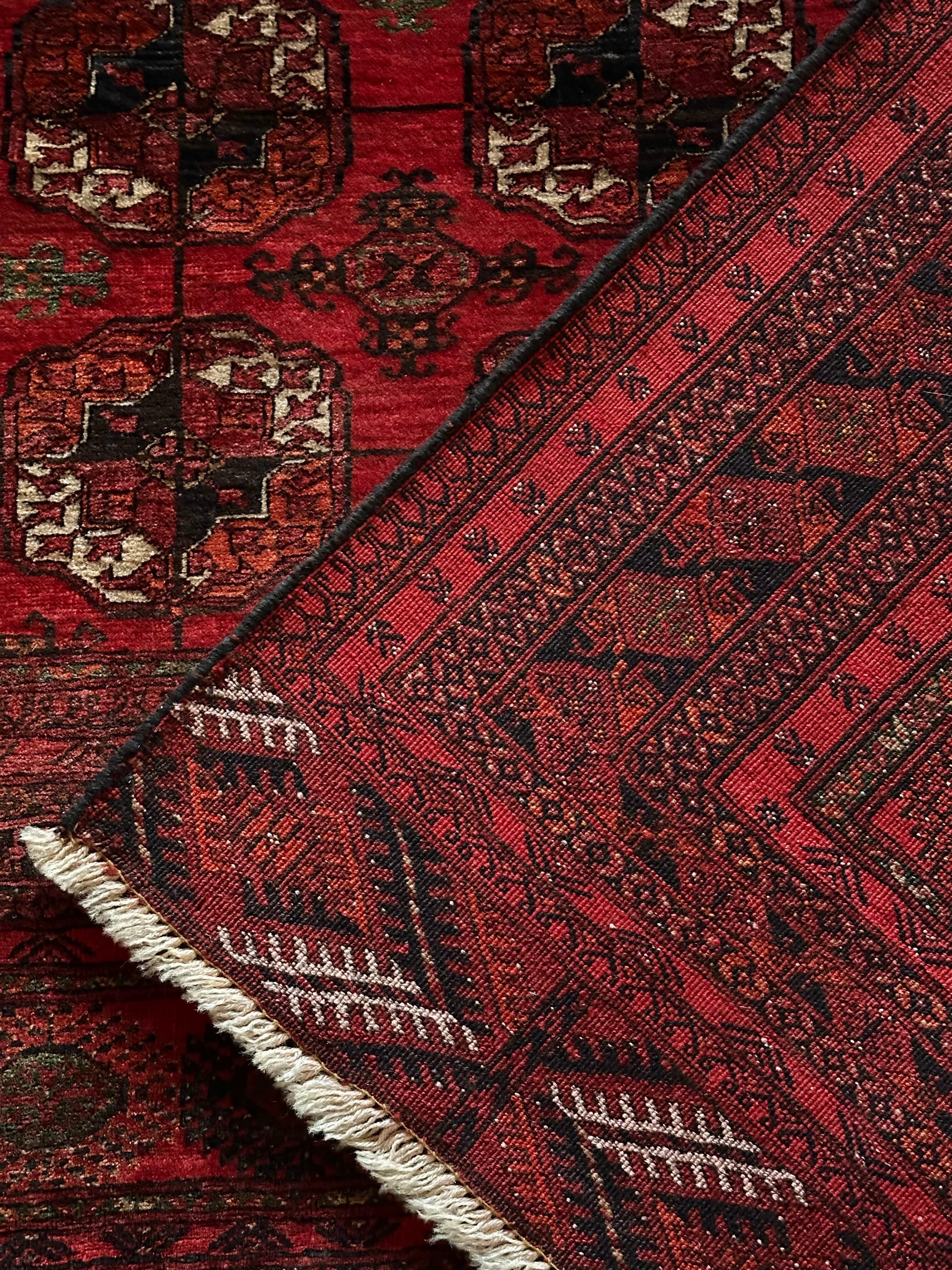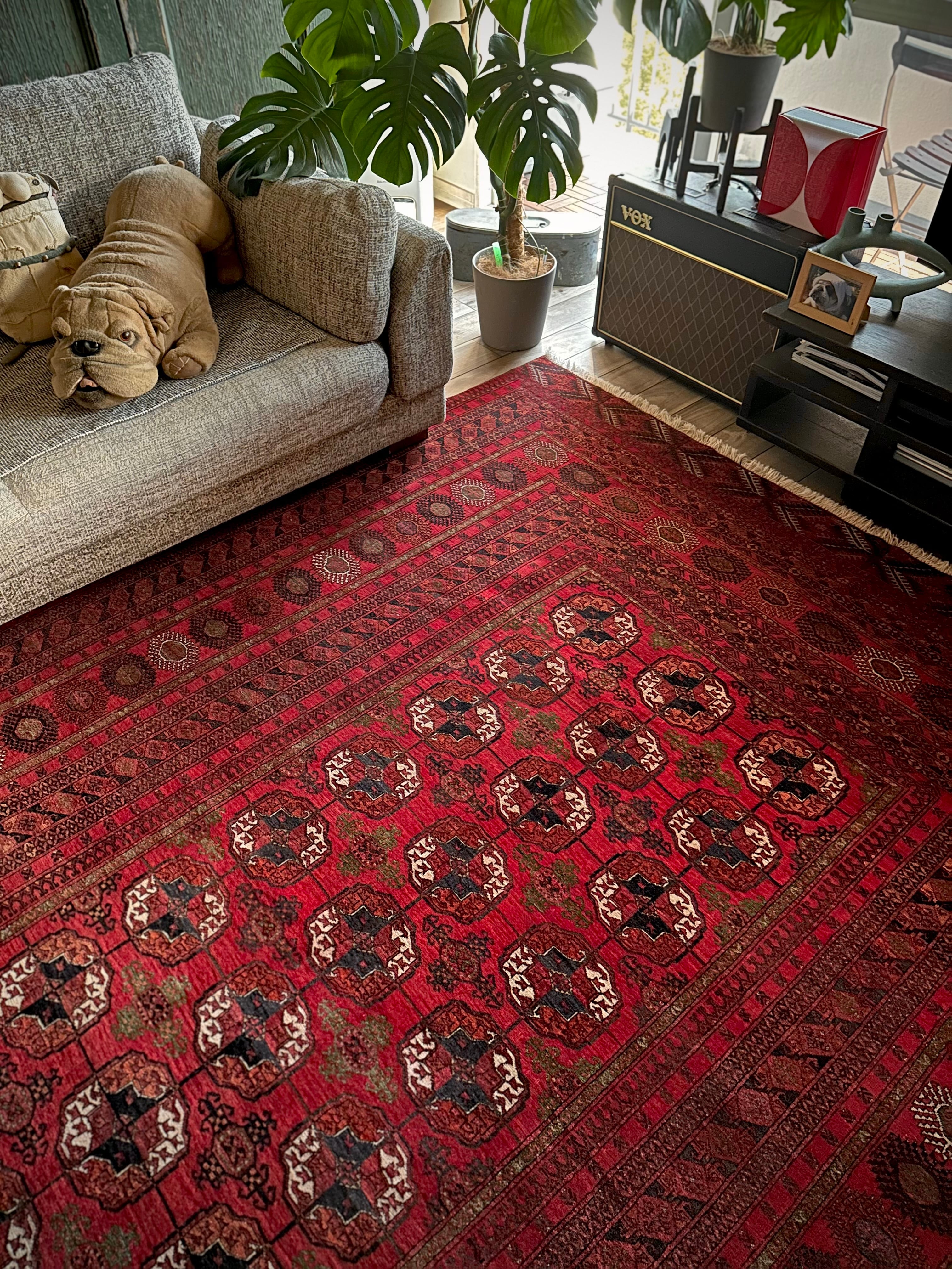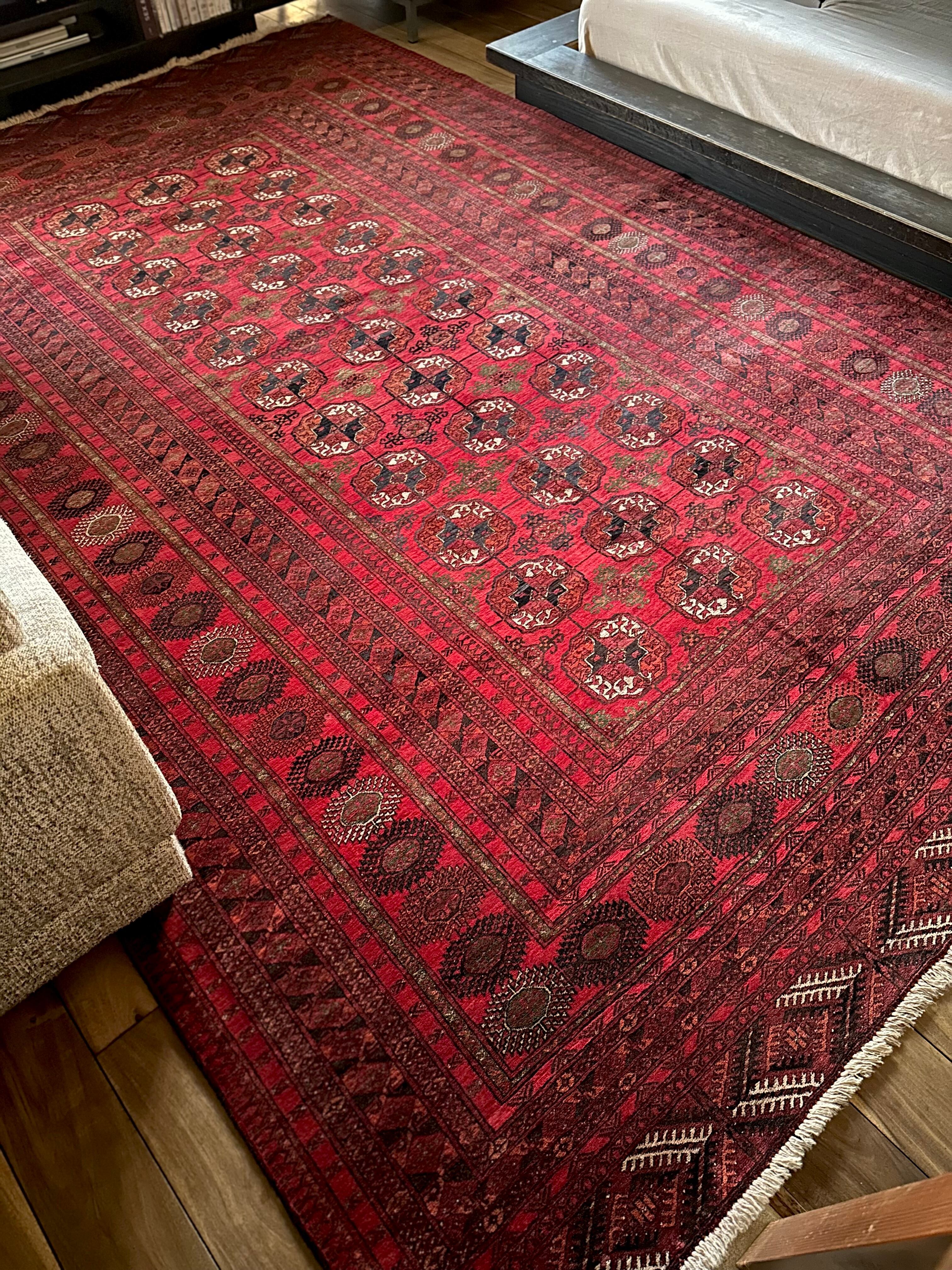 部屋一面を覆う真紅のレッドカーペットの豪華さに度肝を抜かれるこちらの特大サイズは、アフガニスタン北西部の山岳地帯にて遊牧するトルクメン族のトライバルラグで、その細かな紋様の織りが他とは違った”Baba Sediq”と呼ばれる支族からの1枚になります。