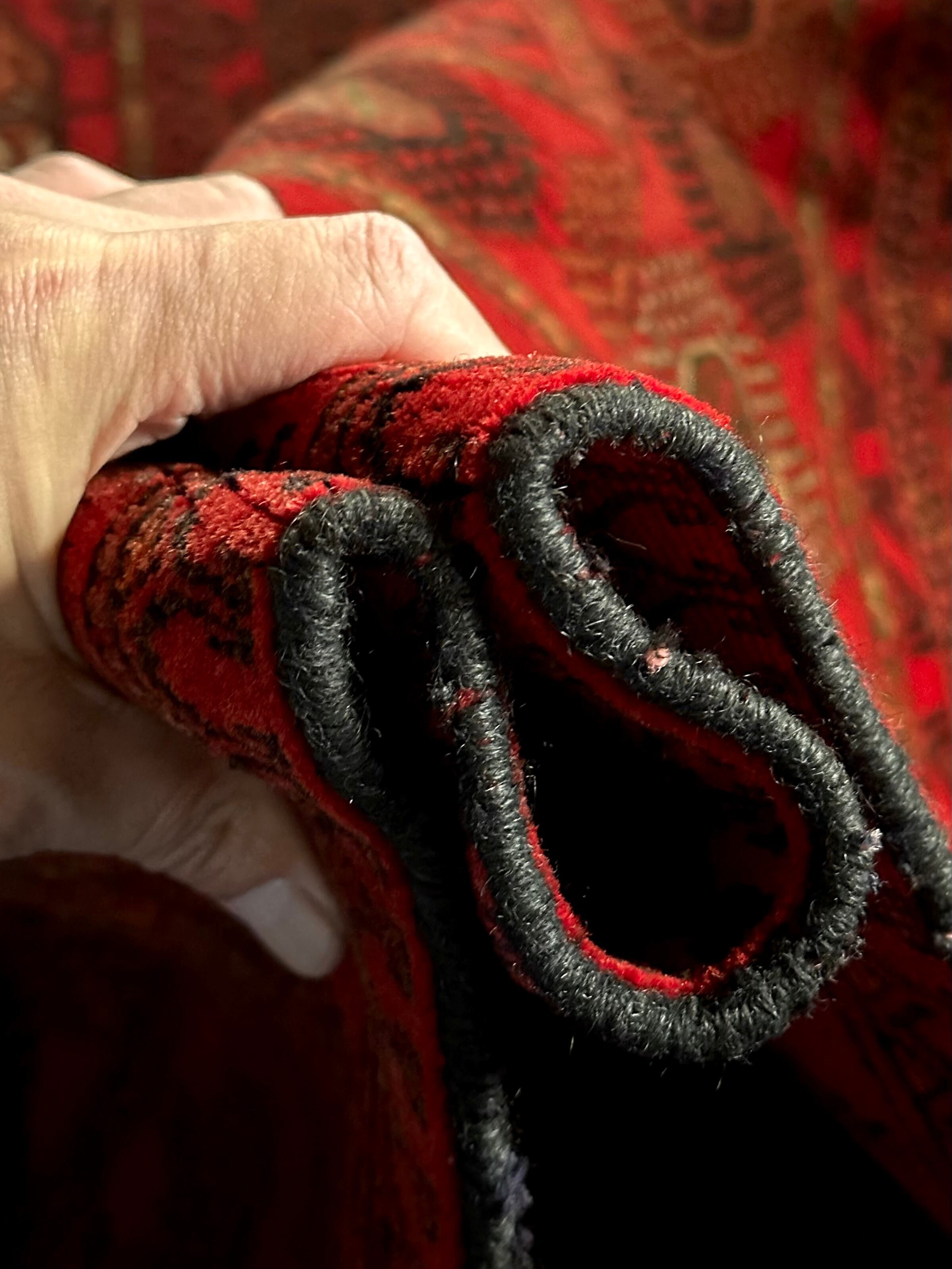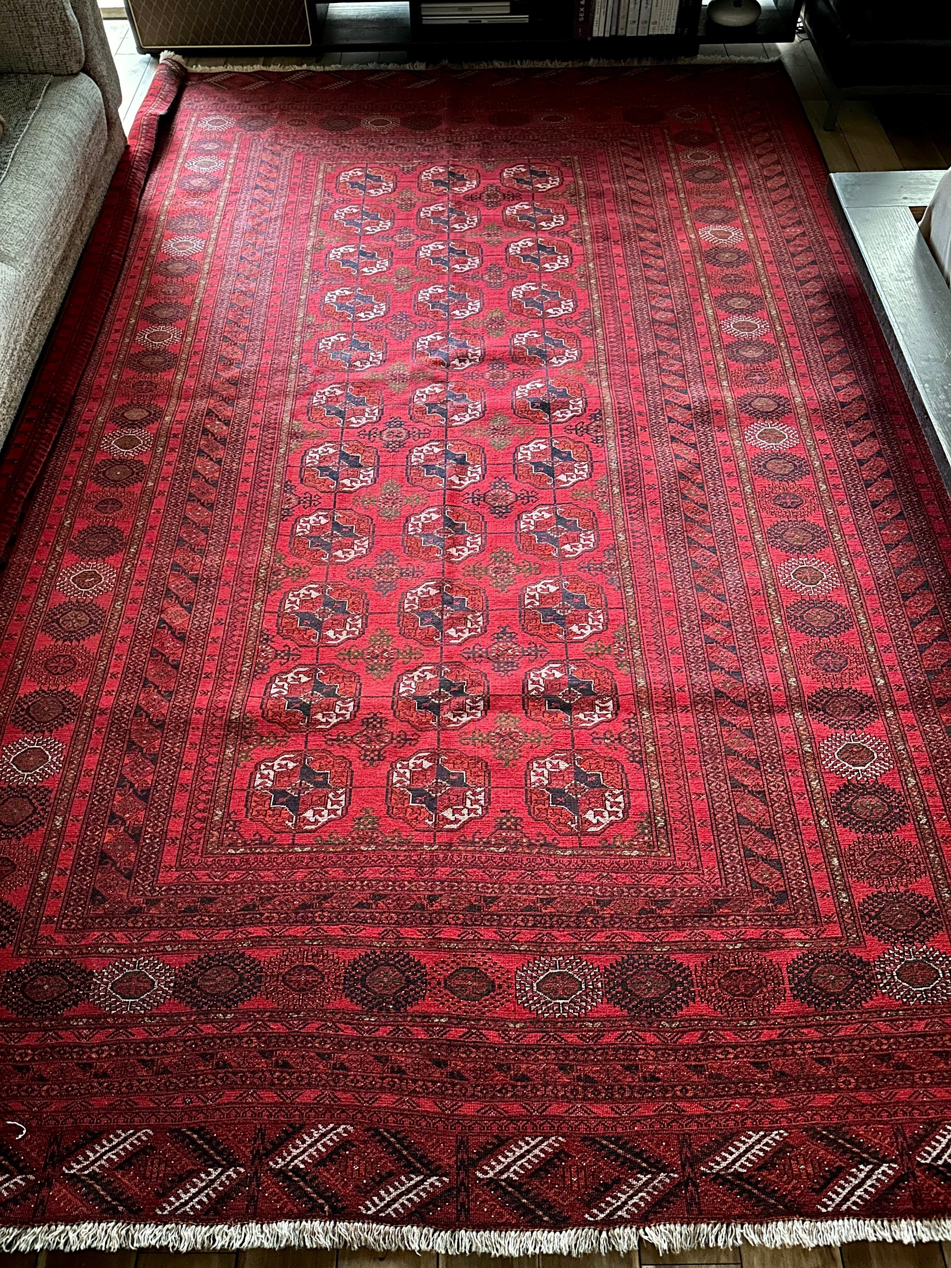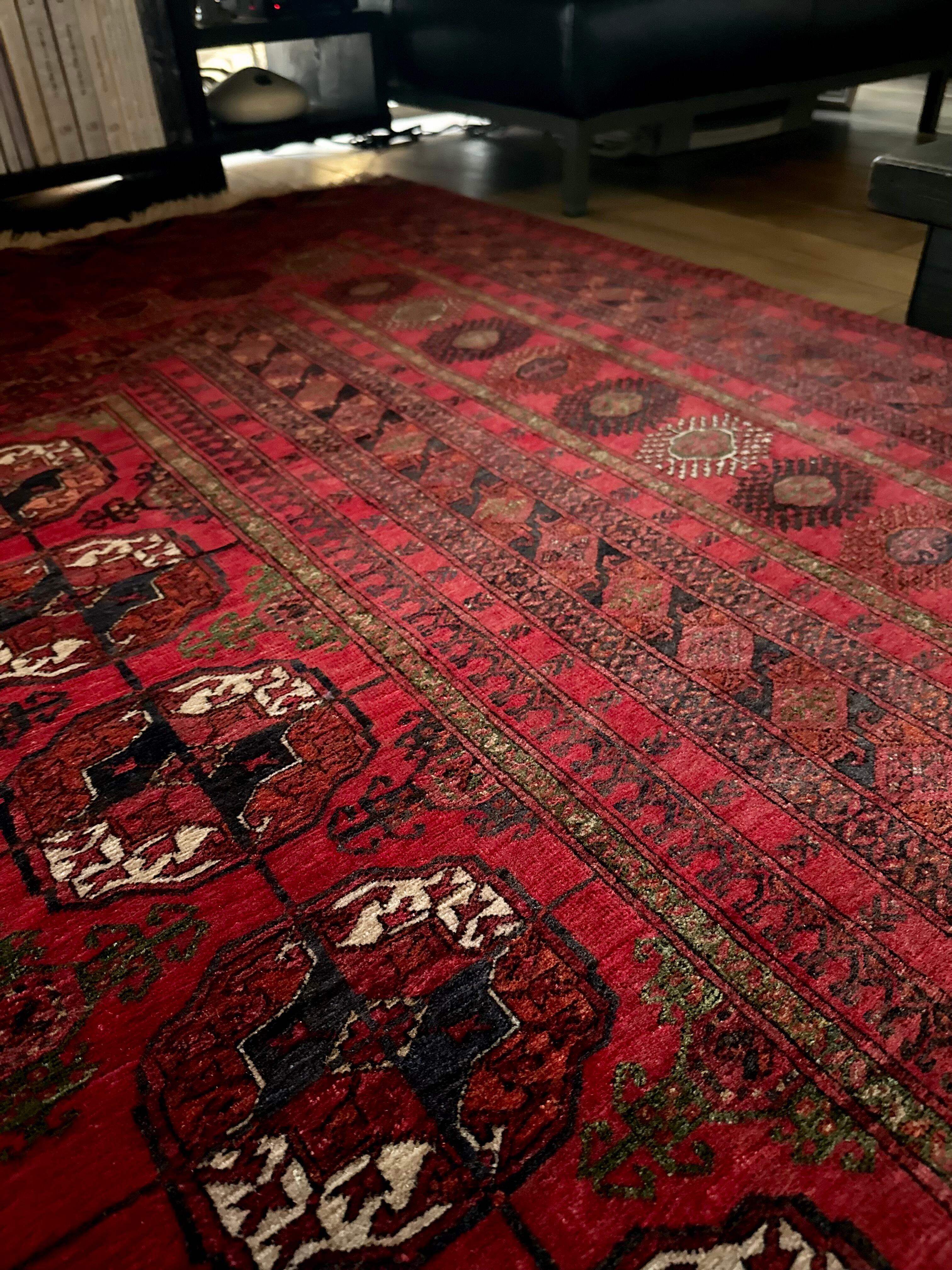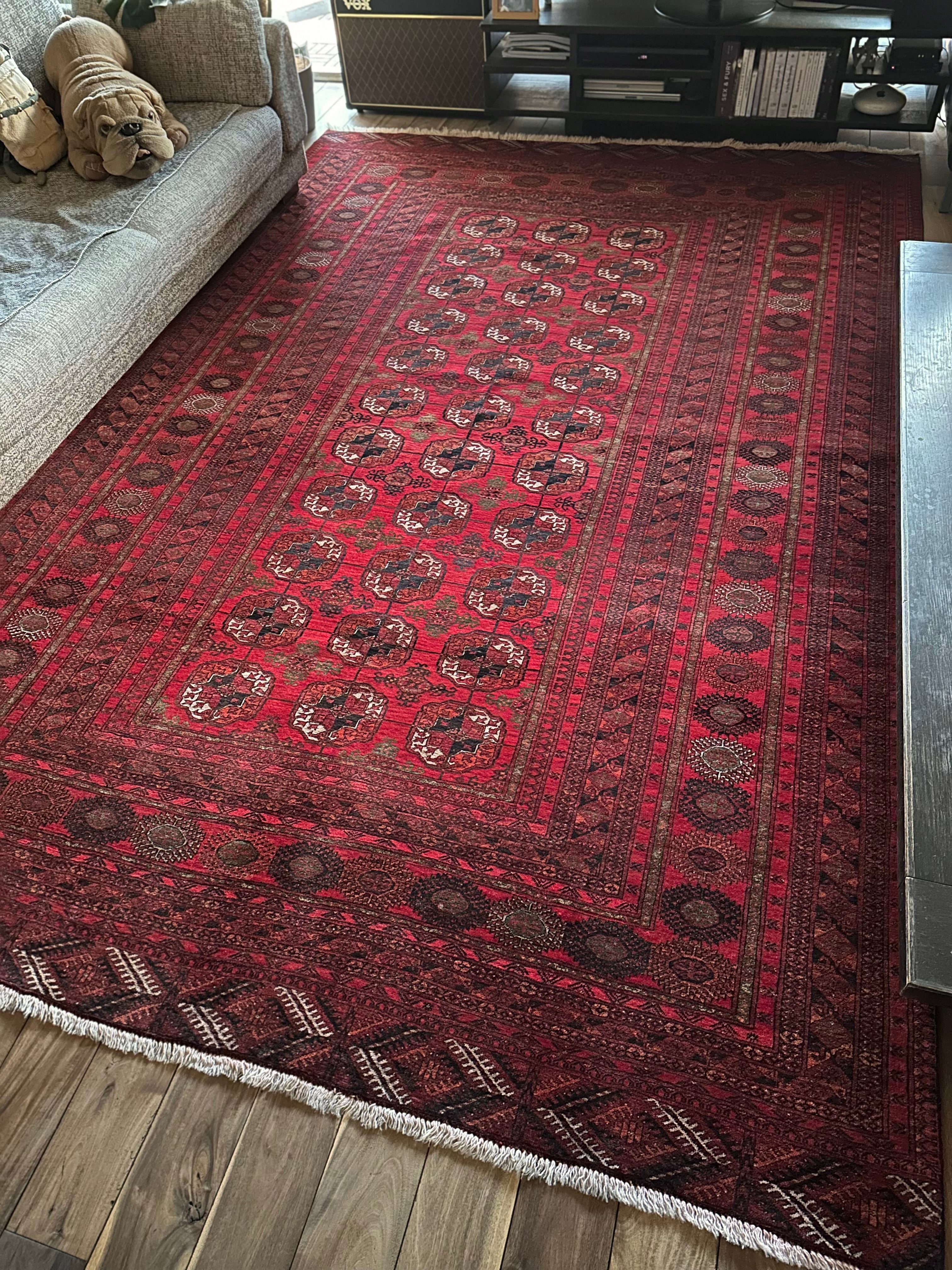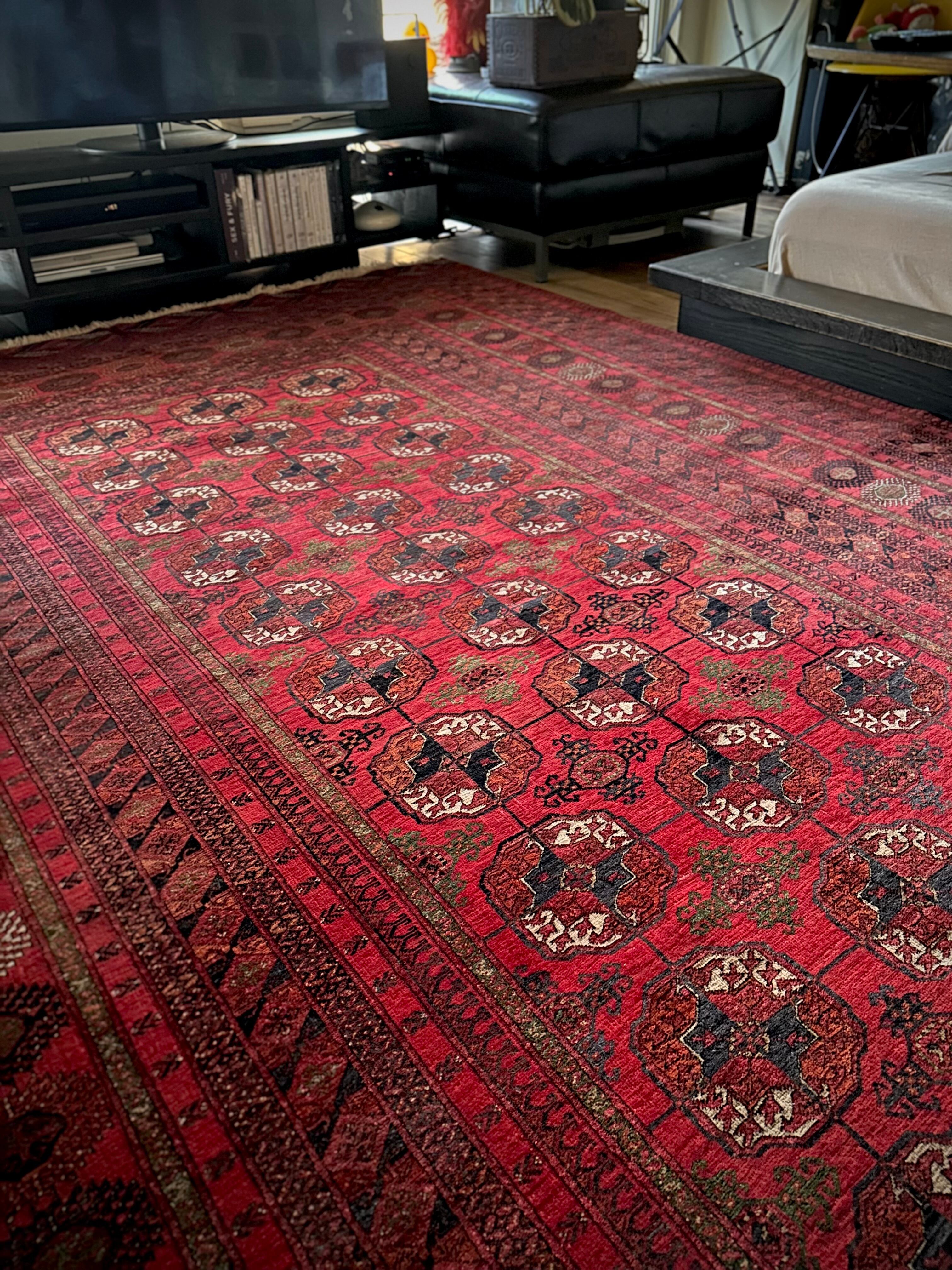 部屋一面を覆う真紅のレッドカーペットの豪華さに度肝を抜かれるこちらの特大サイズは、アフガニスタン北西部の山岳地帯にて遊牧するトルクメン族のトライバルラグで、その細かな紋様の織りが他とは違った”Baba Sediq”と呼ばれる支族からの1枚になります。