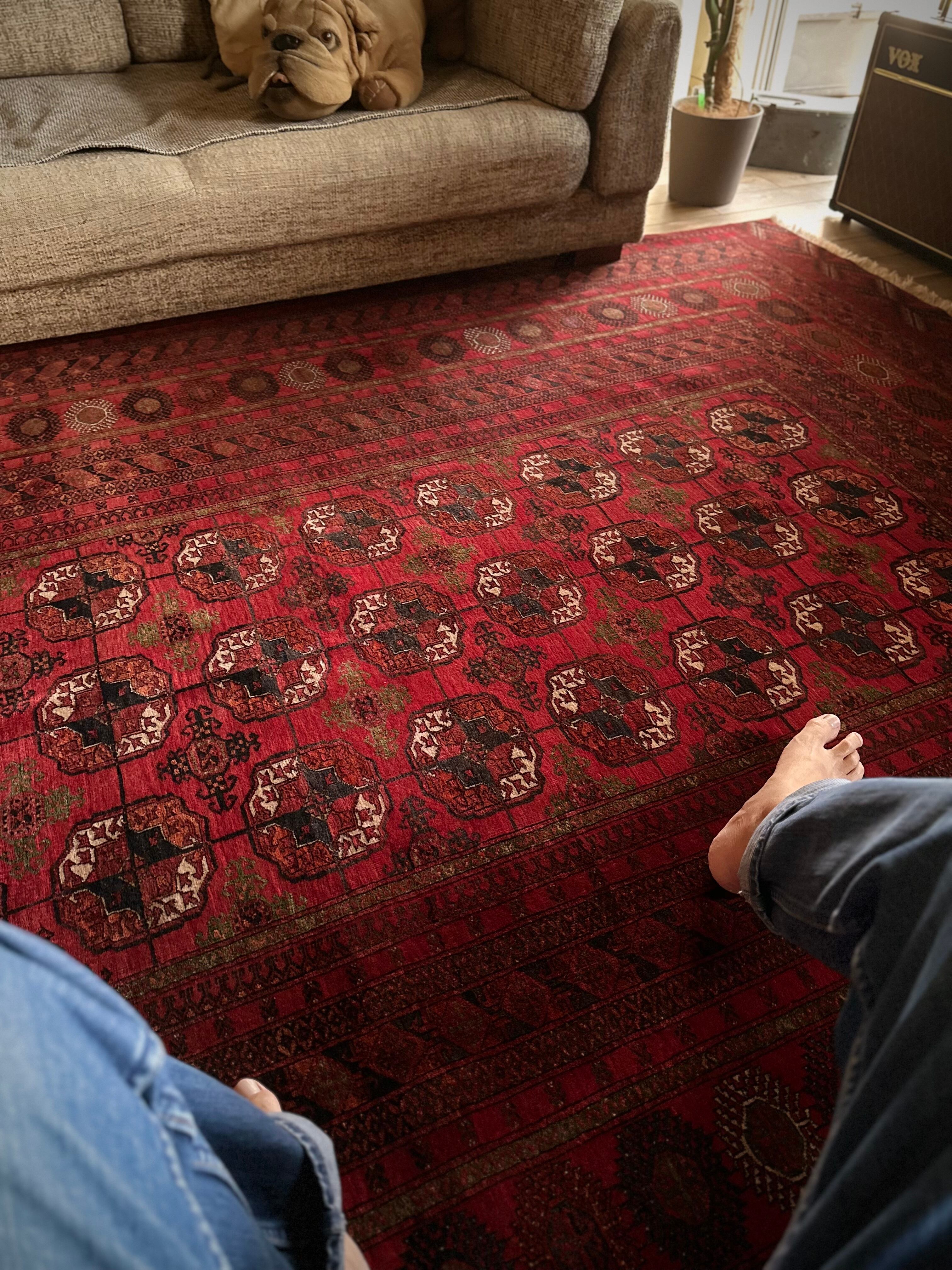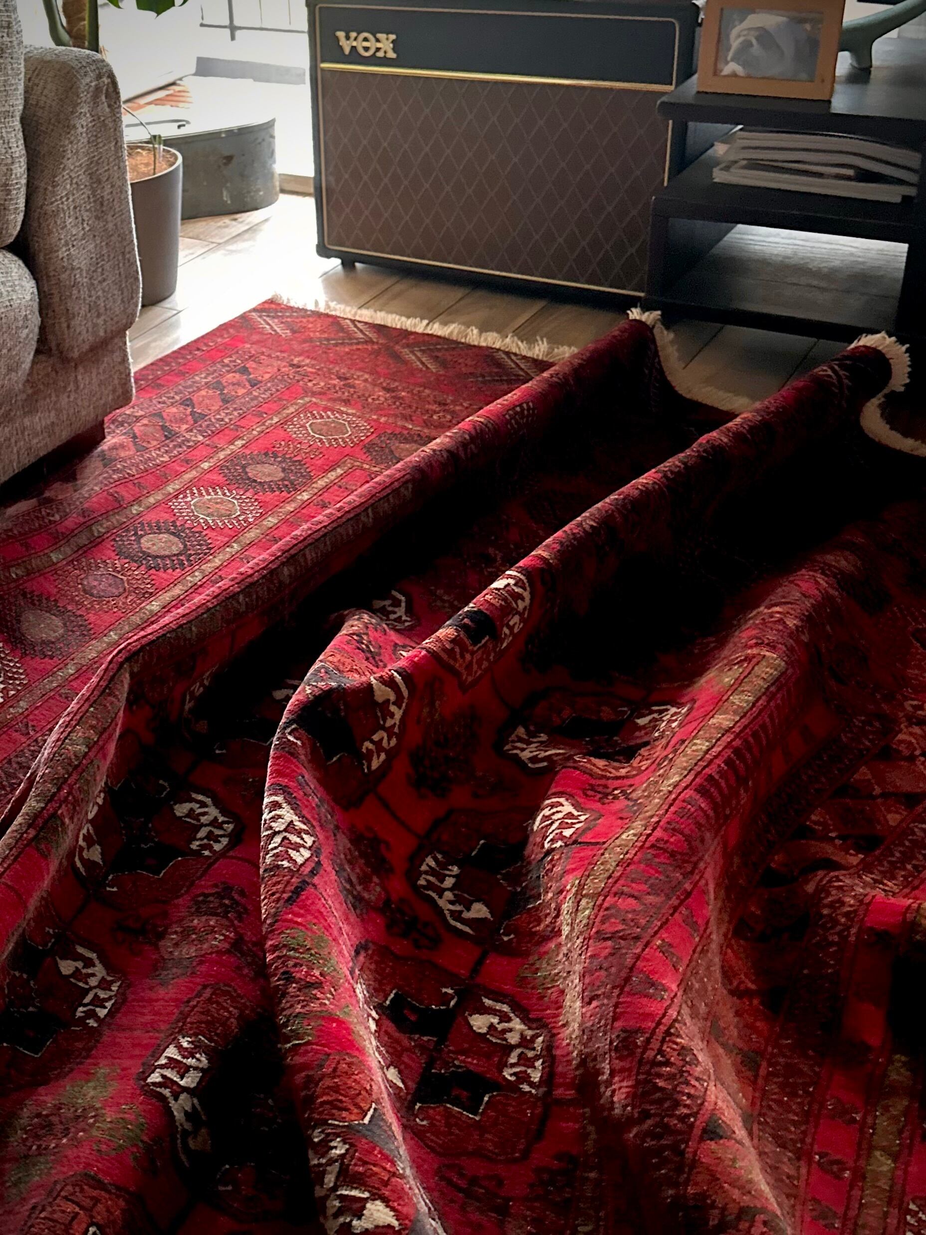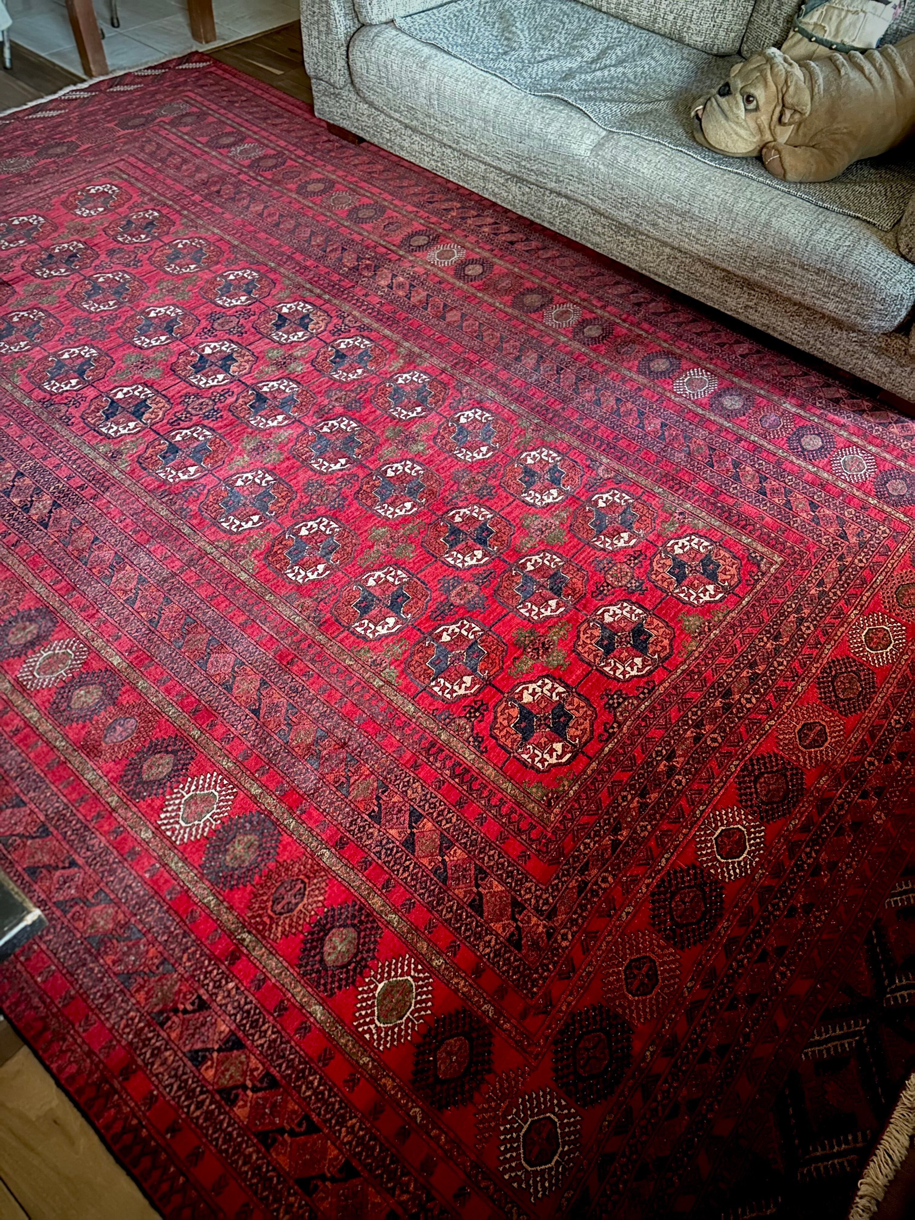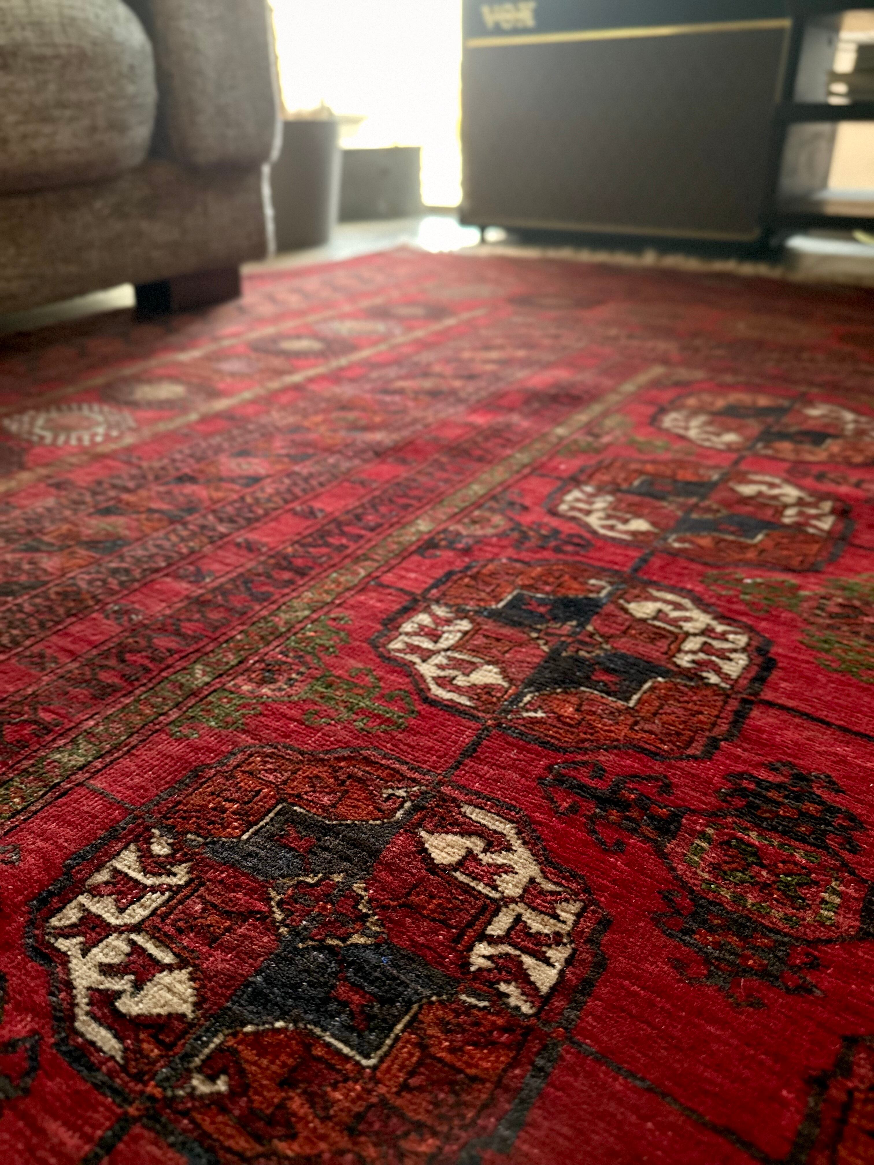 部屋一面を覆う真紅のレッドカーペットの豪華さに度肝を抜かれるこちらの特大サイズは、アフガニスタン北西部の山岳地帯にて遊牧するトルクメン族のトライバルラグで、その細かな紋様の織りが他とは違った”Baba Sediq”と呼ばれる支族からの1枚になります。