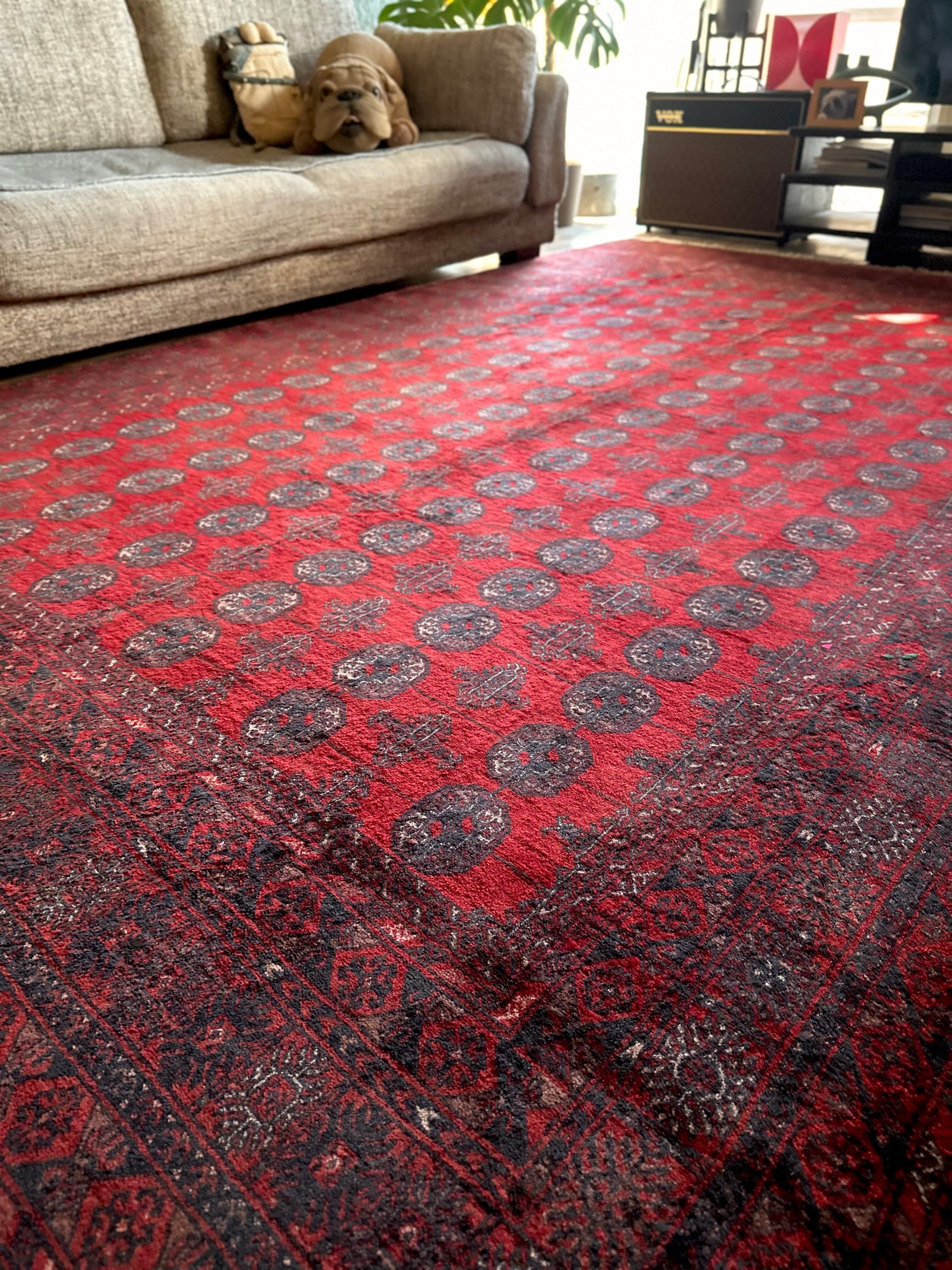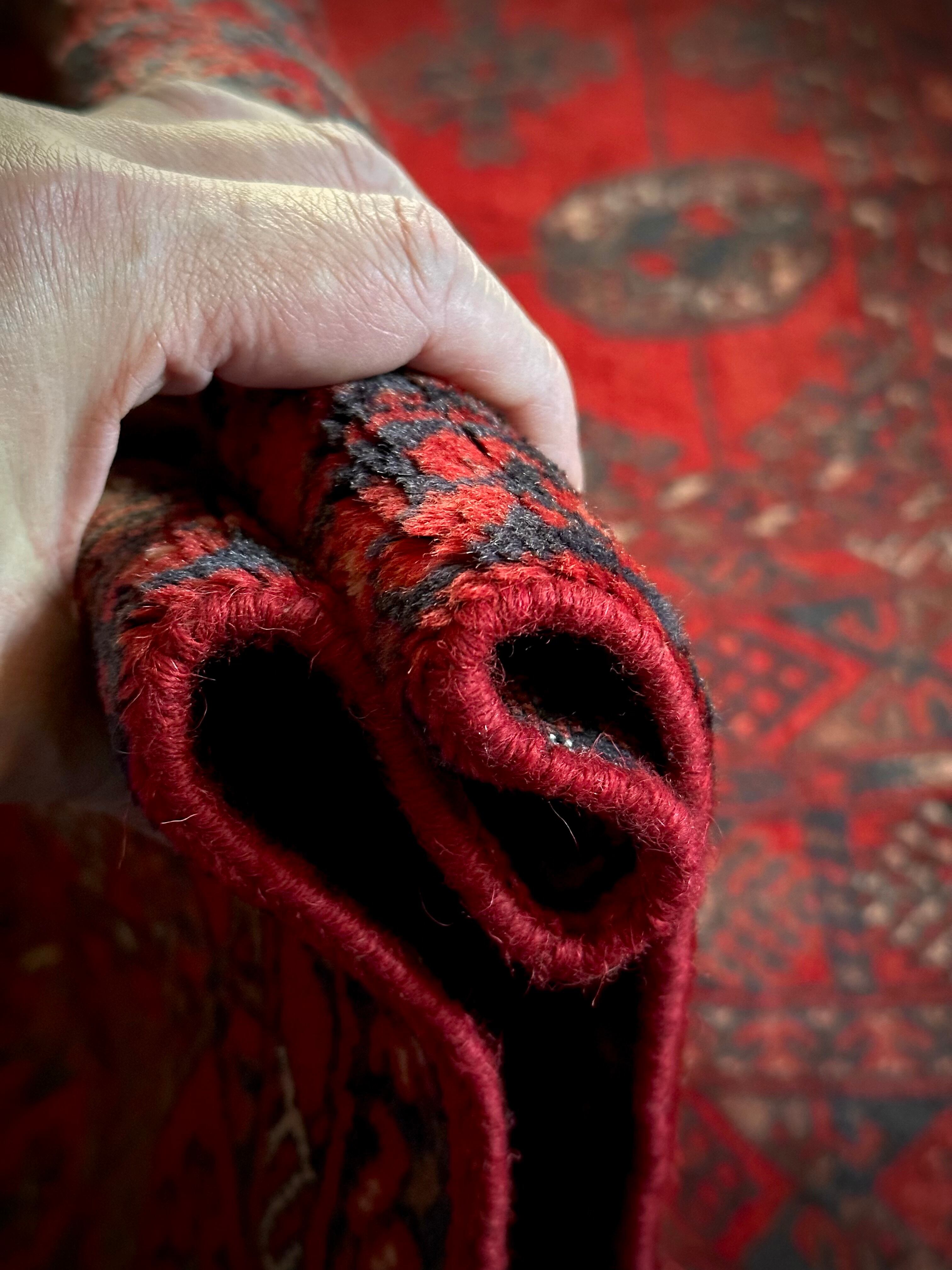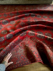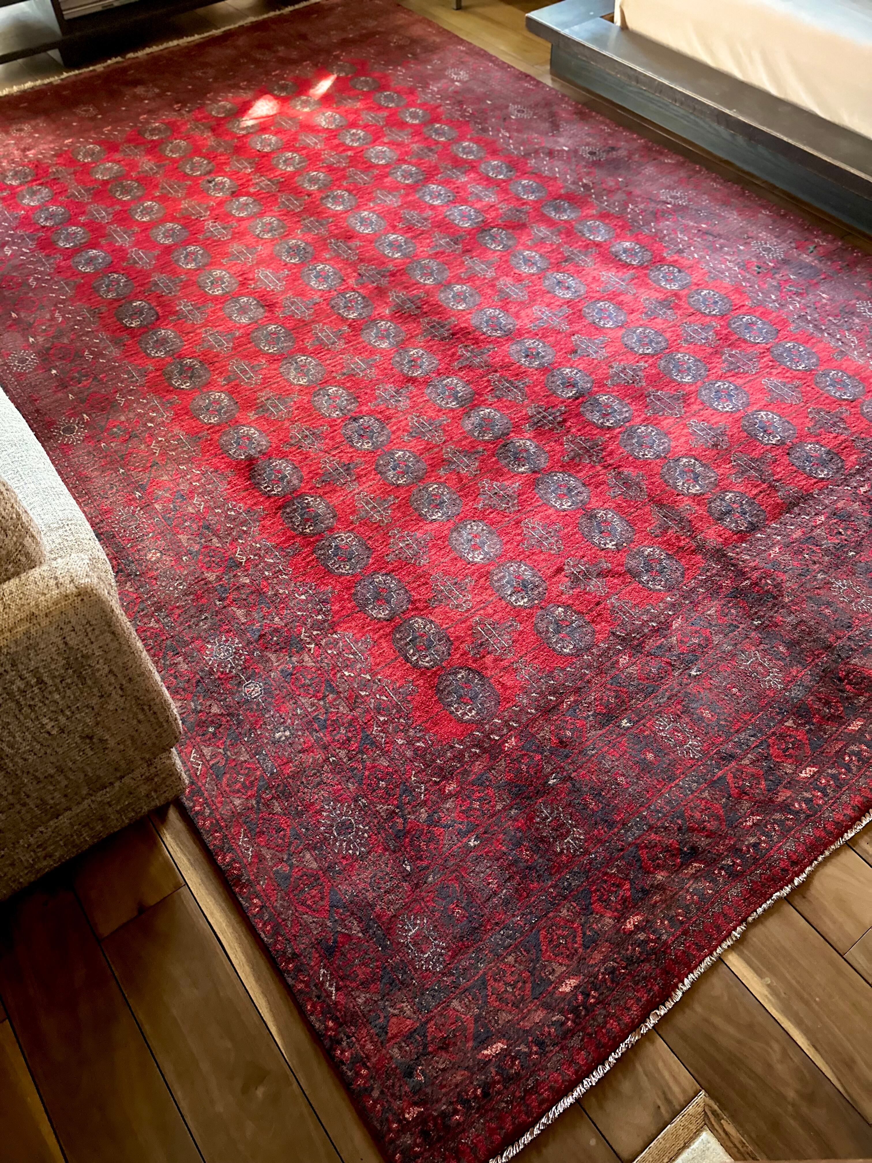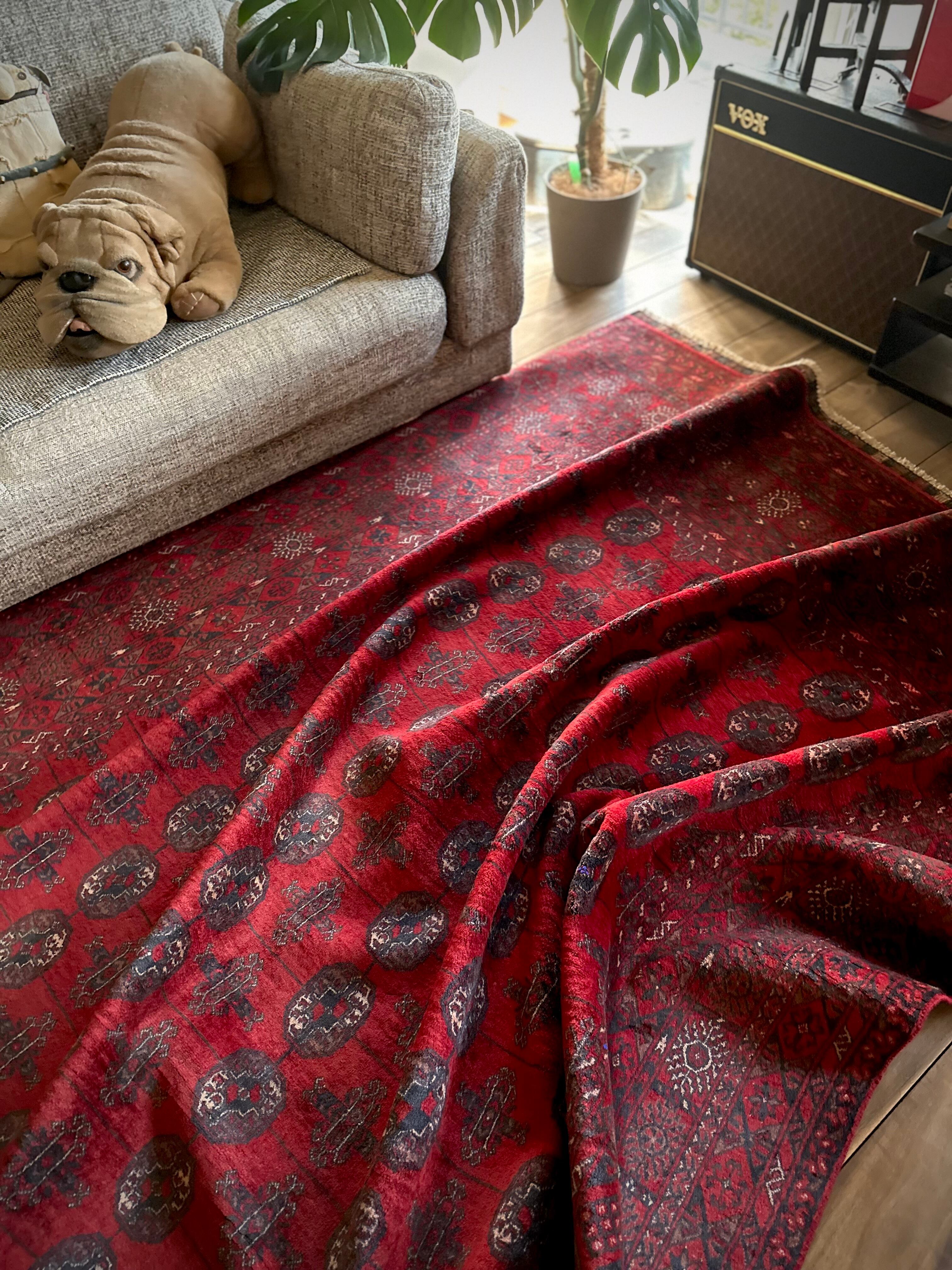 全体的に艶々とした反射で色飛びしてしまう真紅な特大サイズのこちらは、アフガニスタン北西部の山岳地帯で遊牧するトルクメン族からのトライバルラグで、部族の代名詞とも言えるレッドカーペットが眩しい1枚になります。