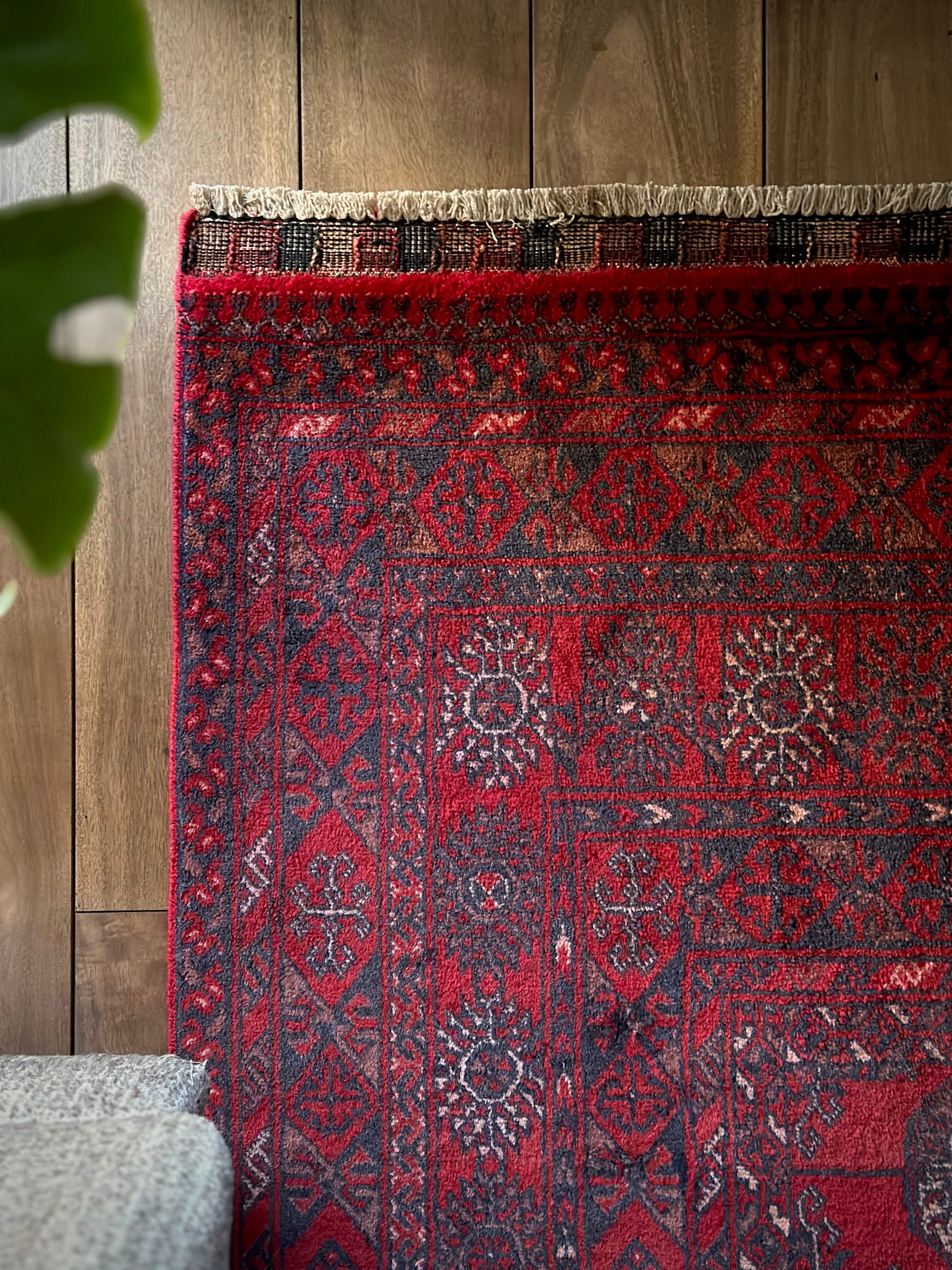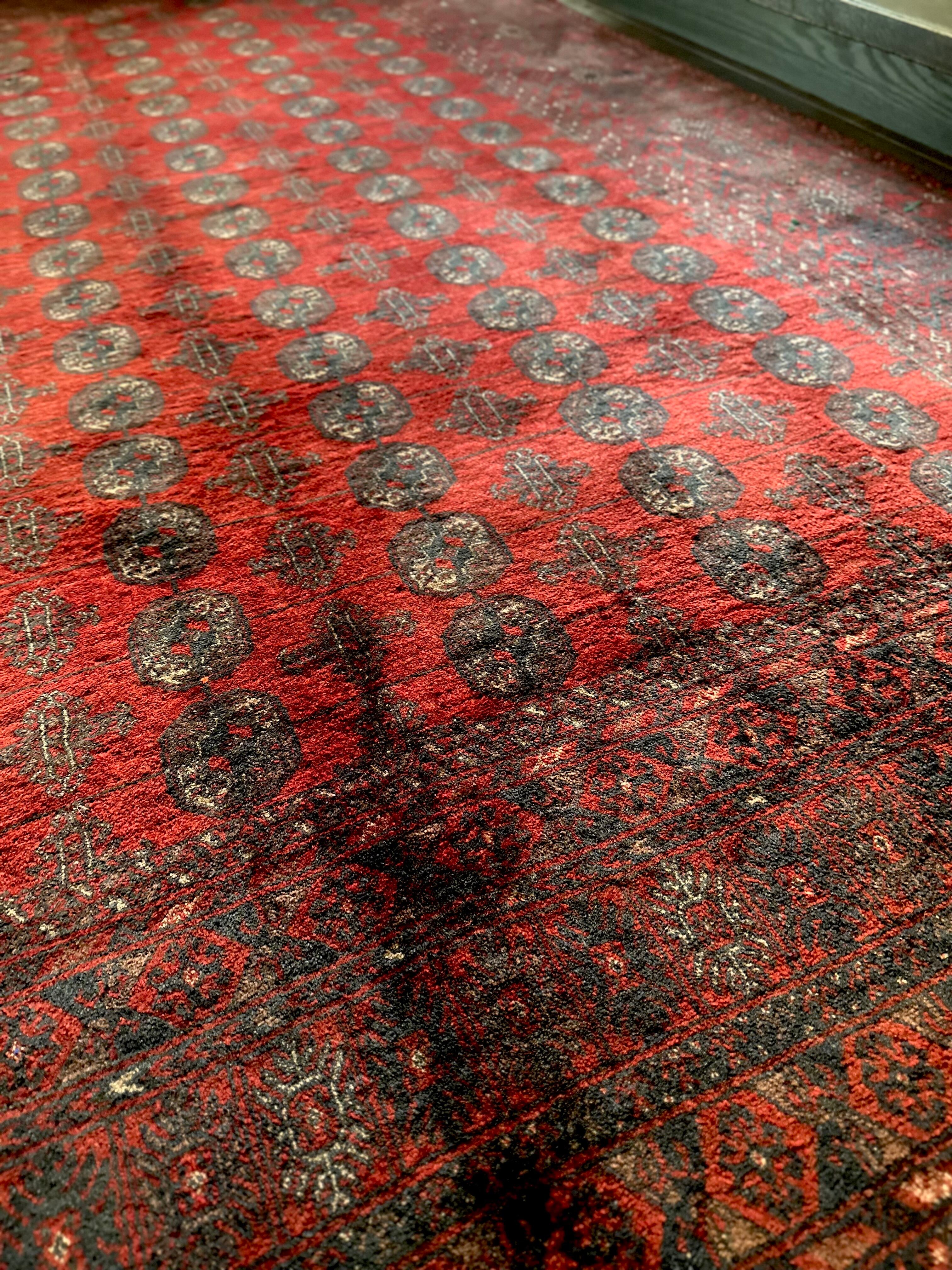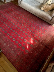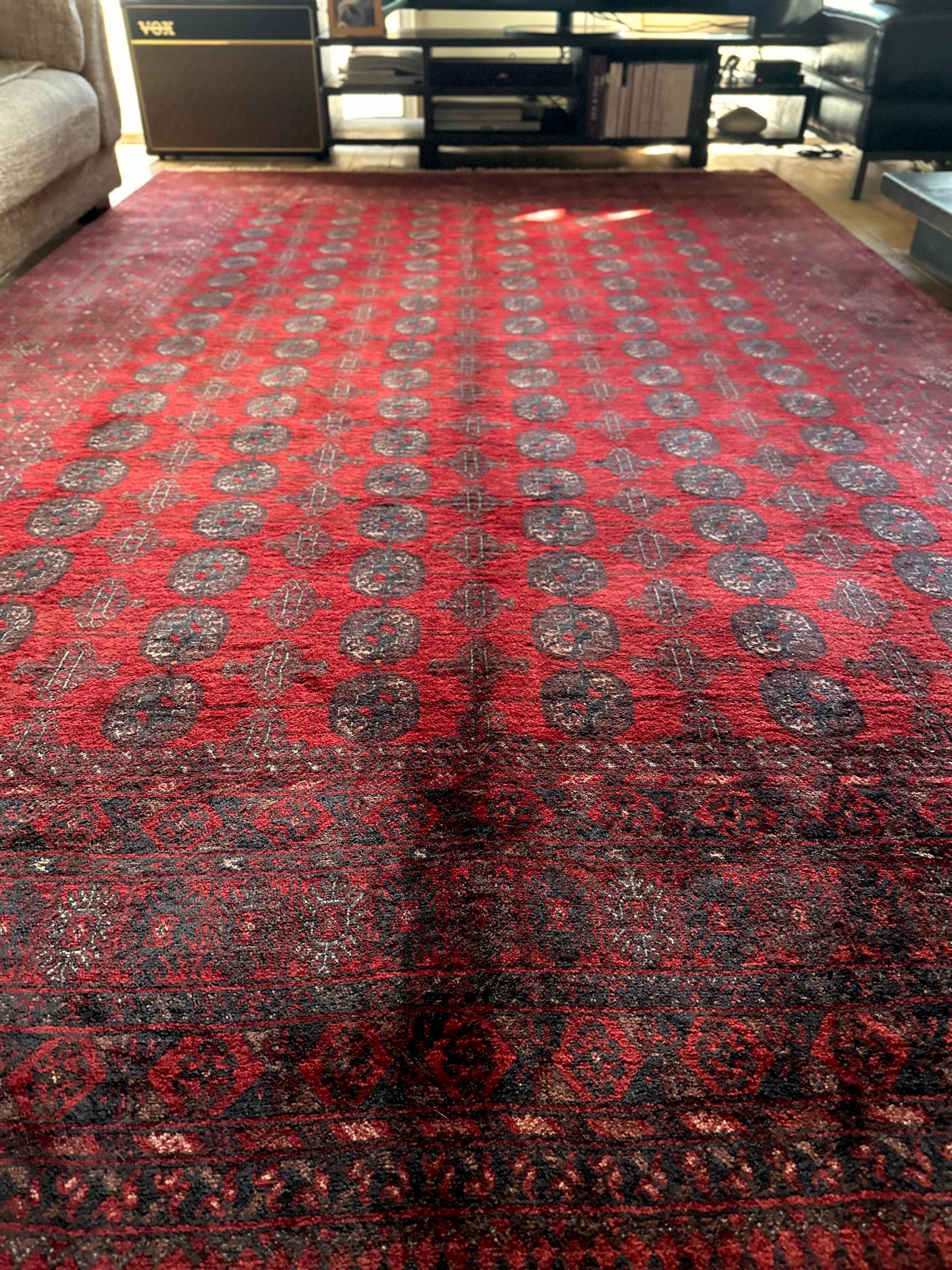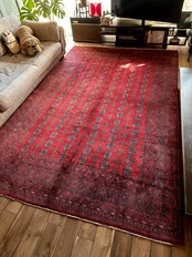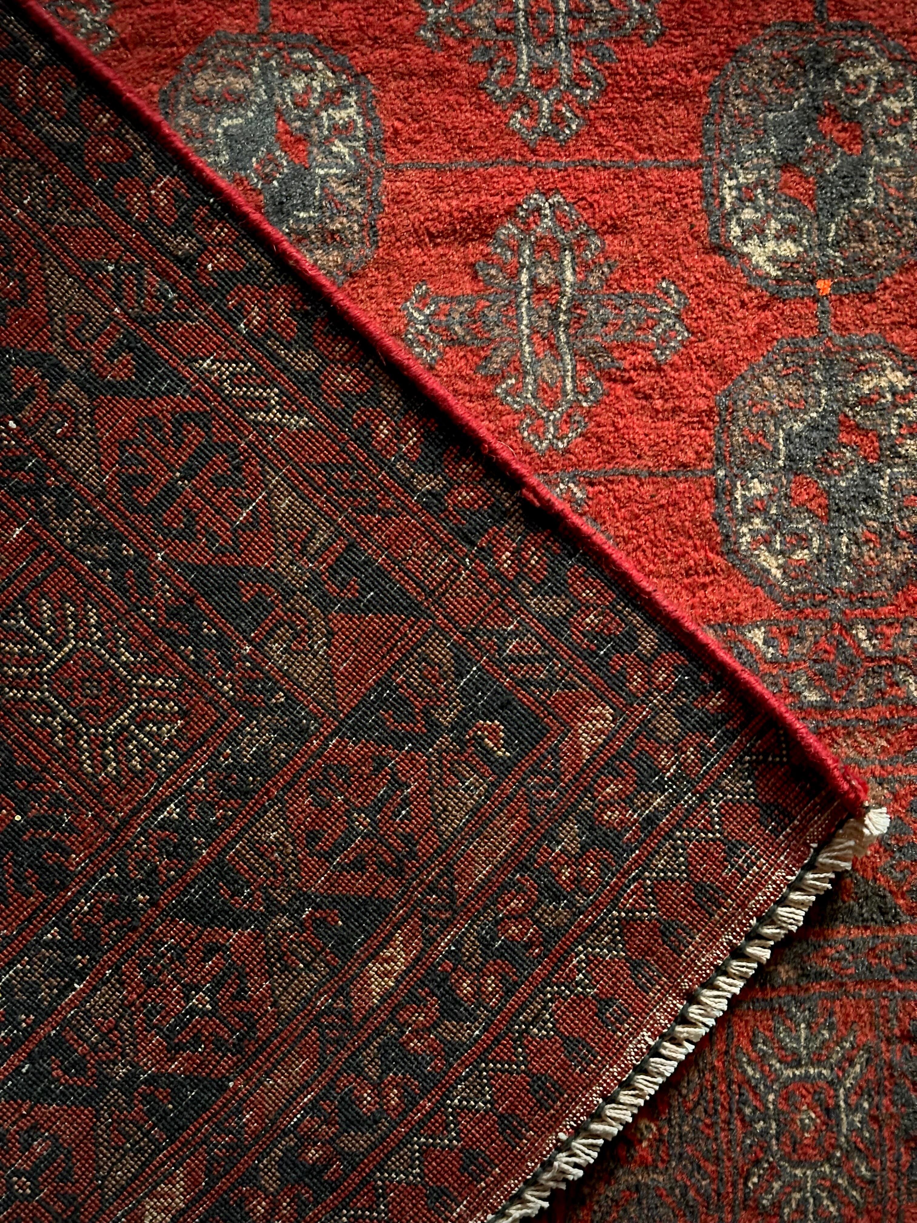 全体的に艶々とした反射で色飛びしてしまう真紅な特大サイズのこちらは、アフガニスタン北西部の山岳地帯で遊牧するトルクメン族からのトライバルラグで、部族の代名詞とも言えるレッドカーペットが眩しい1枚になります。