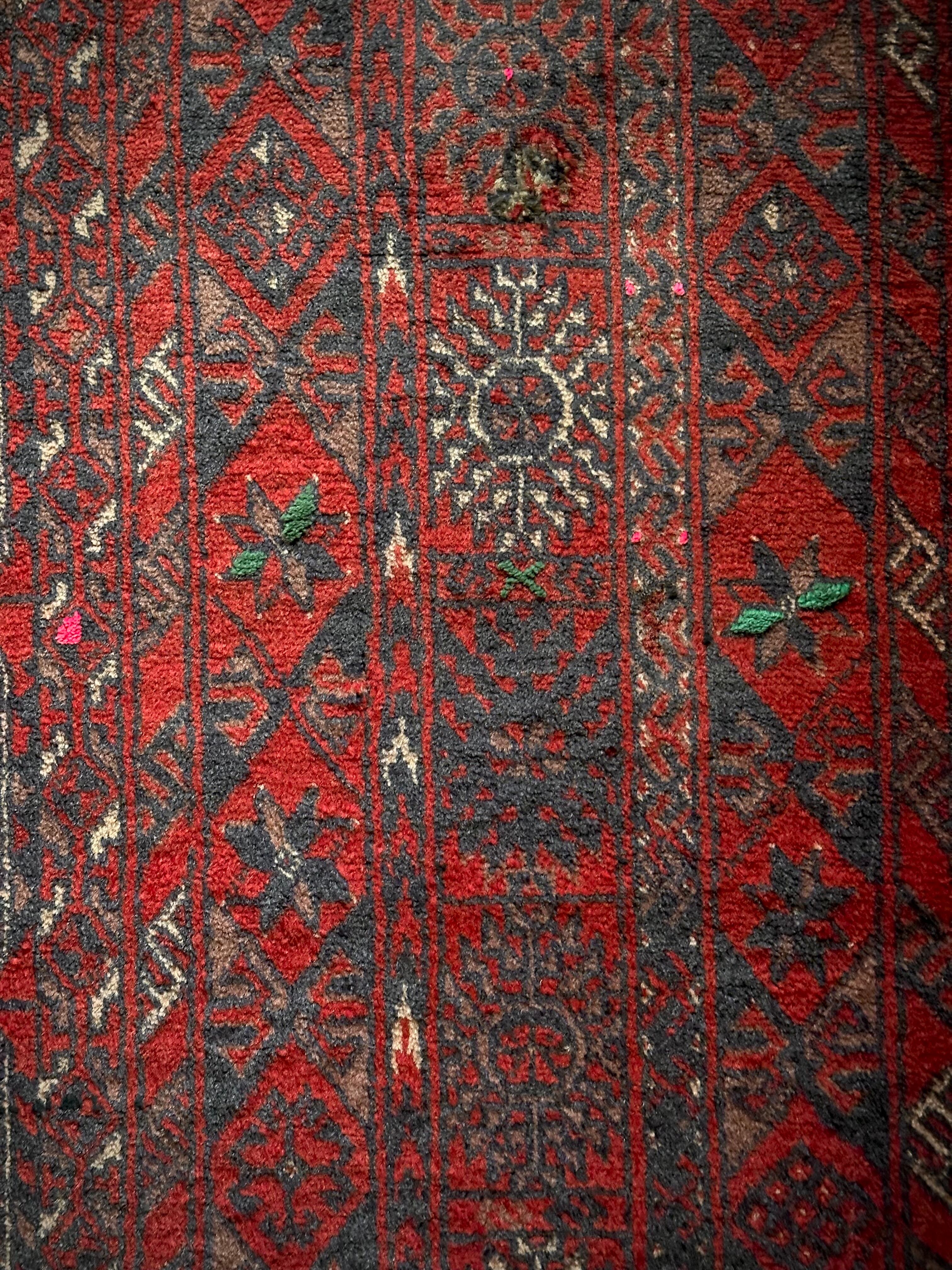 経年としては60年のヴィンテージラグらしいパイルのツヤ感がかっこよく、それなりの使用感はありますが目立つダメージにリペア箇所は見当たらないグッドなコンディションで、単なる気まぐれに数カ所に蛍光色のパイルでアクセントが付いているのが面白いでしょうか。