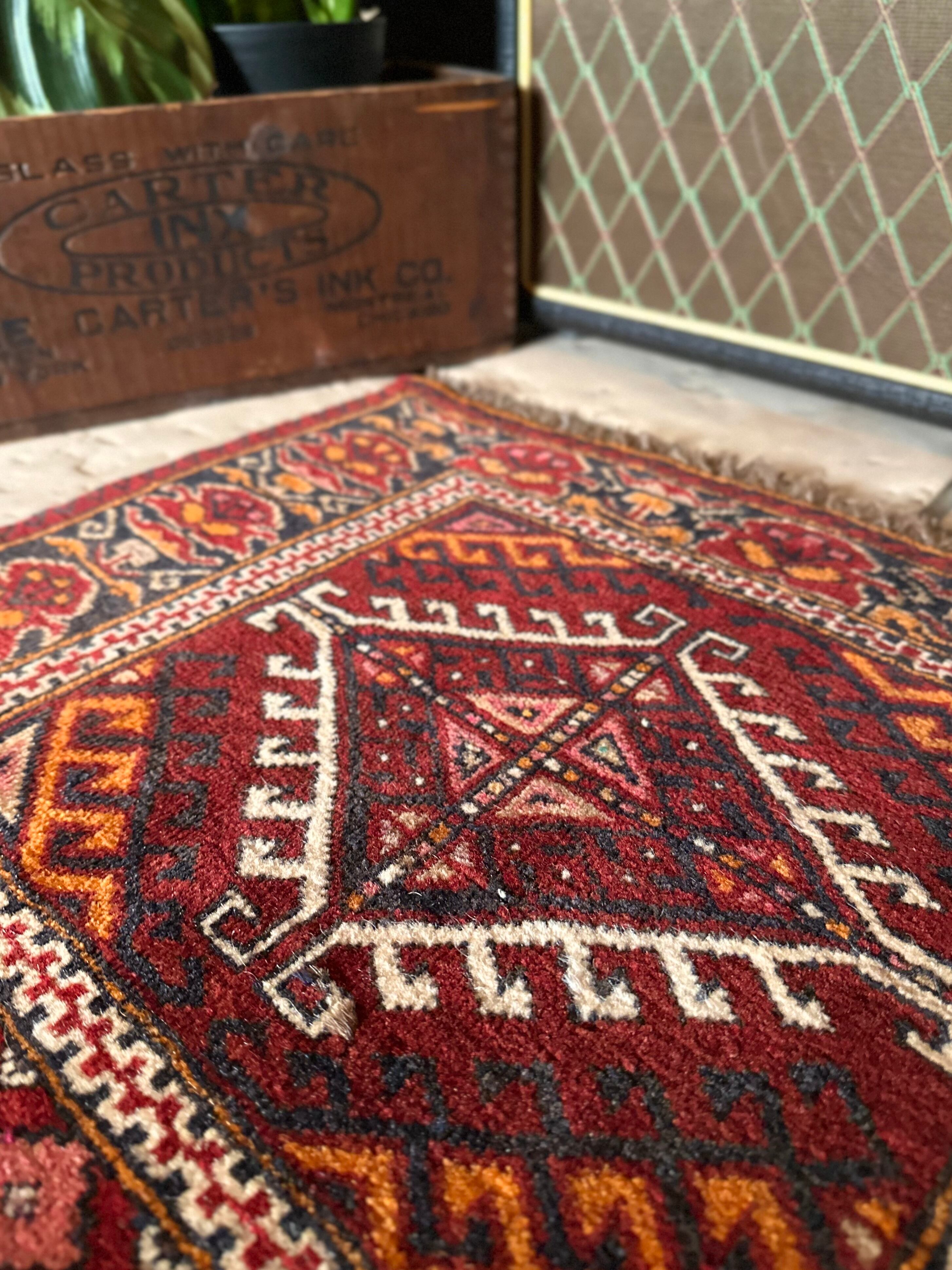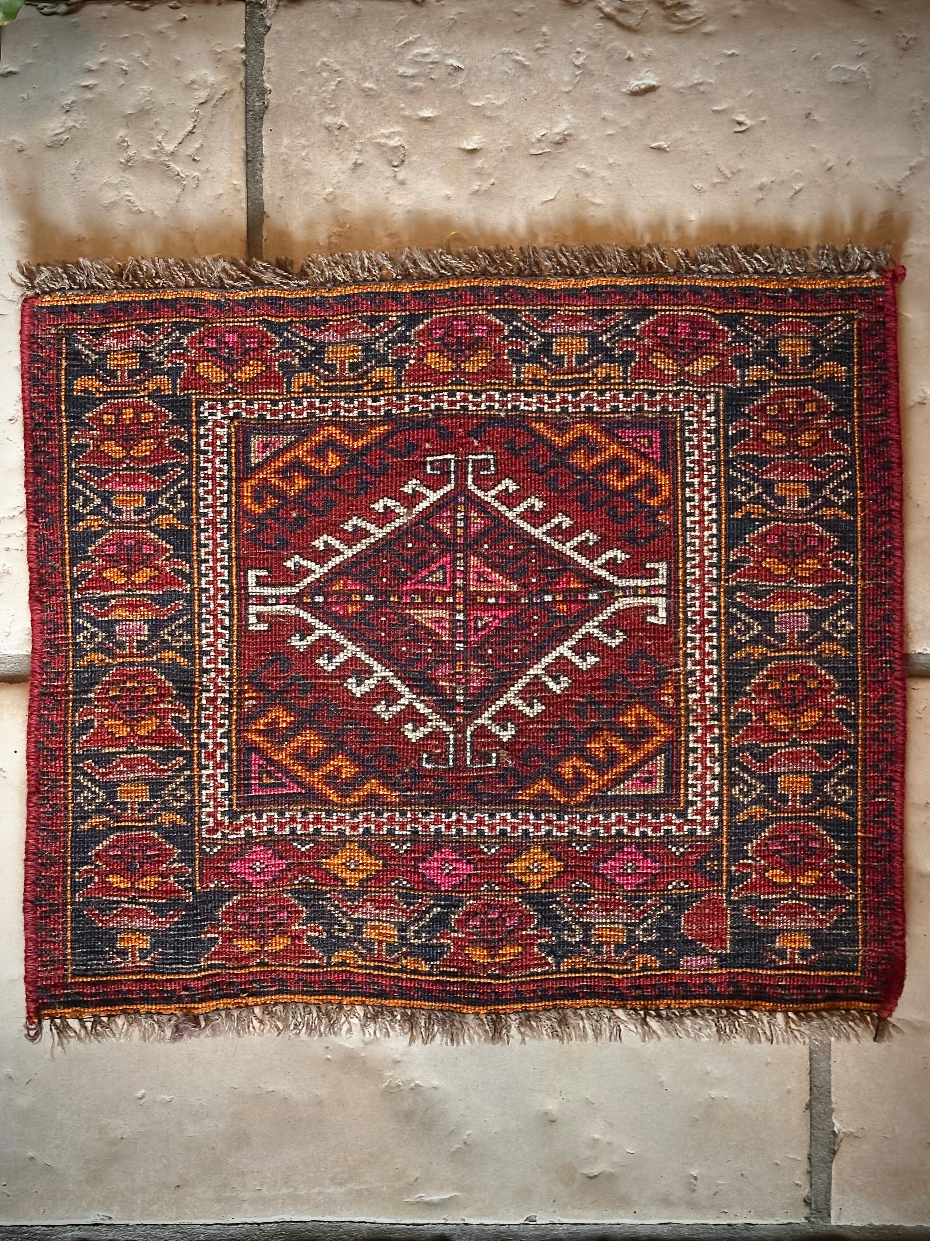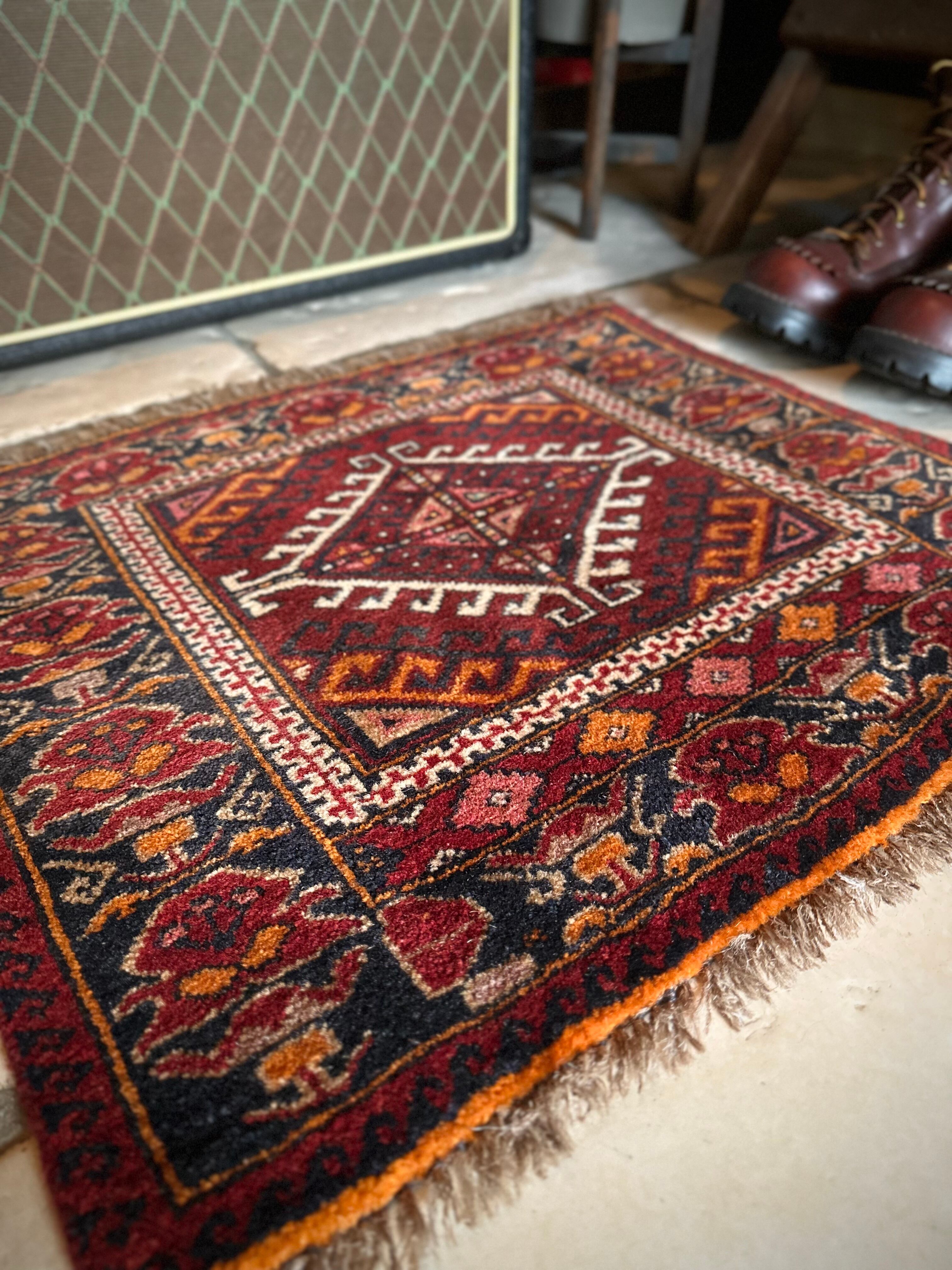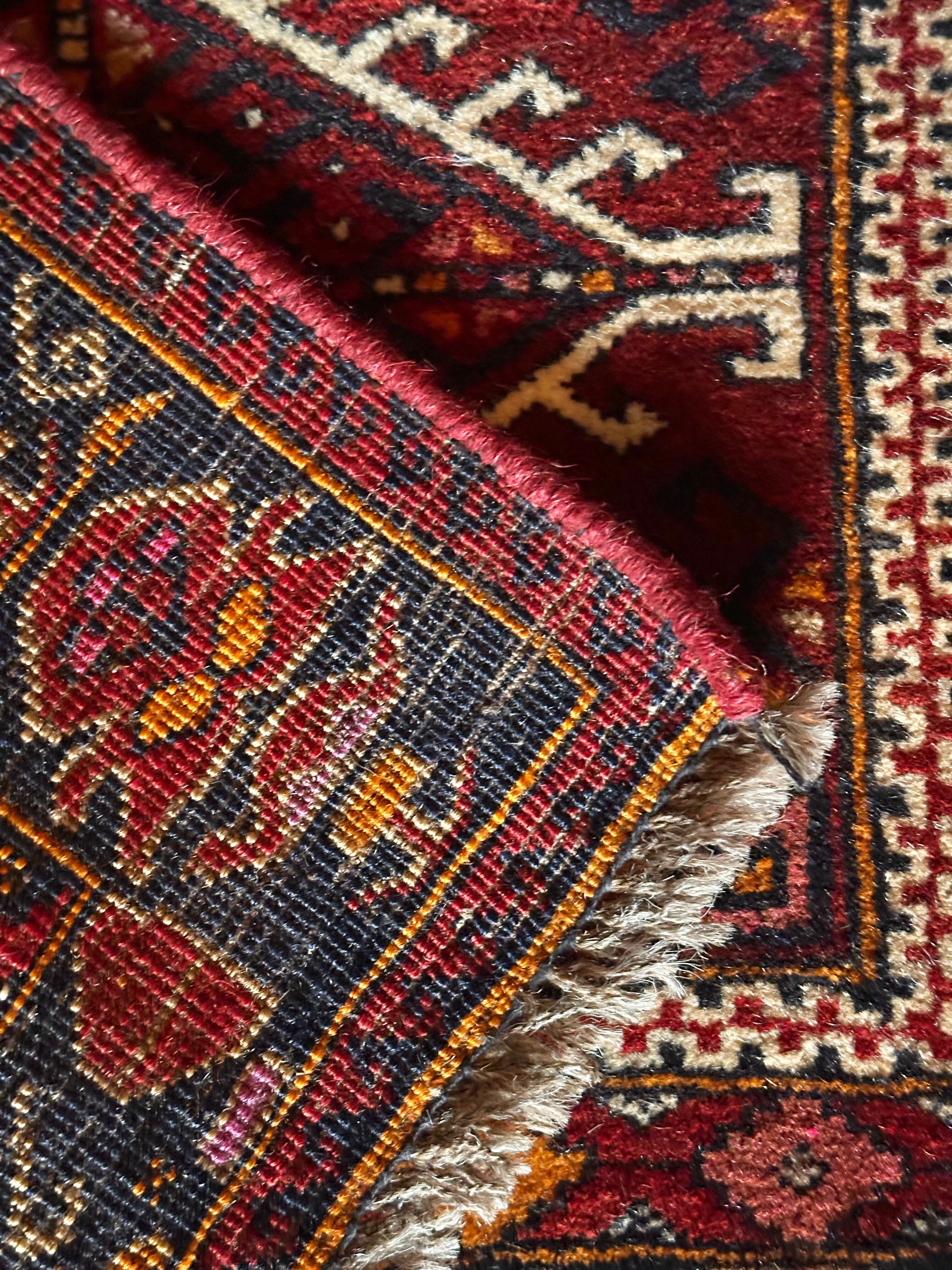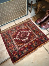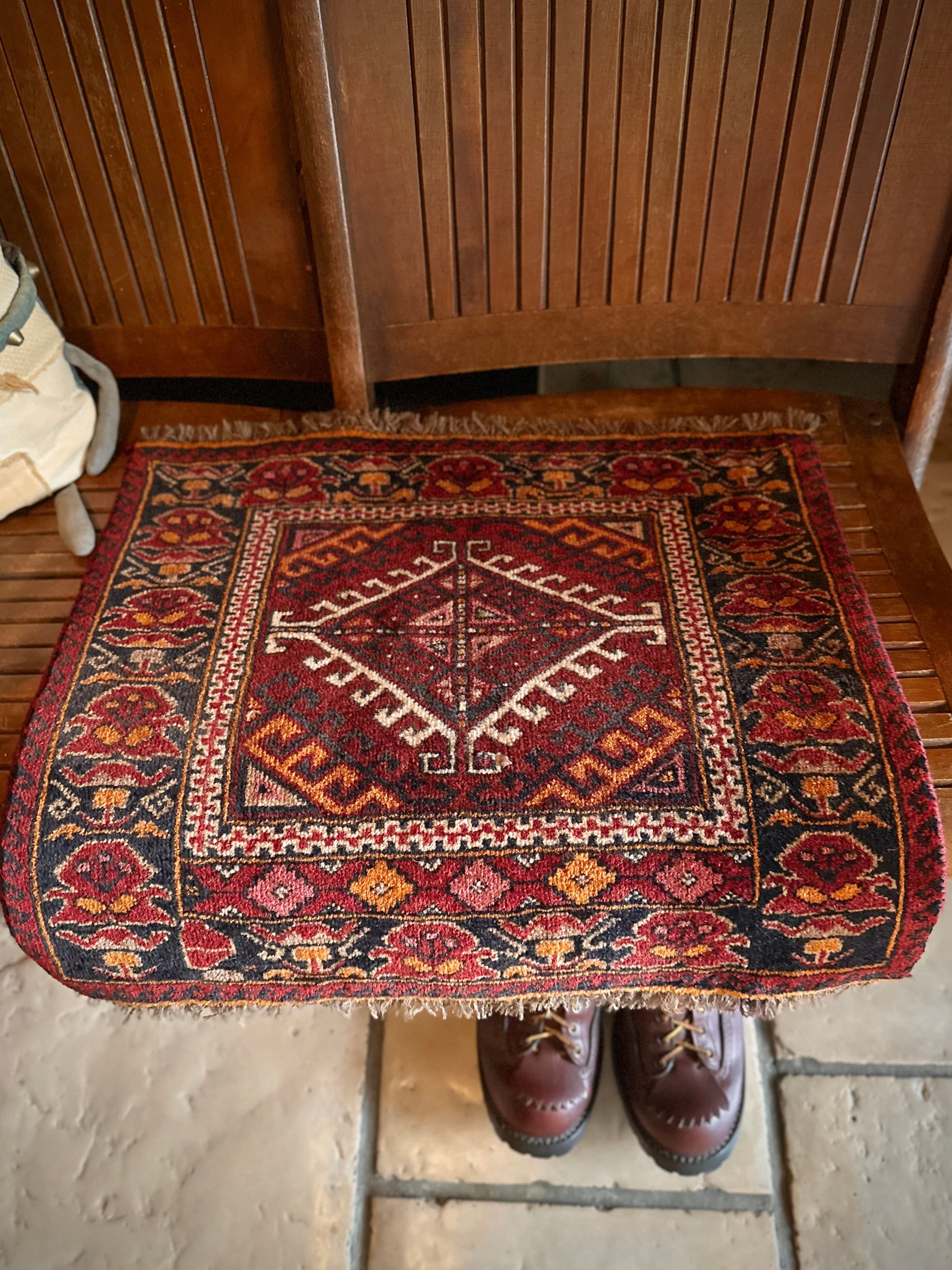 小振りなサイズでバーガンディをベースにオレンジやピンクの華やかさに雄牛を表すフックドメダリオンがかっこいい、アフガニスタン北部のジョウズジャーン州に居住するトルクメン族のトライバルラグで、元々はホルジンと呼ばれるラクダやロバの背に跨がせるサドルバッグの表皮をラグに仕立て直したモノになり、本来なら2対セットの内の片側だけになります。