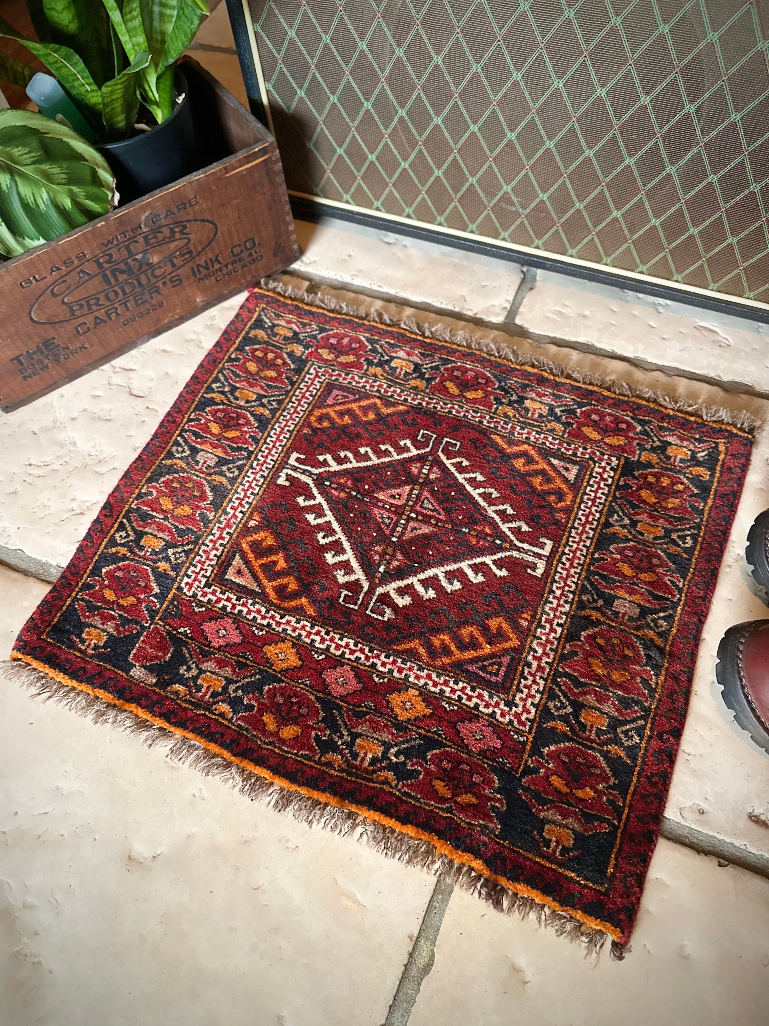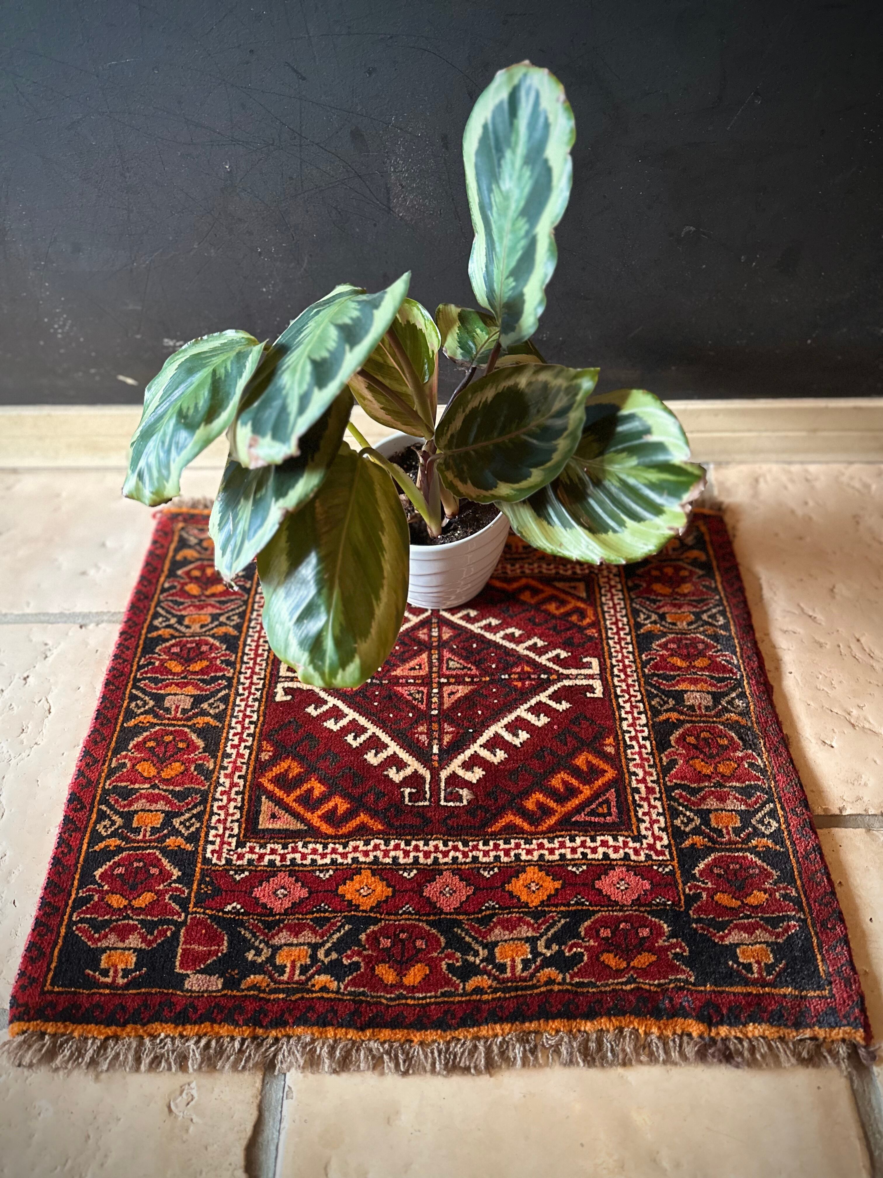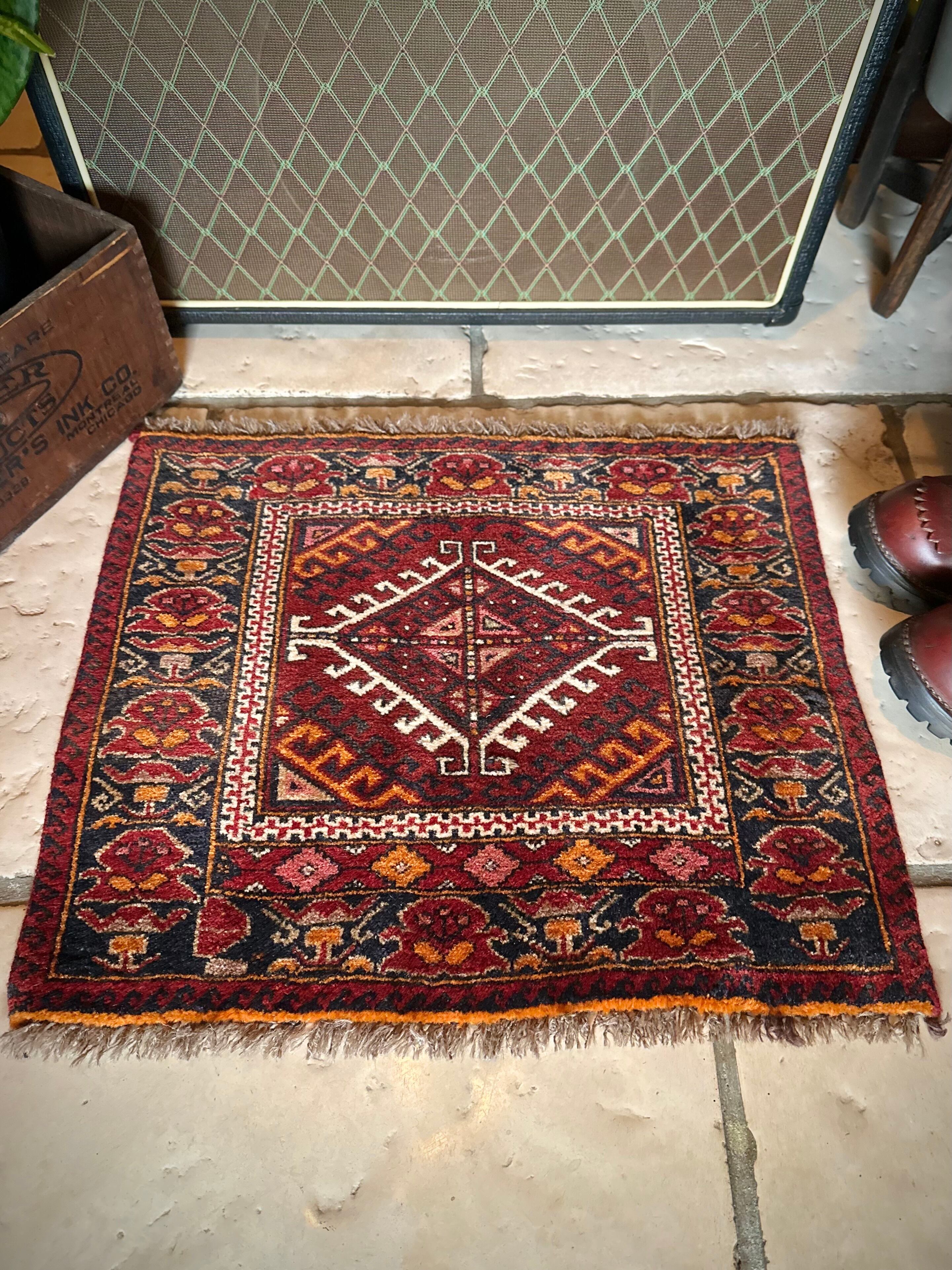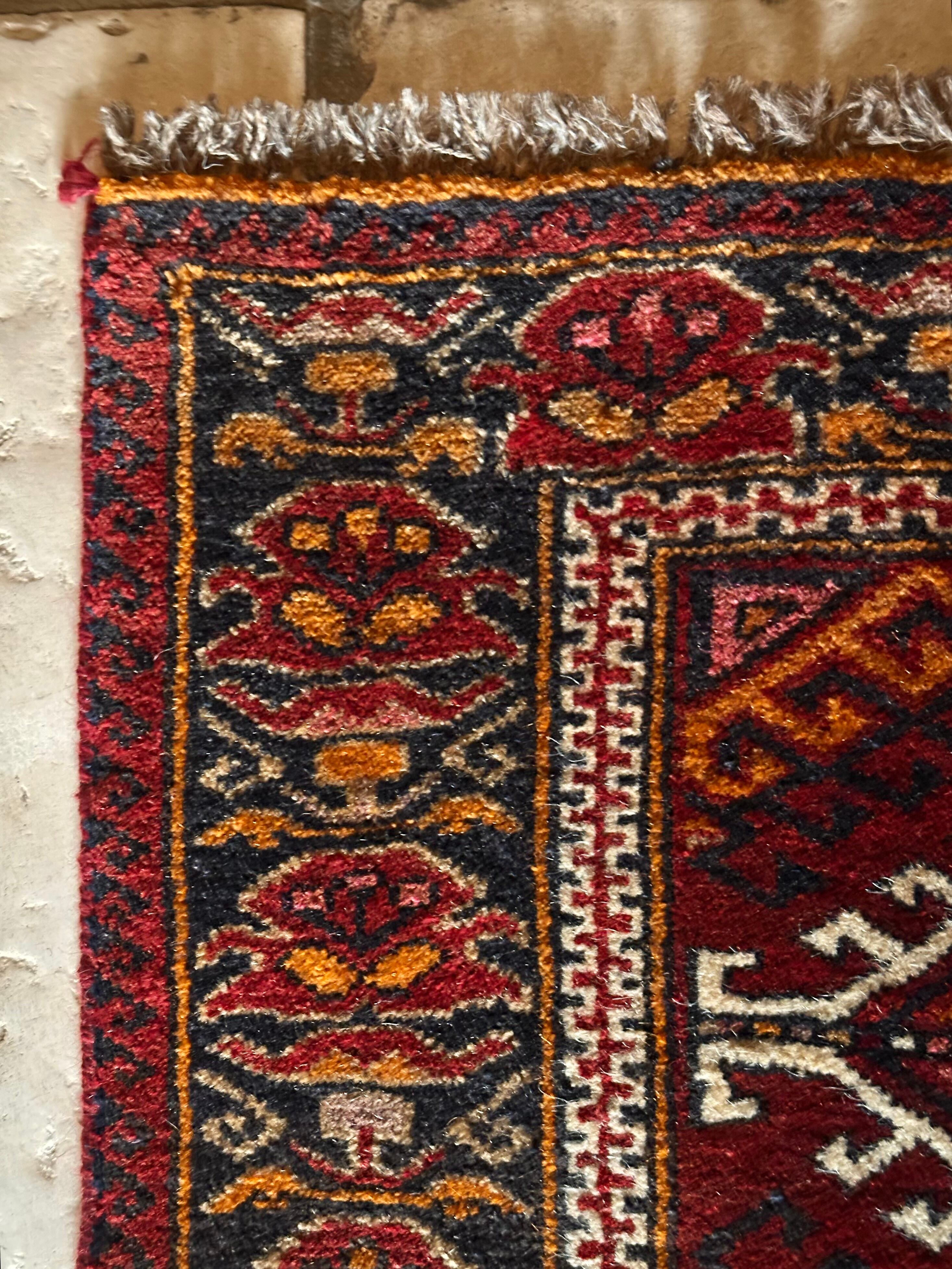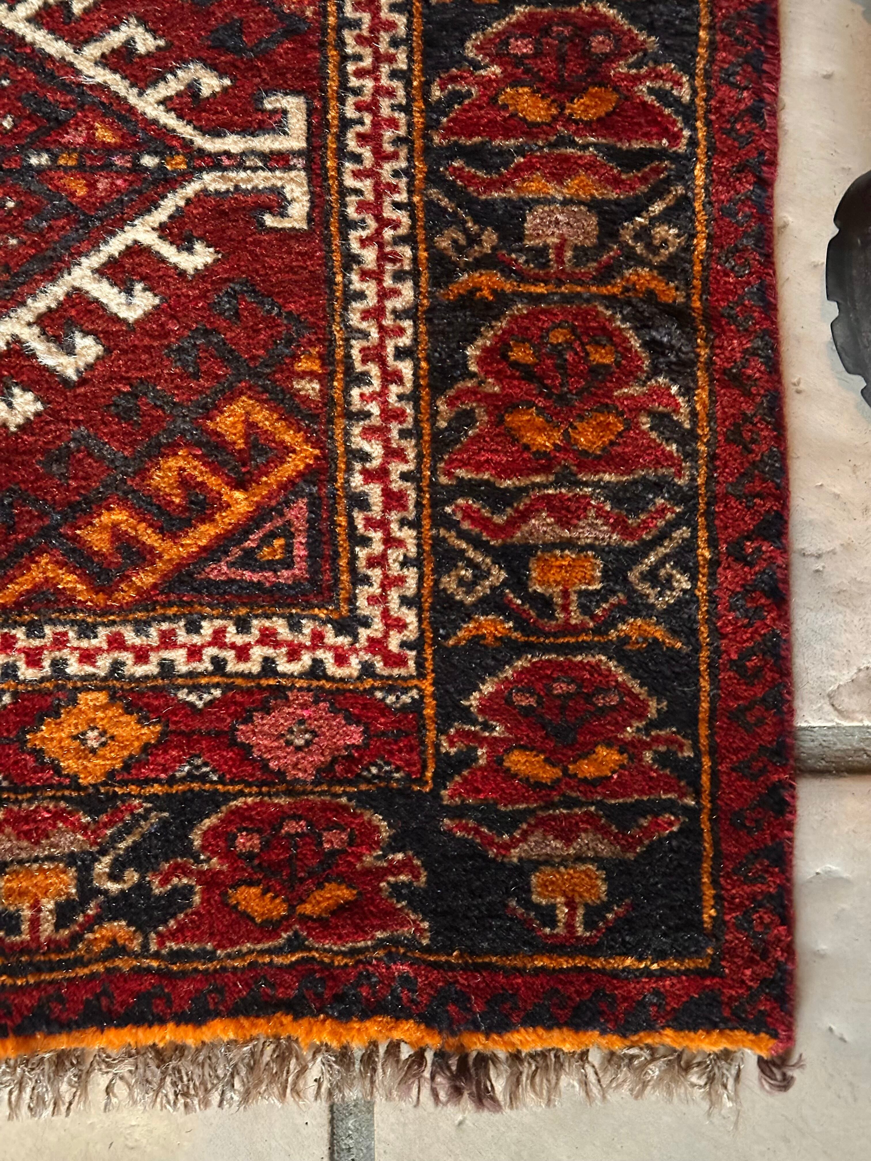 小振りなサイズでバーガンディをベースにオレンジやピンクの華やかさに雄牛を表すフックドメダリオンがかっこいい、アフガニスタン北部のジョウズジャーン州に居住するトルクメン族のトライバルラグで、元々はホルジンと呼ばれるラクダやロバの背に跨がせるサドルバッグの表皮をラグに仕立て直したモノになり、本来なら2対セットの内の片側だけになります。