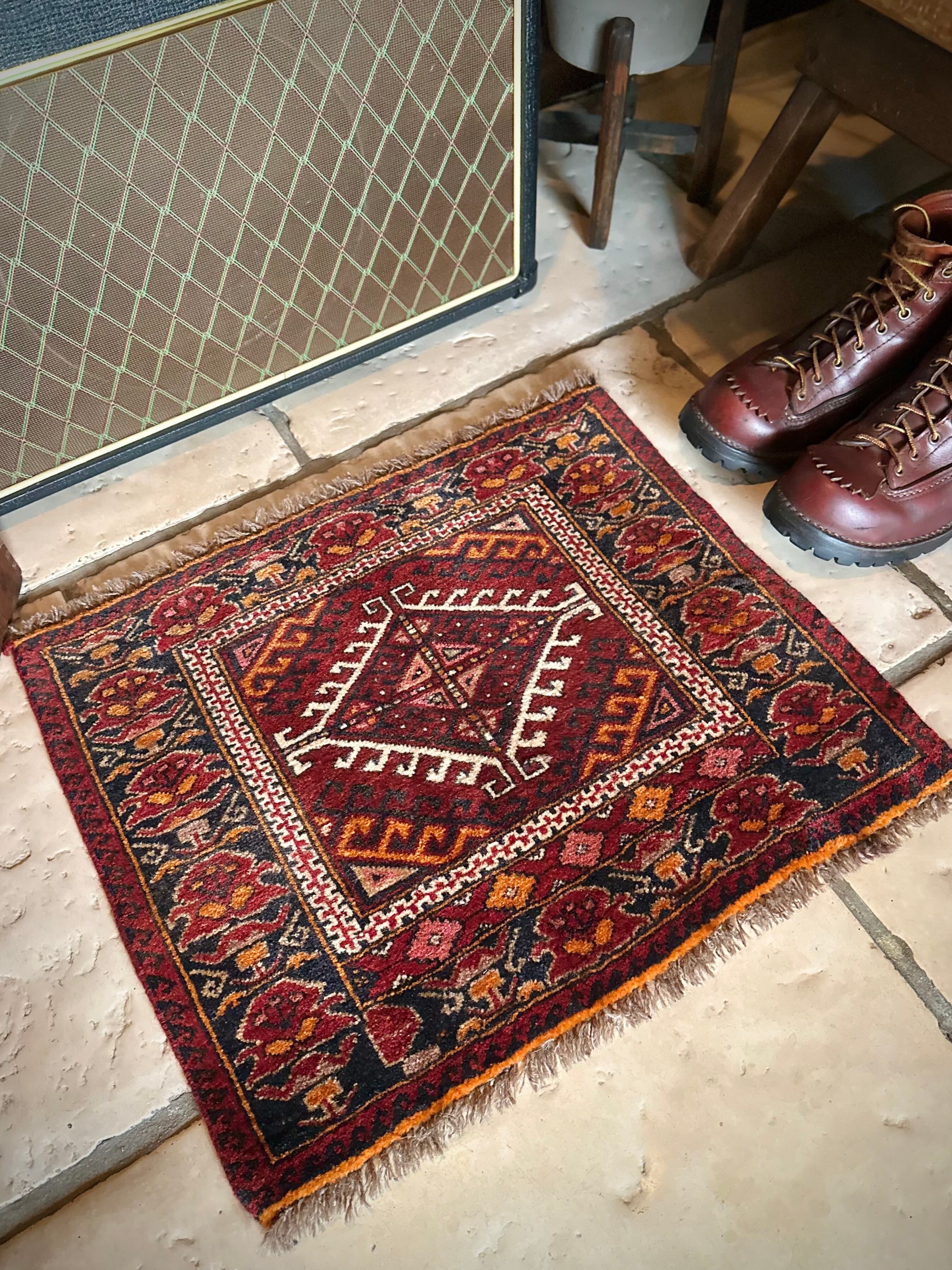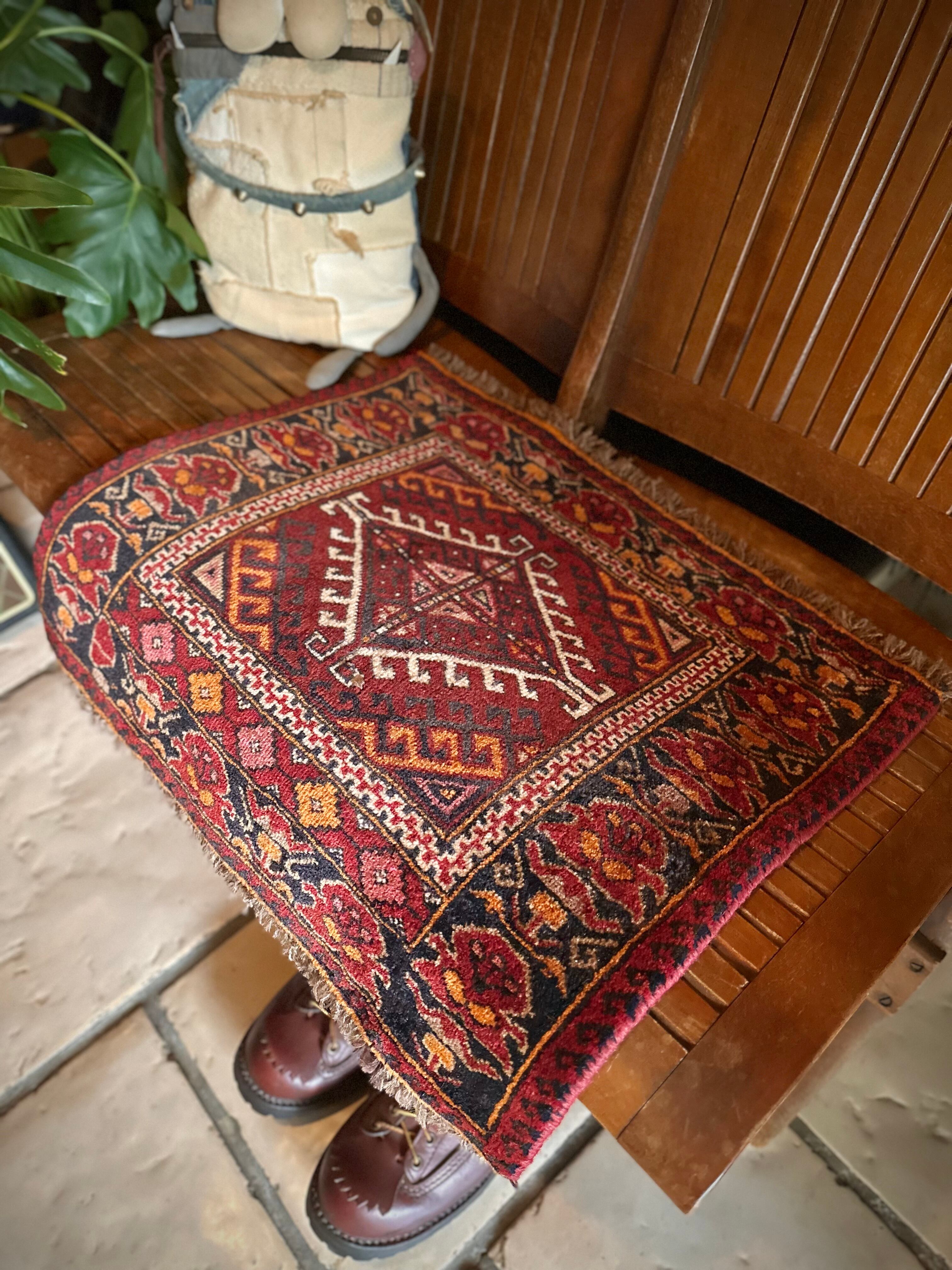 経年としては40年とそれなりのヴィンテージ品になりますが、バッグとして使用していた為に目立つ経年劣化もなく、パイル自体は長くはありませんが、しっかりとした織りで滑らかな手触りが心地よいです。また特に目立つダメージやリペア箇所は見当たらないグッドなコンディションで、トライバルラグ初心者の方でも気軽に取り入れてもらえる1枚になります。