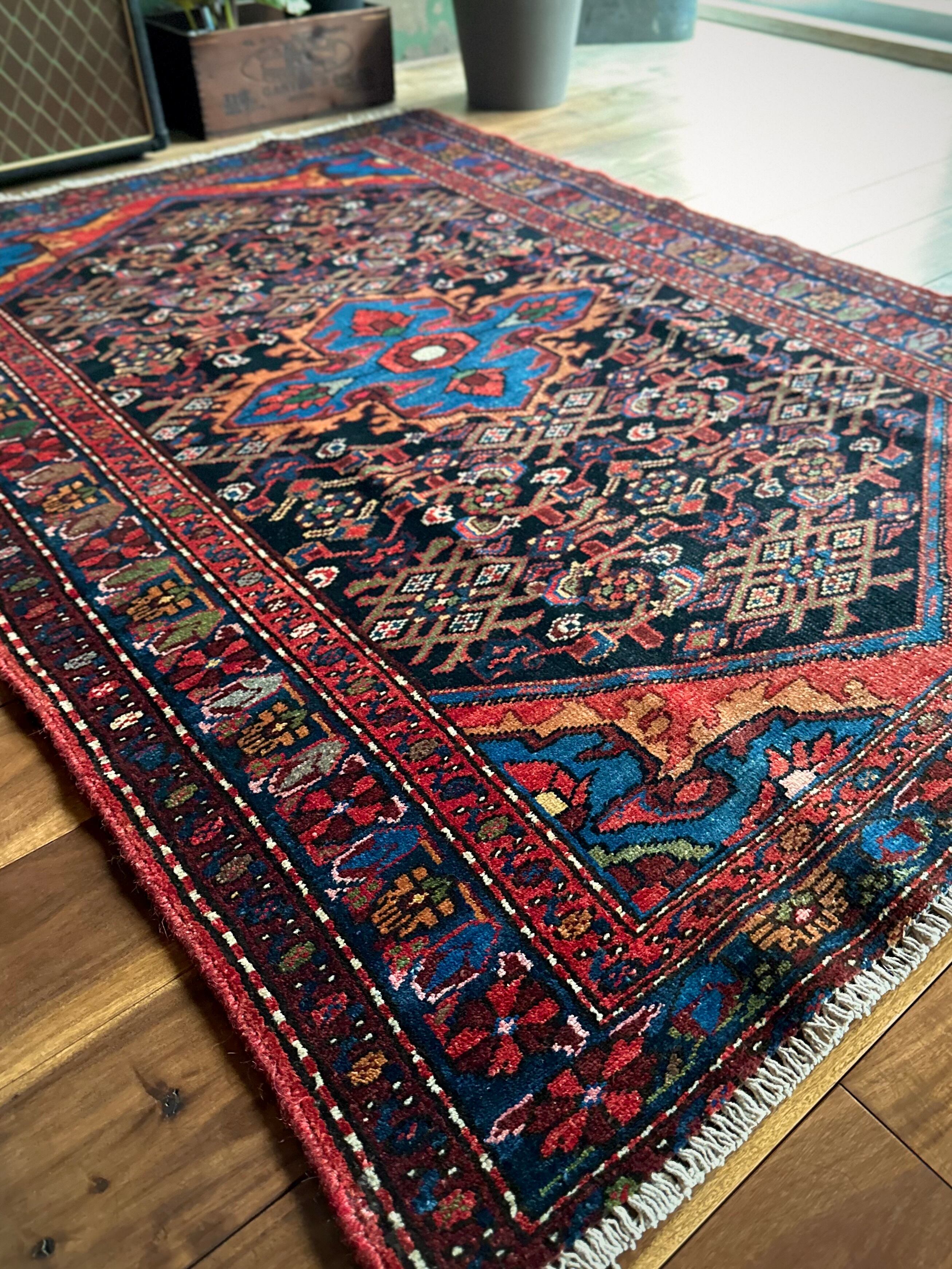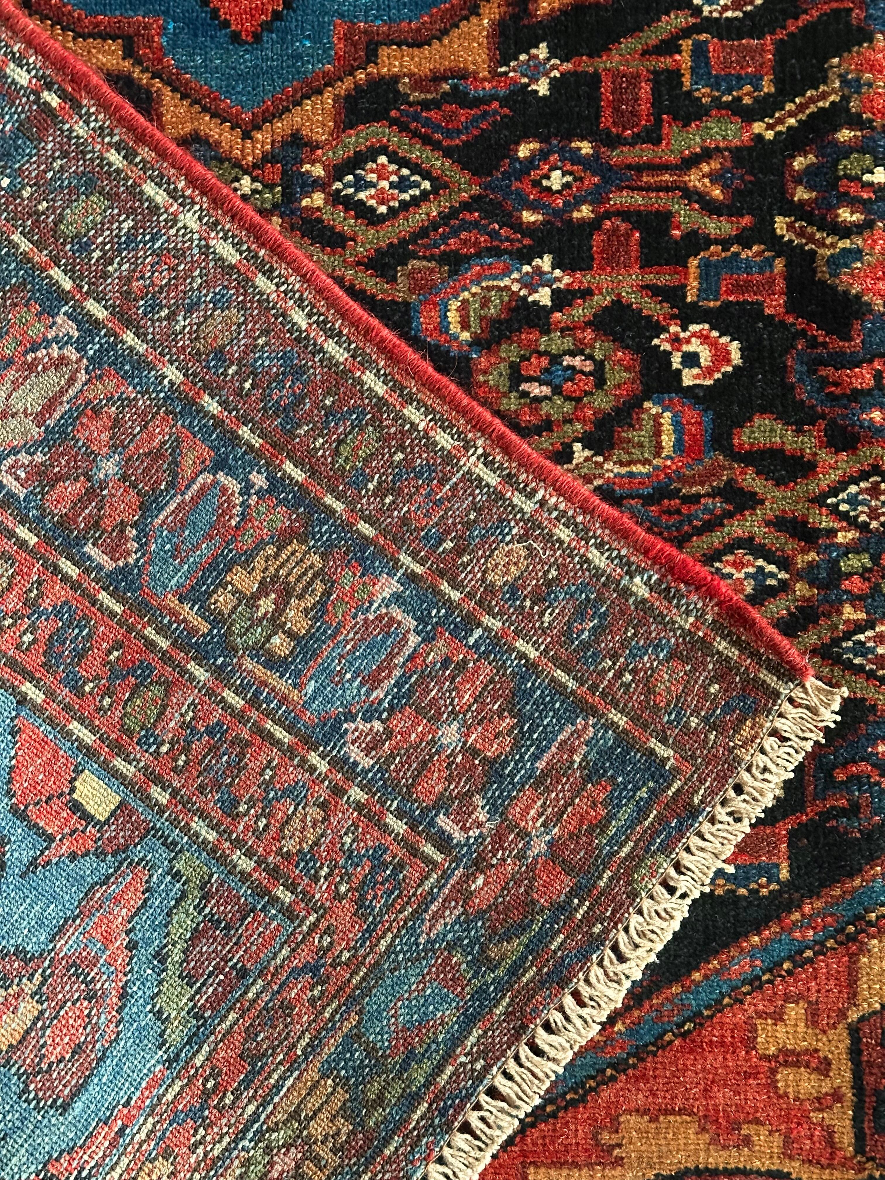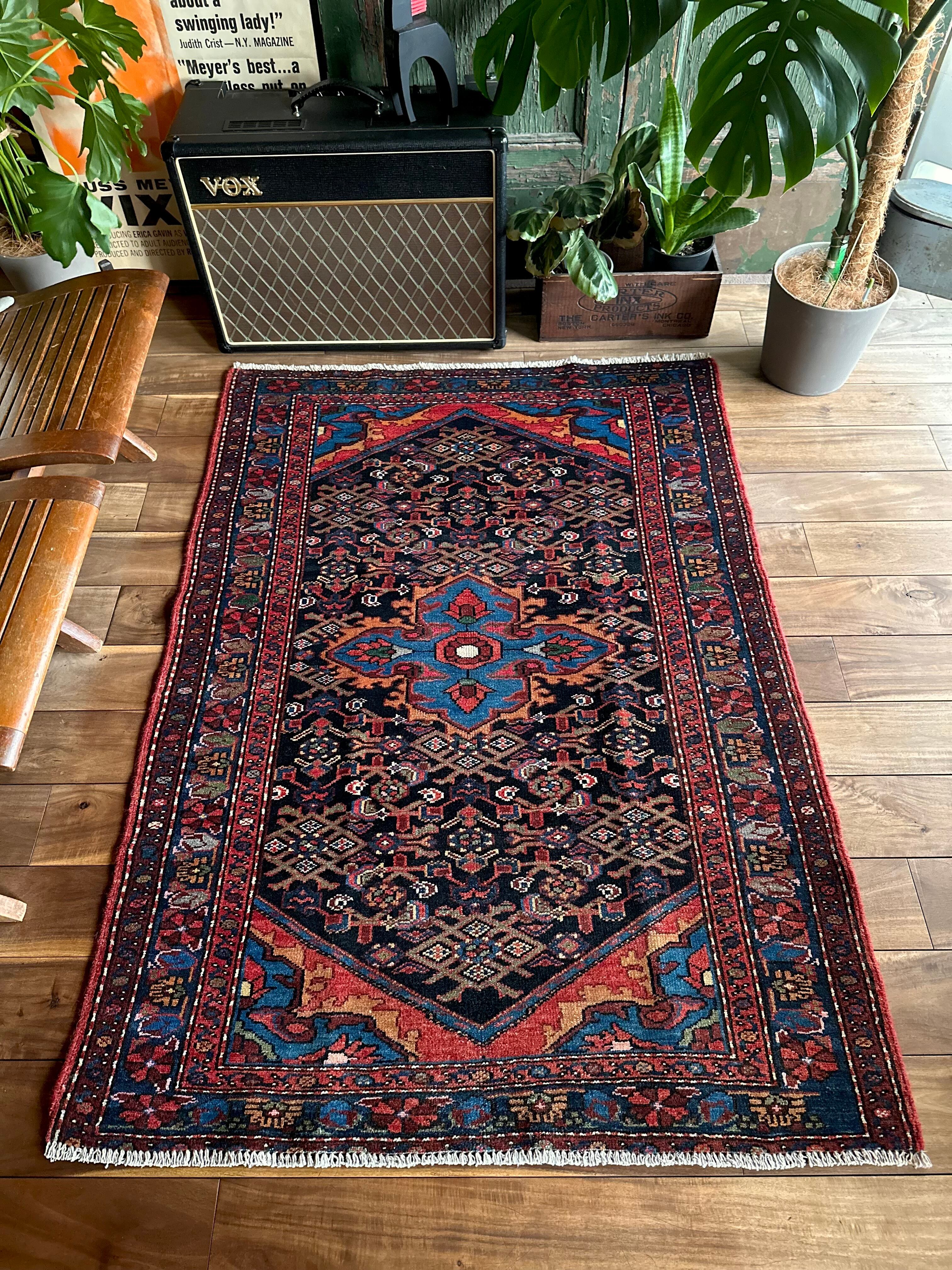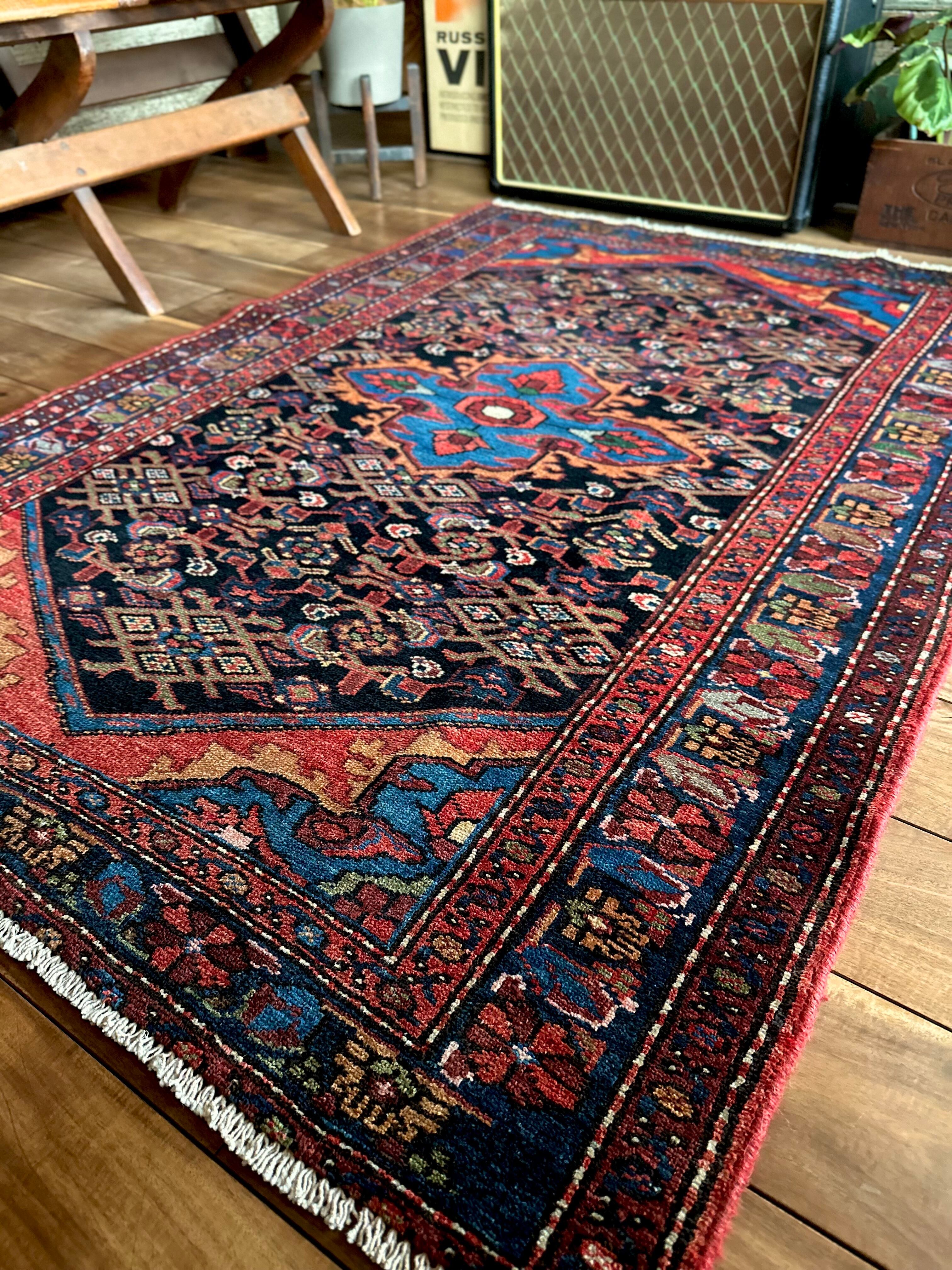 ブラックのフィールドをベースに鮮やかブルーが映える極彩色な見た目で、茜色にオレンジがインパクトを与えるこちらは、イラン北西部に位置するハマダン近郊のホセイナバードという街で手織りされたペルシャ絨毯になります。