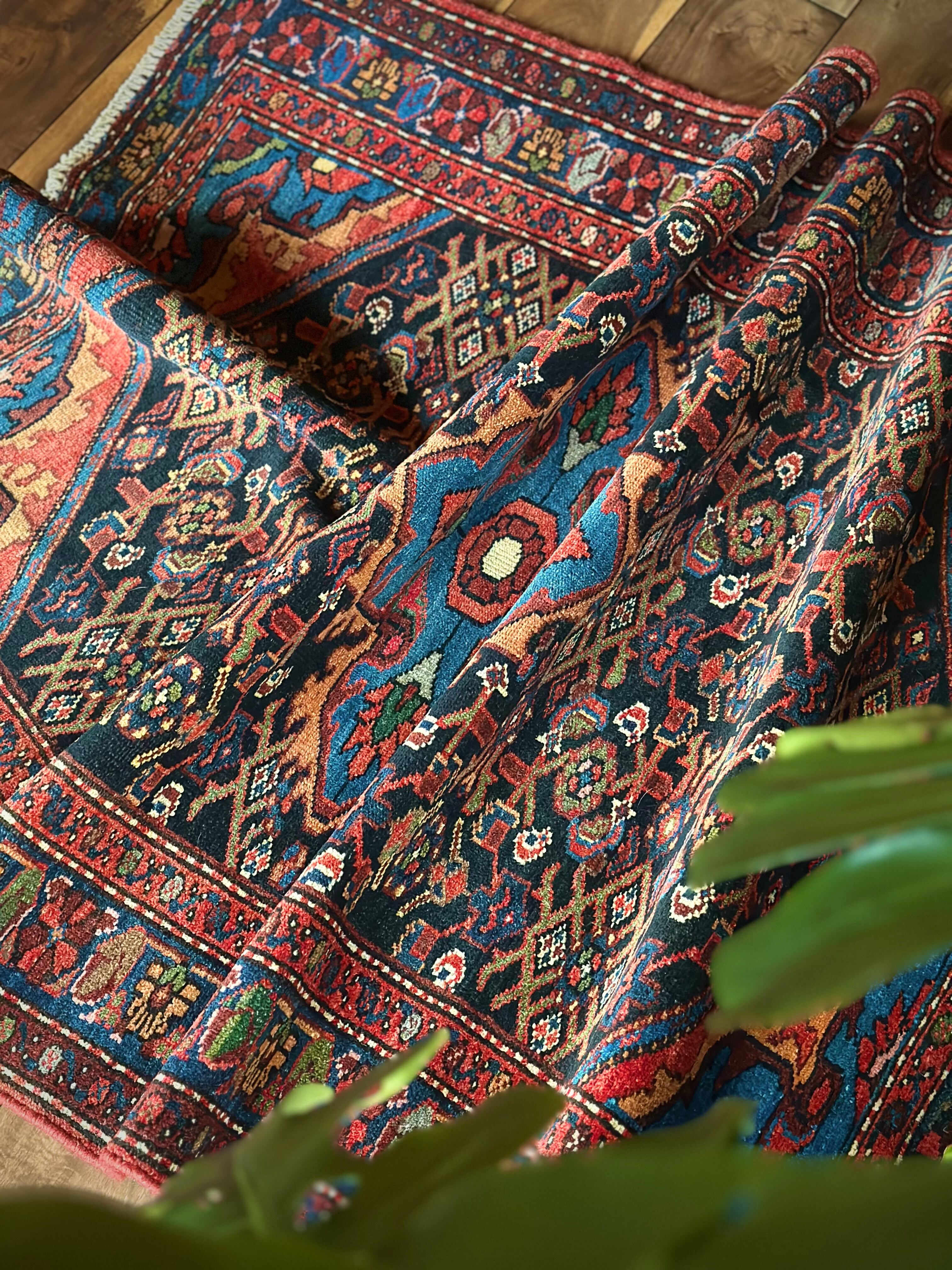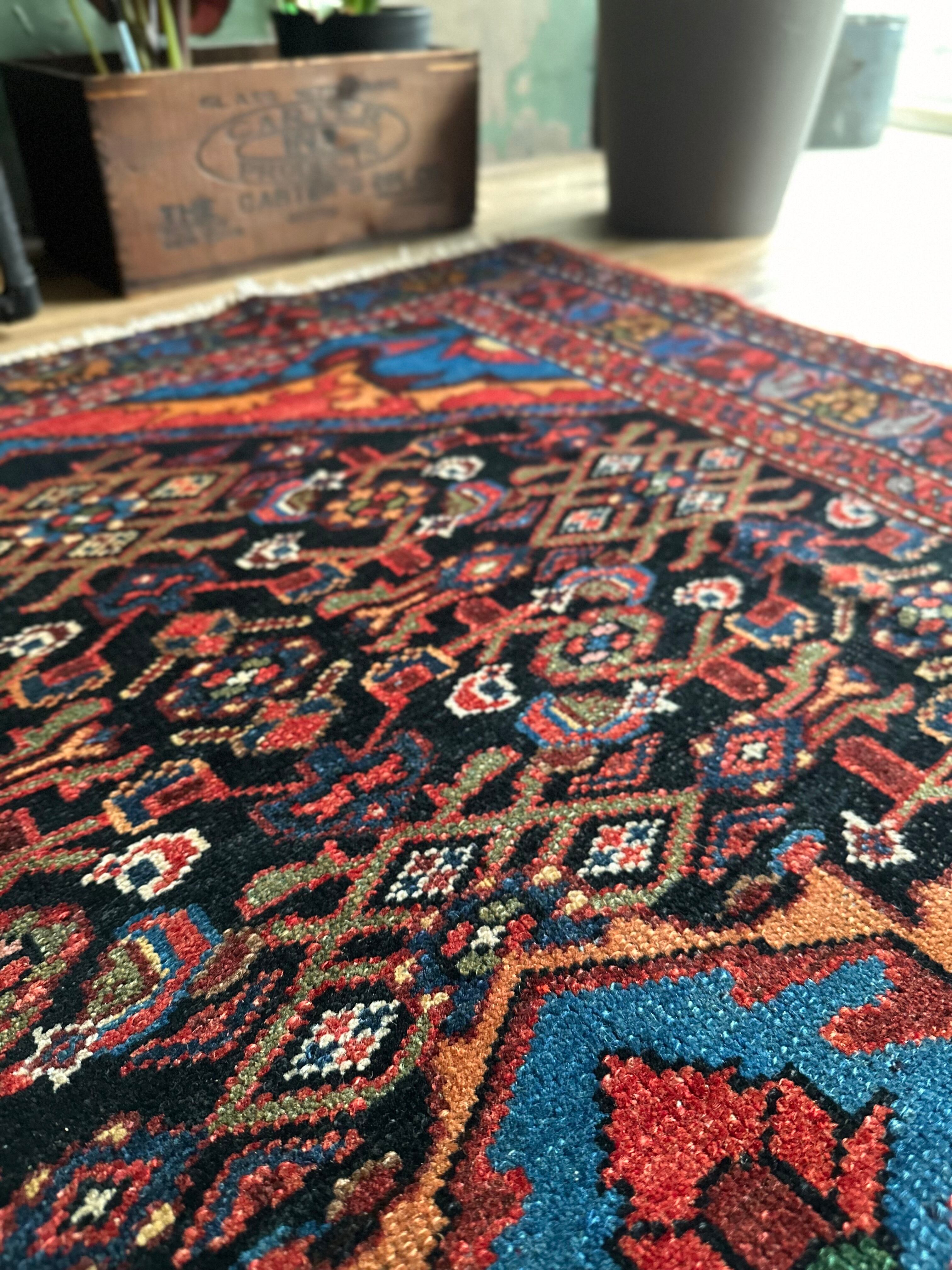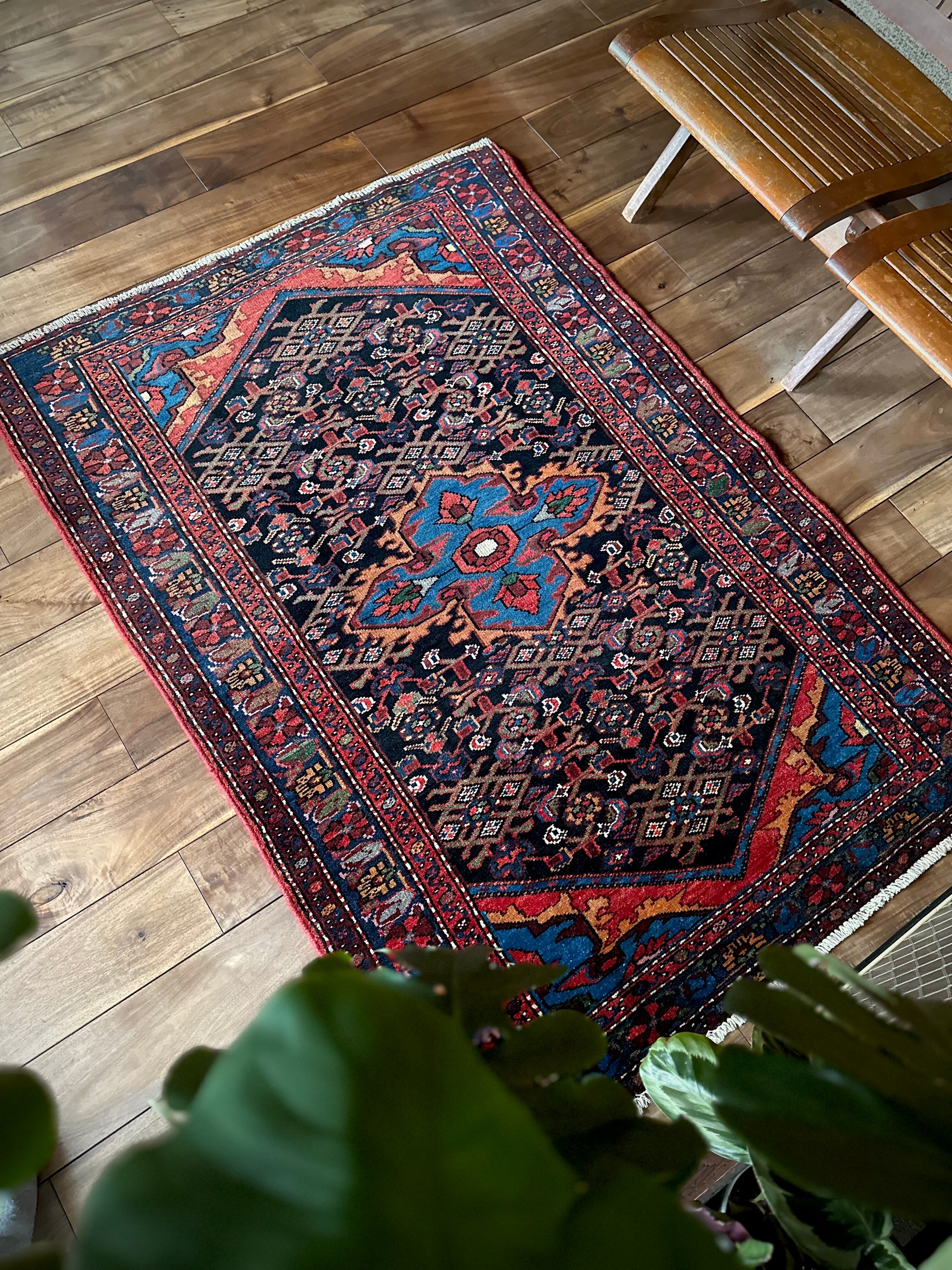ブラックのフィールドをベースに鮮やかブルーが映える極彩色な見た目で、茜色にオレンジがインパクトを与えるこちらは、イラン北西部に位置するハマダン近郊のホセイナバードという街で手織りされたペルシャ絨毯になります。