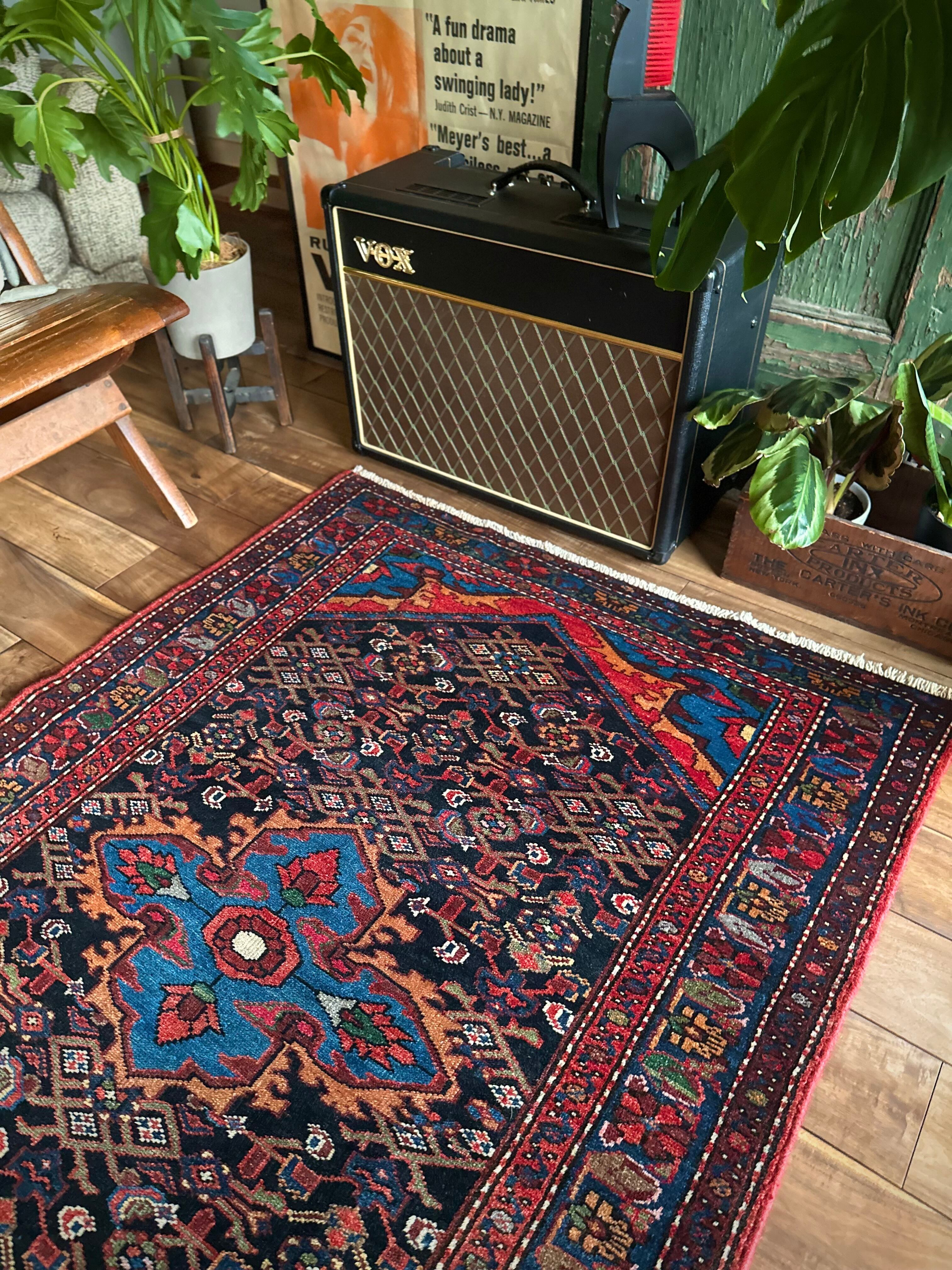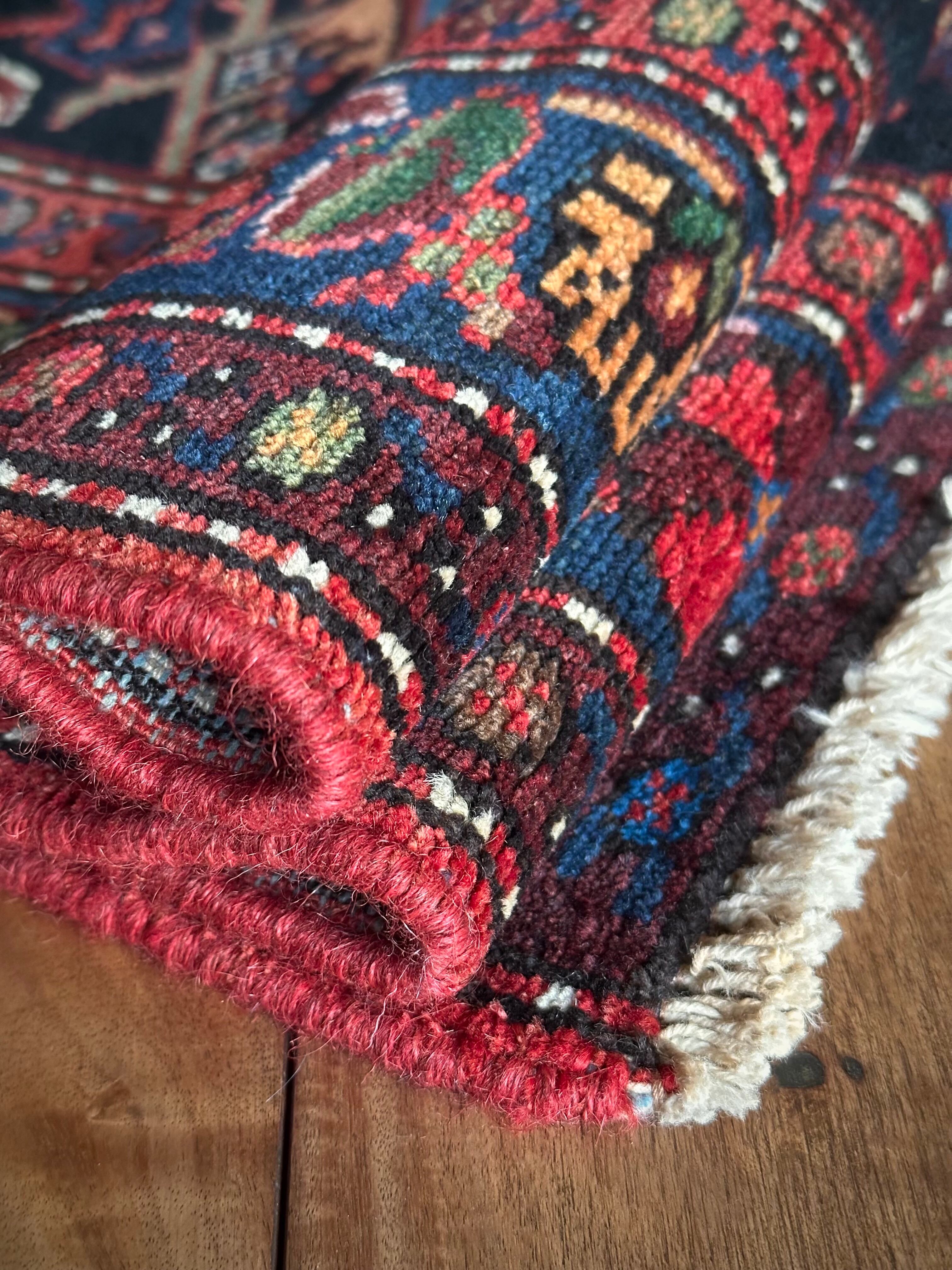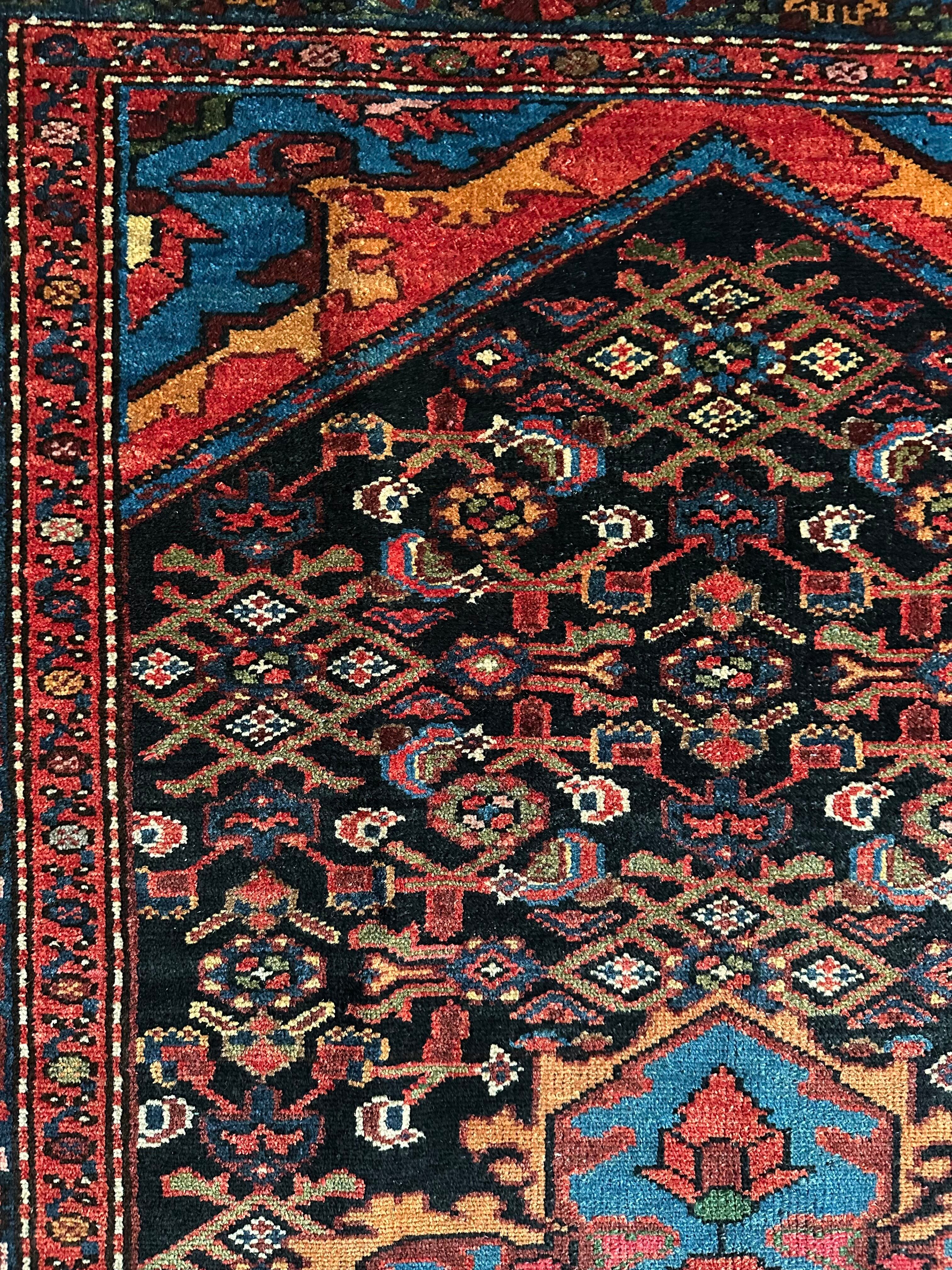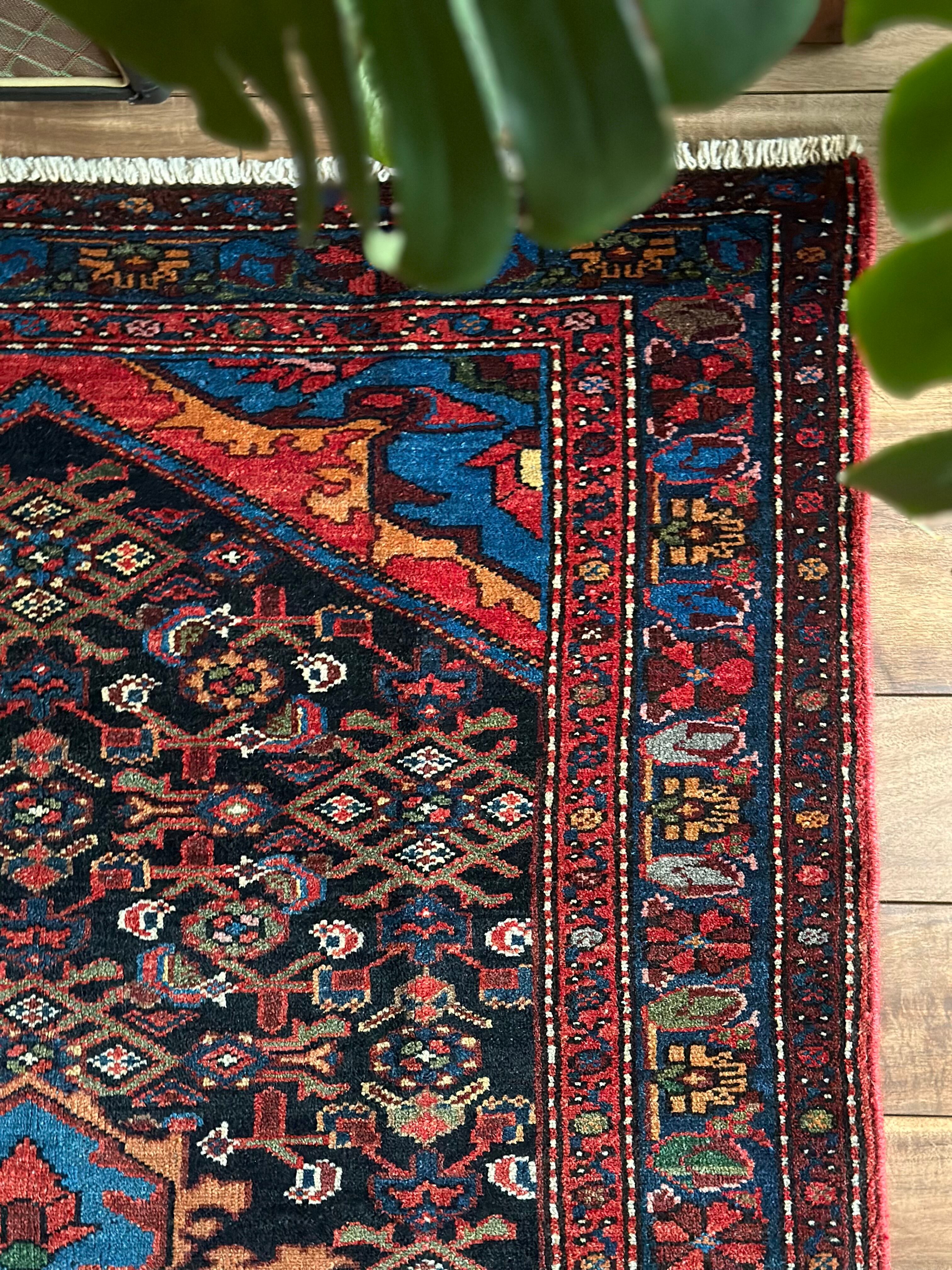 ブラックのフィールドをベースに鮮やかブルーが映える極彩色な見た目で、茜色にオレンジがインパクトを与えるこちらは、イラン北西部に位置するハマダン近郊のホセイナバードという街で手織りされたペルシャ絨毯になります。