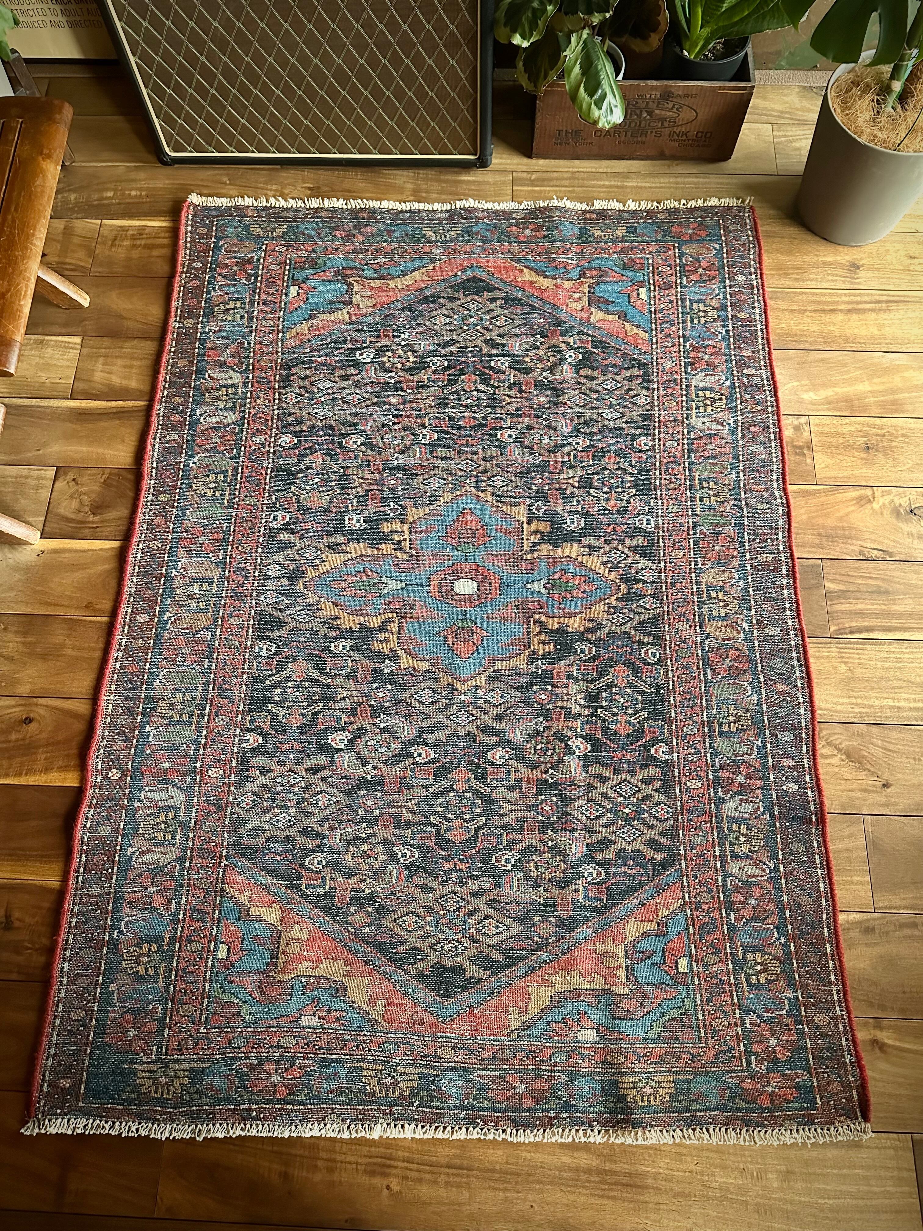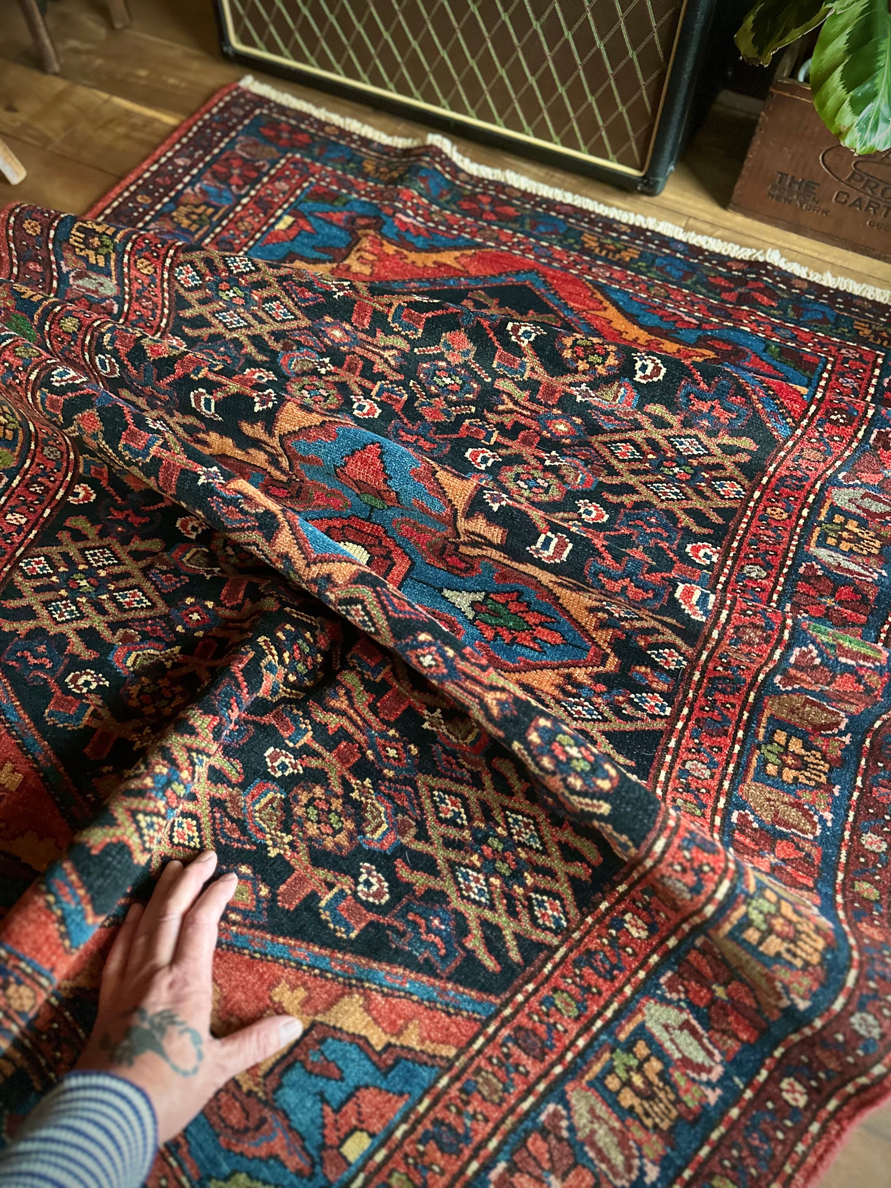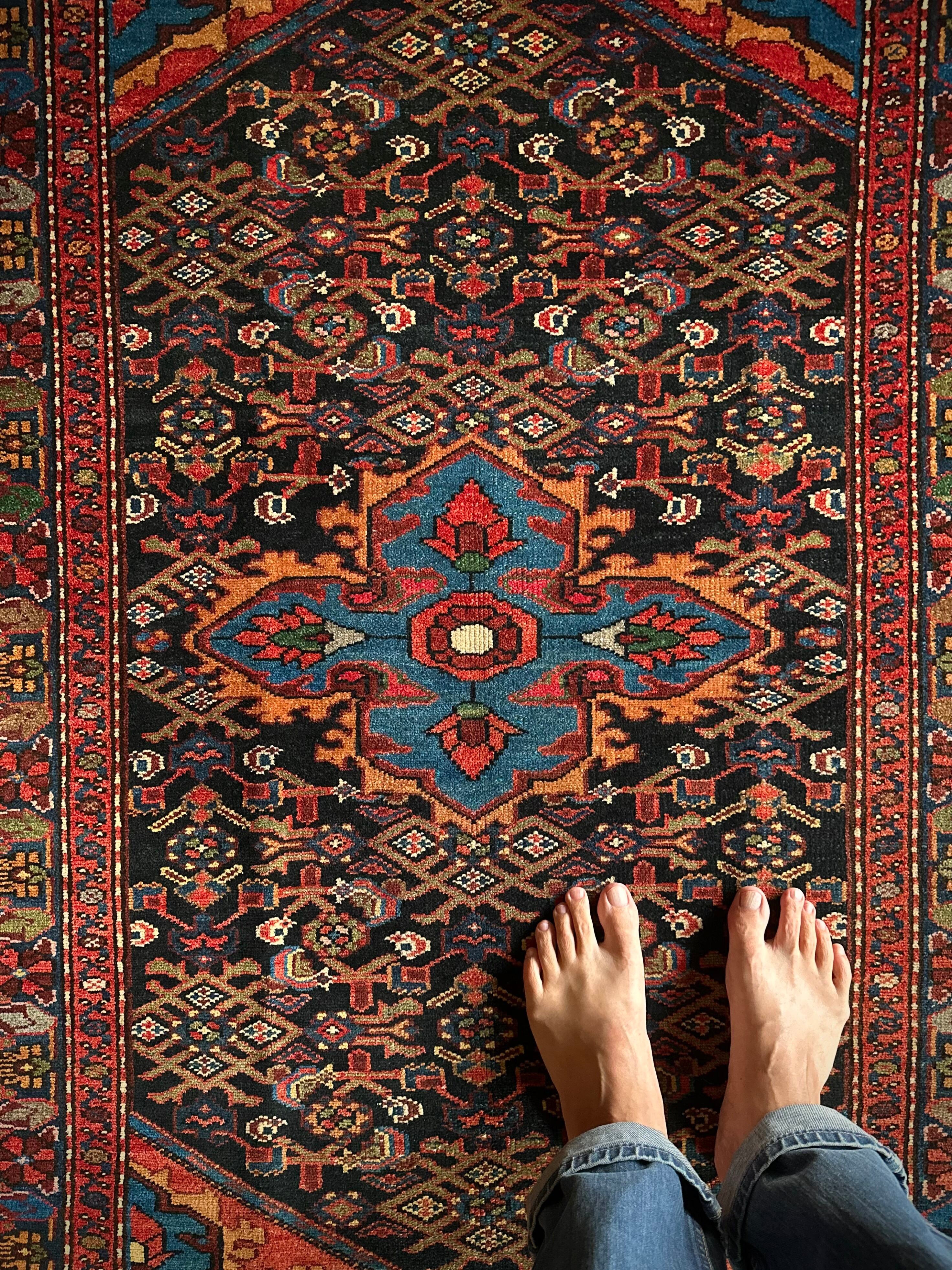 この地域独特のヘラティ紋様にメダリオンのデザインが特徴的ですが、なんと言ってもこの色彩感覚のずば抜けた感じがシビれるでしょうか。ハマダン産らしいガシっとした丈夫な織りで、パイルの毛足は元からほぼありませんが、サラッとした肌触りにチクチク感はありませんのでご安心ください。