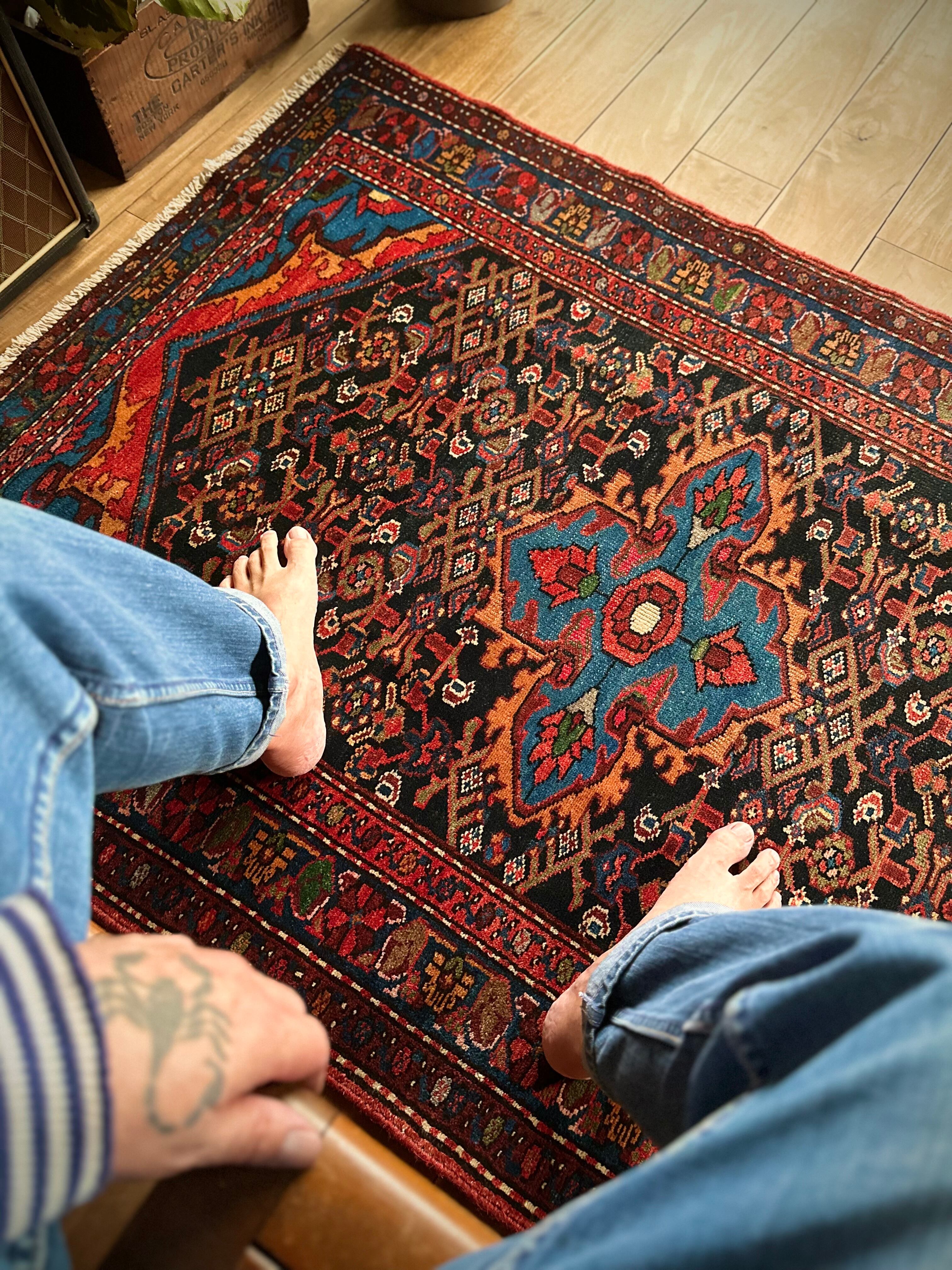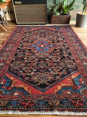 経年としてはそれなりに古い60年物のヴィンテージラグらしく、経年劣化によりヤレた感じはありますが、特に気になるダメージにリペア箇所は見当たらないナイスなコンディションで、大きさ的には2人掛けソファ前やチェスト前など、個人的には写真のようにギターアンプ前で激しくプレイしたい次第です。