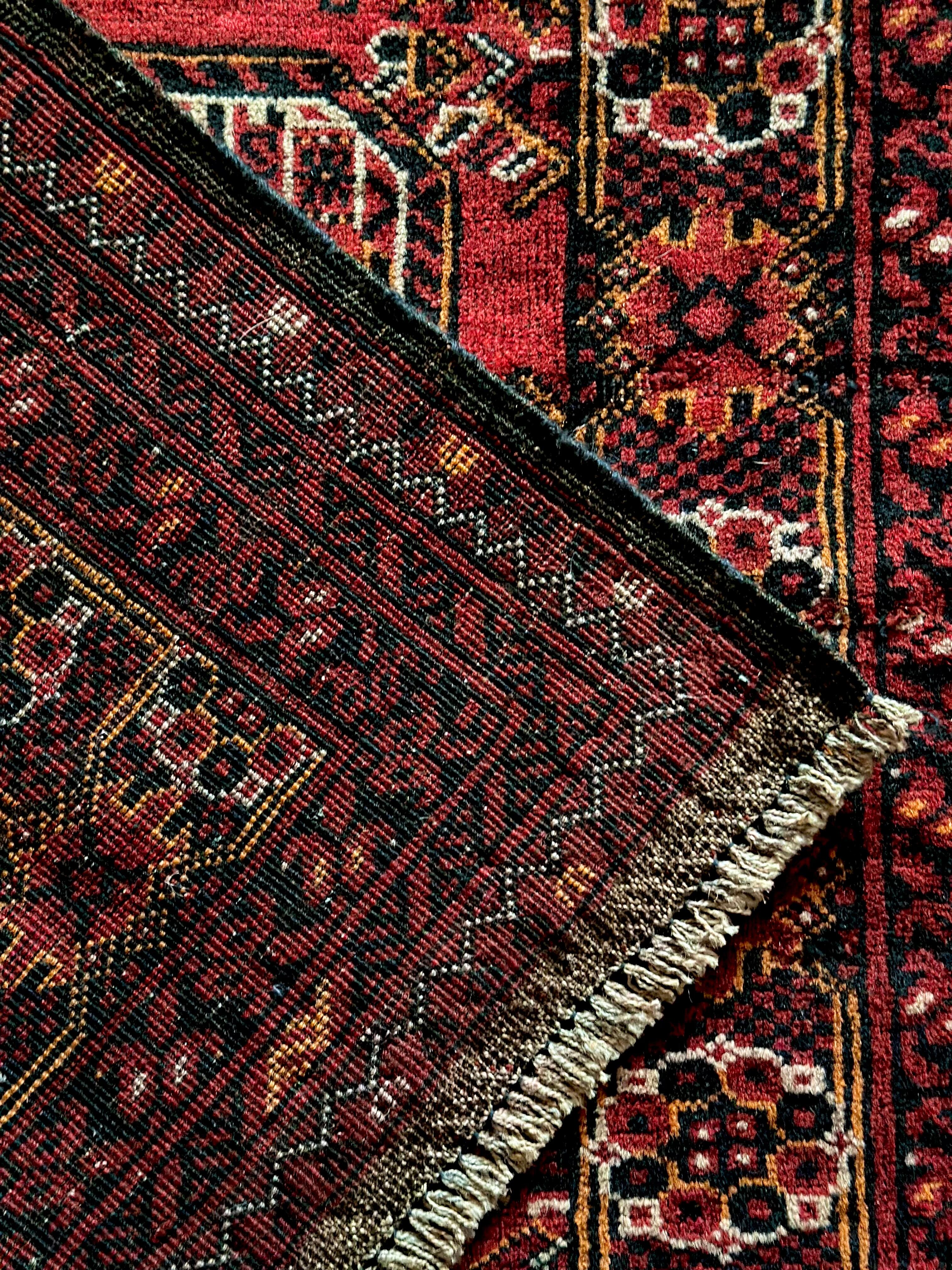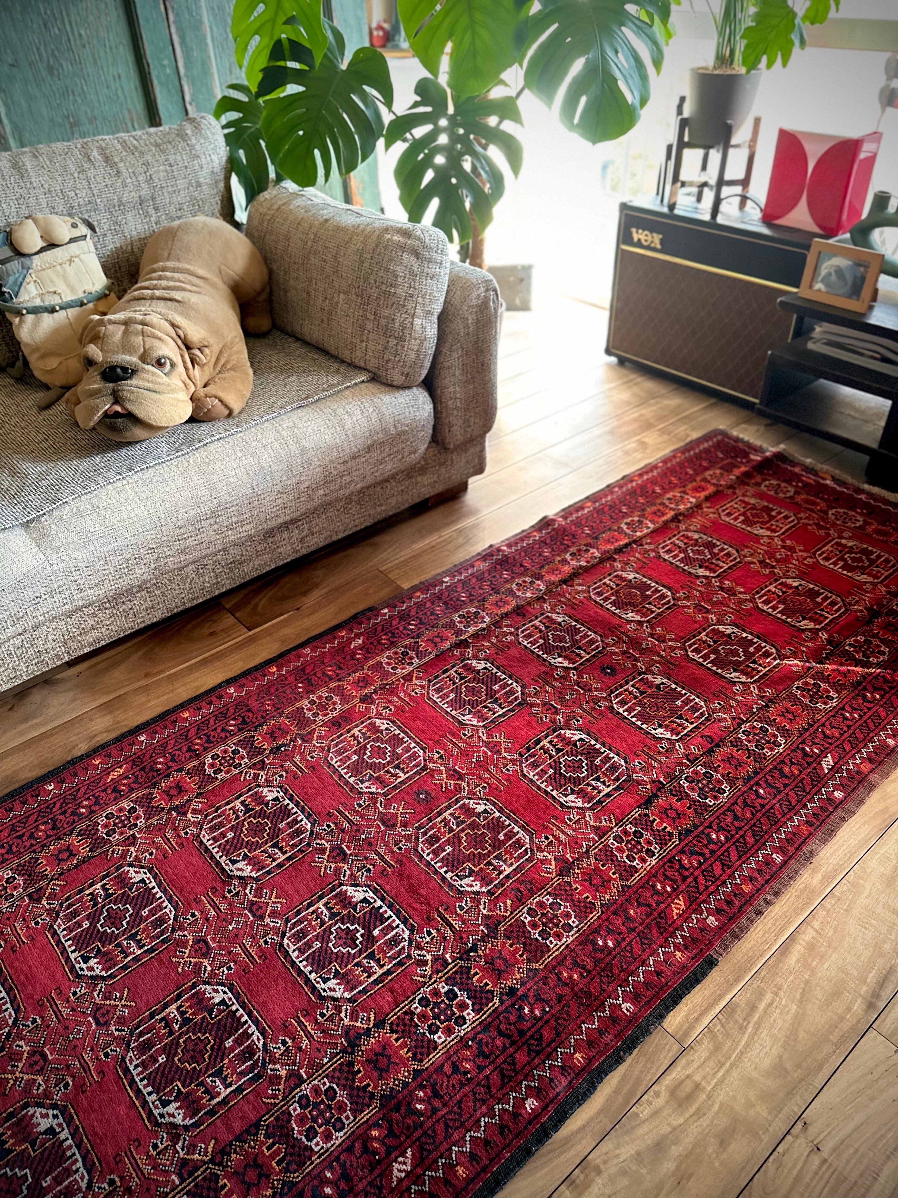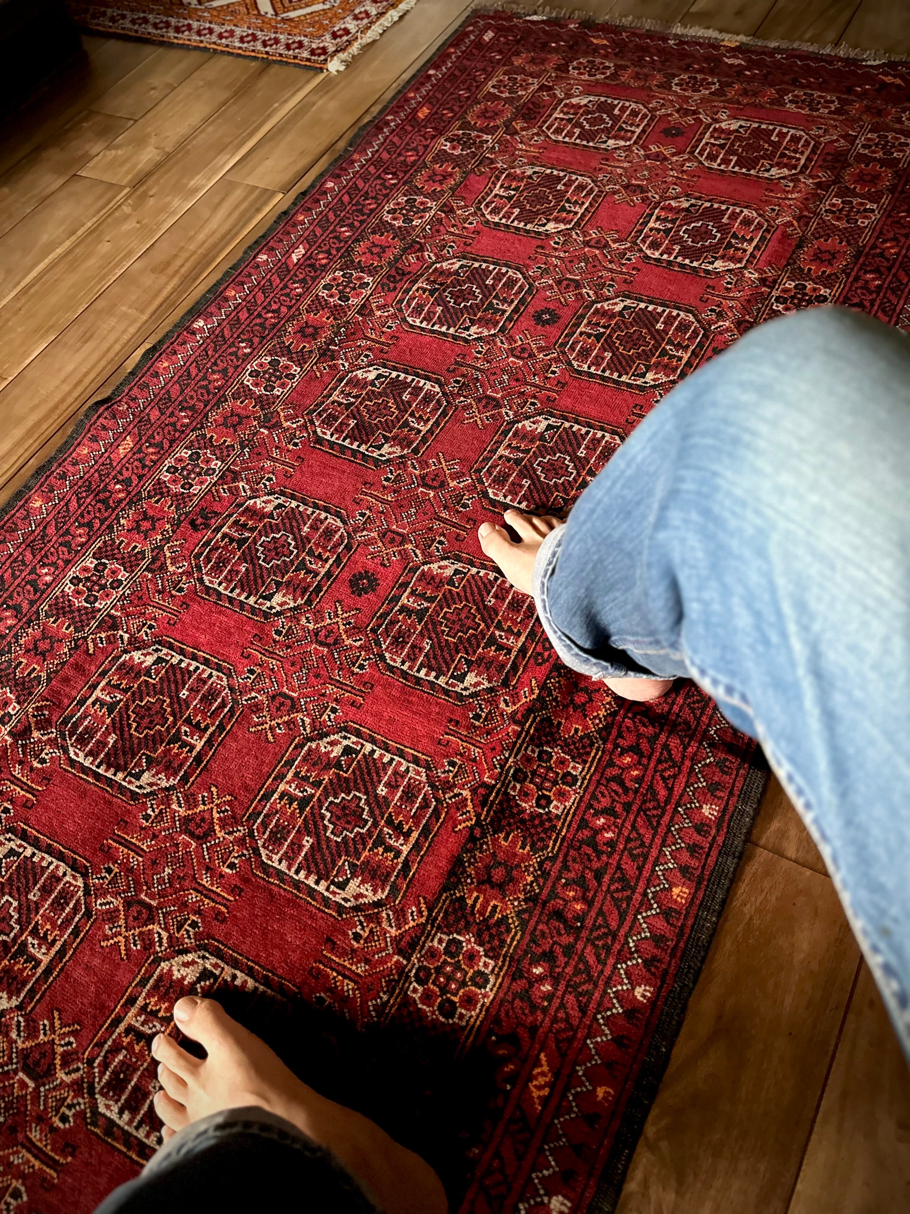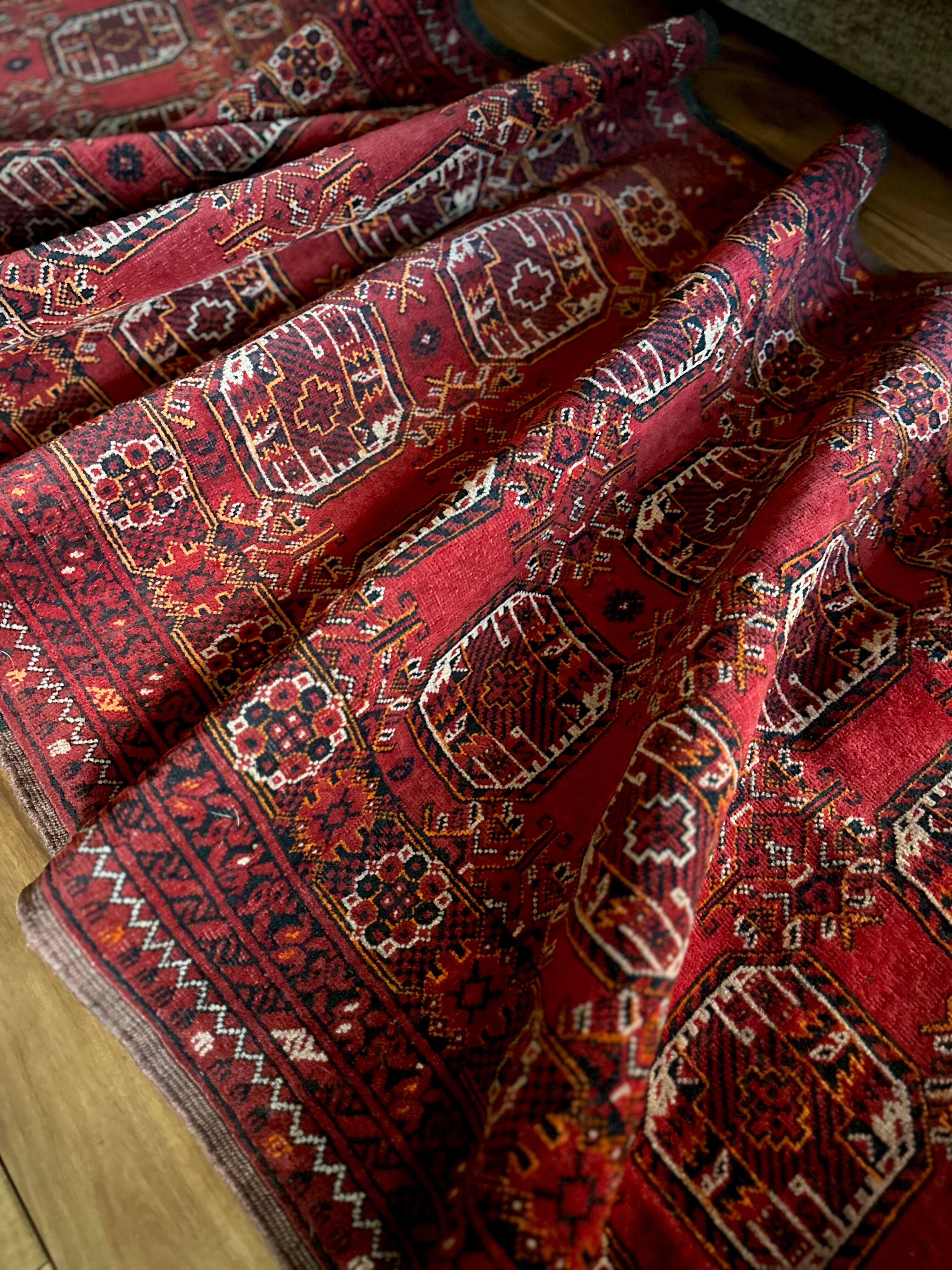 深みのあるボルドーをベースに整然と並んだギュルの連続紋様がトルクメンらしい、アフガニスタン北部で織られた"Waziri Family”という支族のトライバルラグで、ガシッとした質感にヴィンテージラグらしい雰囲気がなんともかっこいい個人的にも好きな1枚になります。