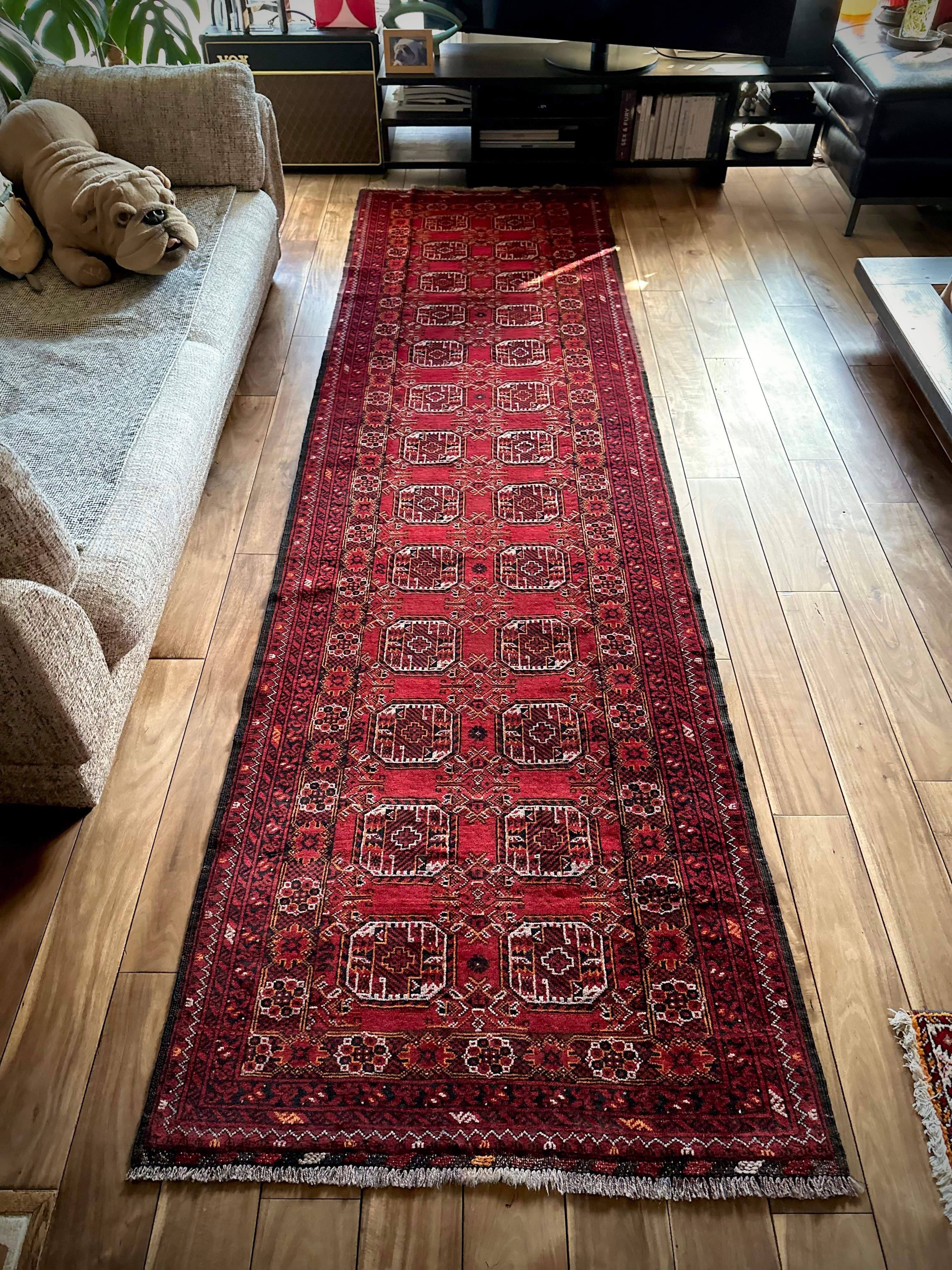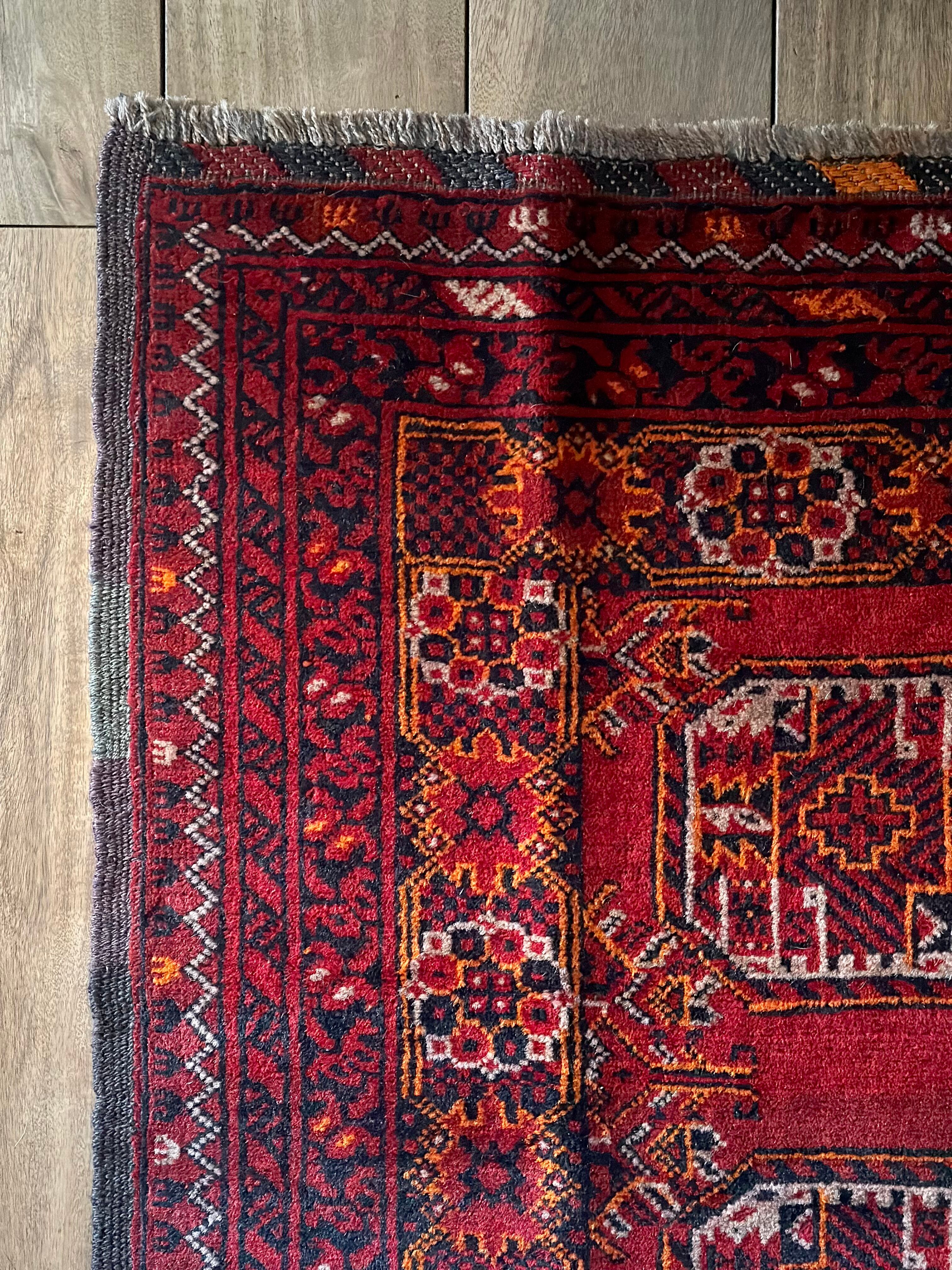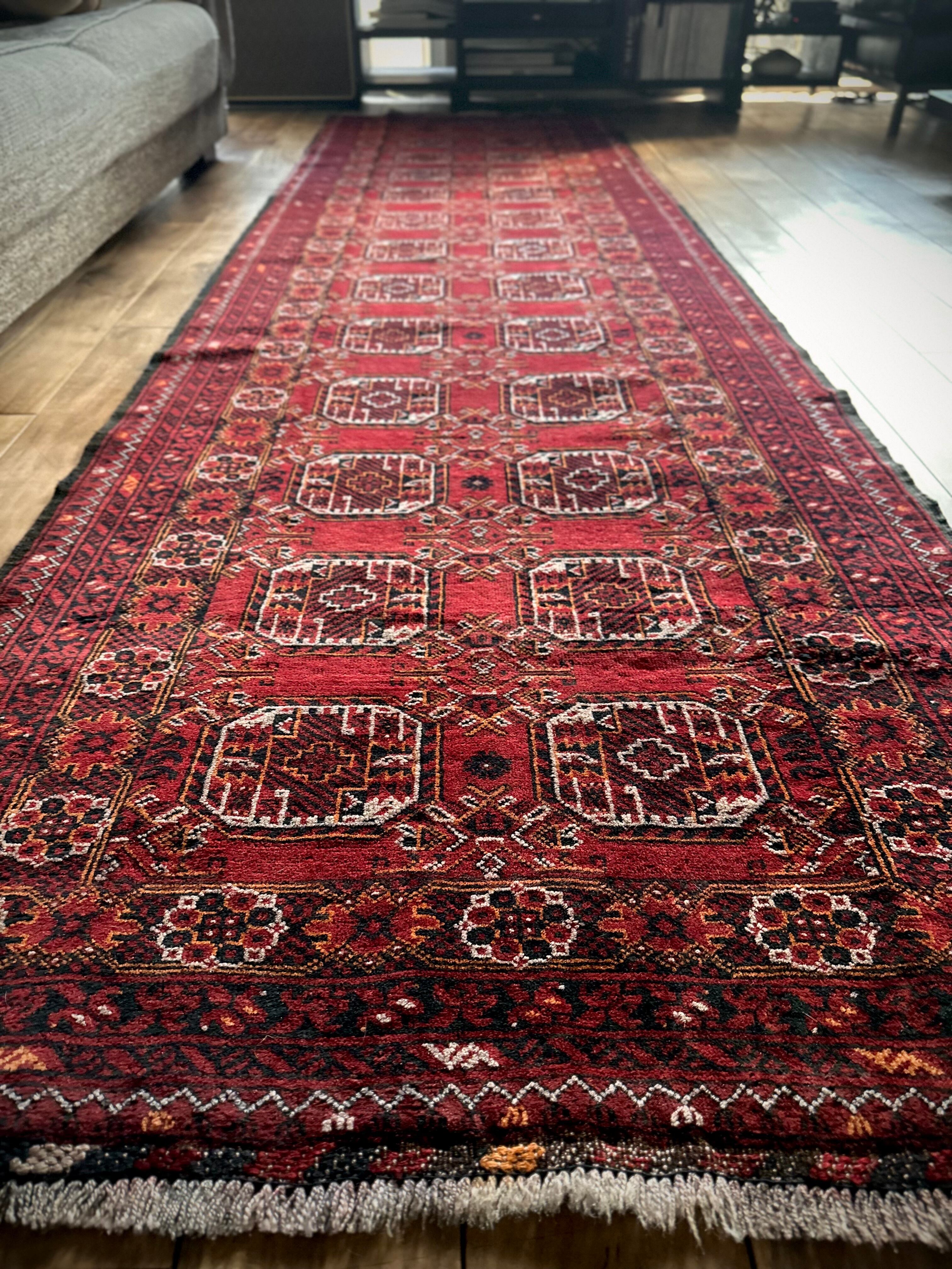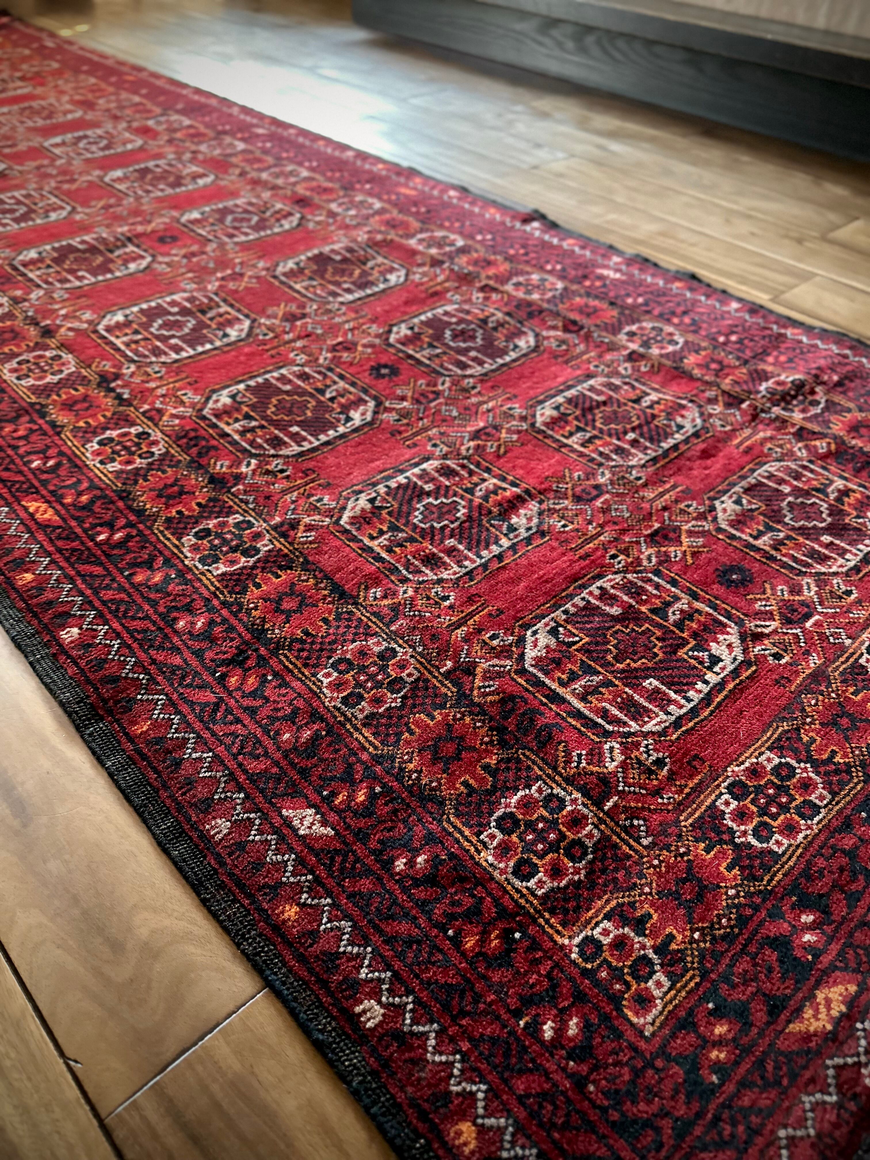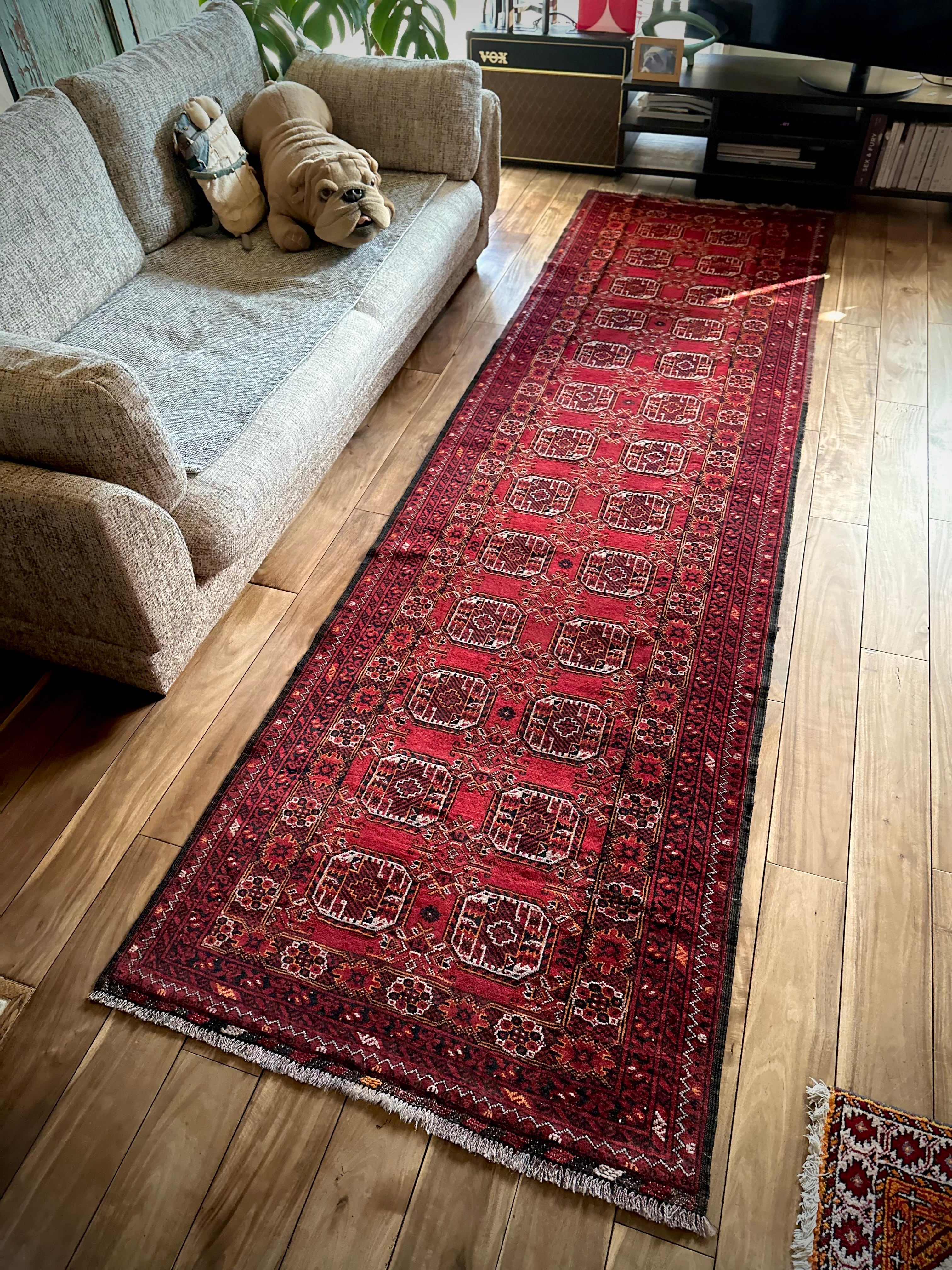 深みのあるボルドーをベースに整然と並んだギュルの連続紋様がトルクメンらしい、アフガニスタン北部で織られた"Waziri Family”という支族のトライバルラグで、ガシッとした質感にヴィンテージラグらしい雰囲気がなんともかっこいい個人的にも好きな1枚になります。