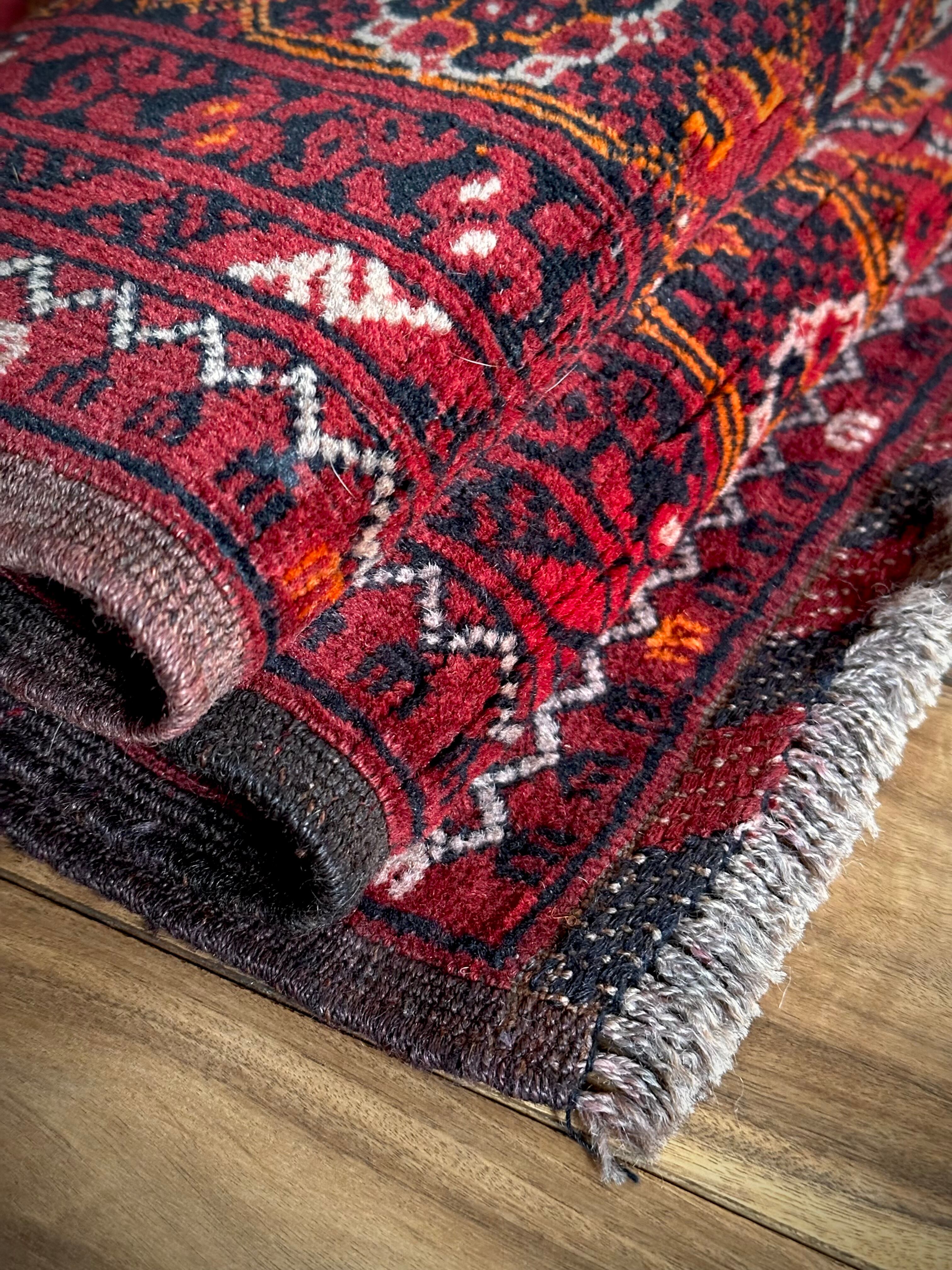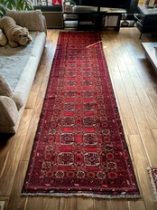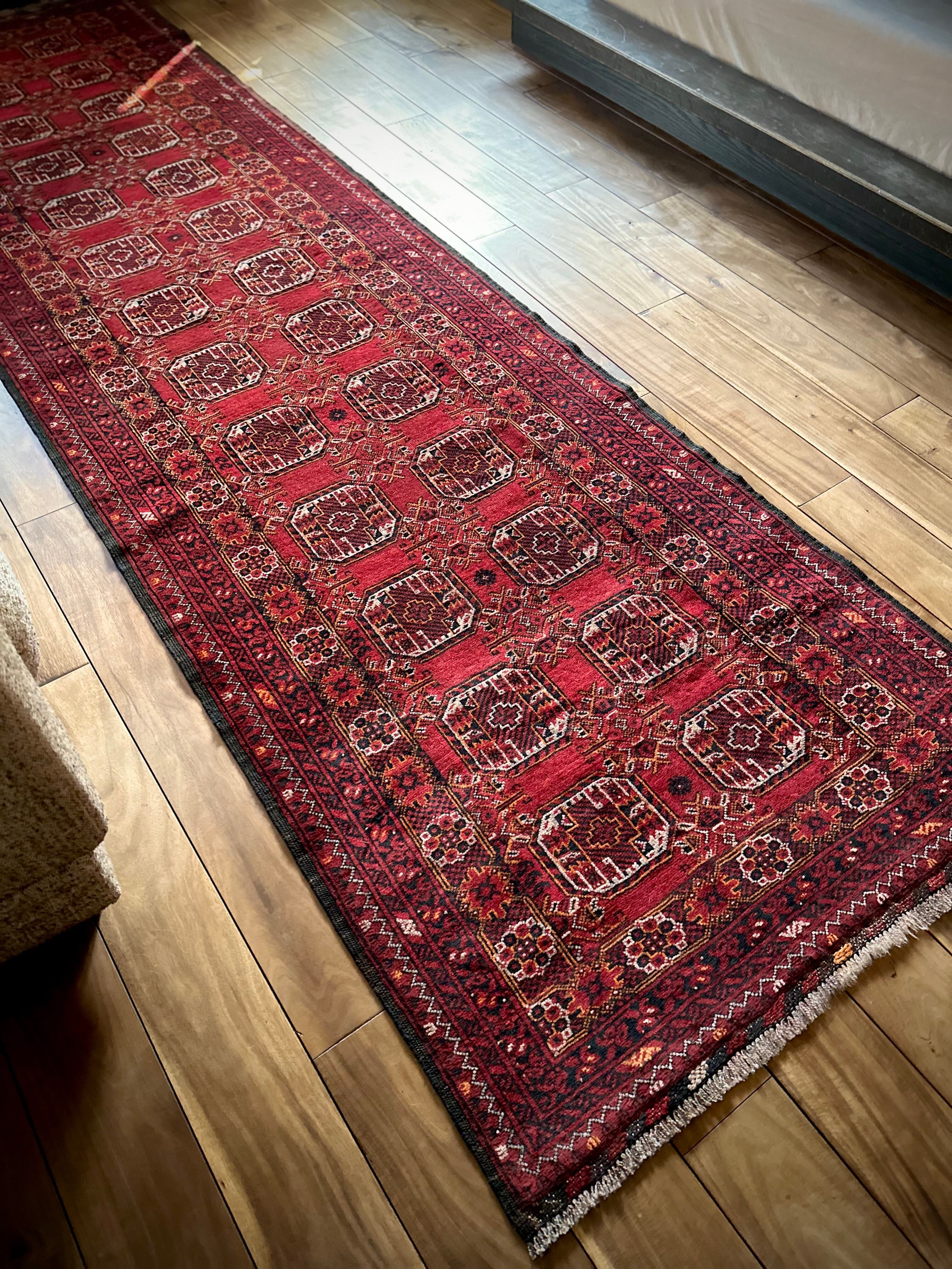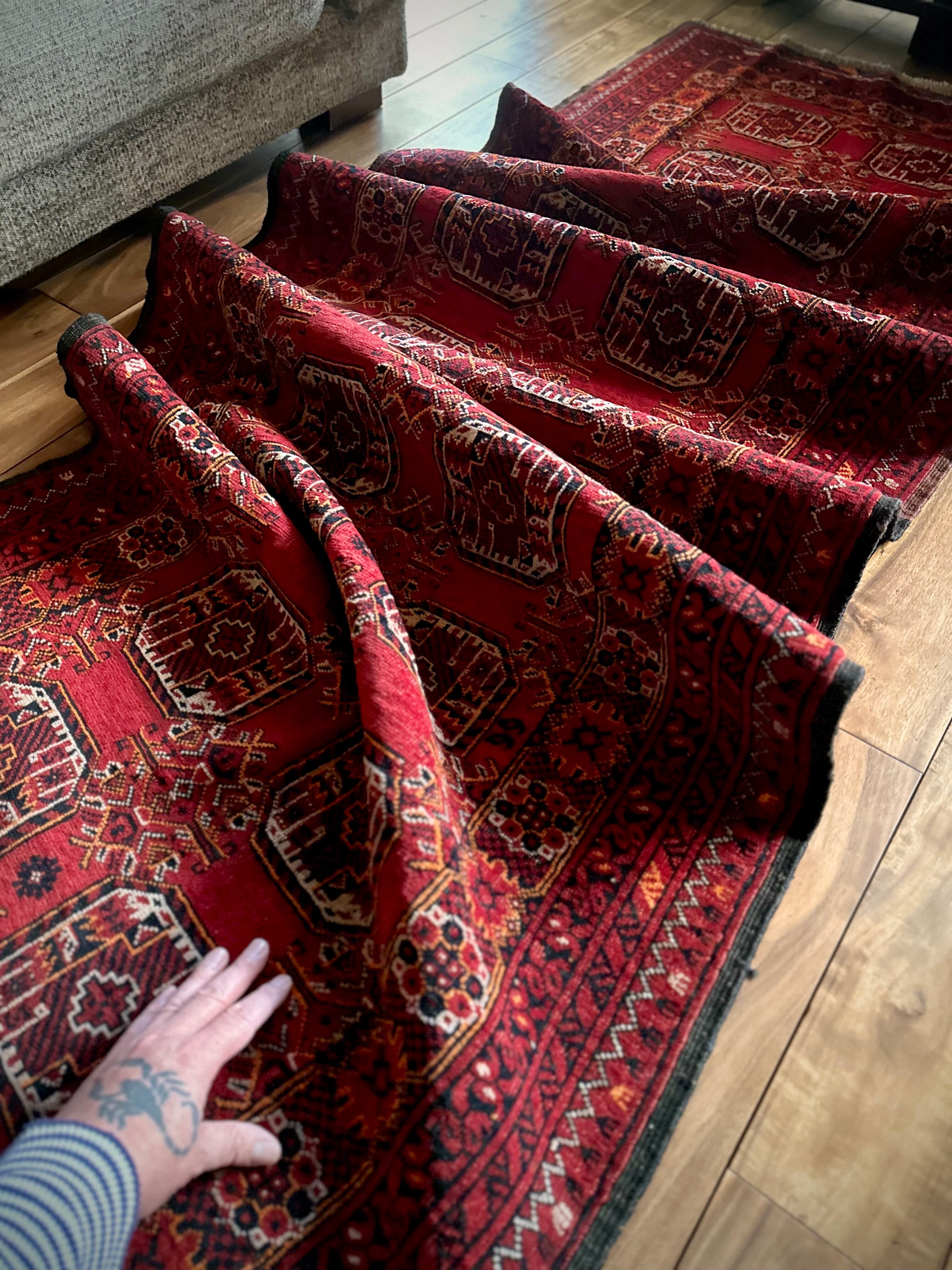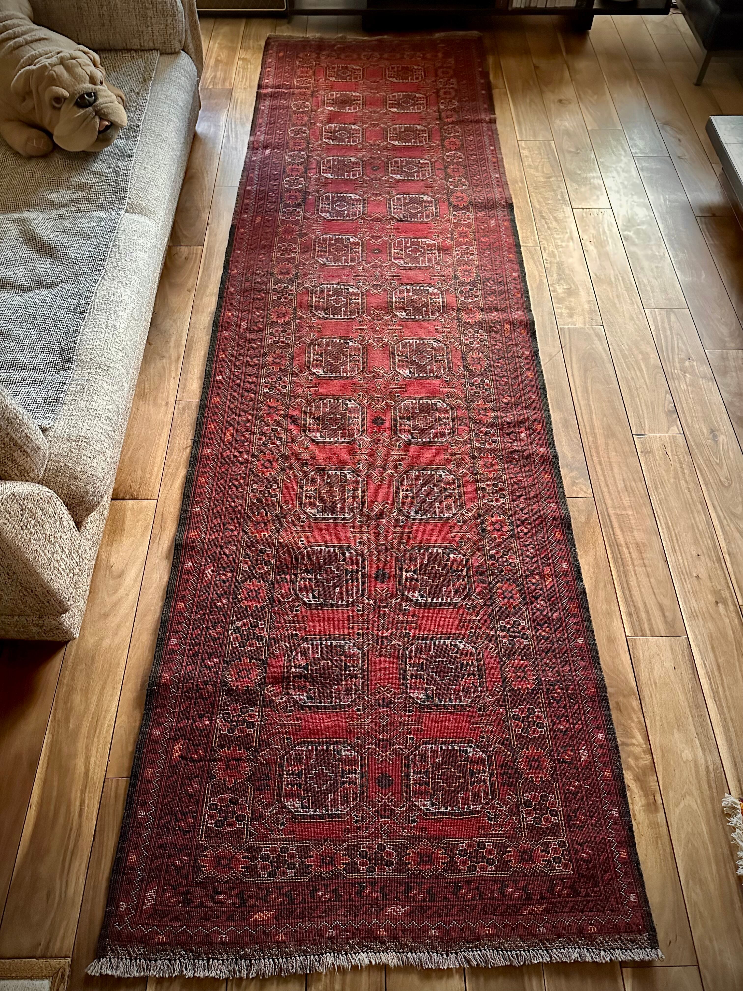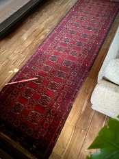 深みのあるボルドーをベースに整然と並んだギュルの連続紋様がトルクメンらしい、アフガニスタン北部で織られた"Waziri Family”という支族のトライバルラグで、ガシッとした質感にヴィンテージラグらしい雰囲気がなんともかっこいい個人的にも好きな1枚になります。