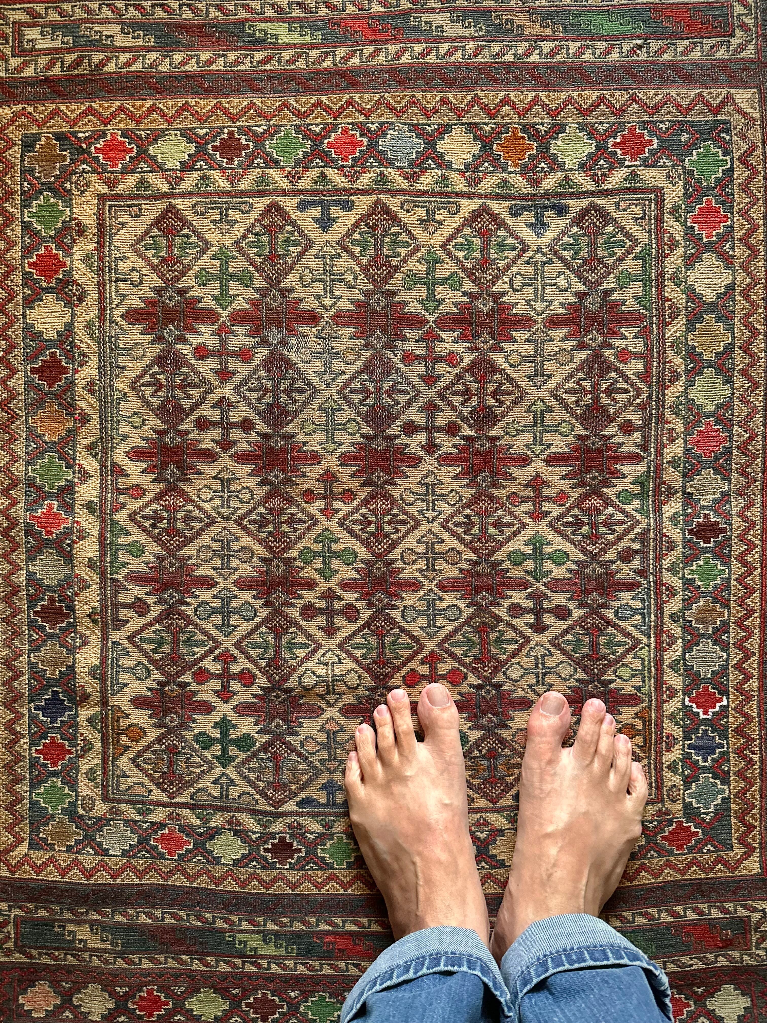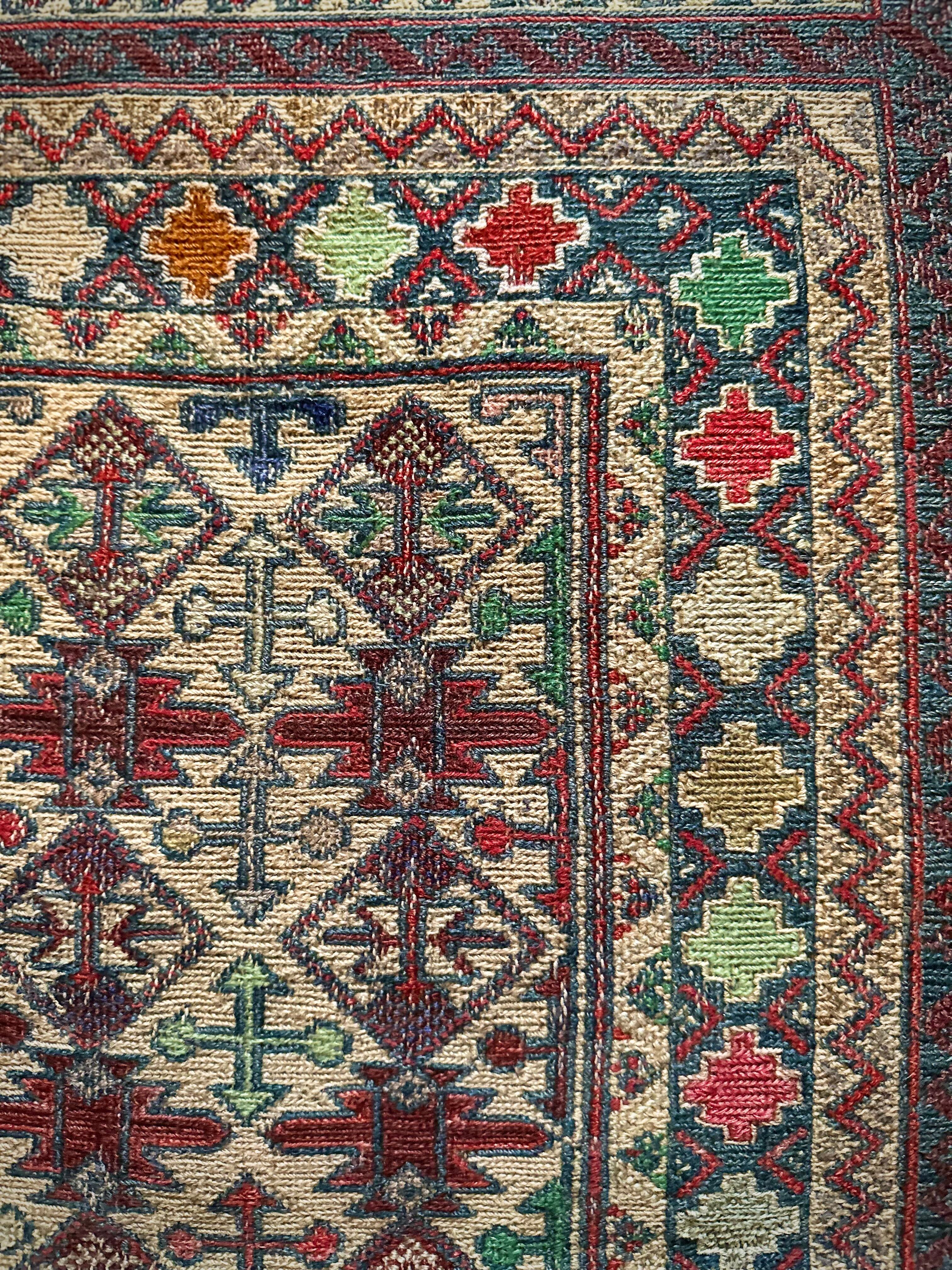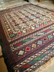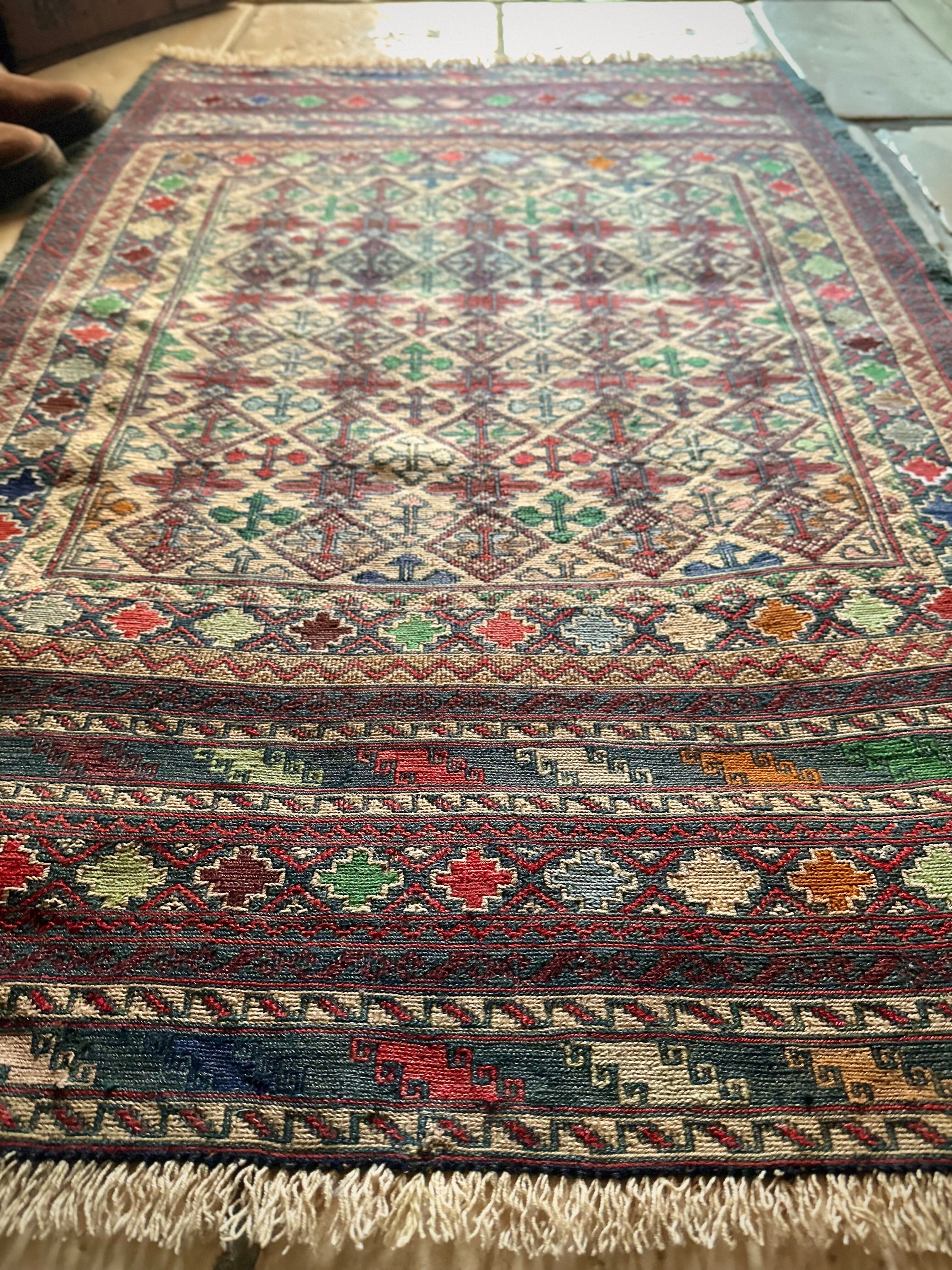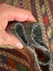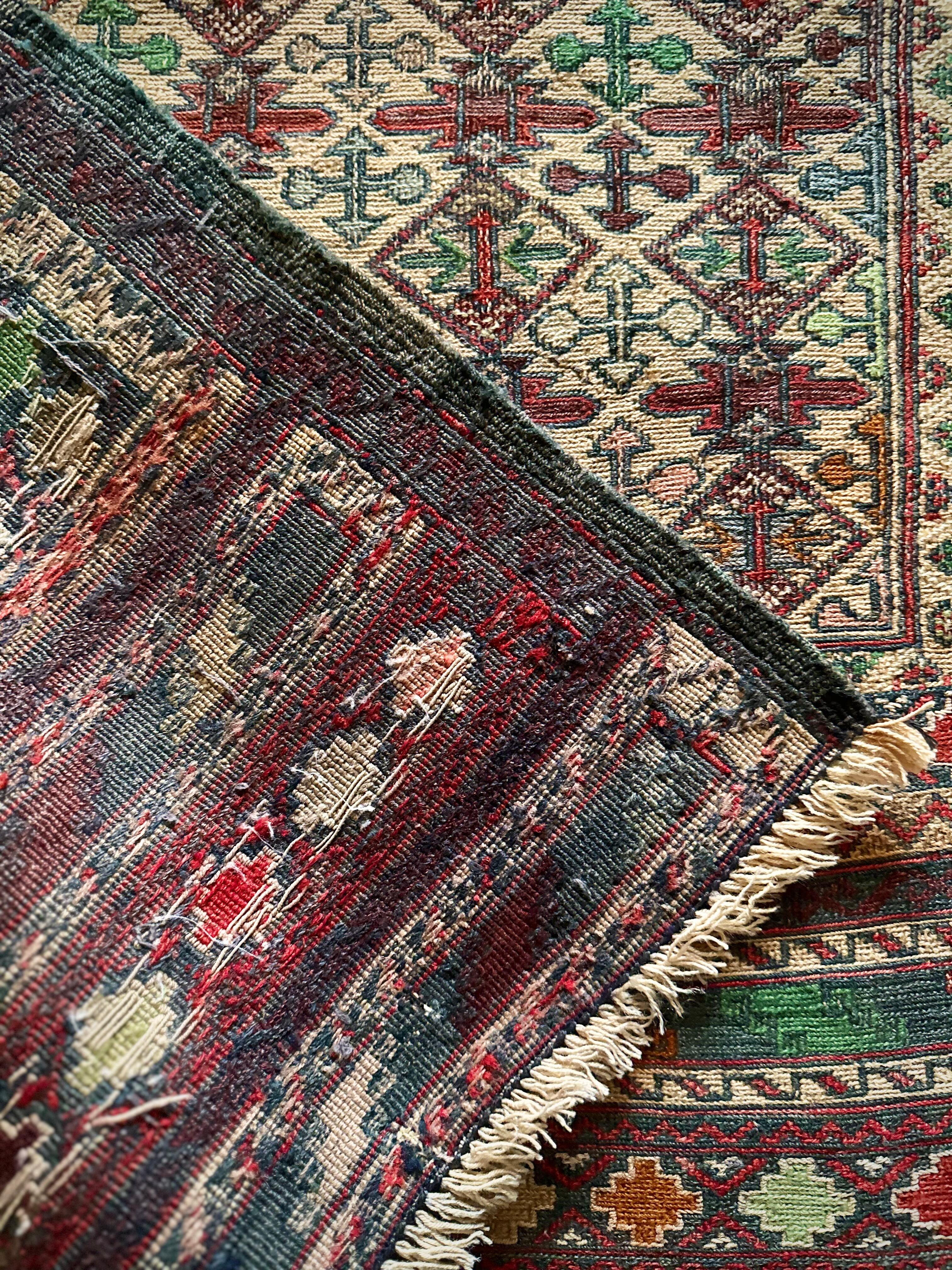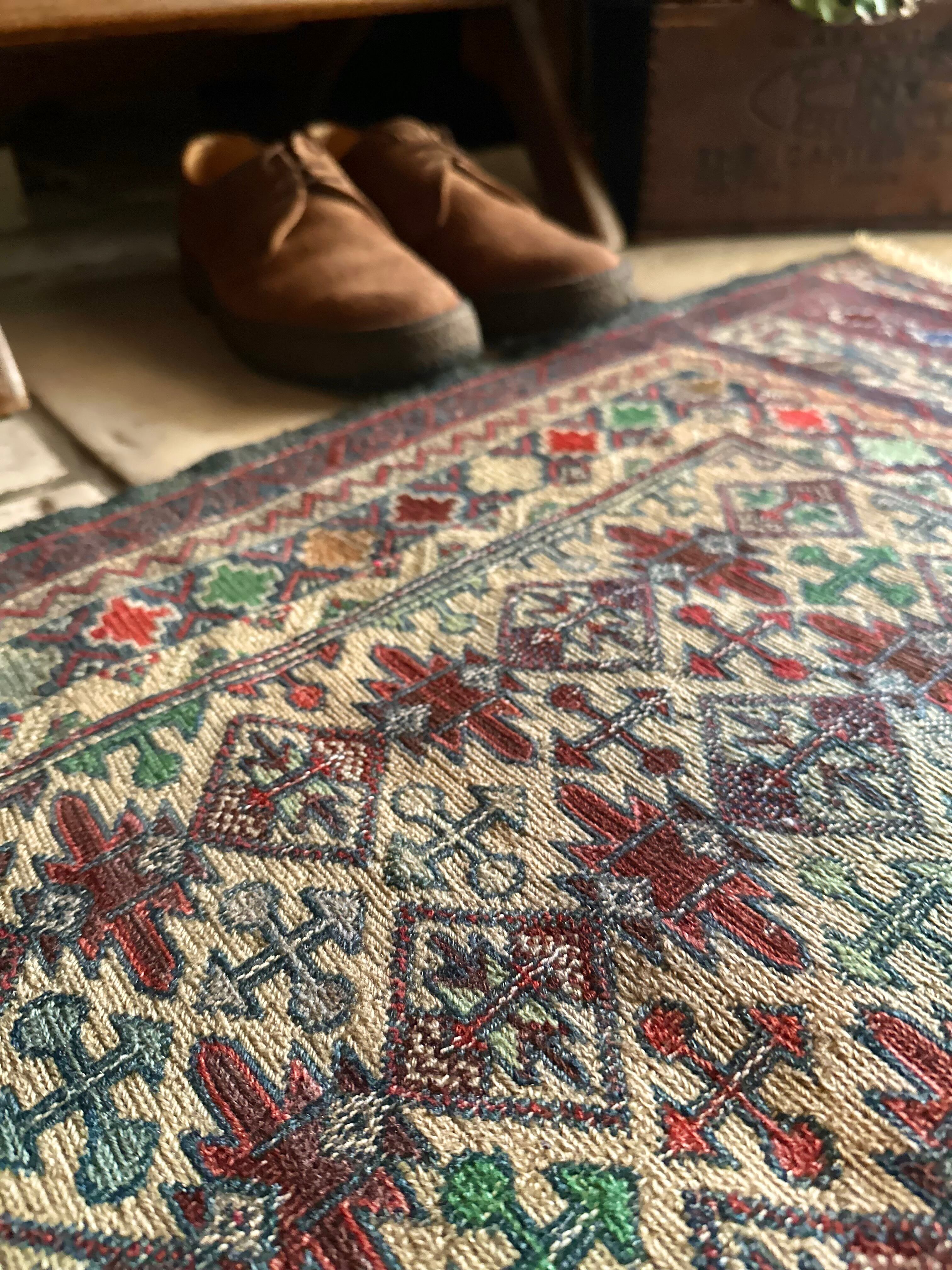 最後にラグそのものに関しては羊毛特有の匂いがあり、採寸は中央付近で計測していますが、手織りならではの歪みによる誤差や水洗いクリーニングによる縮み、また草木染めによる経年劣化の色ムラなどがありますが、それもまたヴィンテージラグの魅力かとご理解ください。
