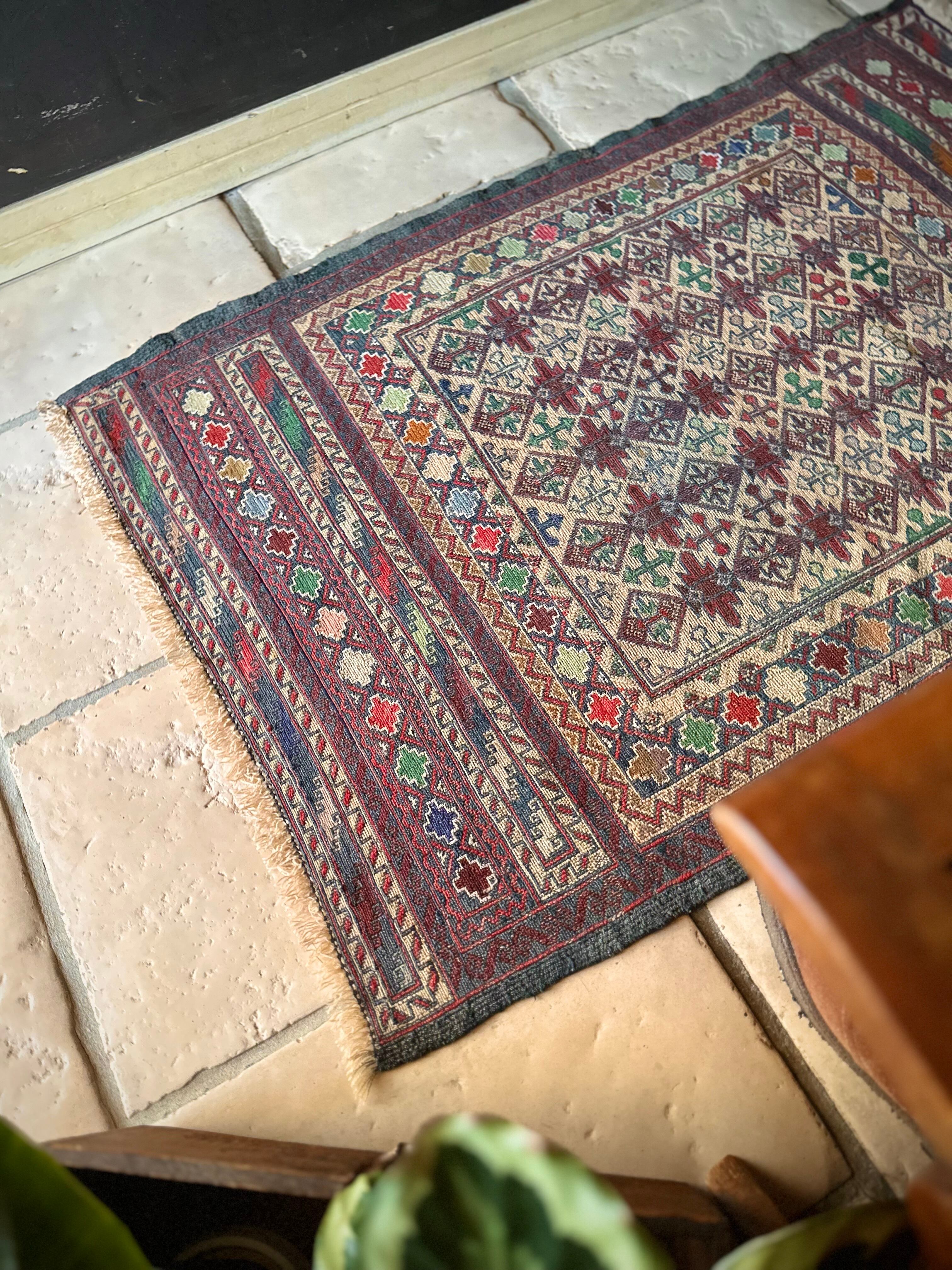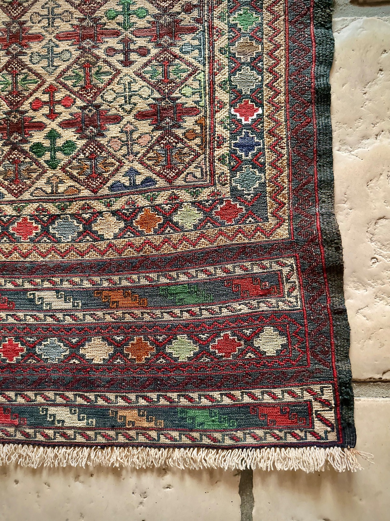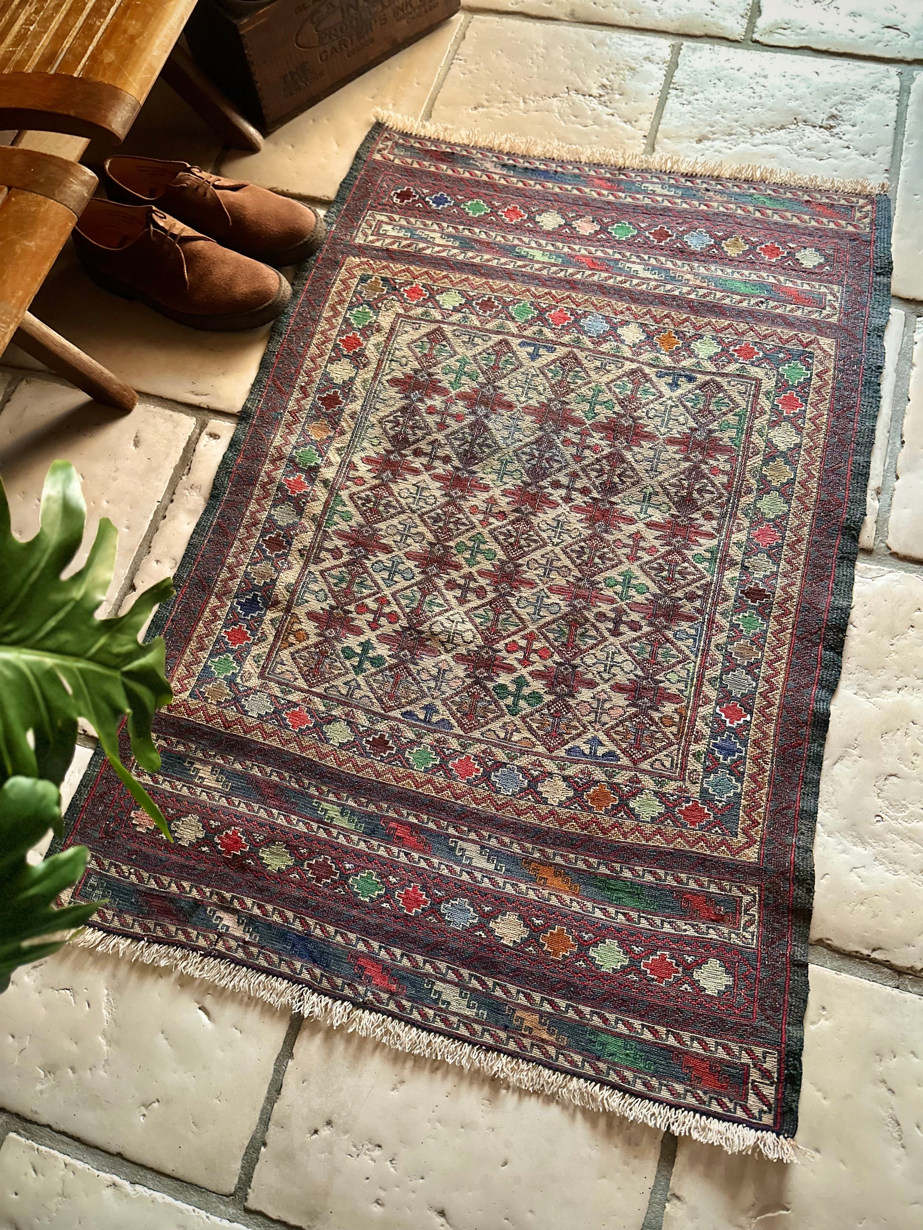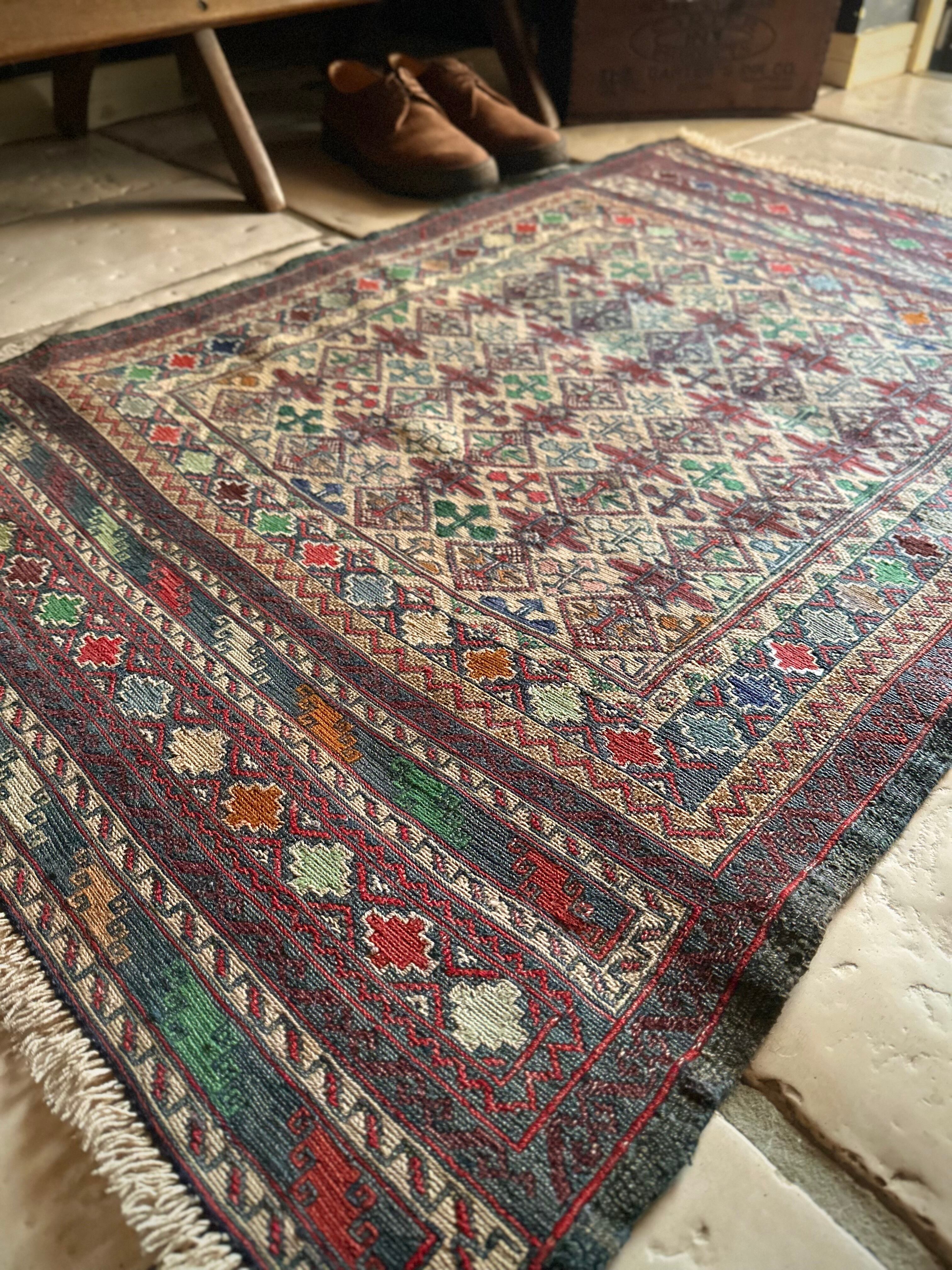 こちらカラフルな色彩感を持ちながらも全体的にはシックな雰囲気に仕上がっている、アフガニスタン西部のヘラート州に居住するバルーチ族のキリムで、通常の平織りの経糸に追加の色糸を絡ませて紋様を描くスマック織りの1枚になります。