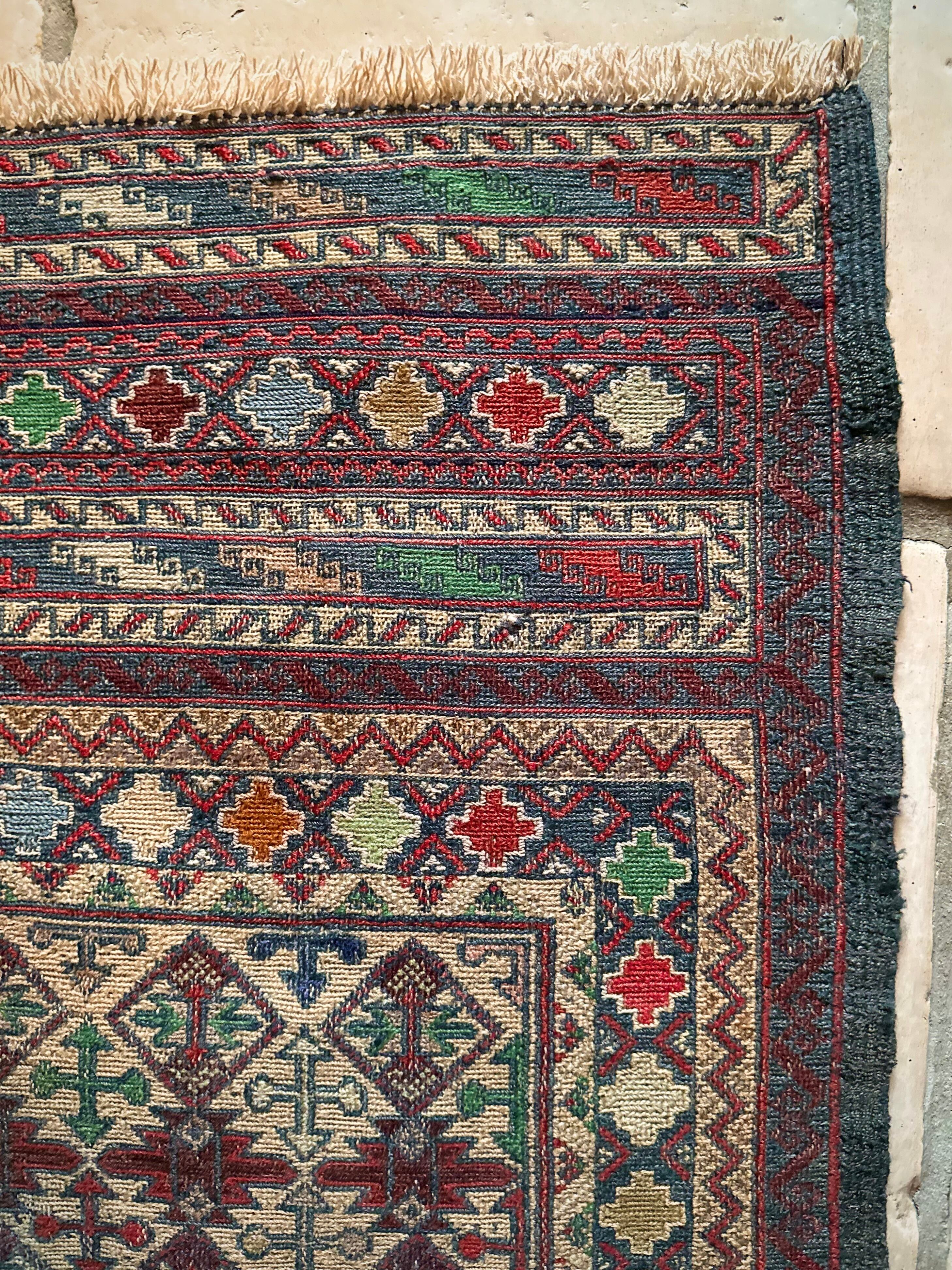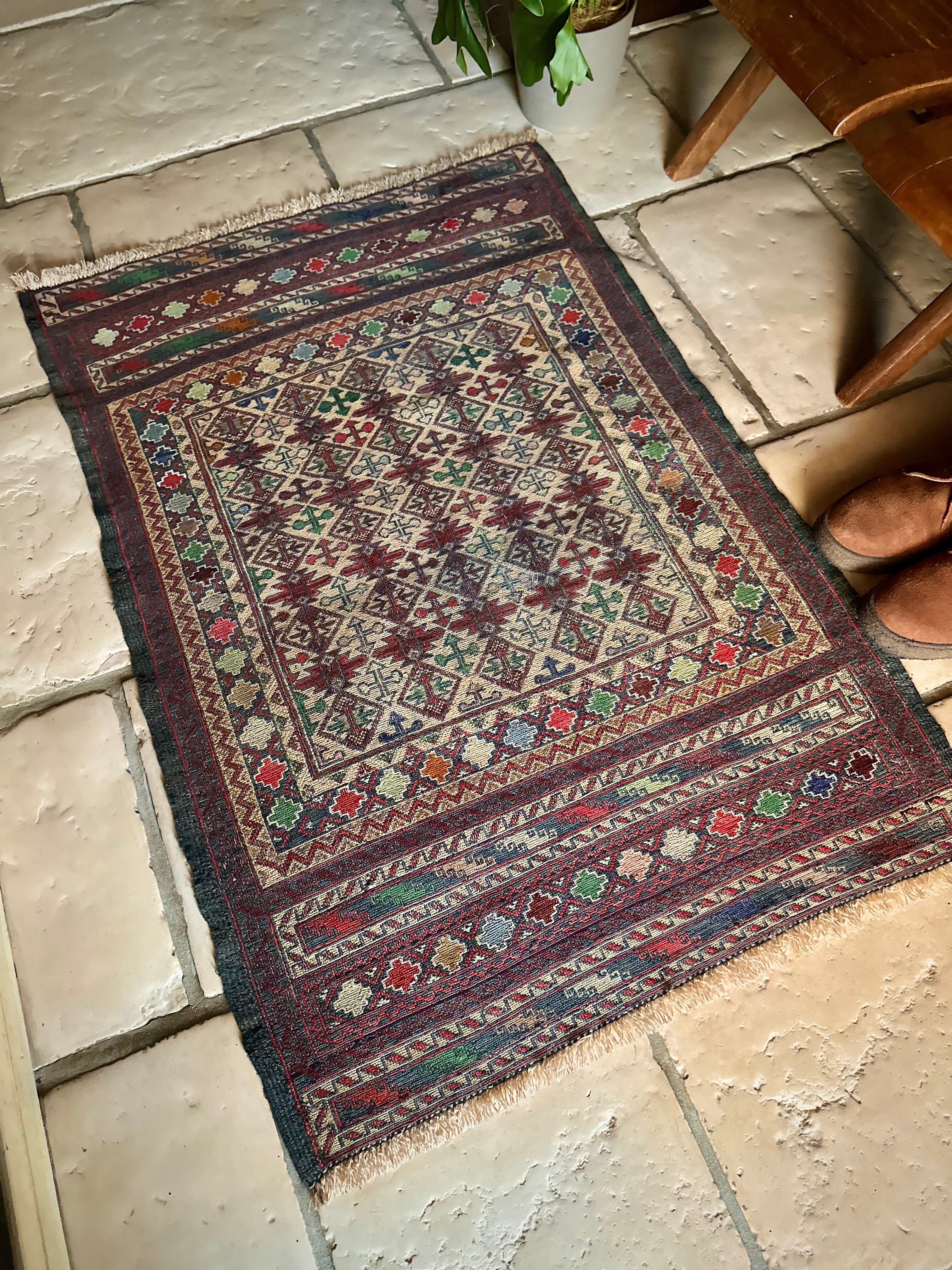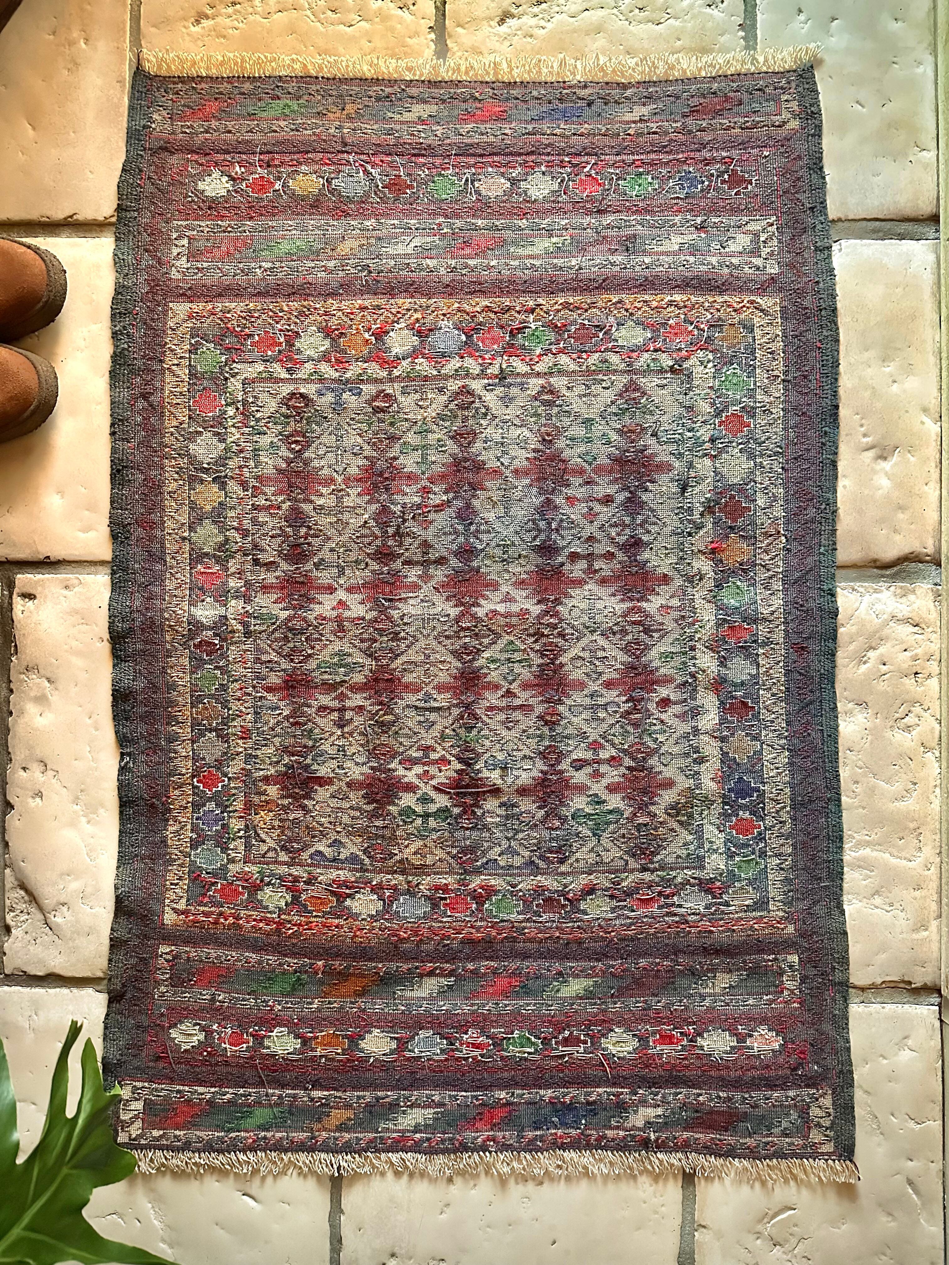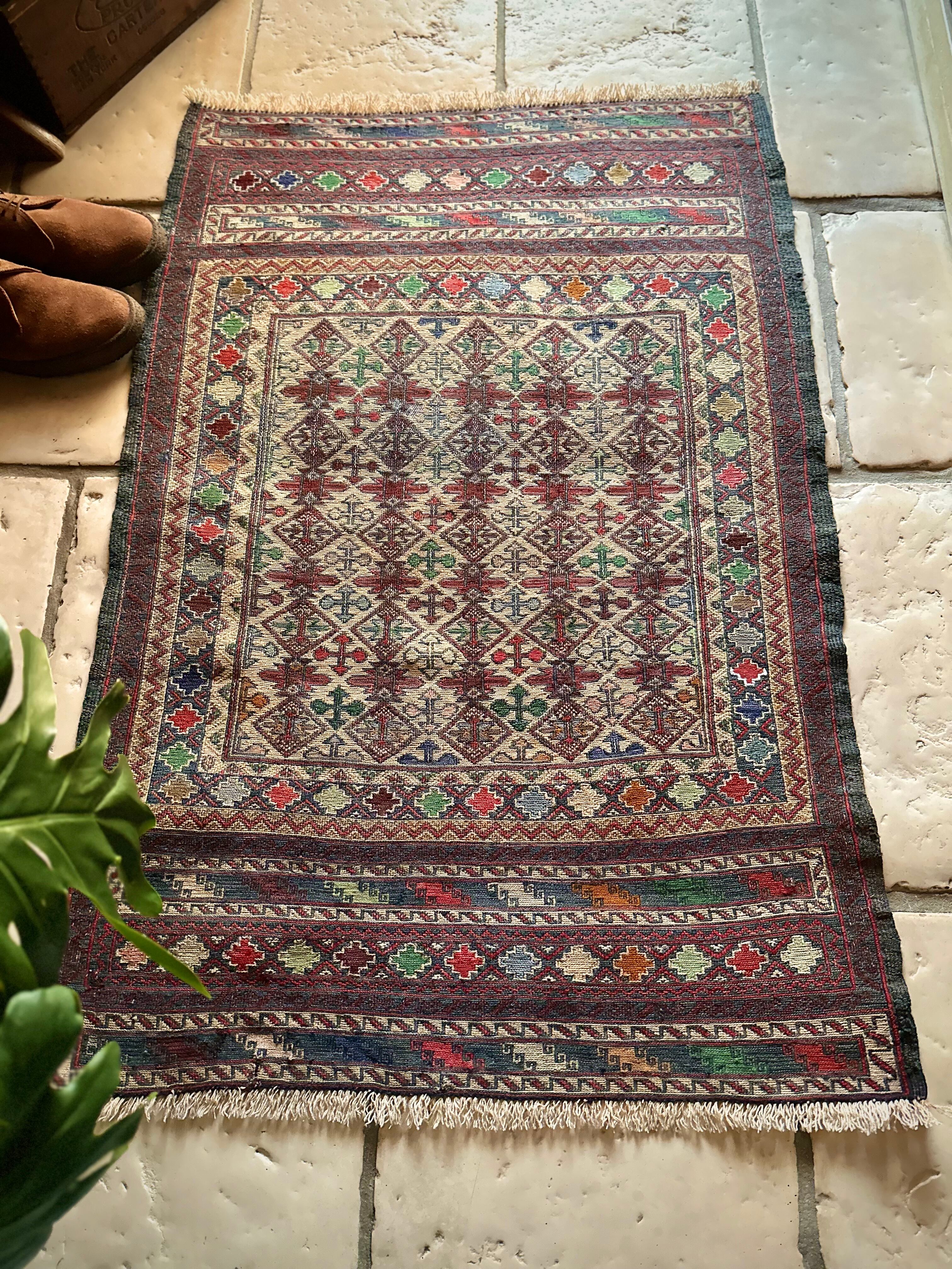 こちらカラフルな色彩感を持ちながらも全体的にはシックな雰囲気に仕上がっている、アフガニスタン西部のヘラート州に居住するバルーチ族のキリムで、通常の平織りの経糸に追加の色糸を絡ませて紋様を描くスマック織りの1枚になります。