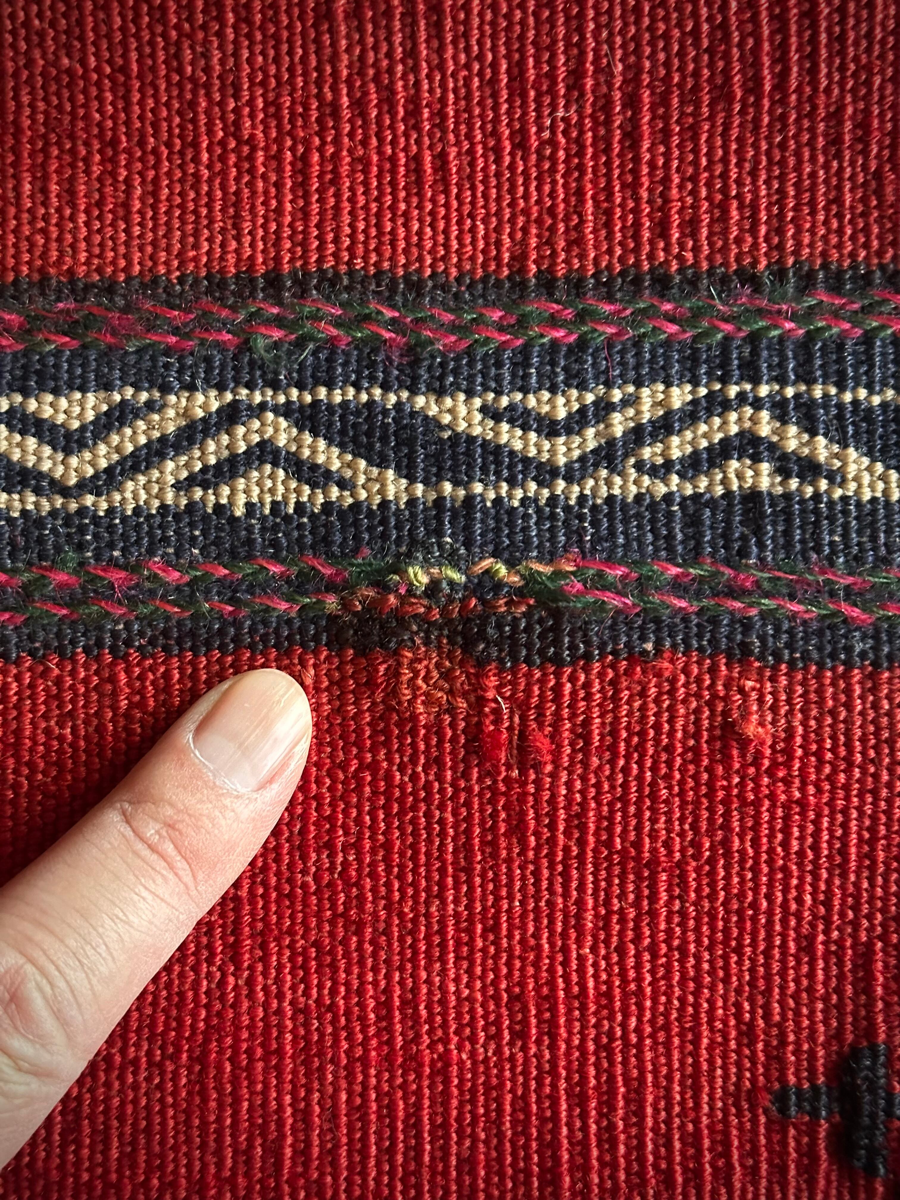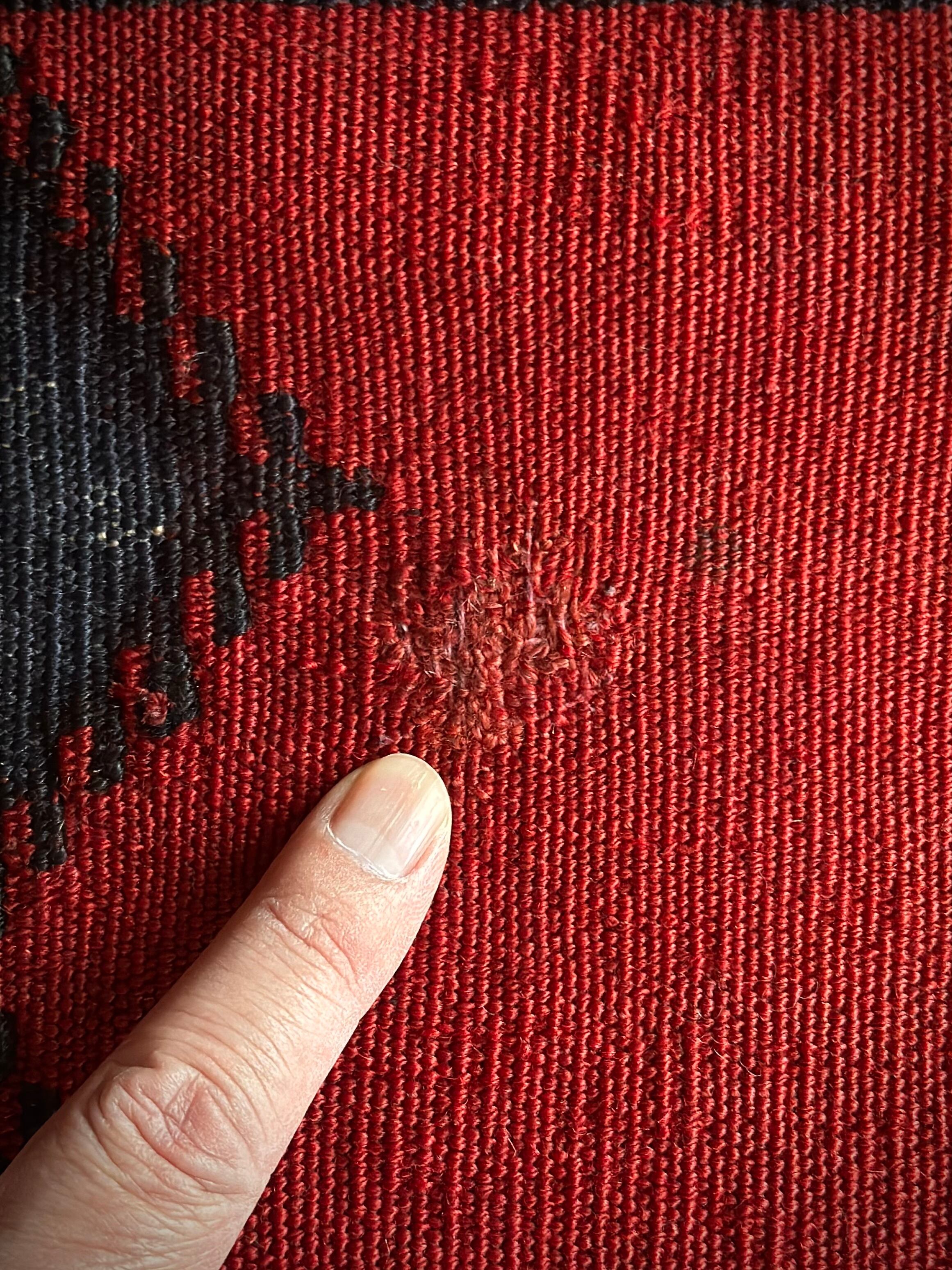 最後にラグそのものに関しては羊毛特有の匂いがあり、採寸は中央付近で計測していますが、手織りならではの歪みによる誤差や水洗いクリーニングによる縮み、また草木染めによる経年劣化の色ムラなどがありますが、それもまたヴィンテージラグの魅力かとご理解ください。