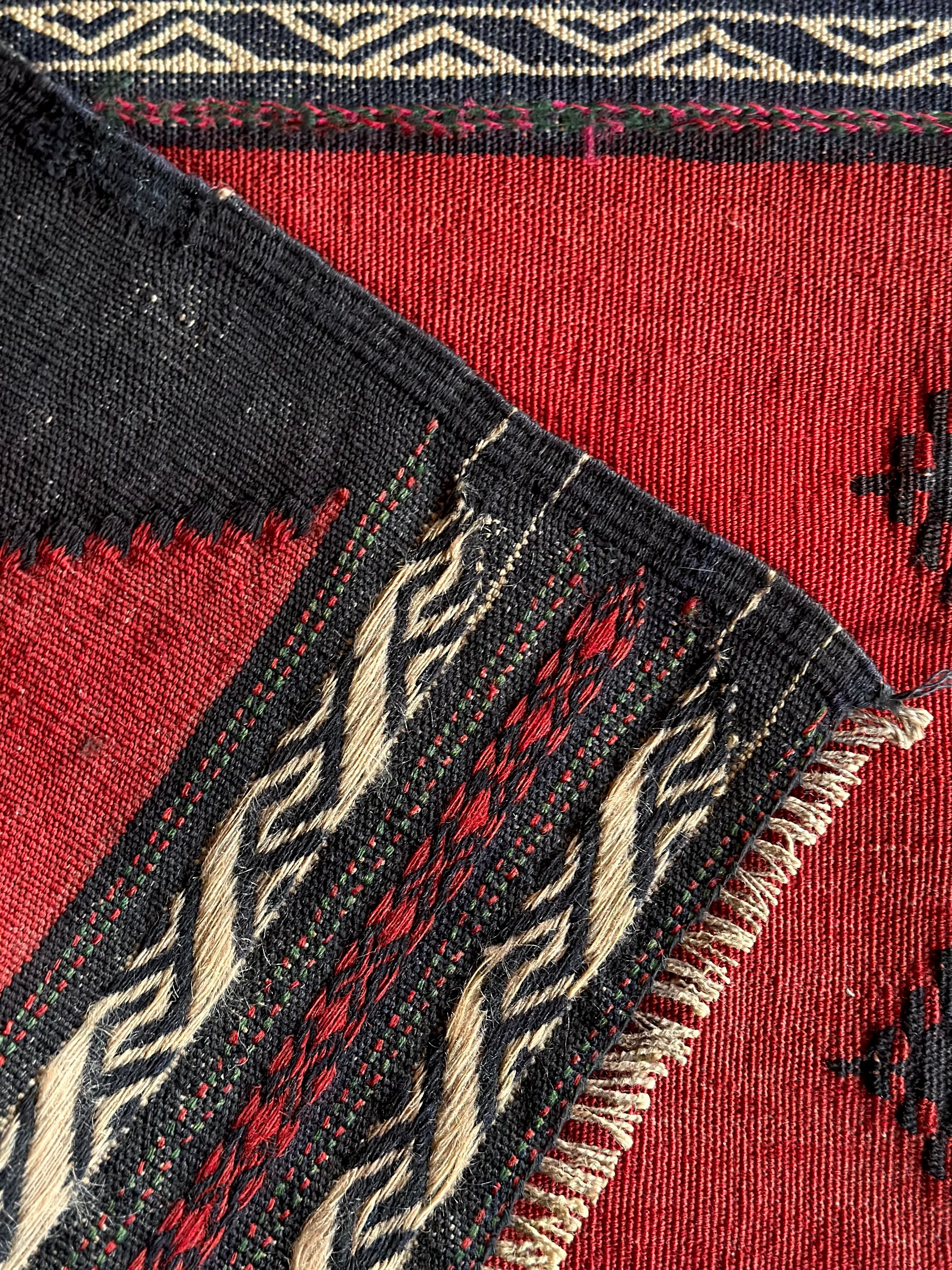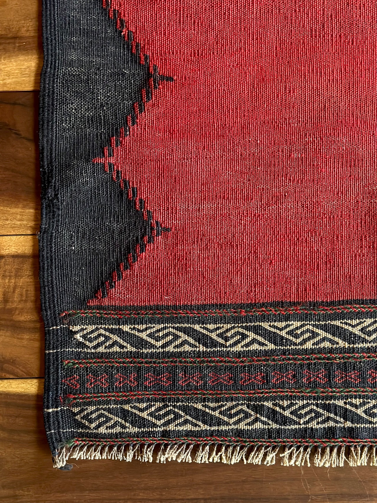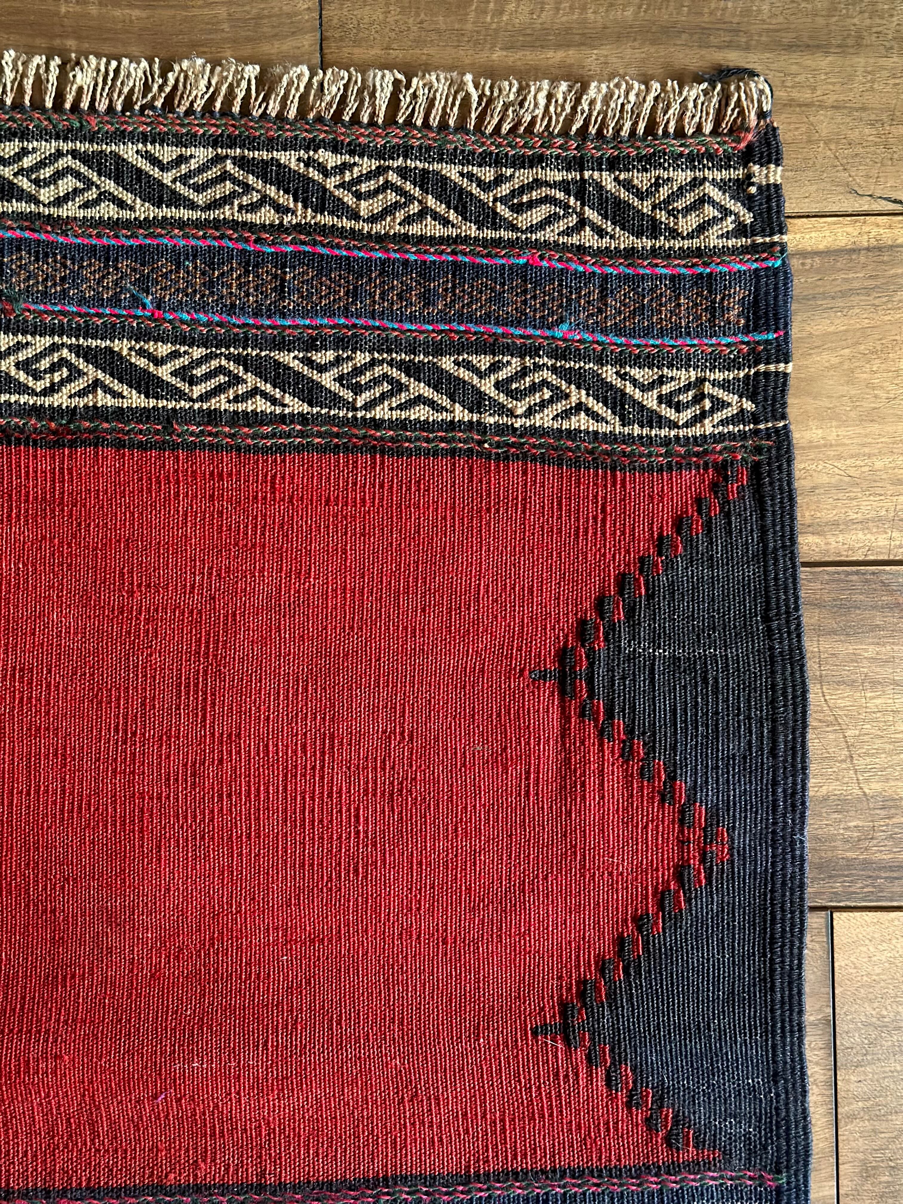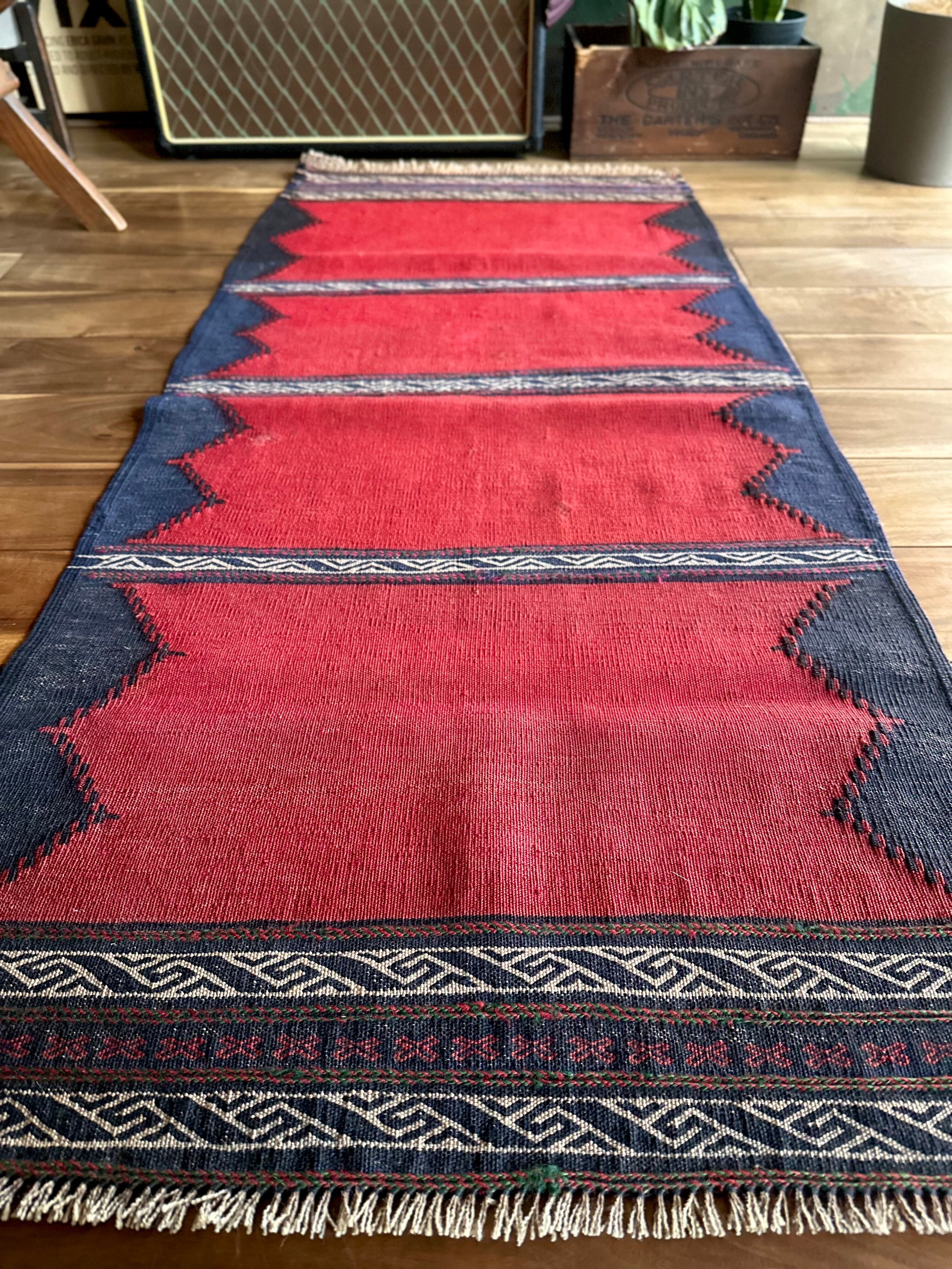 ブラック&レッドの歪なギザギザ紋様にスマック織りの切り返しが施された、アフガニスタンはヘラート州に居住するバルーチ族のキリムで、パンやナンなどを包んだり食事の際に床に敷いて食べ物を並べるソフレと言われる食卓布になります。