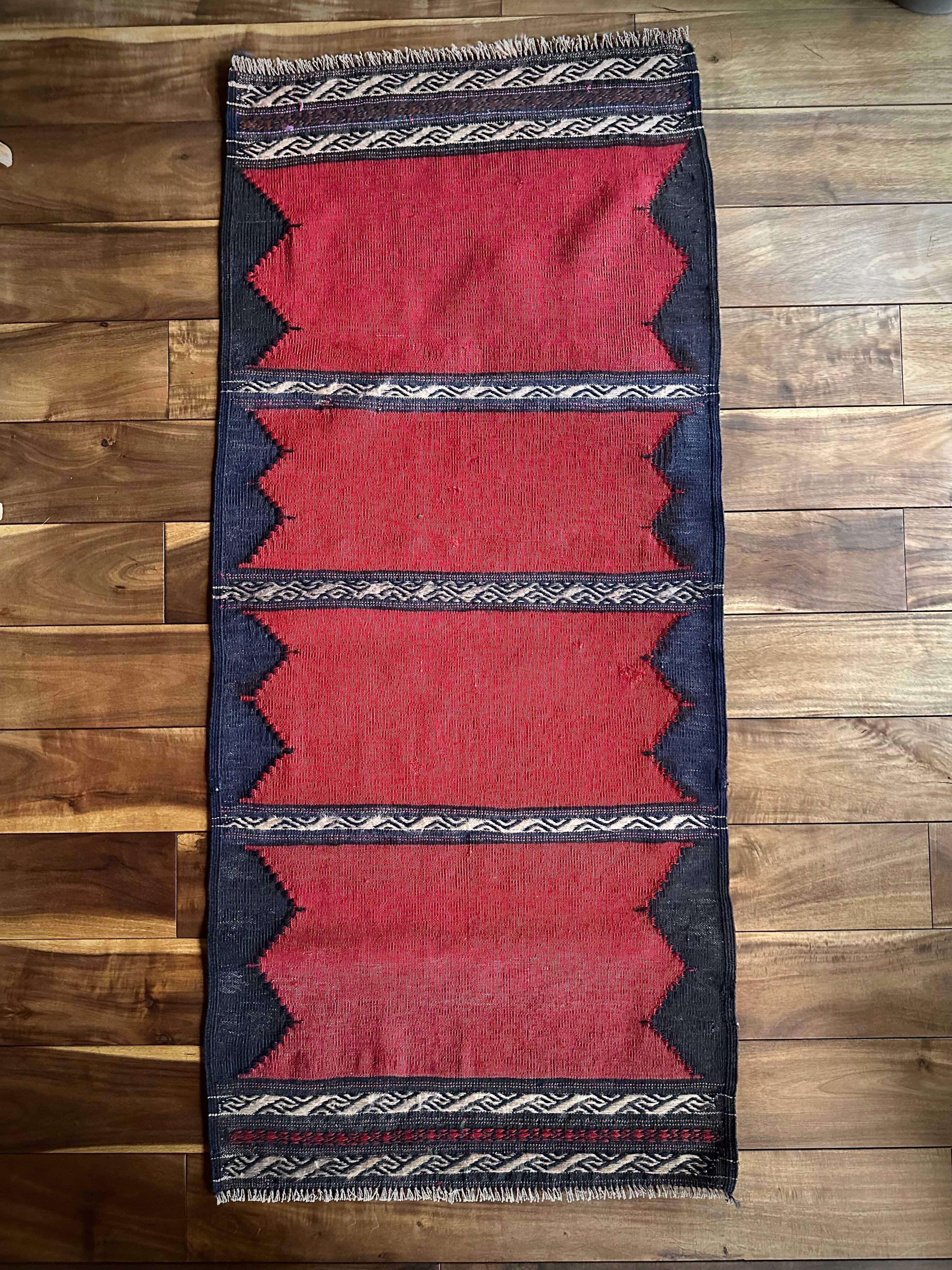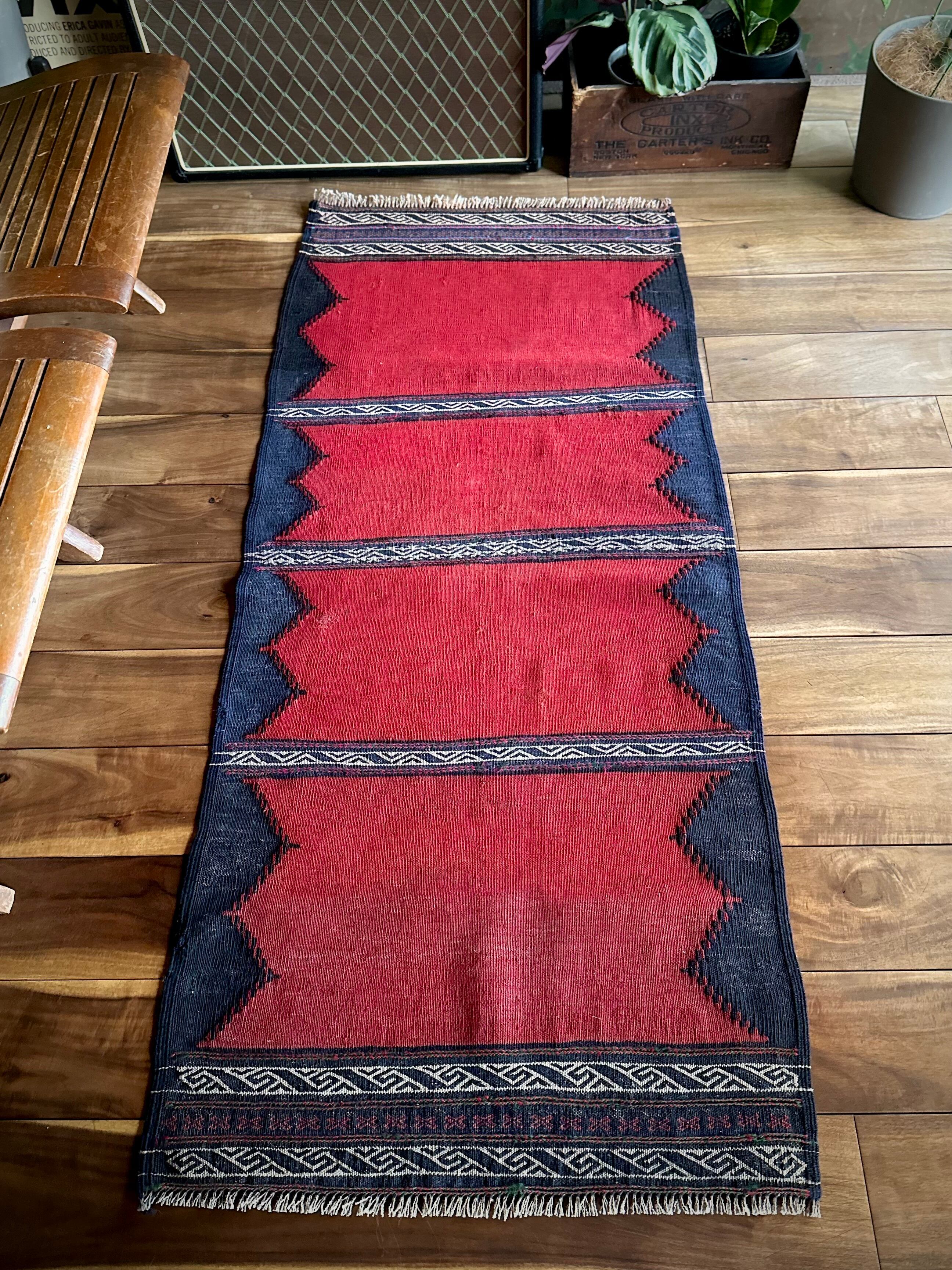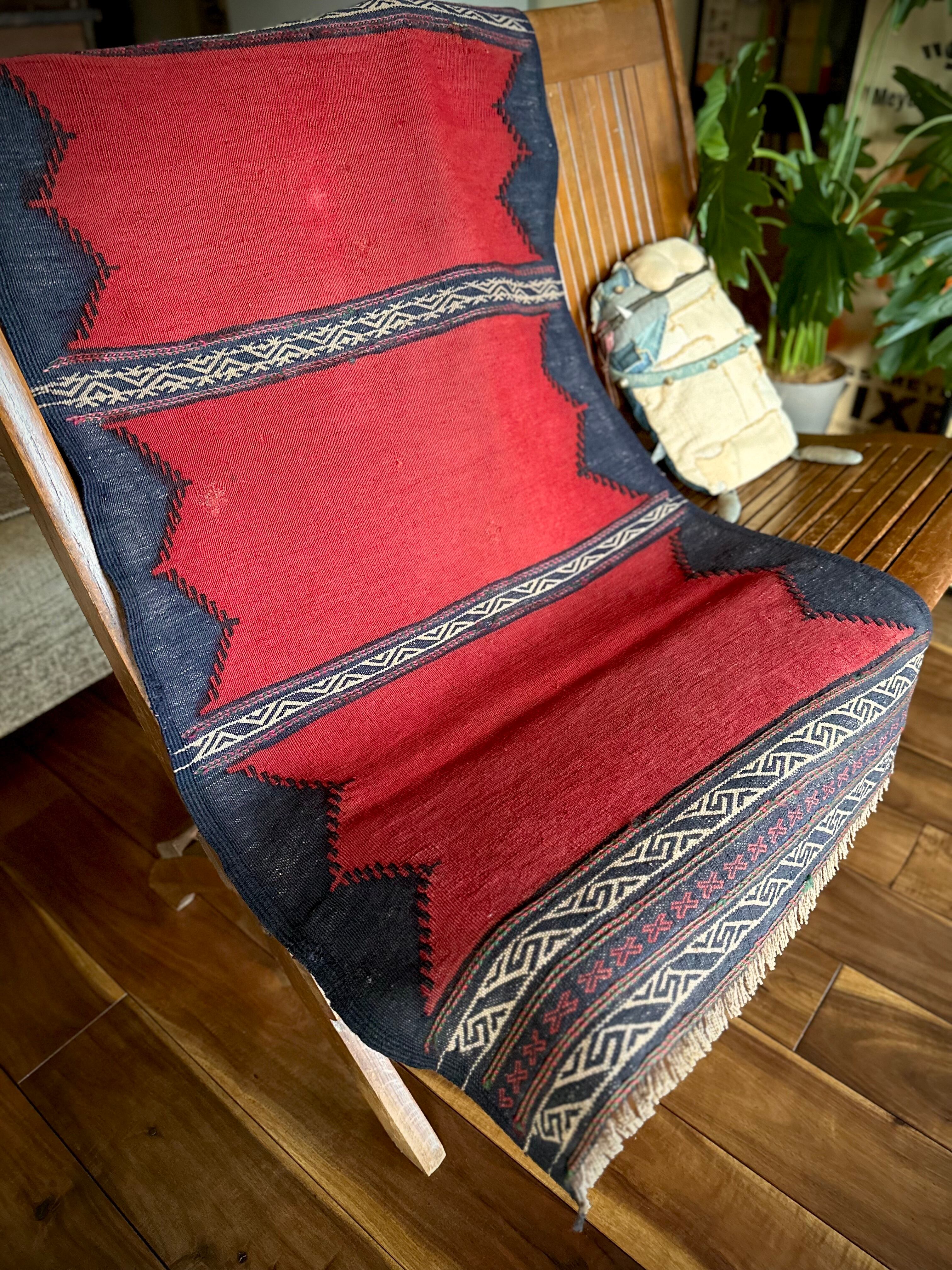 ブラック&レッドの歪なギザギザ紋様にスマック織りの切り返しが施された、アフガニスタンはヘラート州に居住するバルーチ族のキリムで、パンやナンなどを包んだり食事の際に床に敷いて食べ物を並べるソフレと言われる食卓布になります。