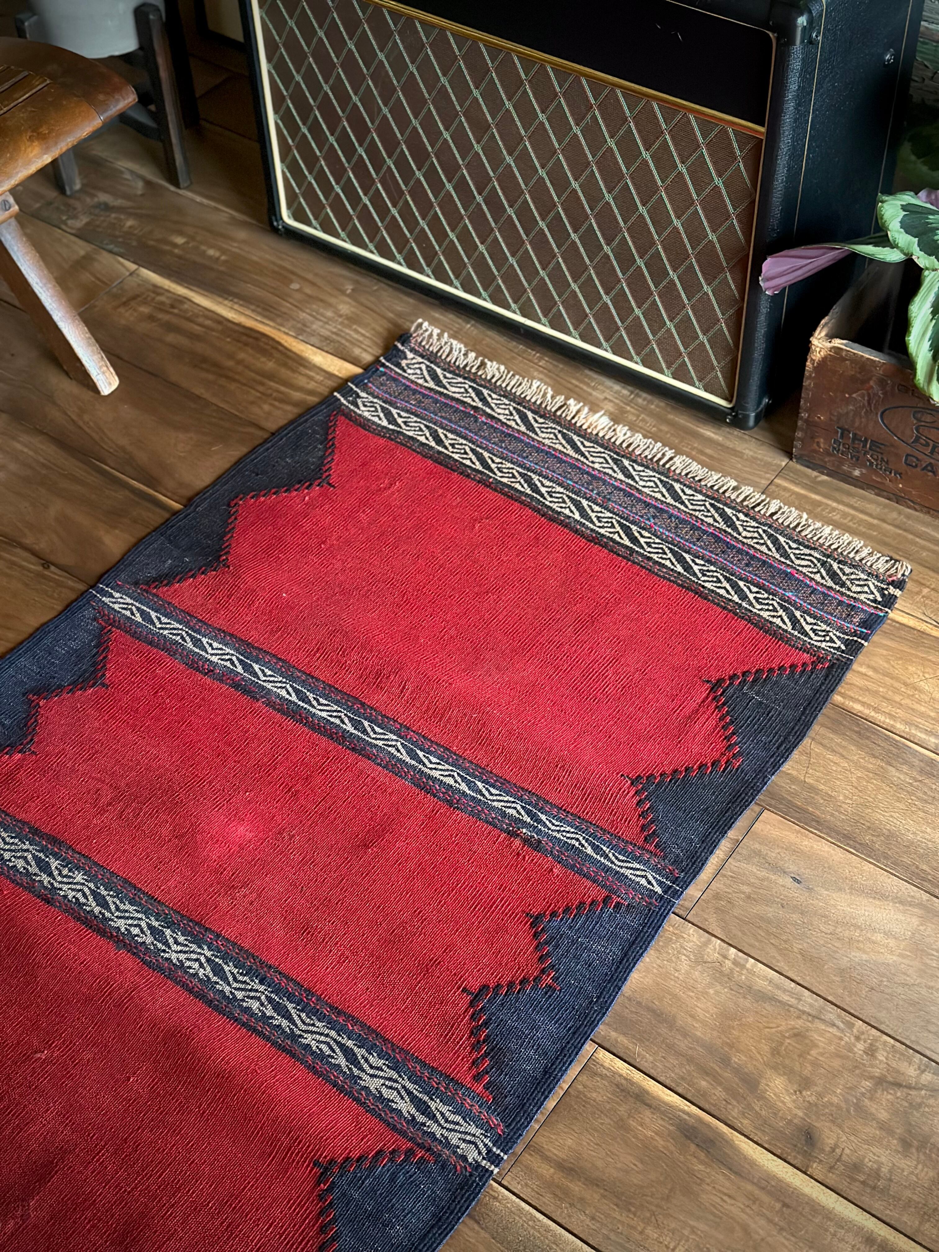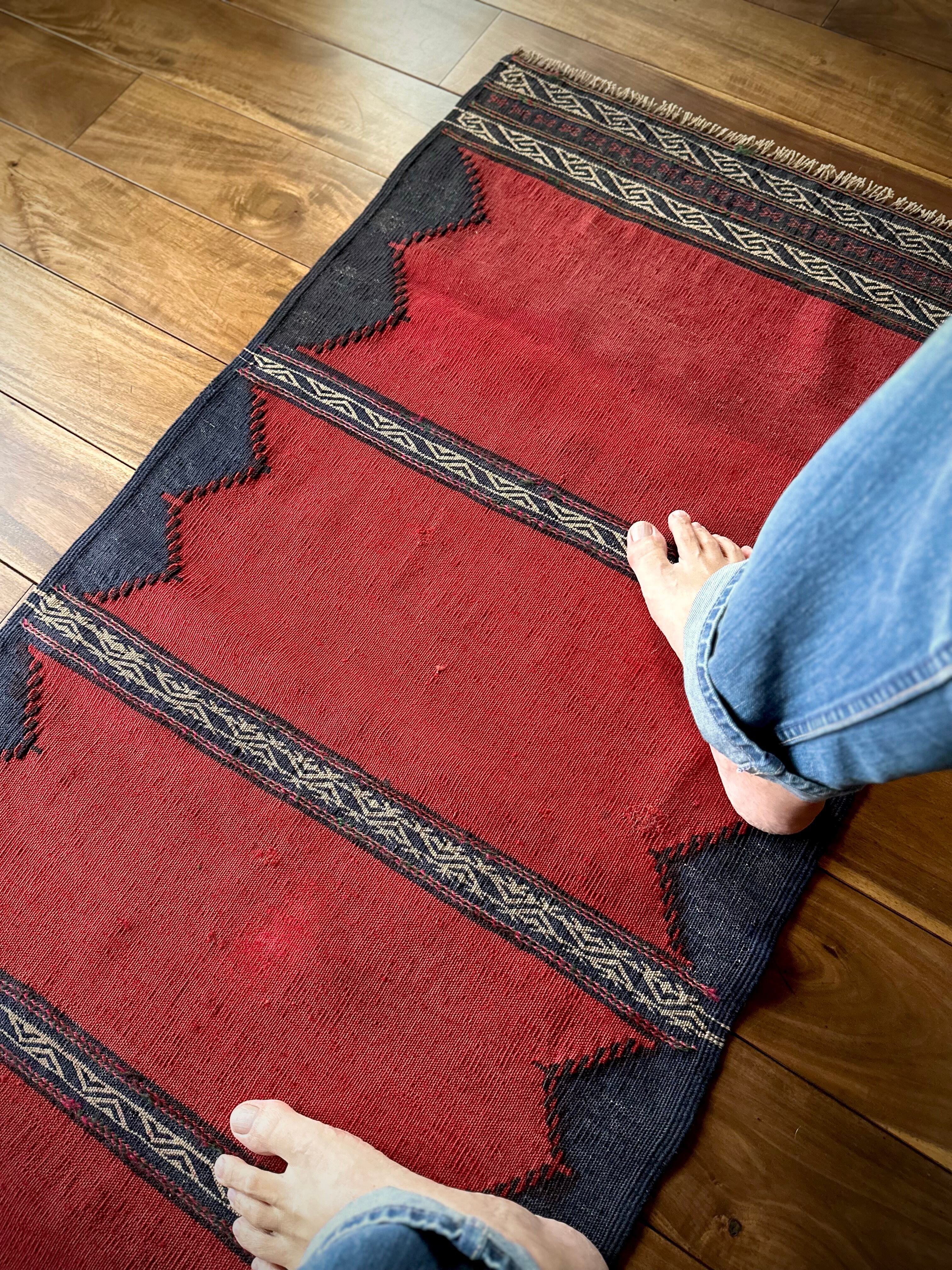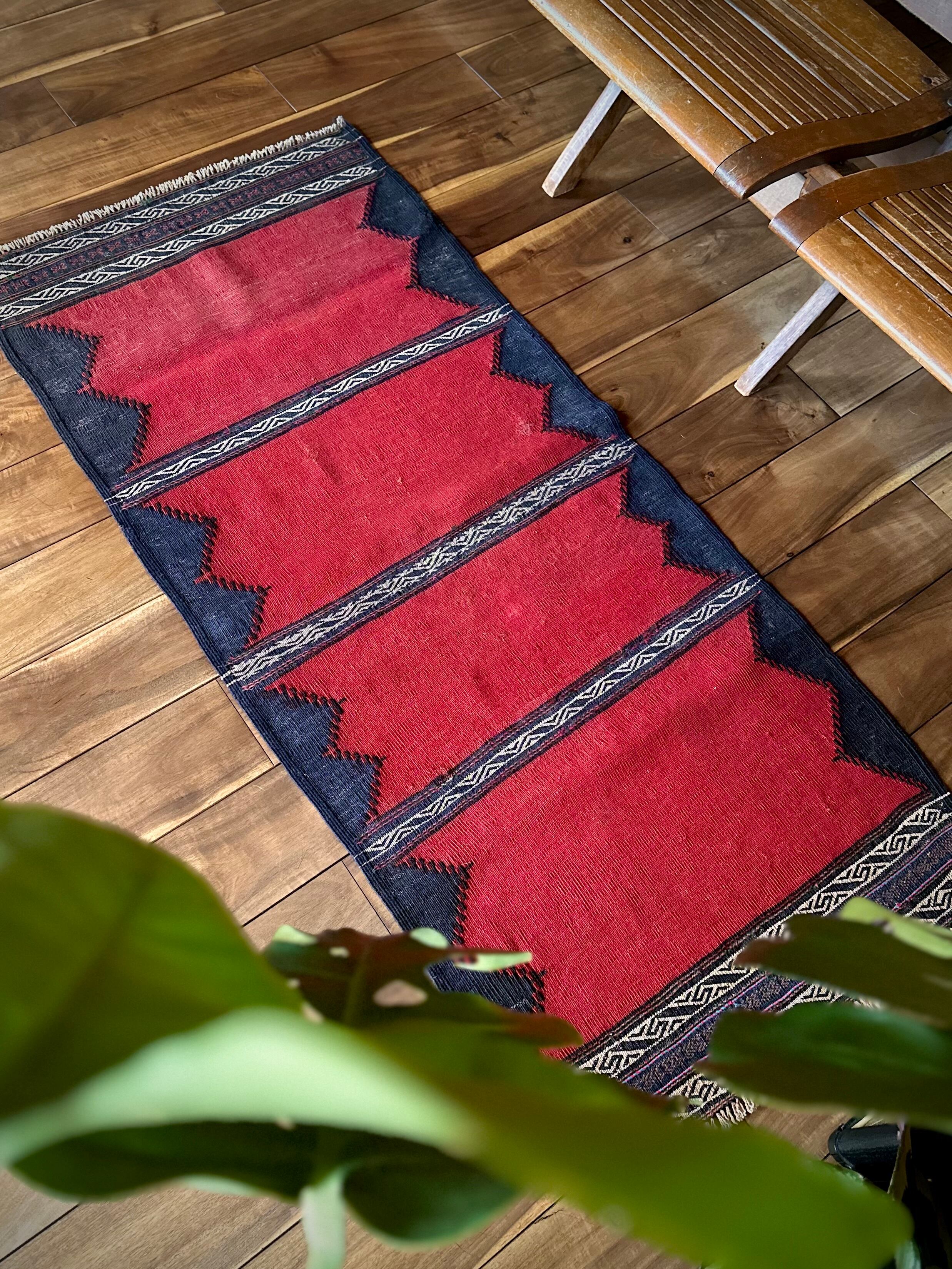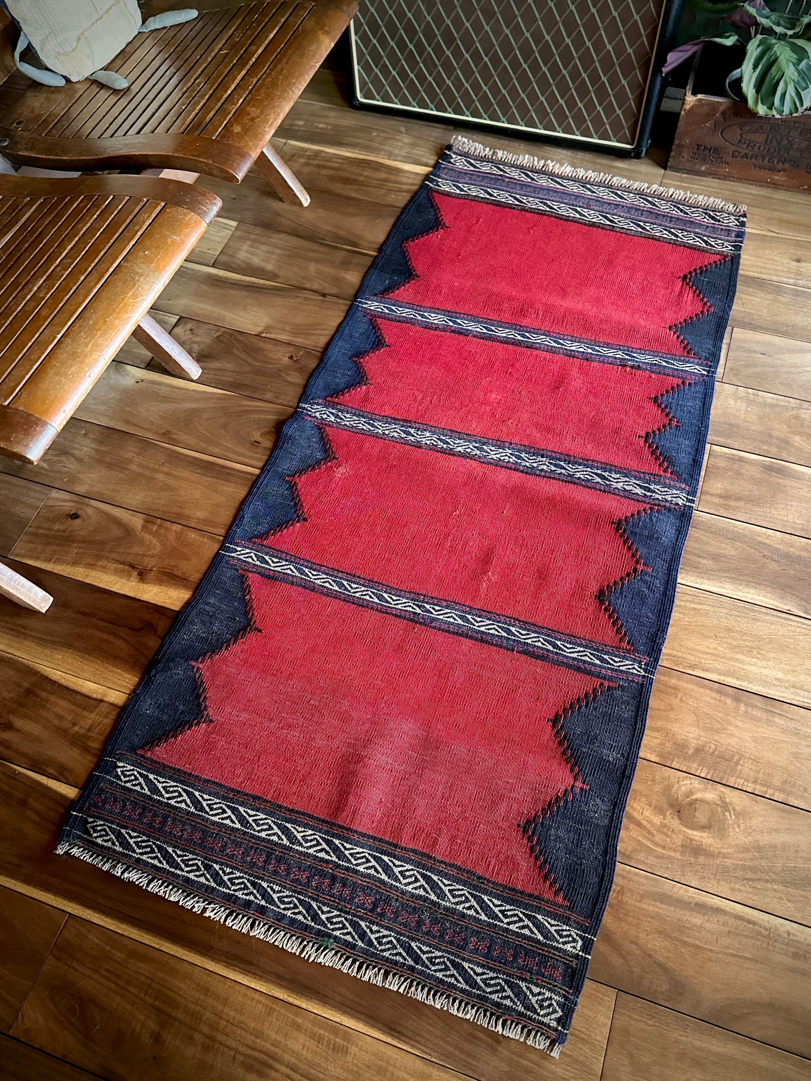 ブラック&レッドの歪なギザギザ紋様にスマック織りの切り返しが施された、アフガニスタンはヘラート州に居住するバルーチ族のキリムで、パンやナンなどを包んだり食事の際に床に敷いて食べ物を並べるソフレと言われる食卓布になります。